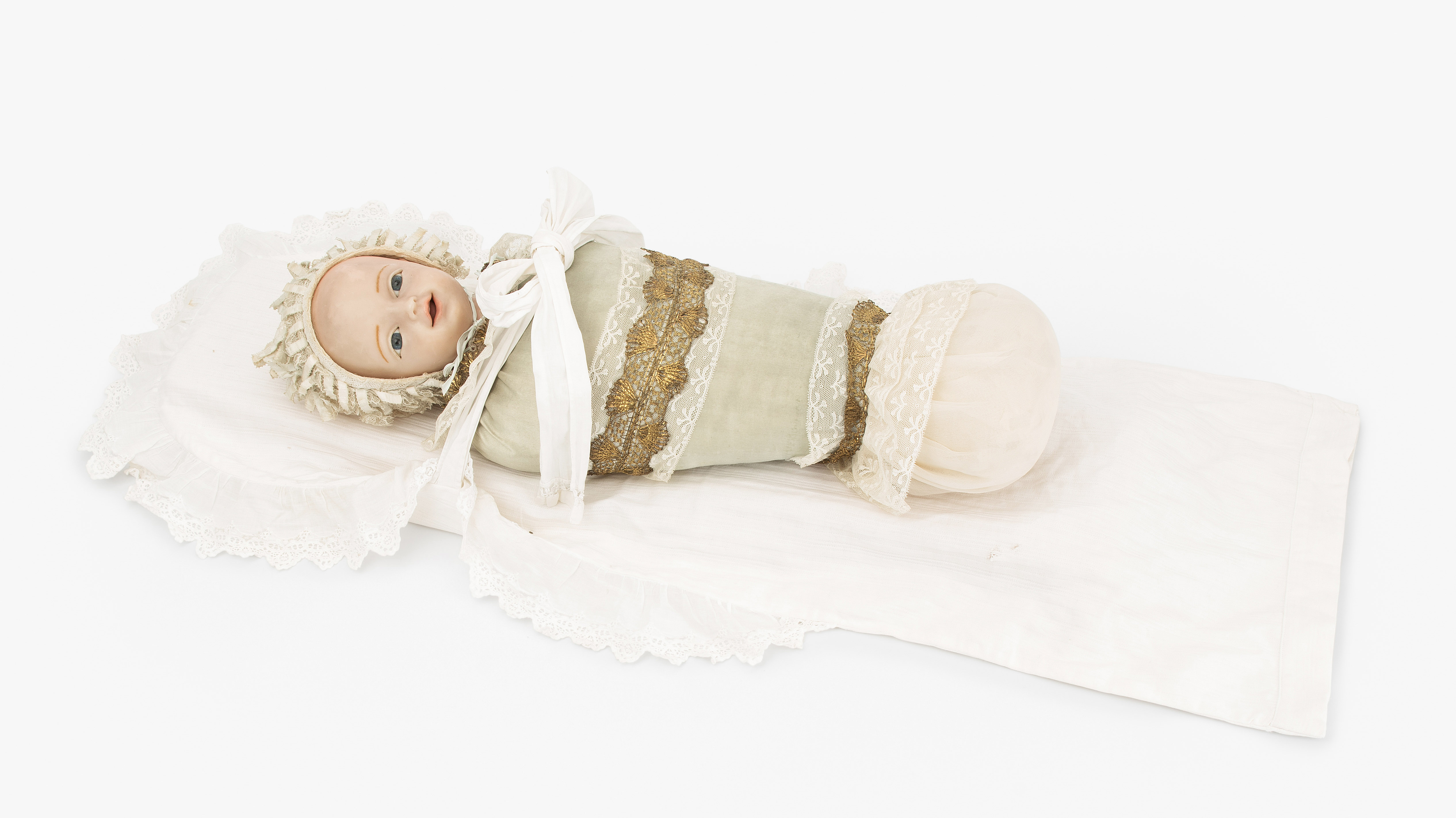 Alpenländisch, um 1900. Liegendes Christuskind. Realistisch gestalteter Kopf aus Wachs mit blauen Glasaugen. Reste einer blonden Mohairperücke. Fatschen aus hellblauer Seide mit Spitzen- und Muschelbordüren. L 46 cm. Auf Taufkissen (ergänzt).