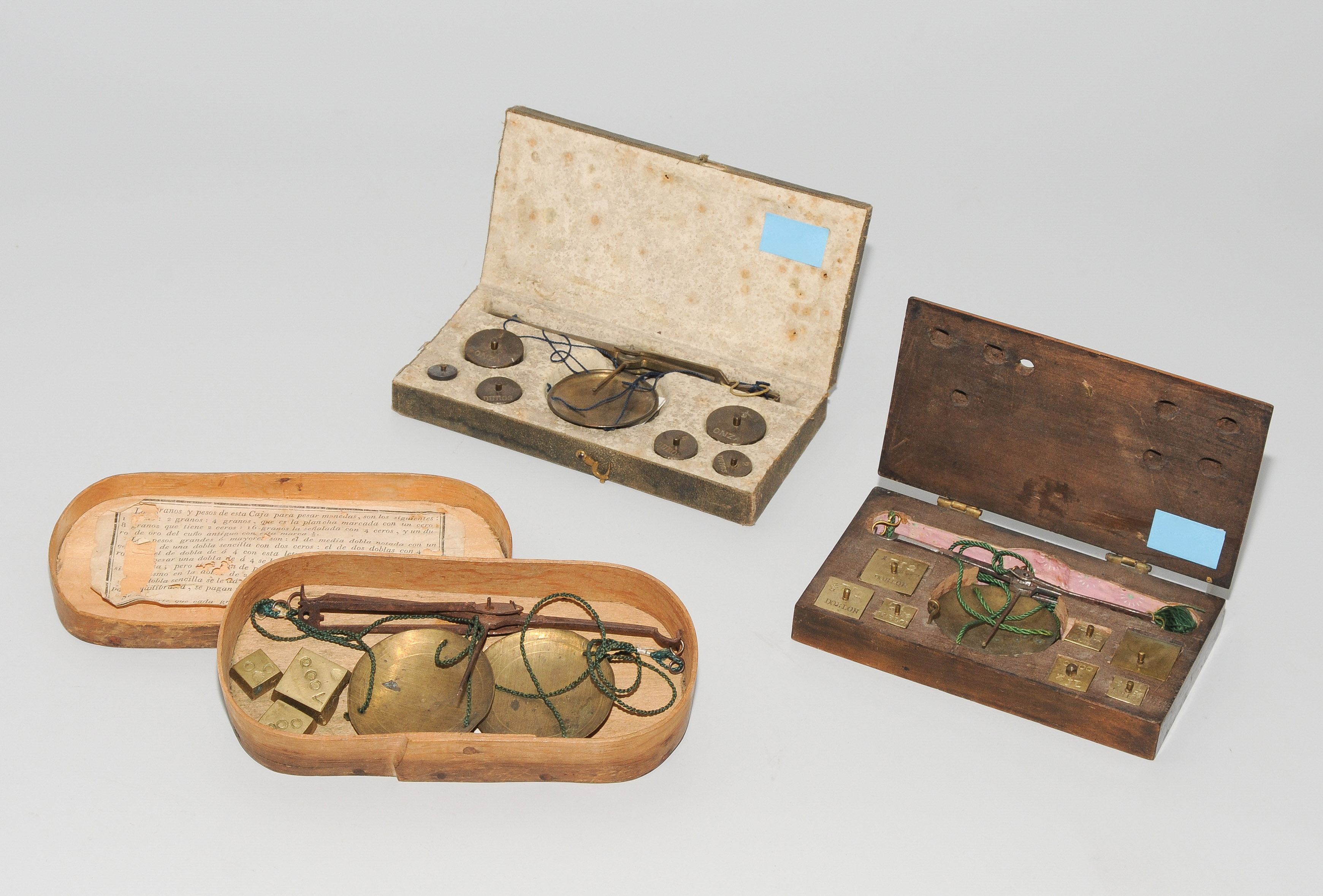 (1) Spanien, Valencia, 18.Jh. Marke auf Waagschalen und Gewichten: "(Wappen von Valencia) und JL". Balkenwaage aus Eisen mit Waagschalen und Gewichten aus Messing. In Original-Holzschatulle mit vollständigem, 6-teiligem Gewichtssatz und 2 losen Gewichten. 13x7,5x2,5 cm. (2) Spanien, um 1800. Unbezeichnet. Balkenwaage, Waagschalen und Gewichte aus Messing. In originaler, mit Wachstuch kaschierter Holzschatulle, innen mit Papier ausstaffiert. Vollständiger, 6-teiliger Gewichtssatz und 6 lose Gewichte. 13x7,5x2,5 cm. (3) Spanien, um 1800. Marke auf Gewichten: "(Muschel)". Balkenwaage aus Eisen mit Waagschalen und Gewichten aus Messing. Original-Spanschachtel mit 3 losen Gewichten. 16x7,5x3 cm.