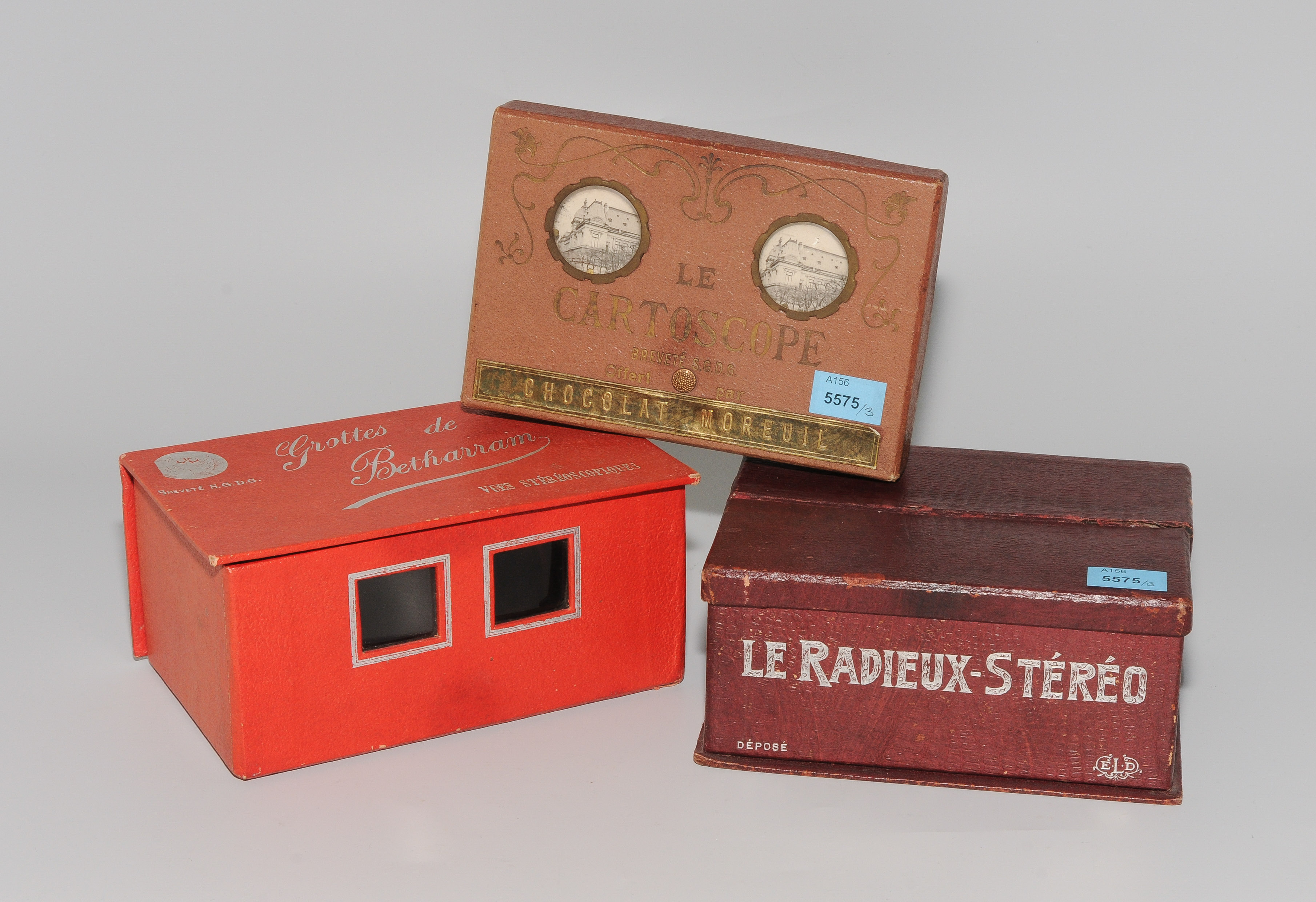 Frankreich, um 1910. Bezeichnet: "LE RADIEUX-STÉRÉO, ELD", "LE CARTOSCOPE, PAR CHOCOLAT MOREUIL" bzw. "Grottes de Betharram". Karton, in rottönen beledert. Rechteckiger Korpus mit Glas-Okularen. 2 Betrachter fokussierbar. Total 31 Stereo-Papierkarten mit Ansichten von Saint-Étienne, Rom bzw. der Bétharram-Höhle. L 16–17 cm.