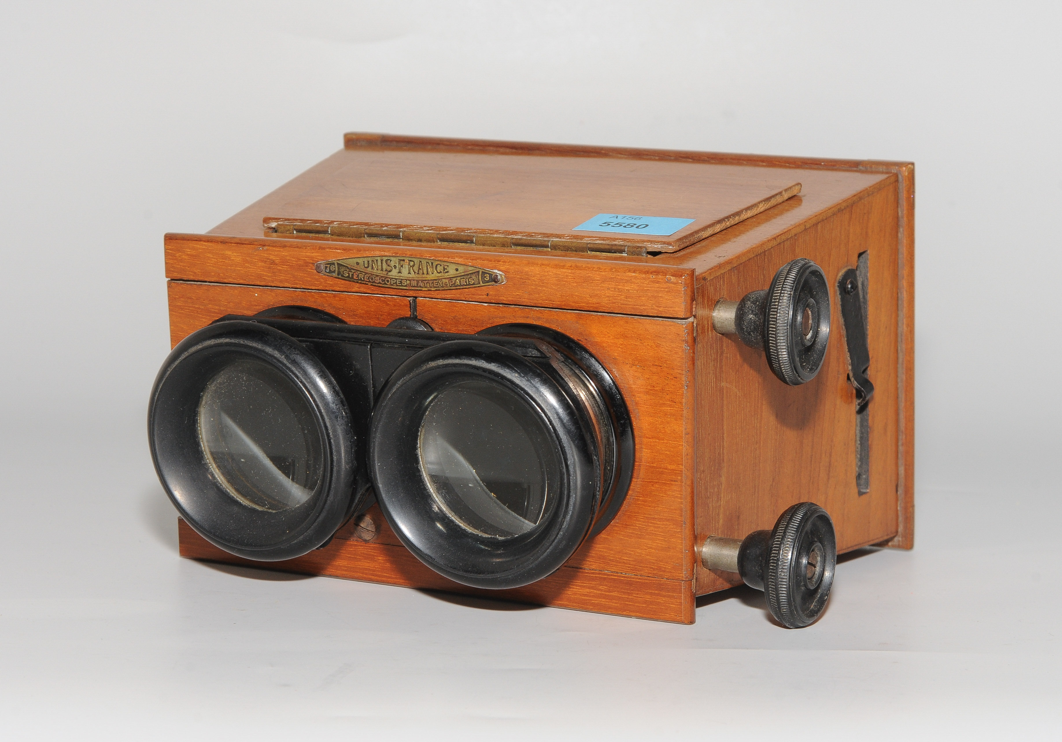 Frankreich, um 1920. Bezeichnet: "UNIS FRANCE, MATTEY, PARIS". Gehäuse aus Mahagoni mit seitlich verschiebbaren bzw. fokussierbaren Okularen mittels Zahntrieb. Für Stereo-Glasdias bzw. -Papierkarten im Format 6x13 cm. Dazu: 1 Dia mit Frauenakt. L 16,5 cm.