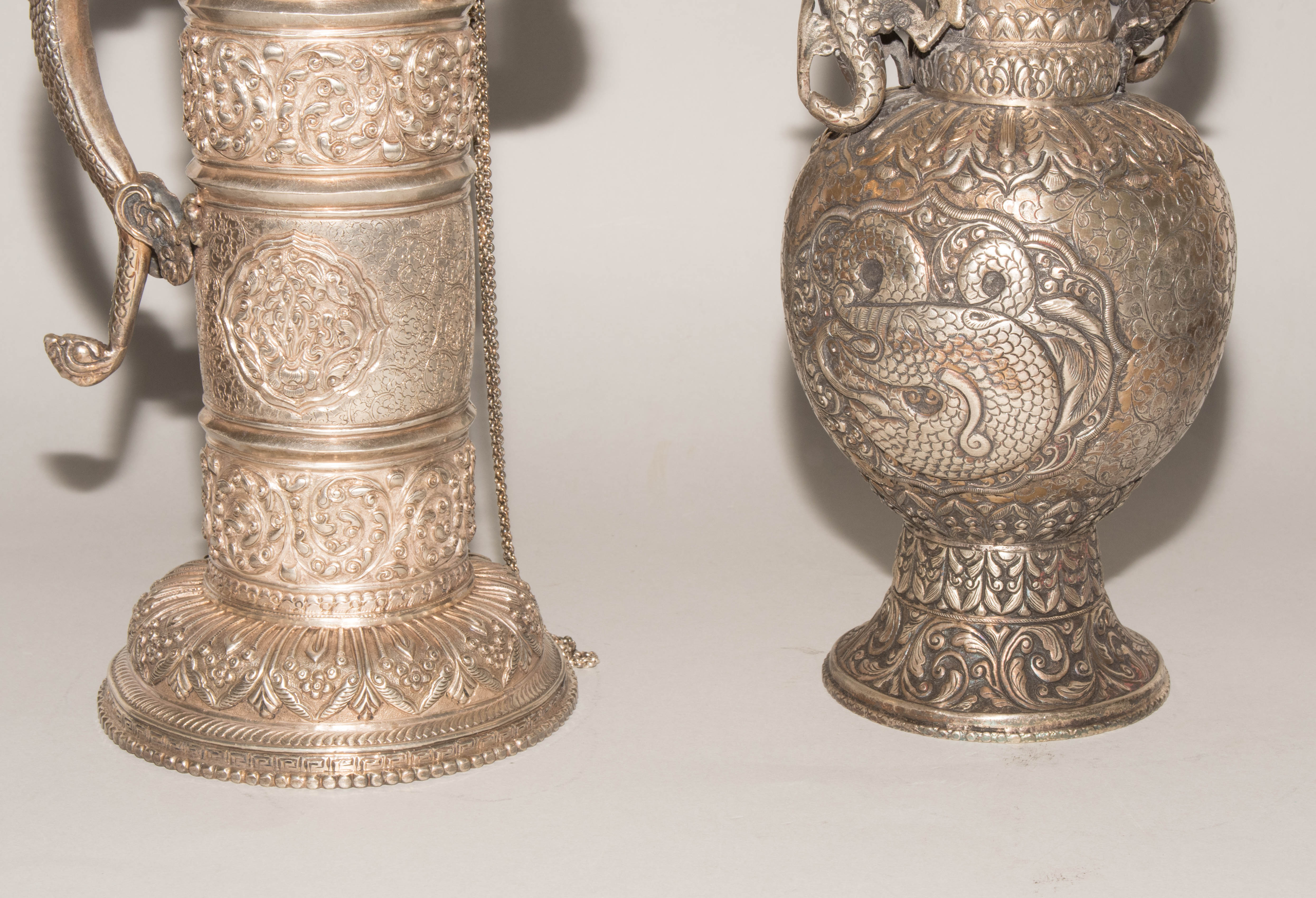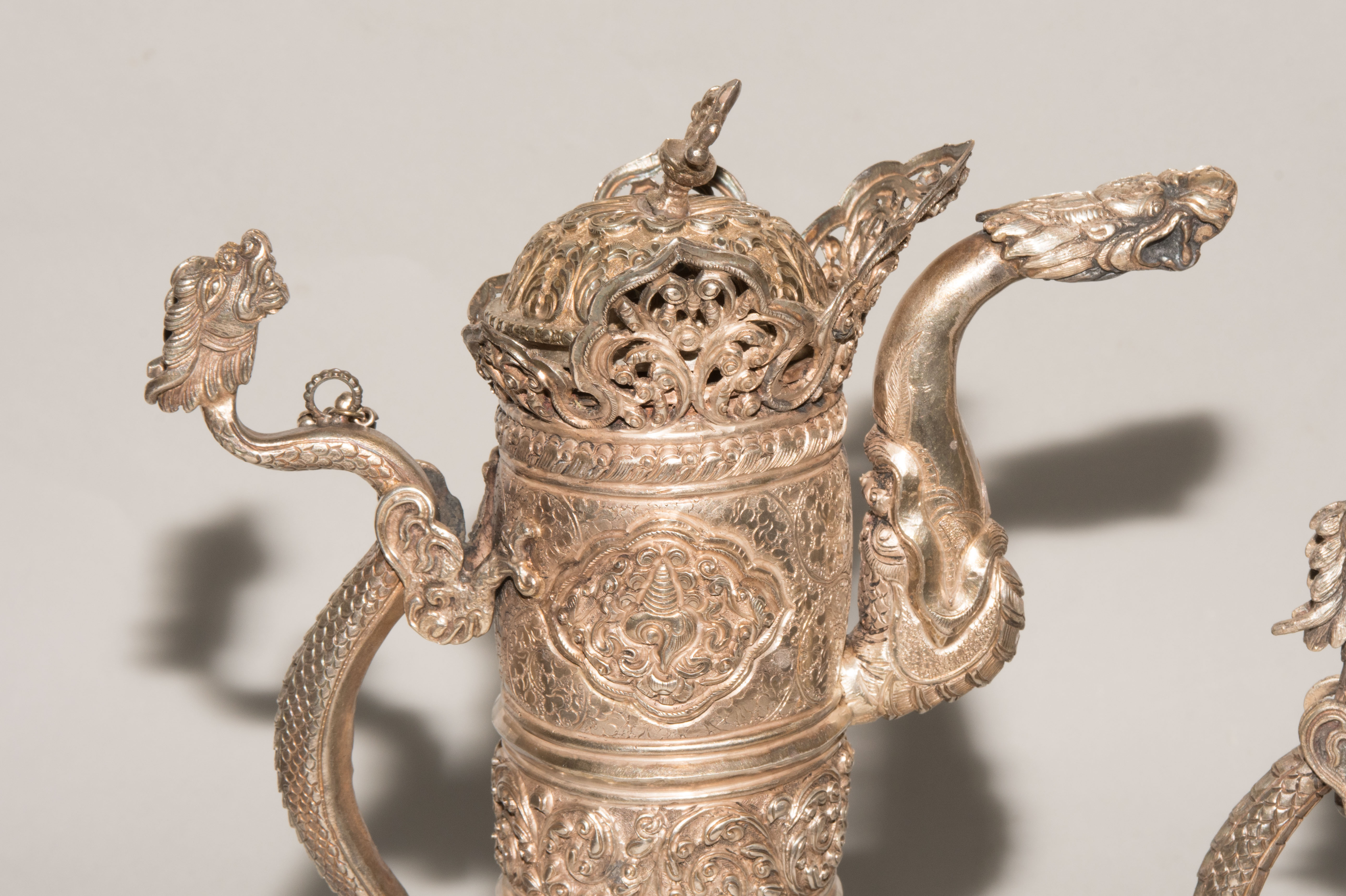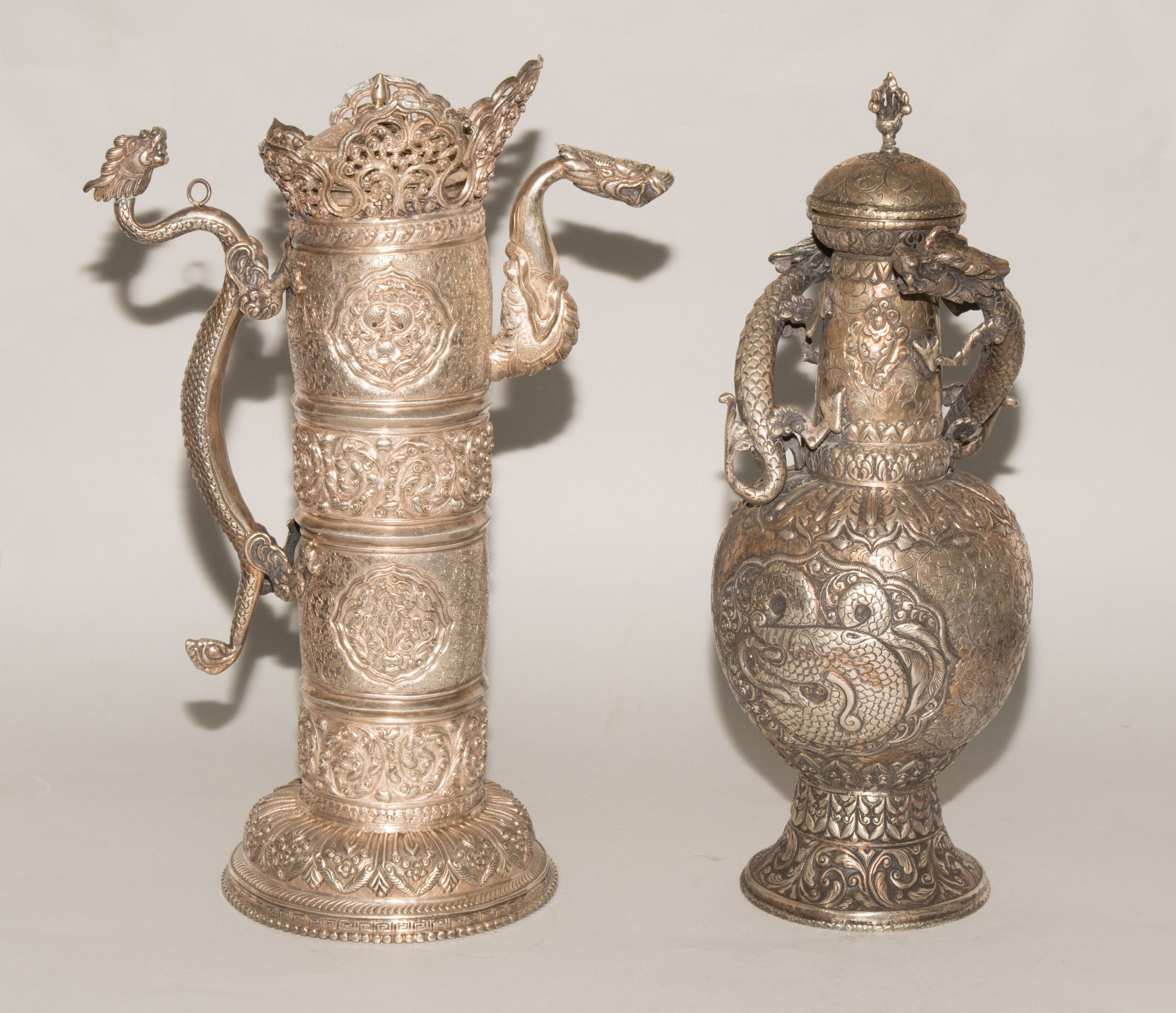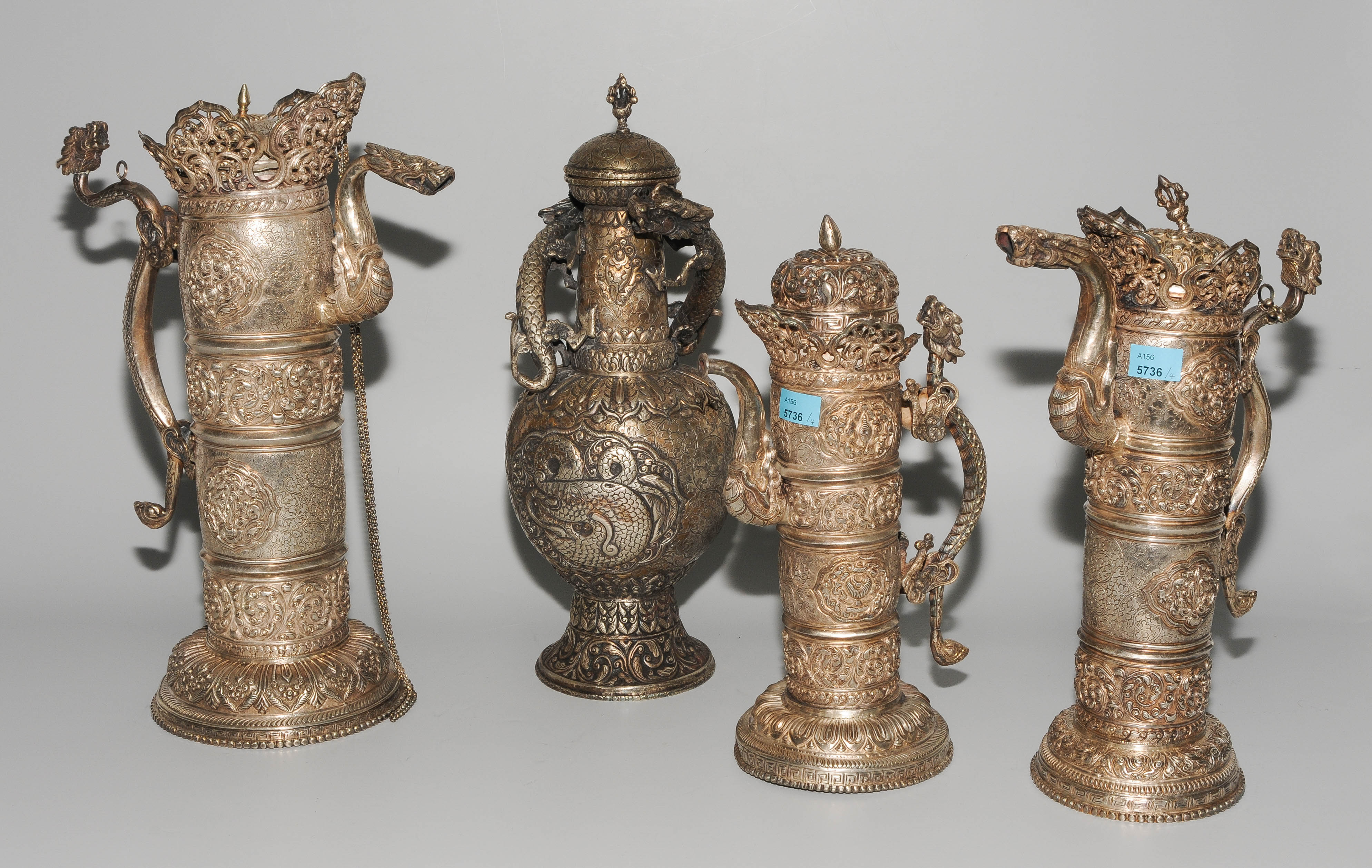 China/Tibet, 20.Jh. Silber. Drei duomuhu-Kannen in zylindrischer Form mit Drachenhenkeln und Drachentüllen. Der Körper ist reich dekoriert mit reliefierten buddhistischen Emblemen und Rankenwerk. Eine Kanne mit ovoidem Körper und langem Hals auf ausladendem Fuss. Ganzflächiger Reliefdekor mit Drache und Fisch in den Paneelen über floralen Motiven. Als Henkel dienen zwei plastische Drachen am Hals. H 28,5–35 cm. Gesamtgewicht ca. 4497 g.