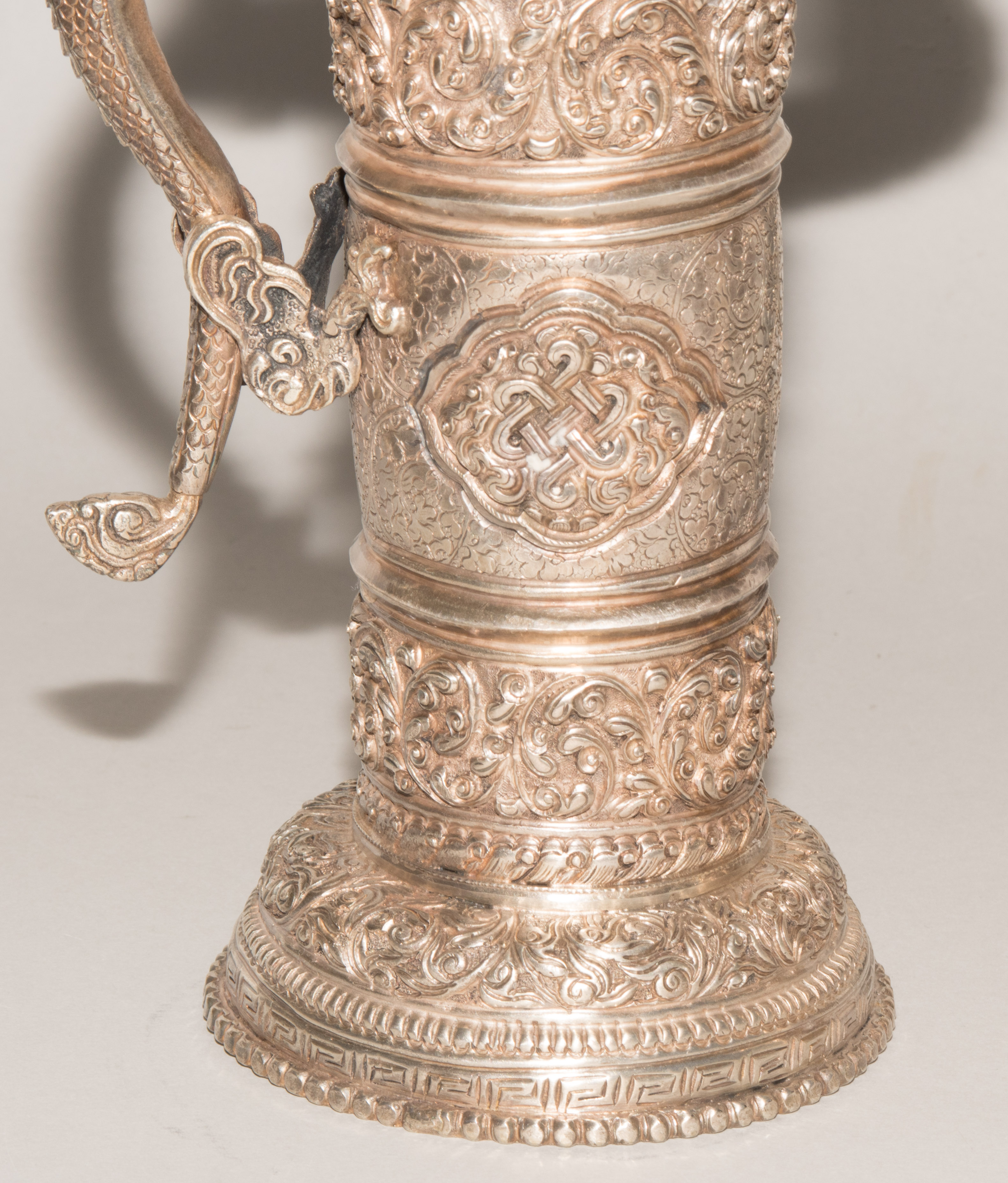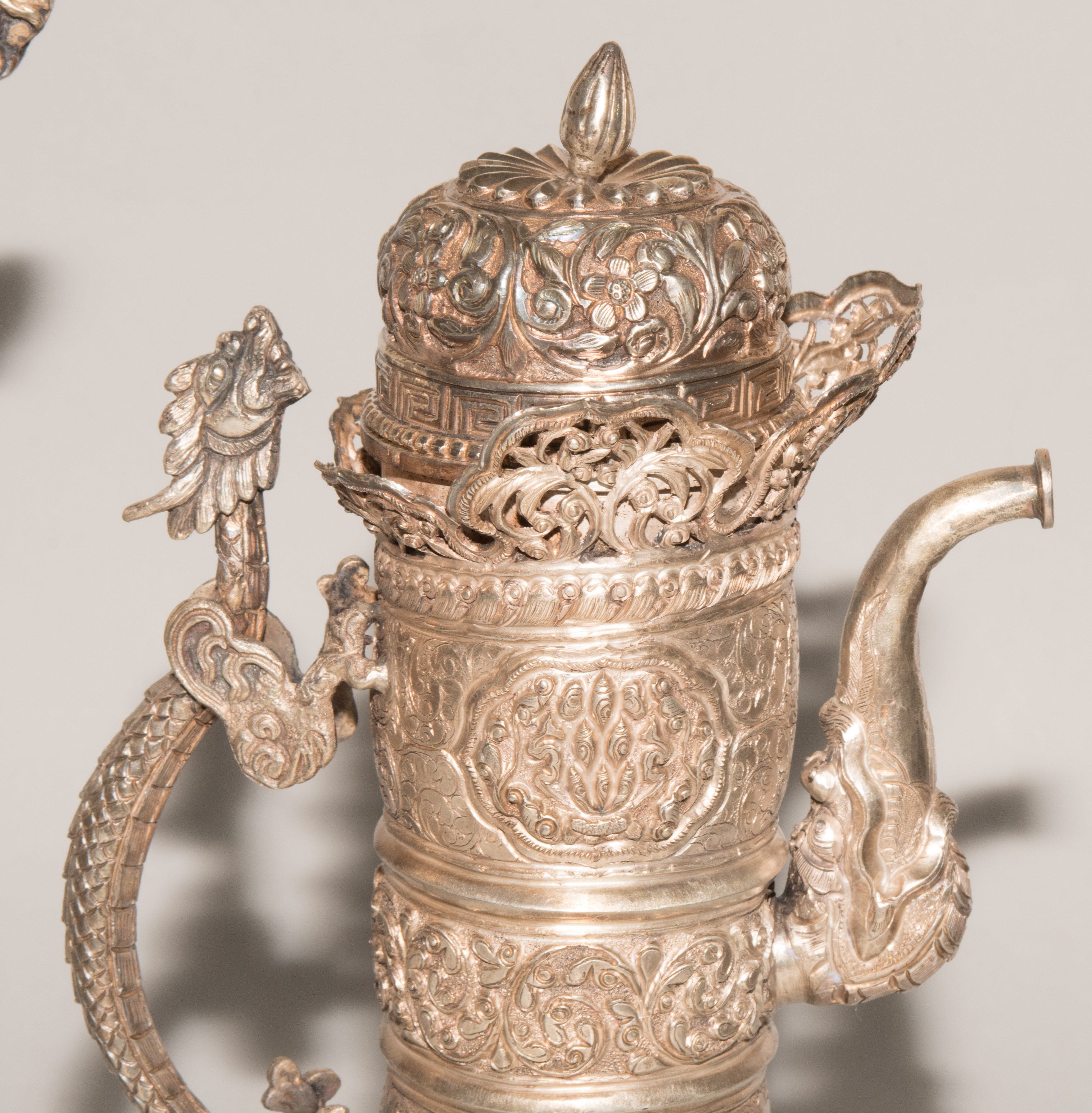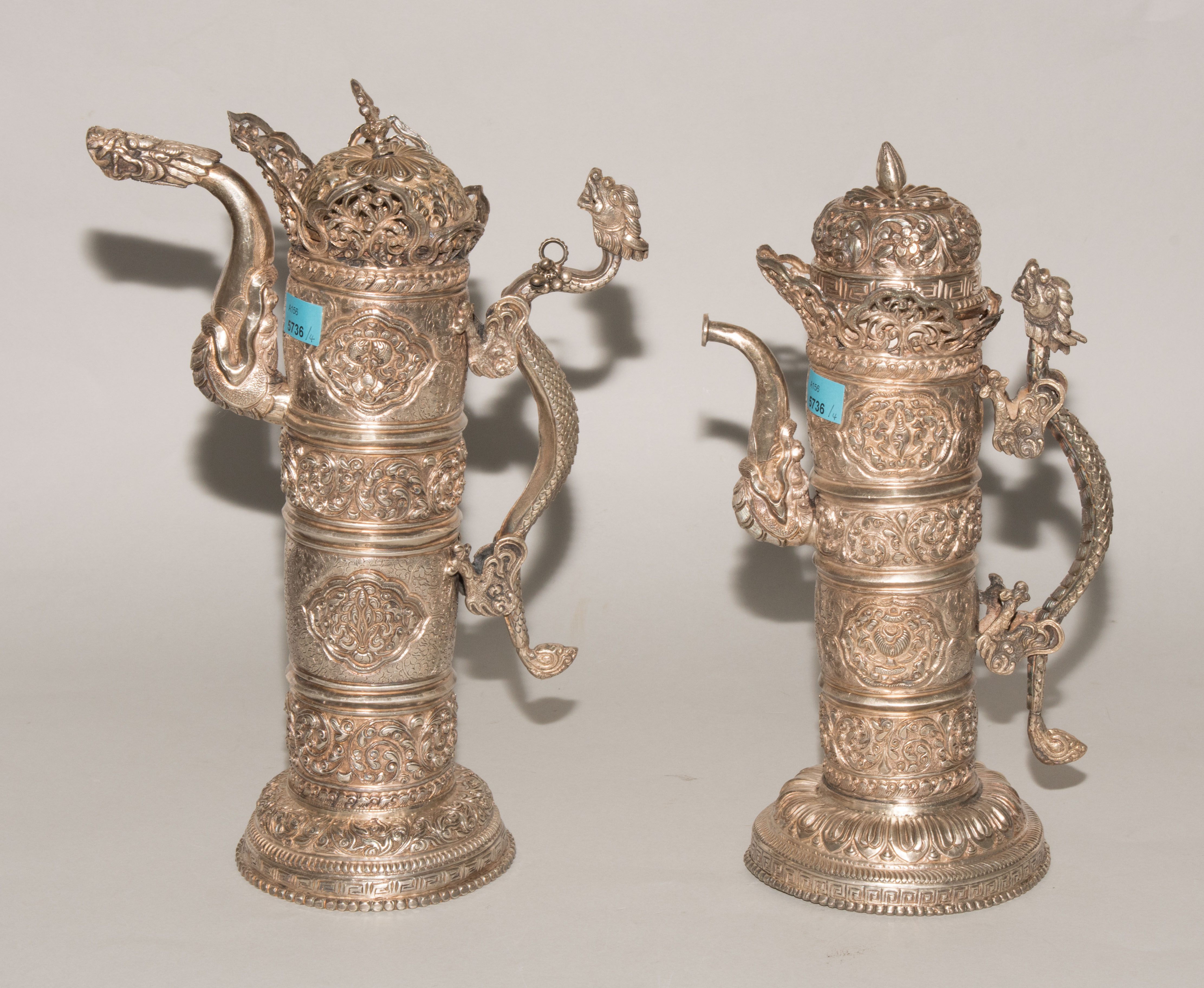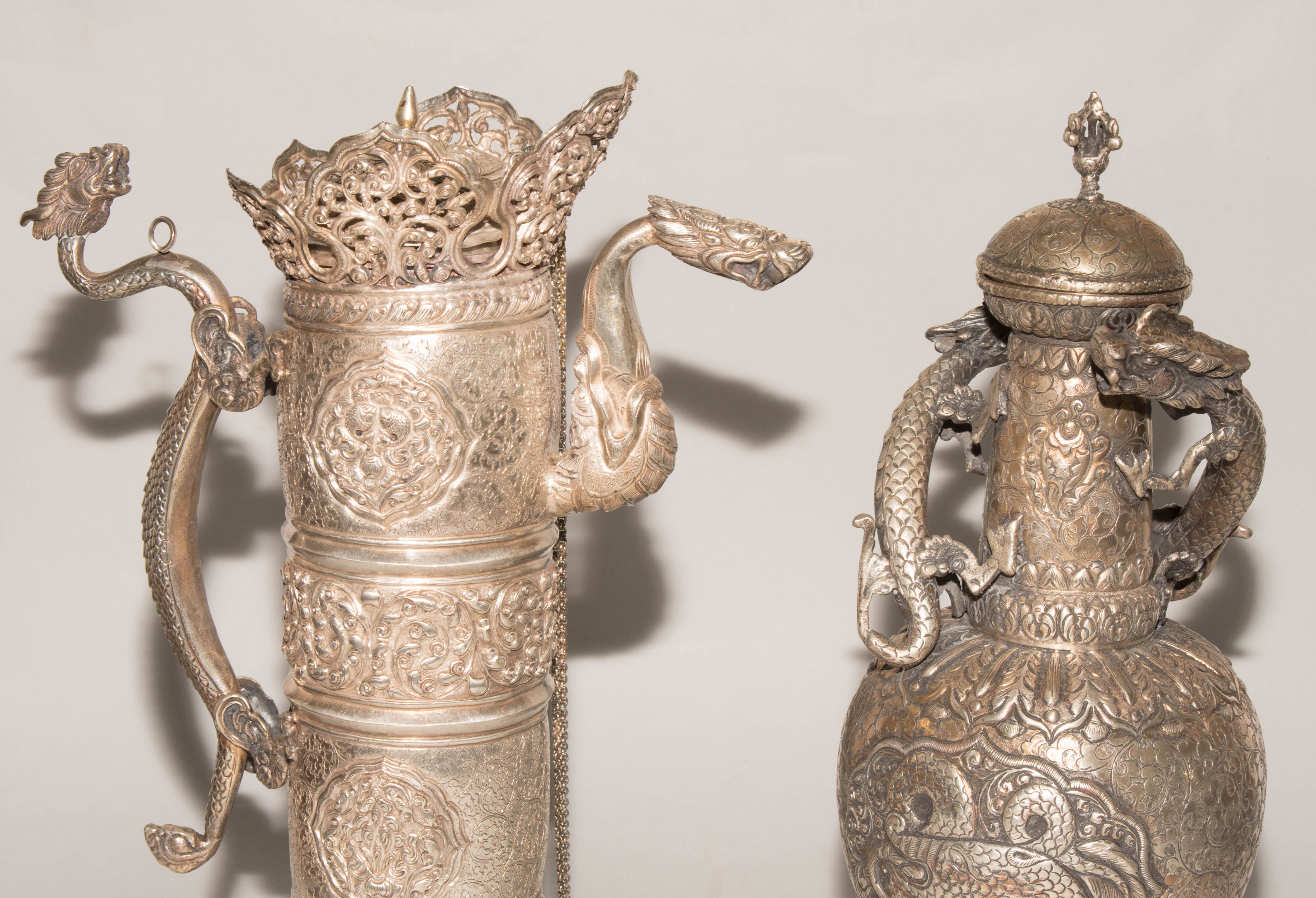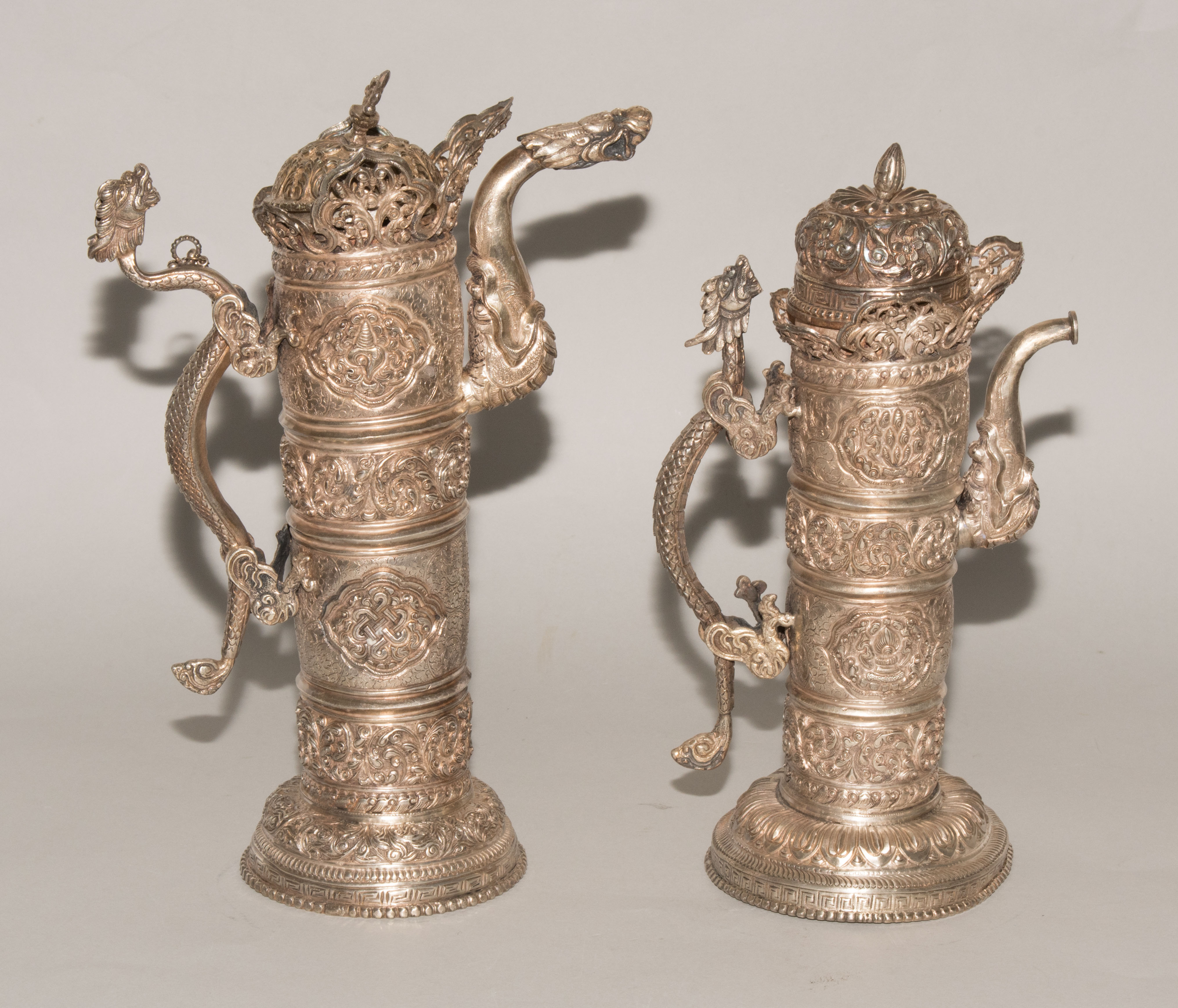 China/Tibet, 20.Jh. Silber. Drei duomuhu-Kannen in zylindrischer Form mit Drachenhenkeln und Drachentüllen. Der Körper ist reich dekoriert mit reliefierten buddhistischen Emblemen und Rankenwerk. Eine Kanne mit ovoidem Körper und langem Hals auf ausladendem Fuss. Ganzflächiger Reliefdekor mit Drache und Fisch in den Paneelen über floralen Motiven. Als Henkel dienen zwei plastische Drachen am Hals. H 28,5–35 cm. Gesamtgewicht ca. 4497 g.