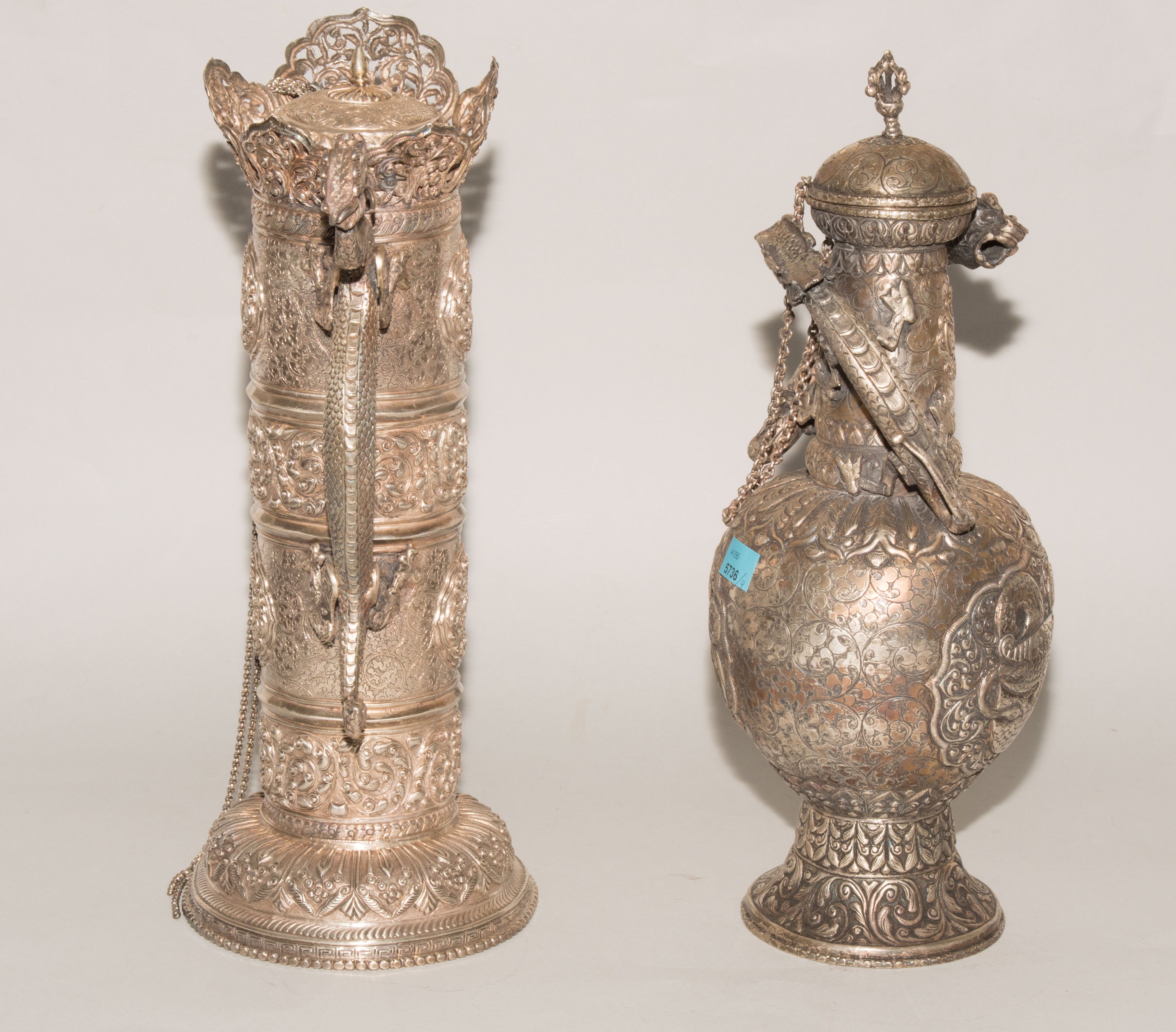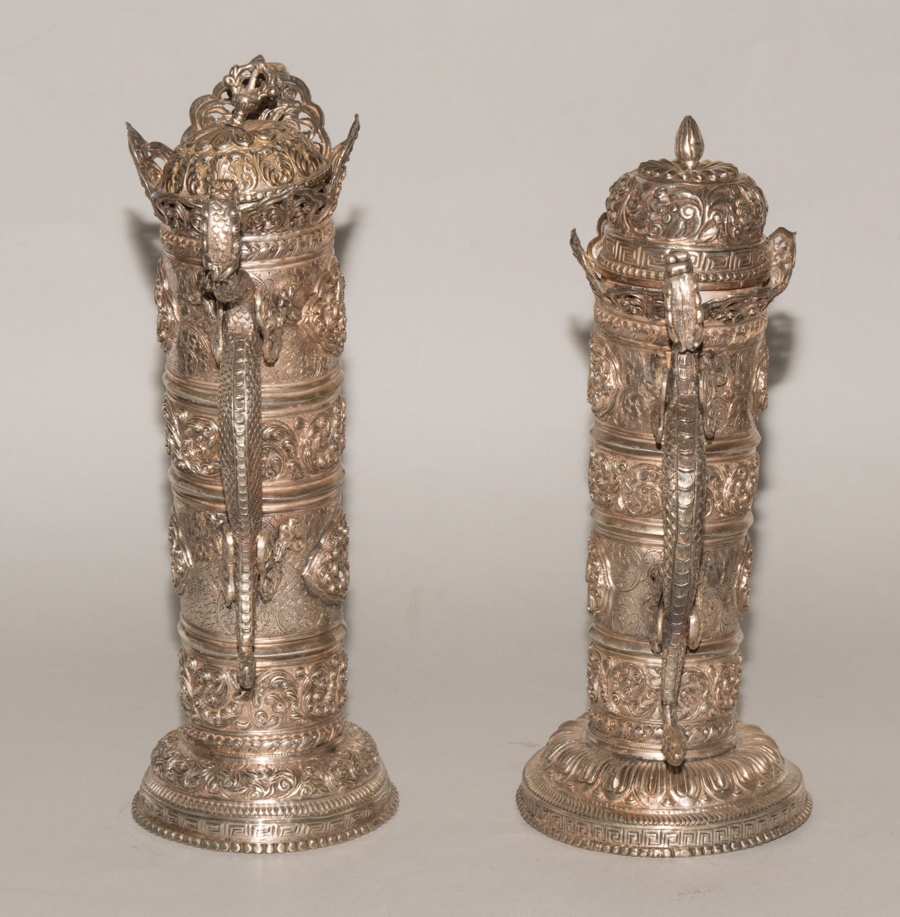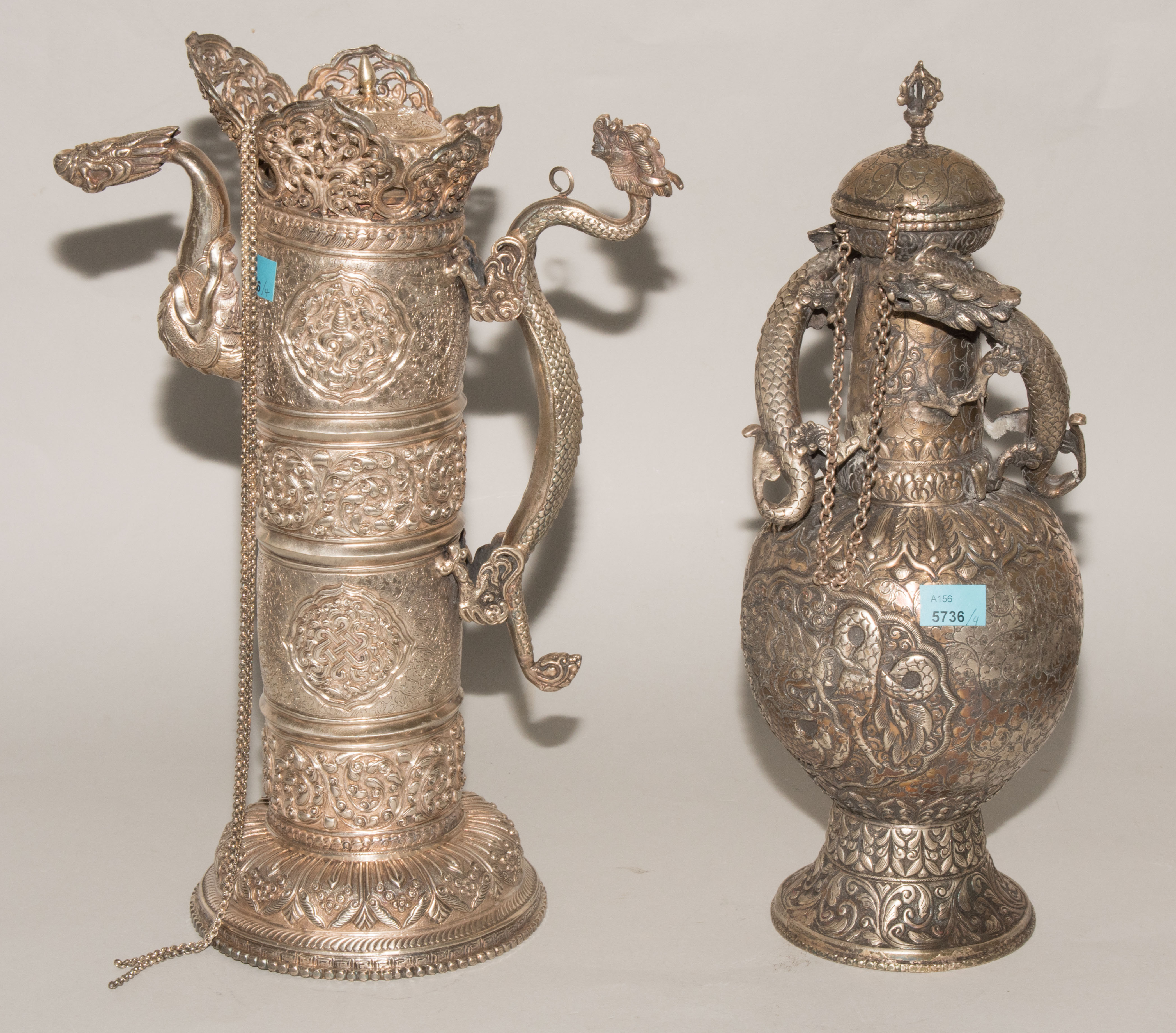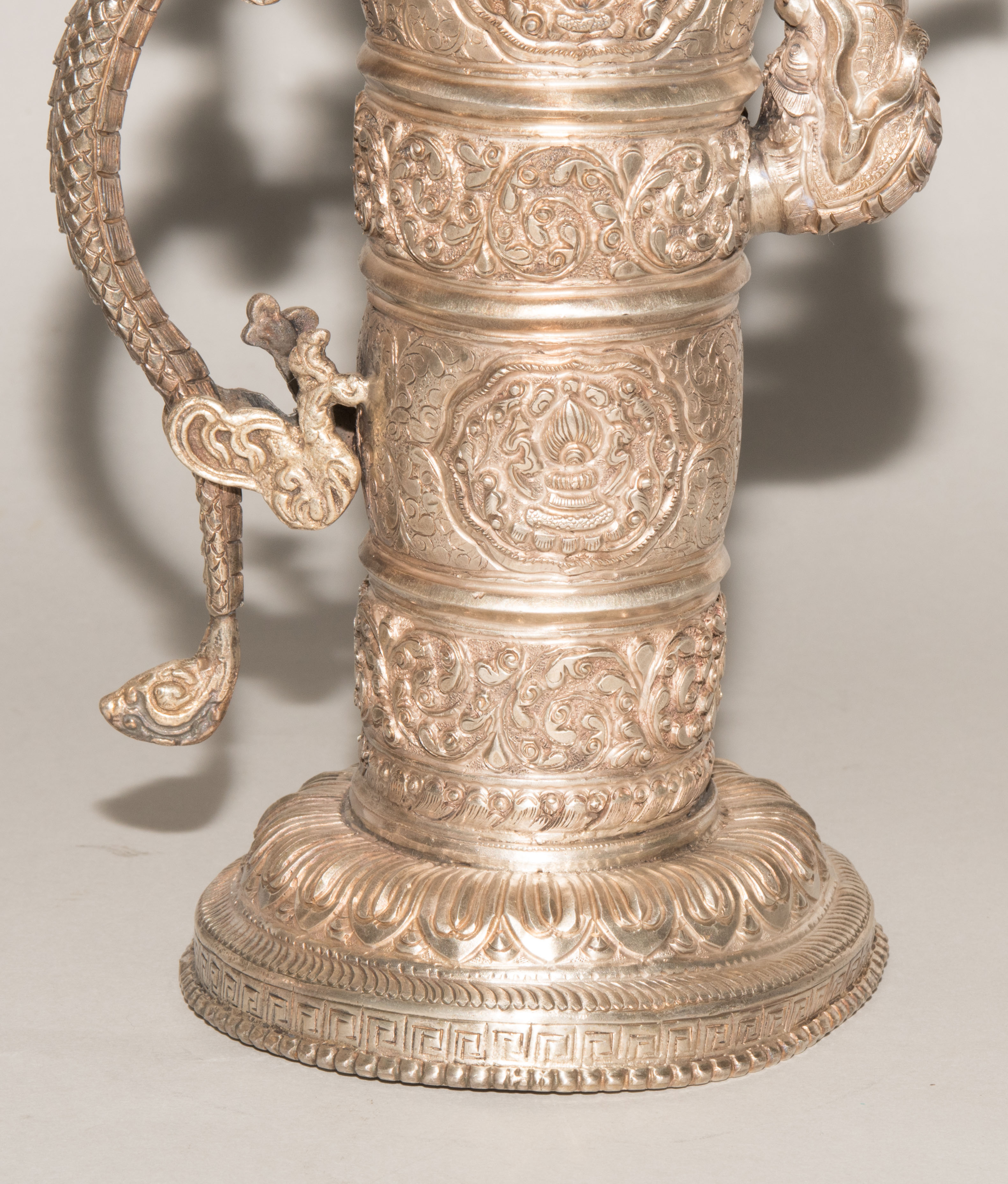 China/Tibet, 20.Jh. Silber. Drei duomuhu-Kannen in zylindrischer Form mit Drachenhenkeln und Drachentüllen. Der Körper ist reich dekoriert mit reliefierten buddhistischen Emblemen und Rankenwerk. Eine Kanne mit ovoidem Körper und langem Hals auf ausladendem Fuss. Ganzflächiger Reliefdekor mit Drache und Fisch in den Paneelen über floralen Motiven. Als Henkel dienen zwei plastische Drachen am Hals. H 28,5–35 cm. Gesamtgewicht ca. 4497 g.