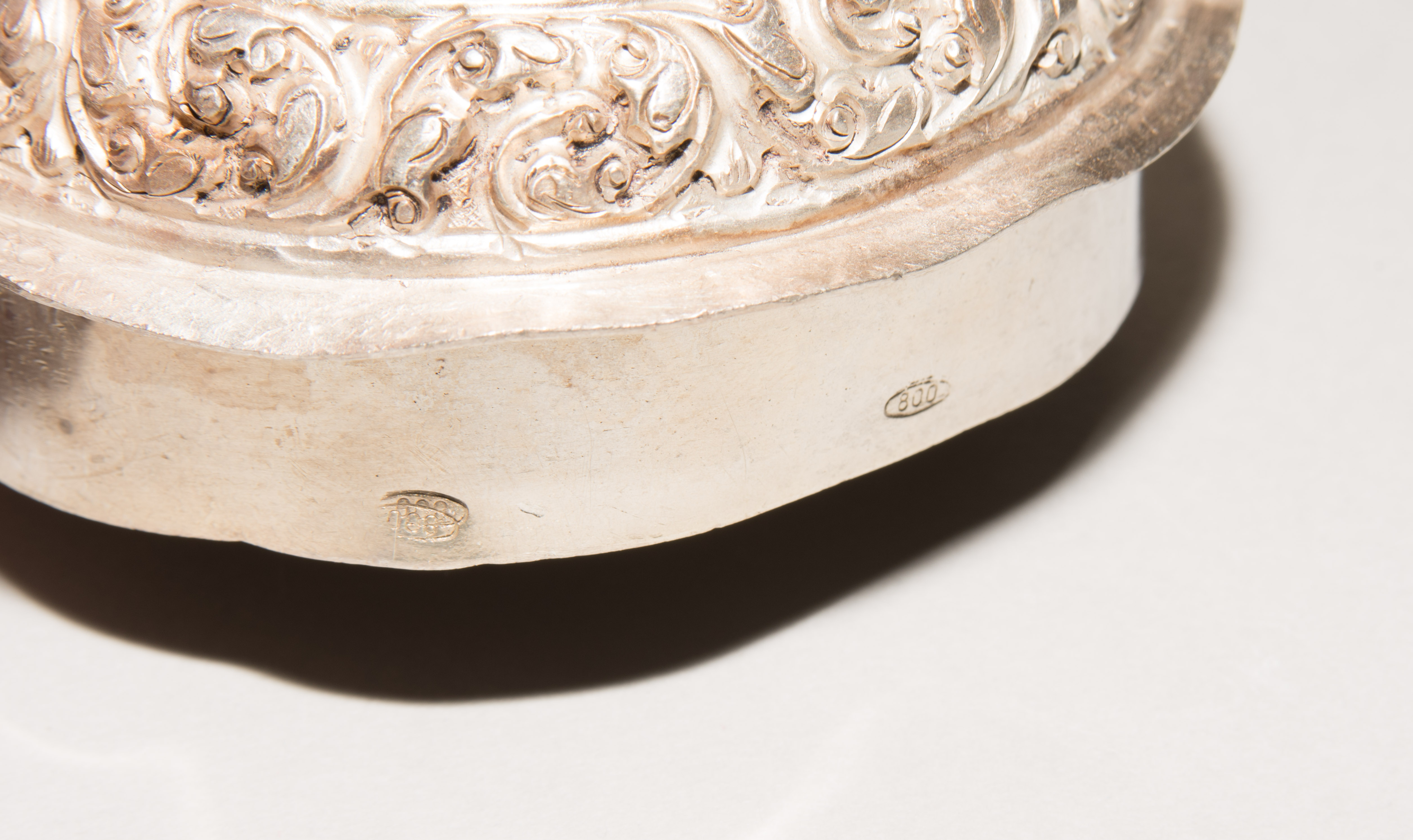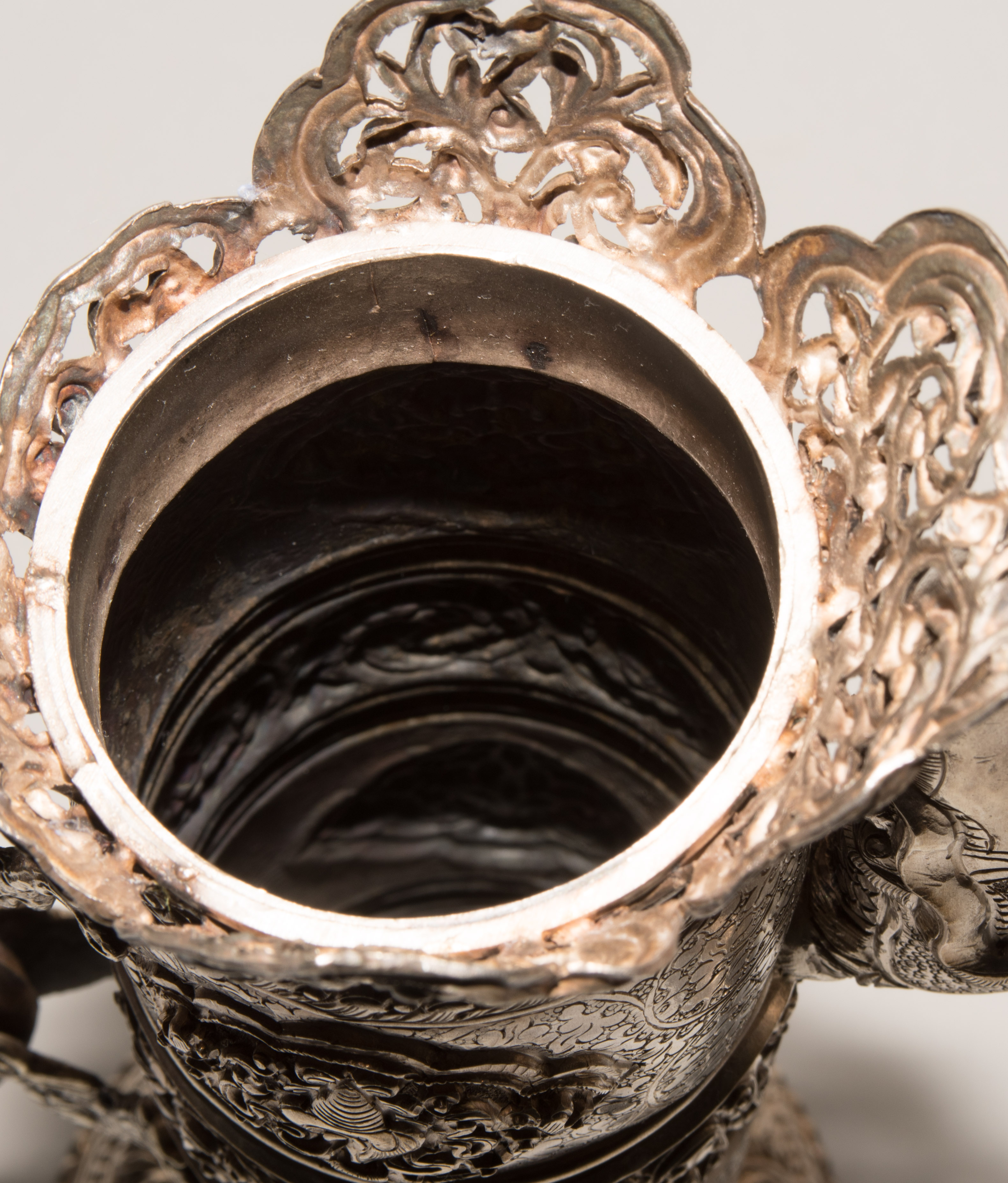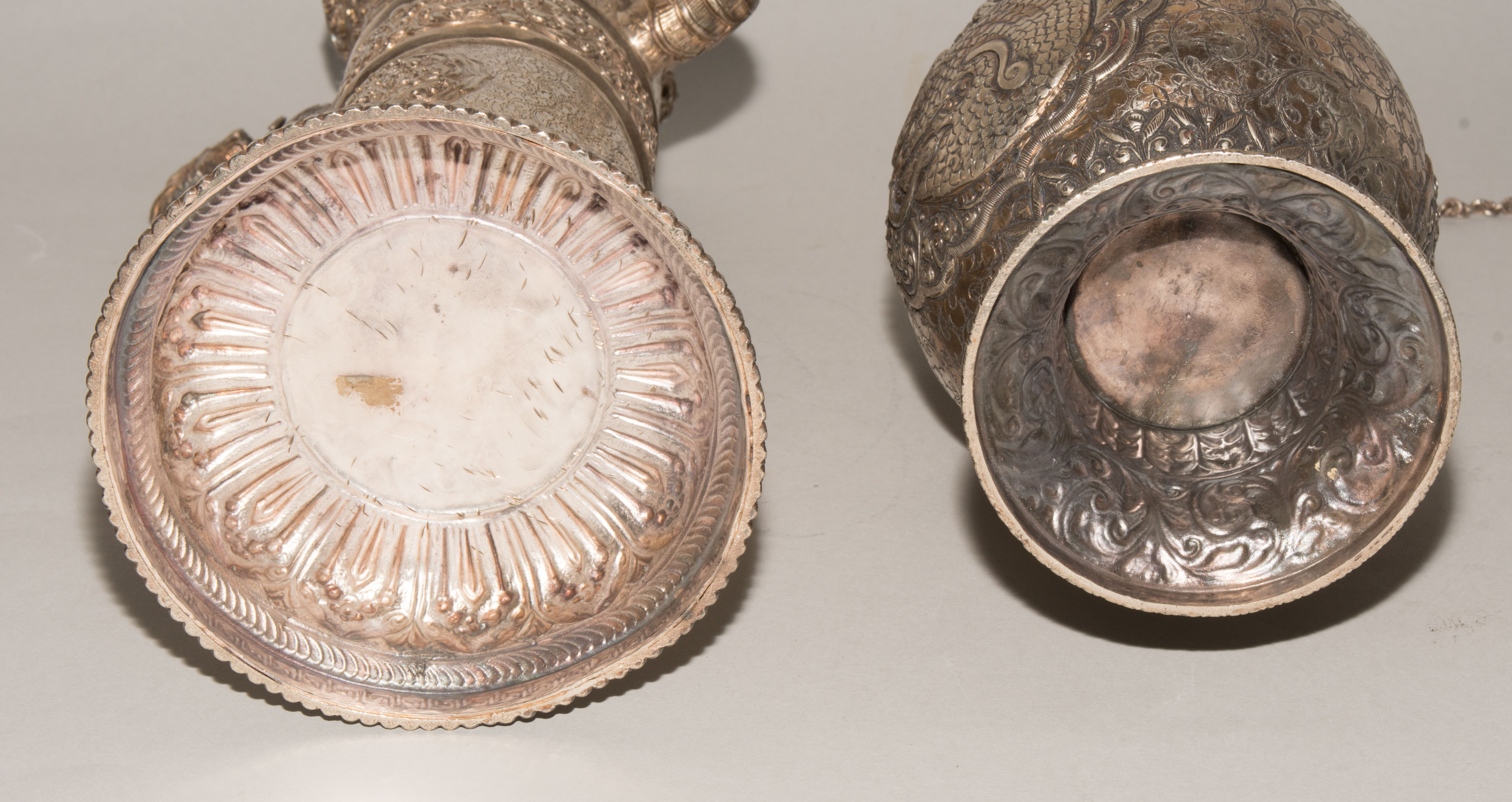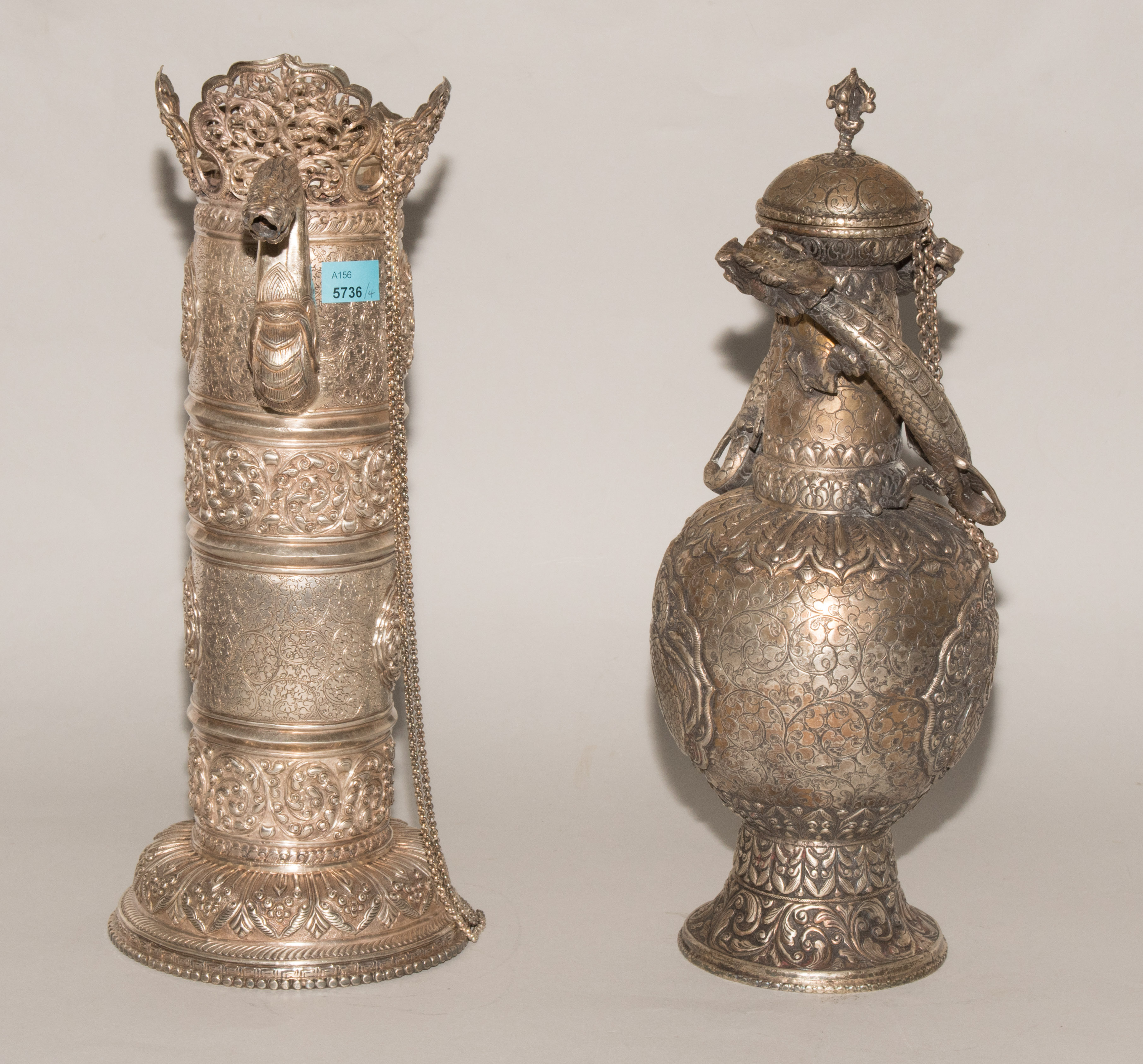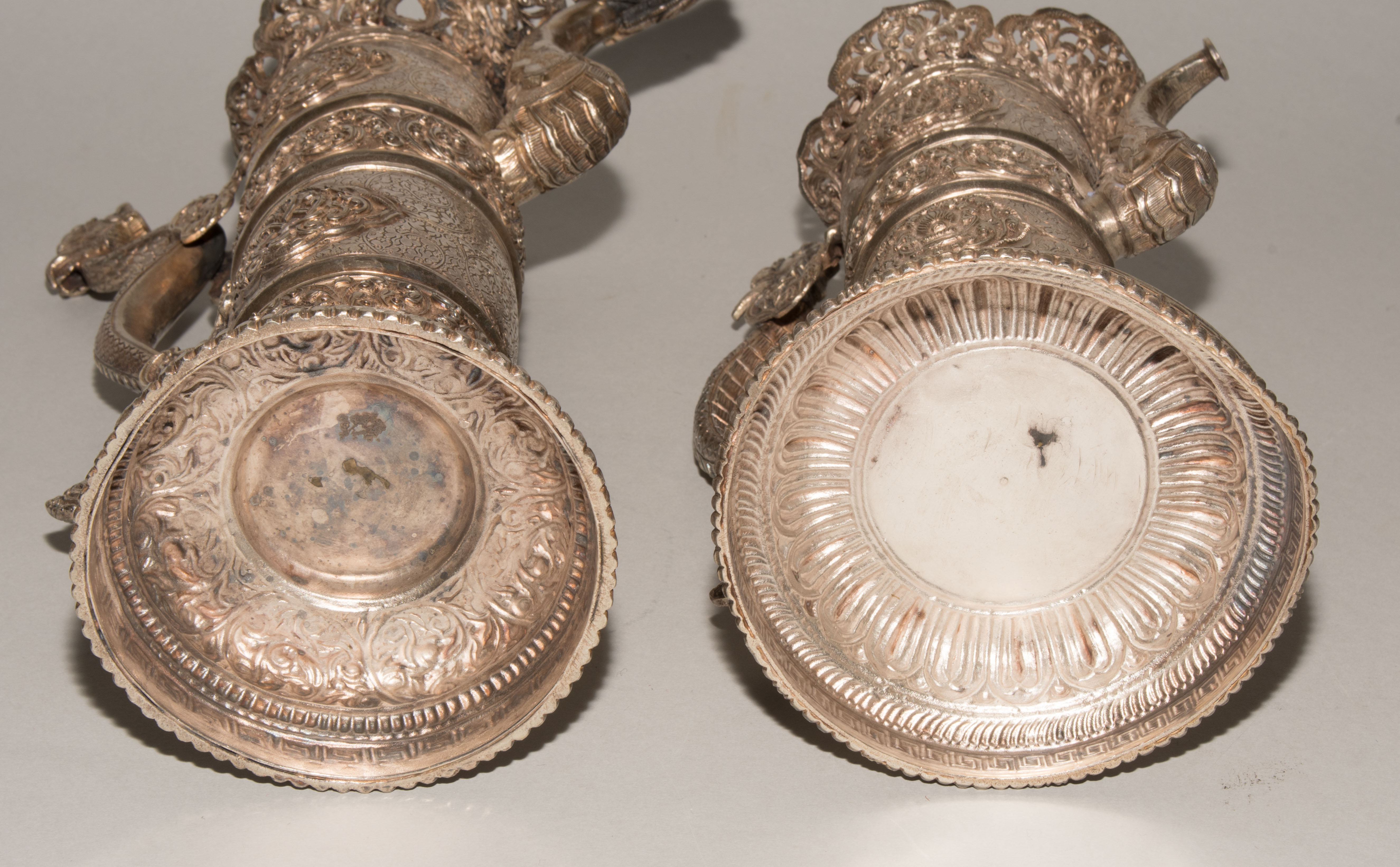 China/Tibet, 20.Jh. Silber. Drei duomuhu-Kannen in zylindrischer Form mit Drachenhenkeln und Drachentüllen. Der Körper ist reich dekoriert mit reliefierten buddhistischen Emblemen und Rankenwerk. Eine Kanne mit ovoidem Körper und langem Hals auf ausladendem Fuss. Ganzflächiger Reliefdekor mit Drache und Fisch in den Paneelen über floralen Motiven. Als Henkel dienen zwei plastische Drachen am Hals. H 28,5–35 cm. Gesamtgewicht ca. 4497 g.