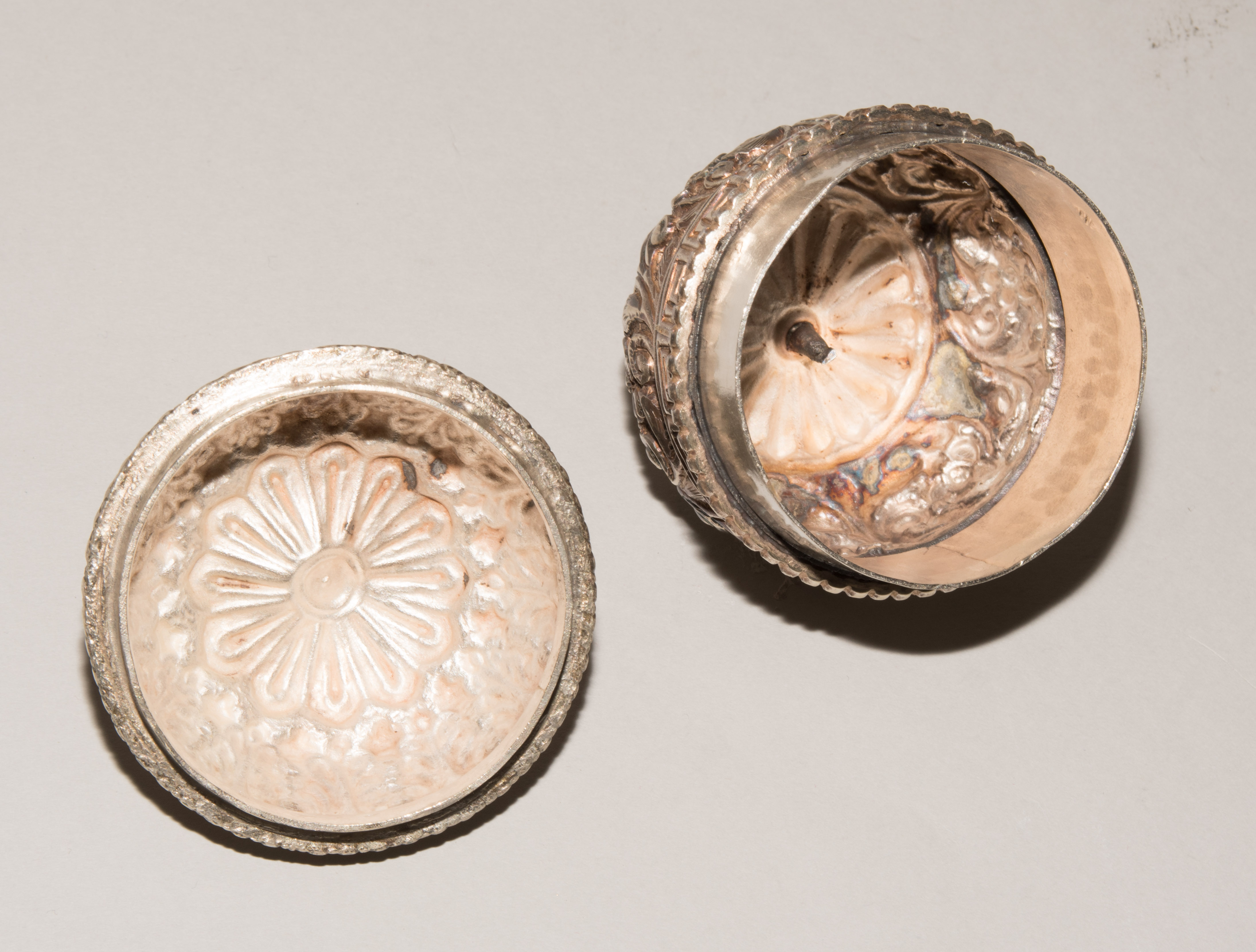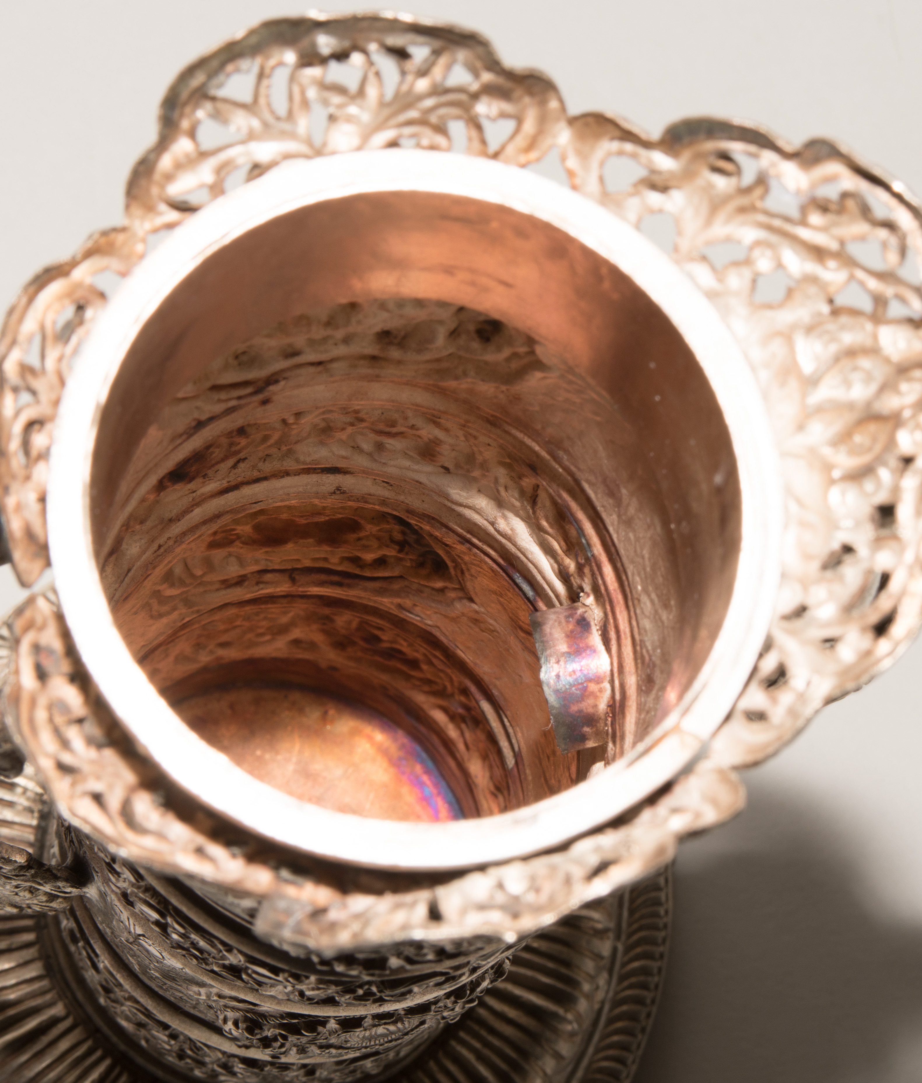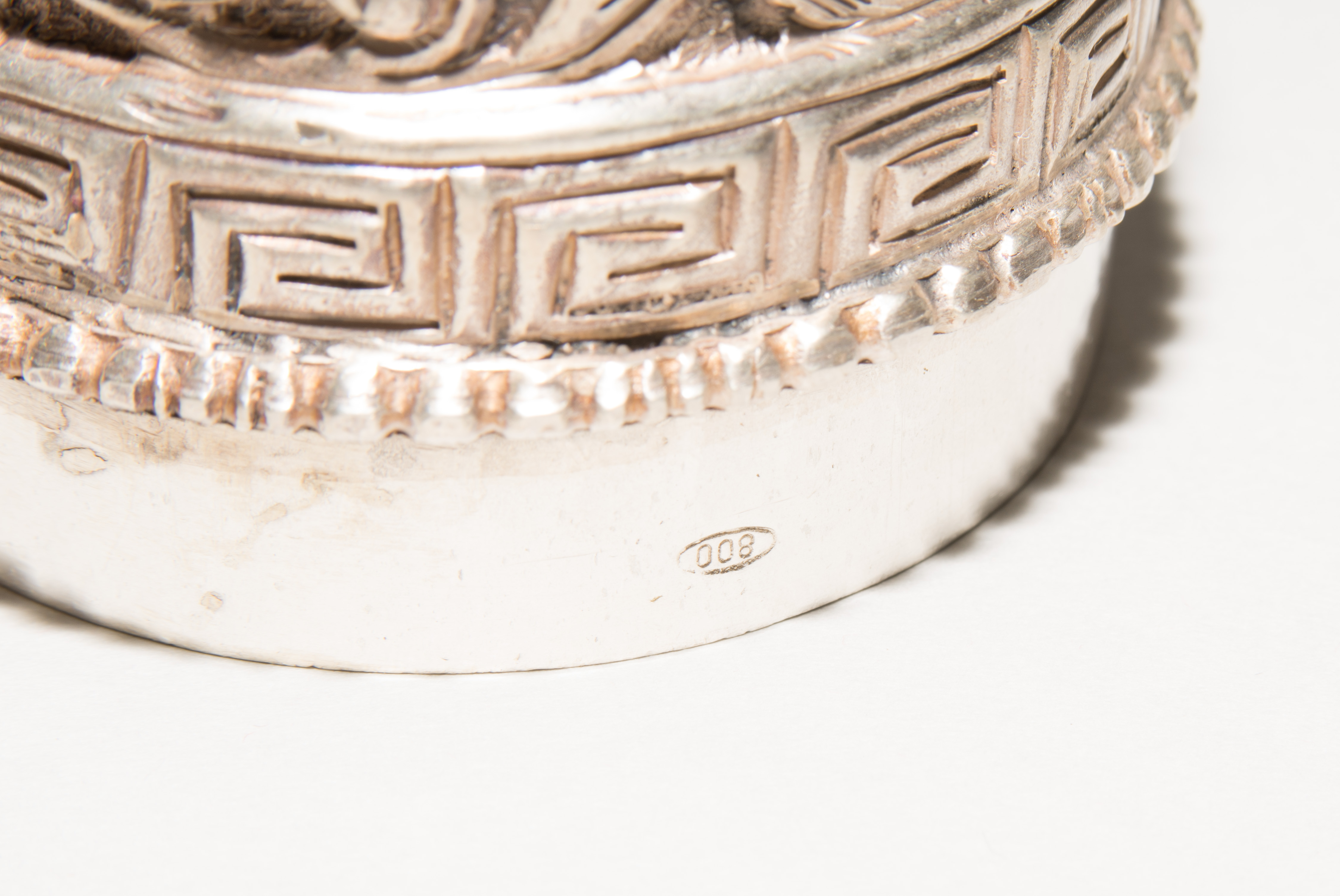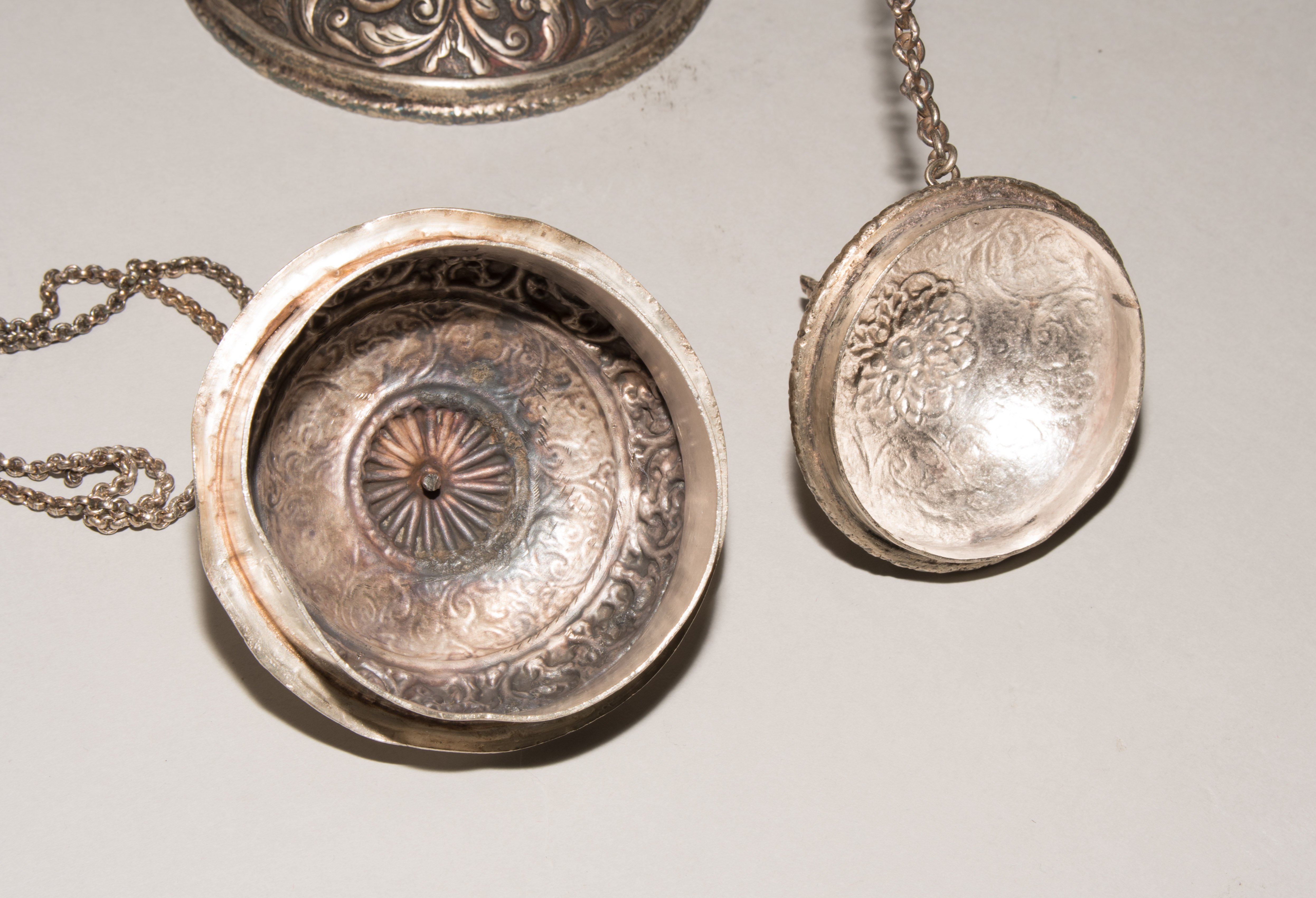 China/Tibet, 20.Jh. Silber. Drei duomuhu-Kannen in zylindrischer Form mit Drachenhenkeln und Drachentüllen. Der Körper ist reich dekoriert mit reliefierten buddhistischen Emblemen und Rankenwerk. Eine Kanne mit ovoidem Körper und langem Hals auf ausladendem Fuss. Ganzflächiger Reliefdekor mit Drache und Fisch in den Paneelen über floralen Motiven. Als Henkel dienen zwei plastische Drachen am Hals. H 28,5–35 cm. Gesamtgewicht ca. 4497 g.