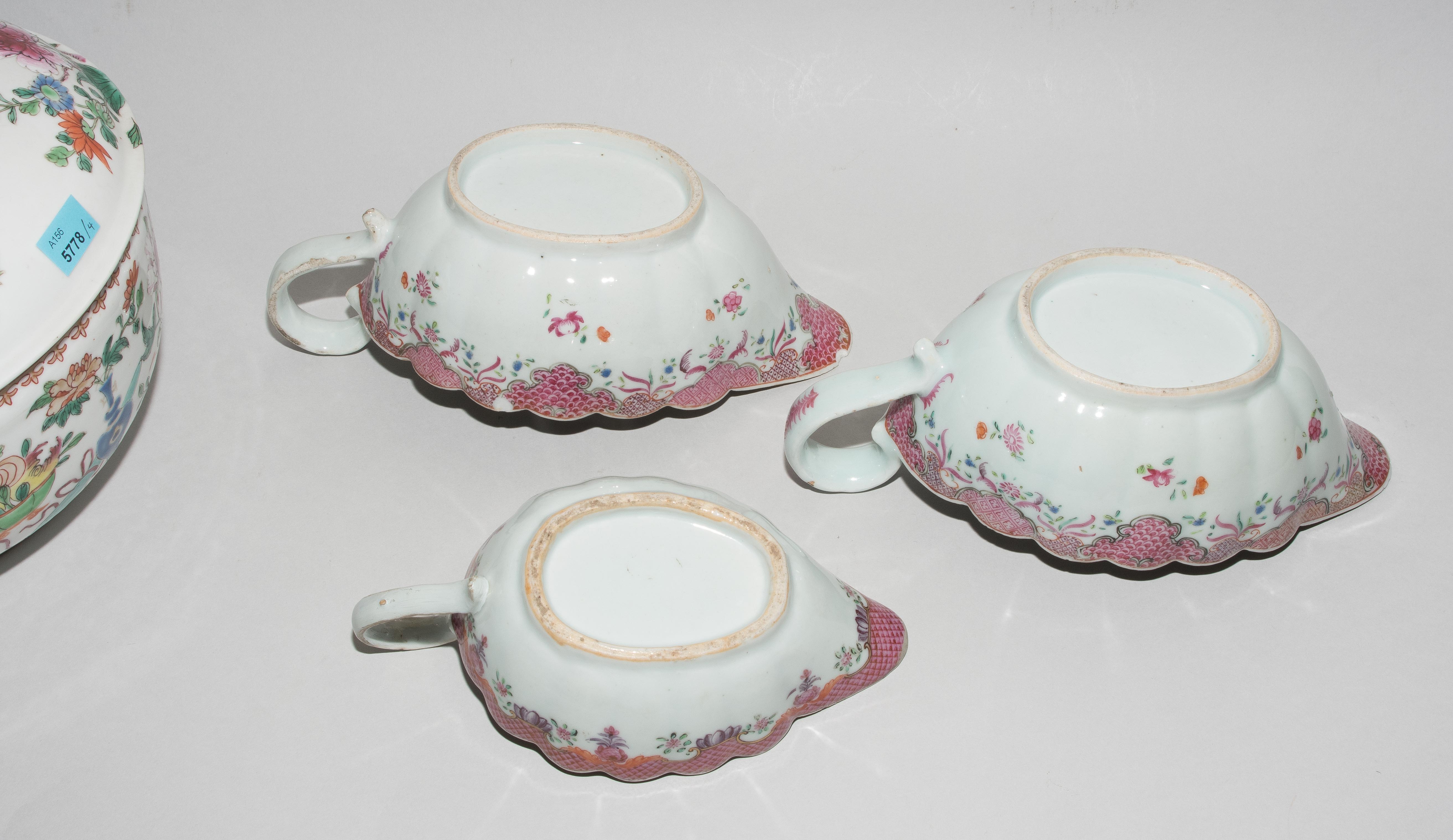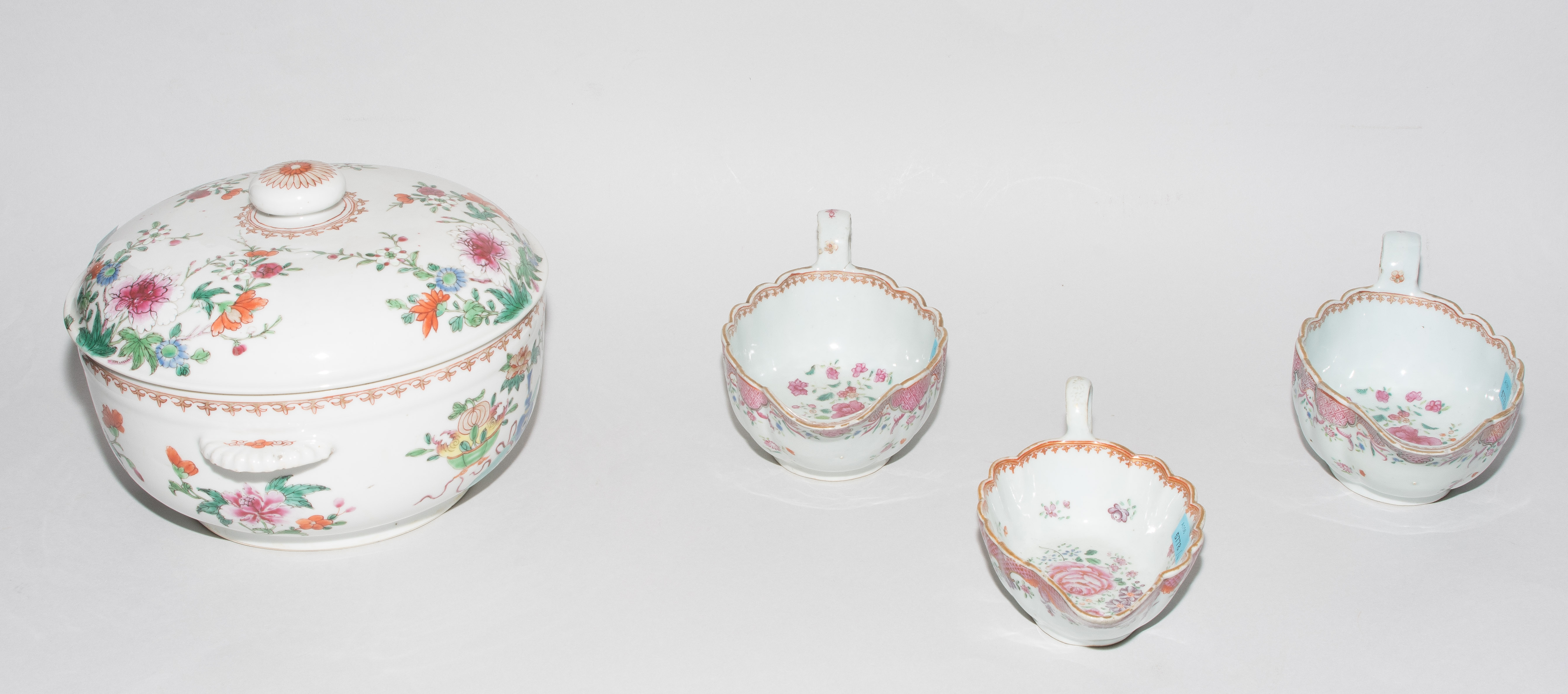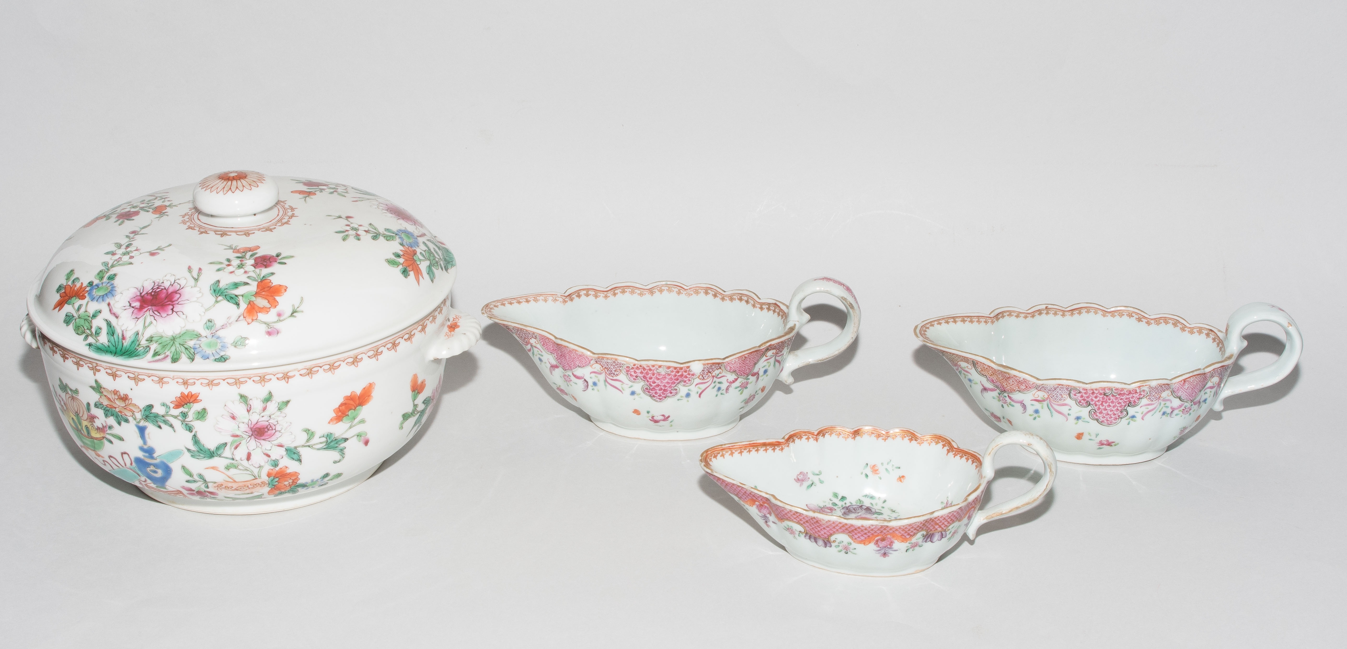China, 18./19.Jh. Porzellan. Famille rose. Runde Deckelterrine mit bombiertem Deckel und muschelförmigen Henkeln. H 18, Ø 23. / Zwei grosse und eine kleine Saucière. H 7,5–9 cm. - Ein Henkel restauriert, Randbeschädigungen.
