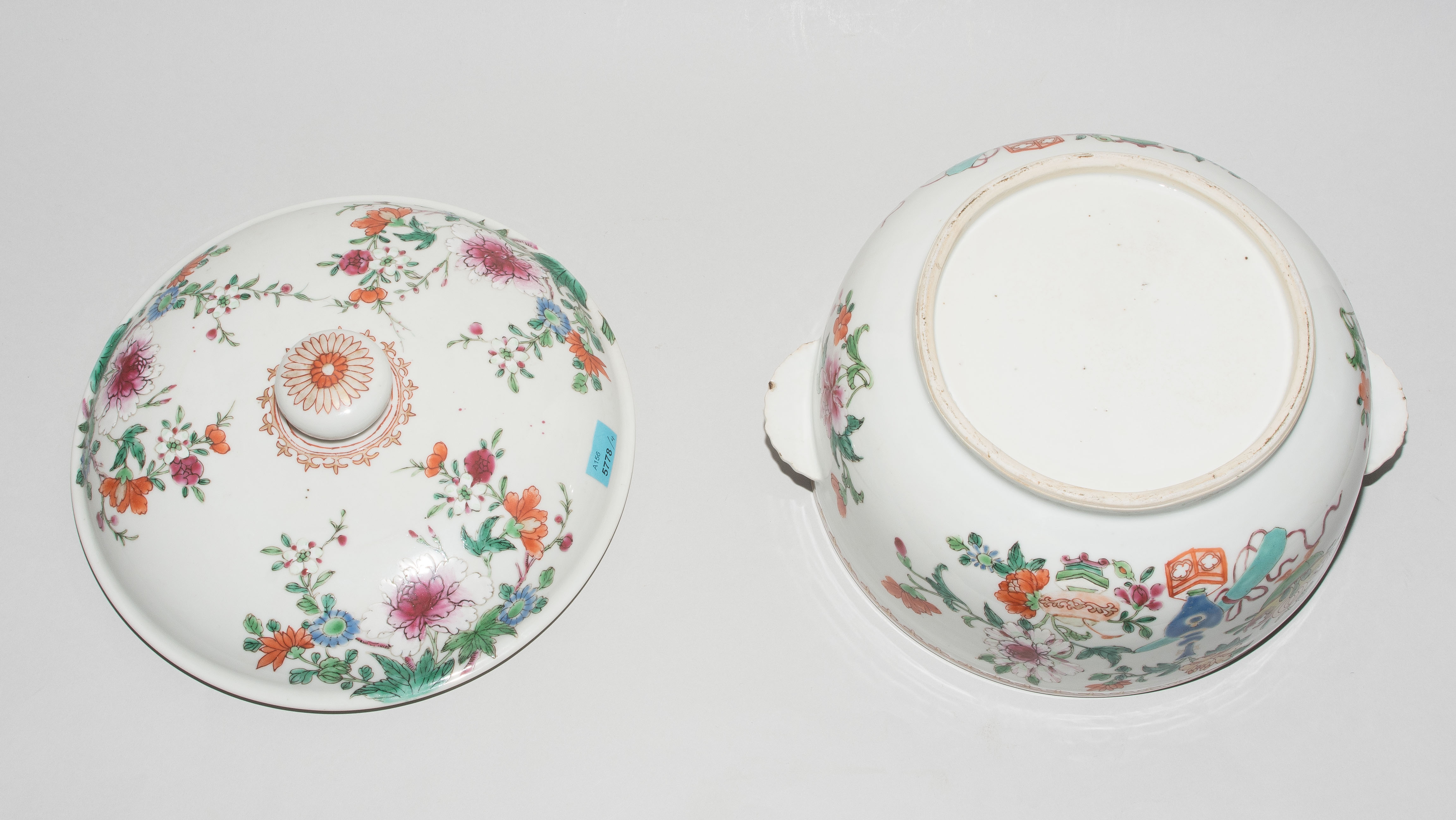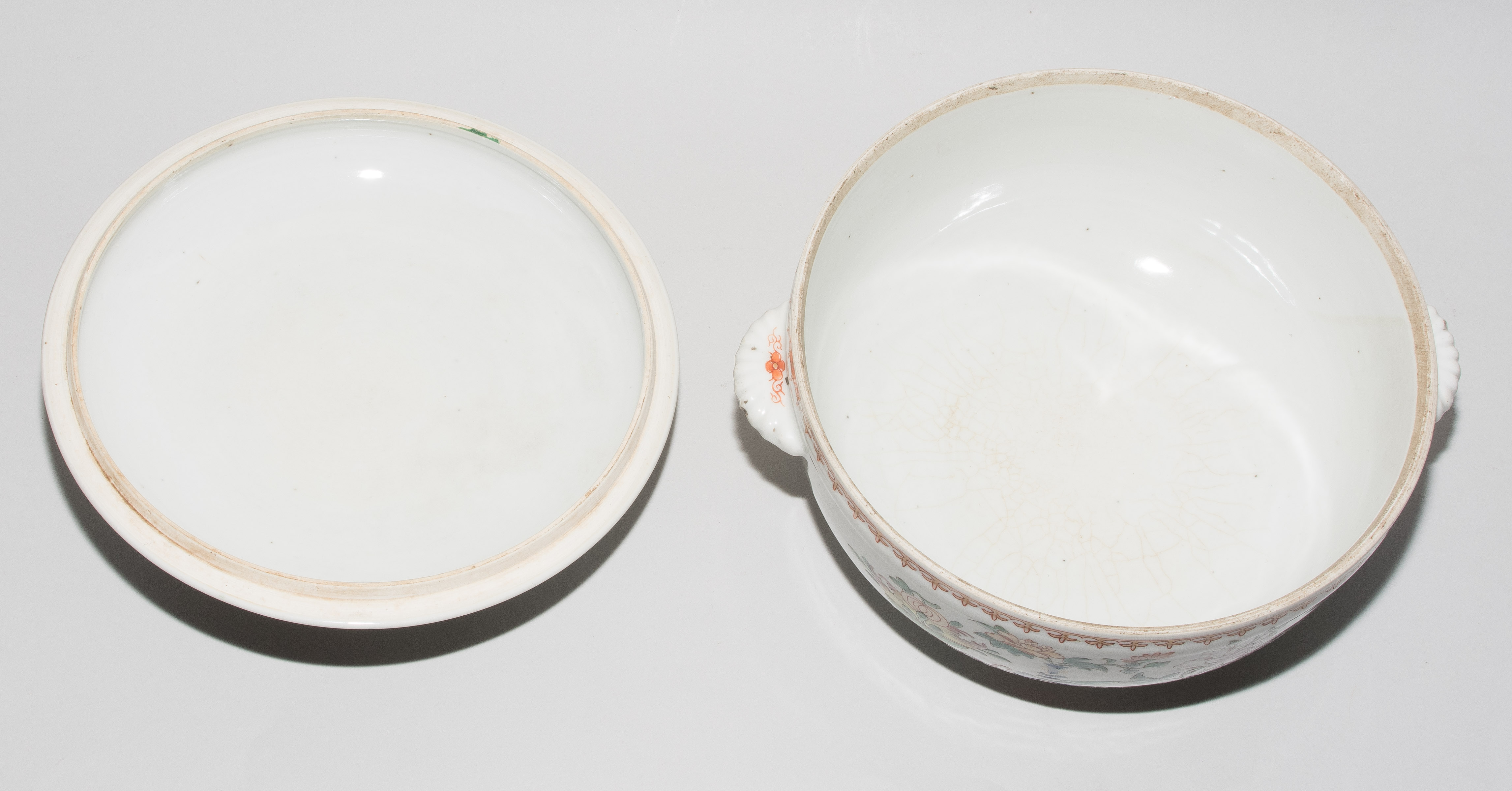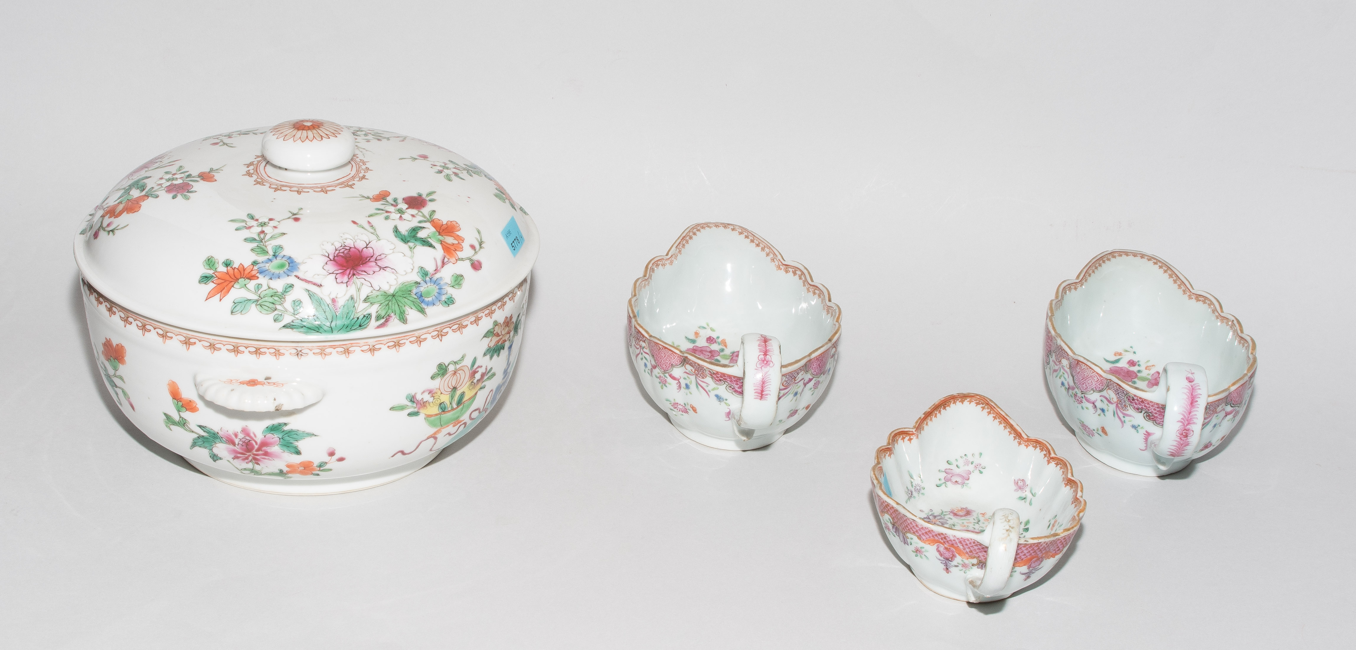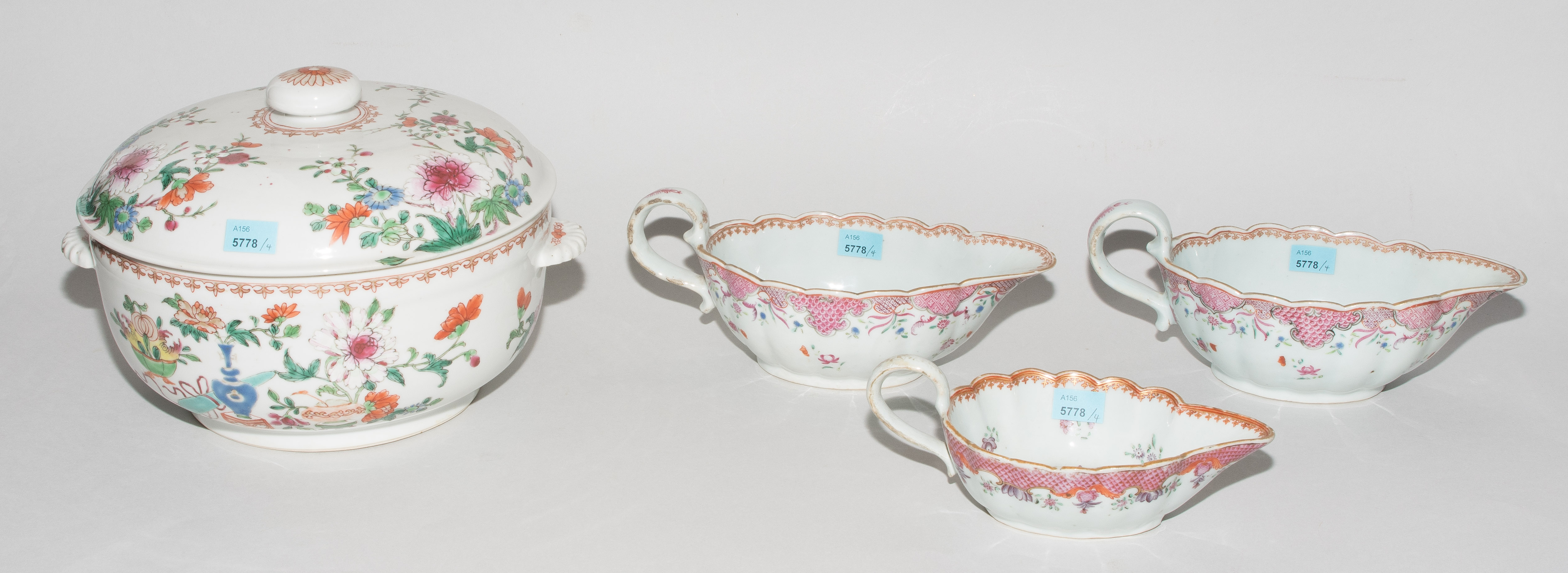 China, 18./19.Jh. Porzellan. Famille rose. Runde Deckelterrine mit bombiertem Deckel und muschelförmigen Henkeln. H 18, Ø 23. / Zwei grosse und eine kleine Saucière. H 7,5–9 cm. - Ein Henkel restauriert, Randbeschädigungen.