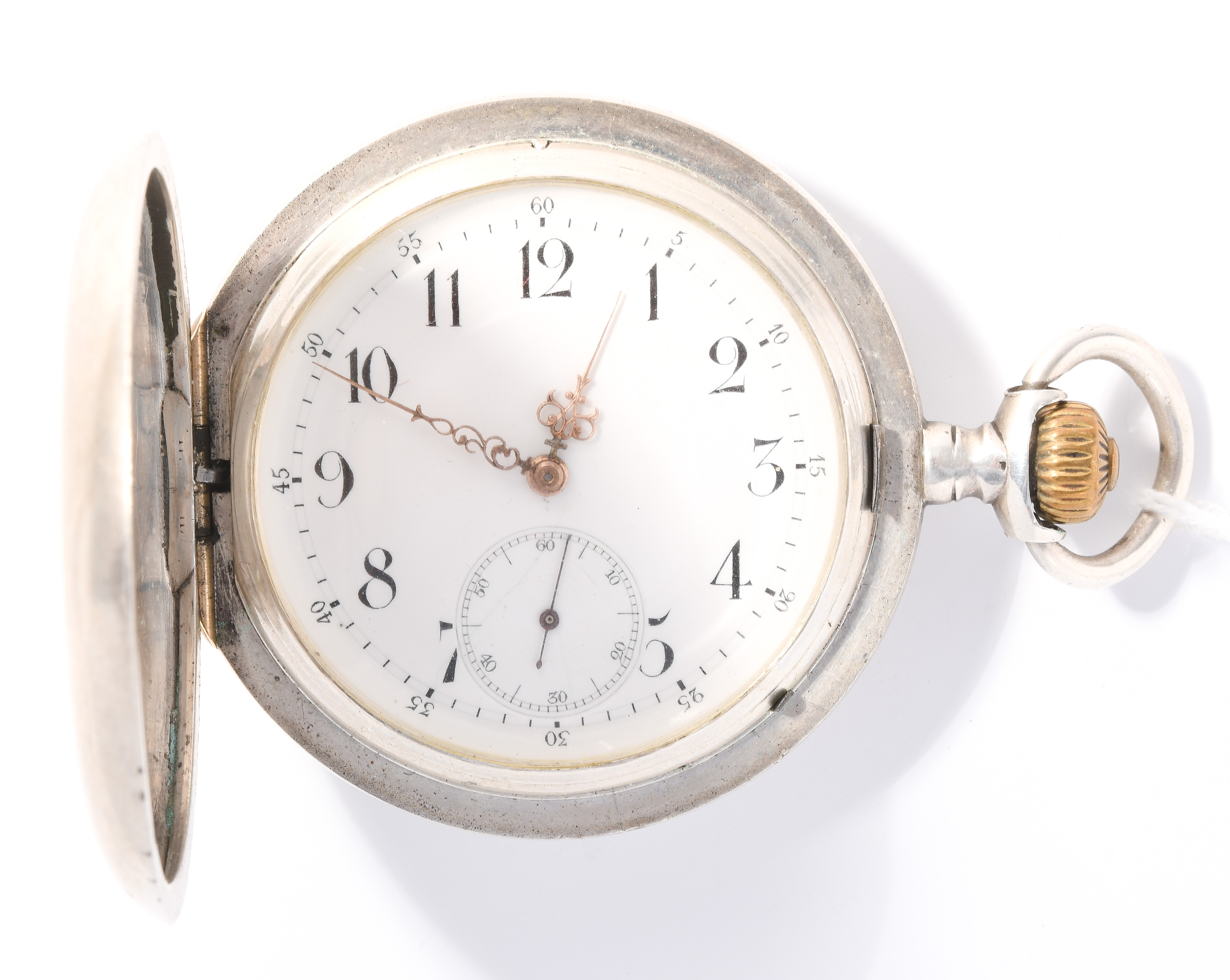 Runde, mechanische Savonnette 1899 mit Handaufzug in Silbergehäuse. Rücken- und Frontdeckel neutral, Werkdeckel signiert, Werknummer 195055, Kaliber 56, Gehäusenummer 234121, D 55 mm. Weisses Emailzifferblatt mit arabischen Stundenzahlen, Louis XV-Zeiger, kleine Sekundenanzeige. Gebrauchsspuren.
