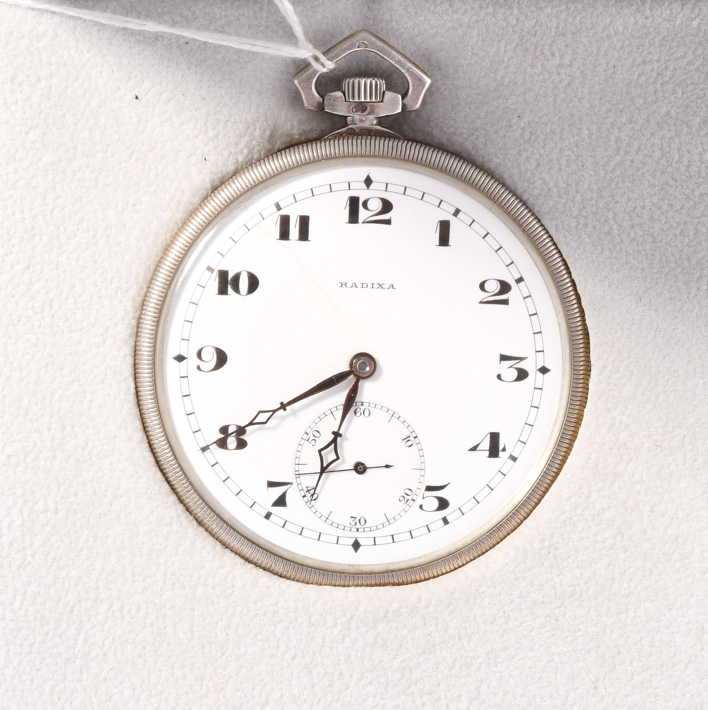 Runde, mechanische Taschenuhr um 1920 mit Handaufzug in Silbergehäuse. Rückendeckel guillochiert, Werkdeckel mit Gravur, Gehäusenummer 80166, D 49 mm. Weisses Emailzifferblatt mit arabischen Stundenzahlen, Kathedral-Zeiger, kleine Sekundenanzeige. Box beigegeben. Gebrauchsspuren.