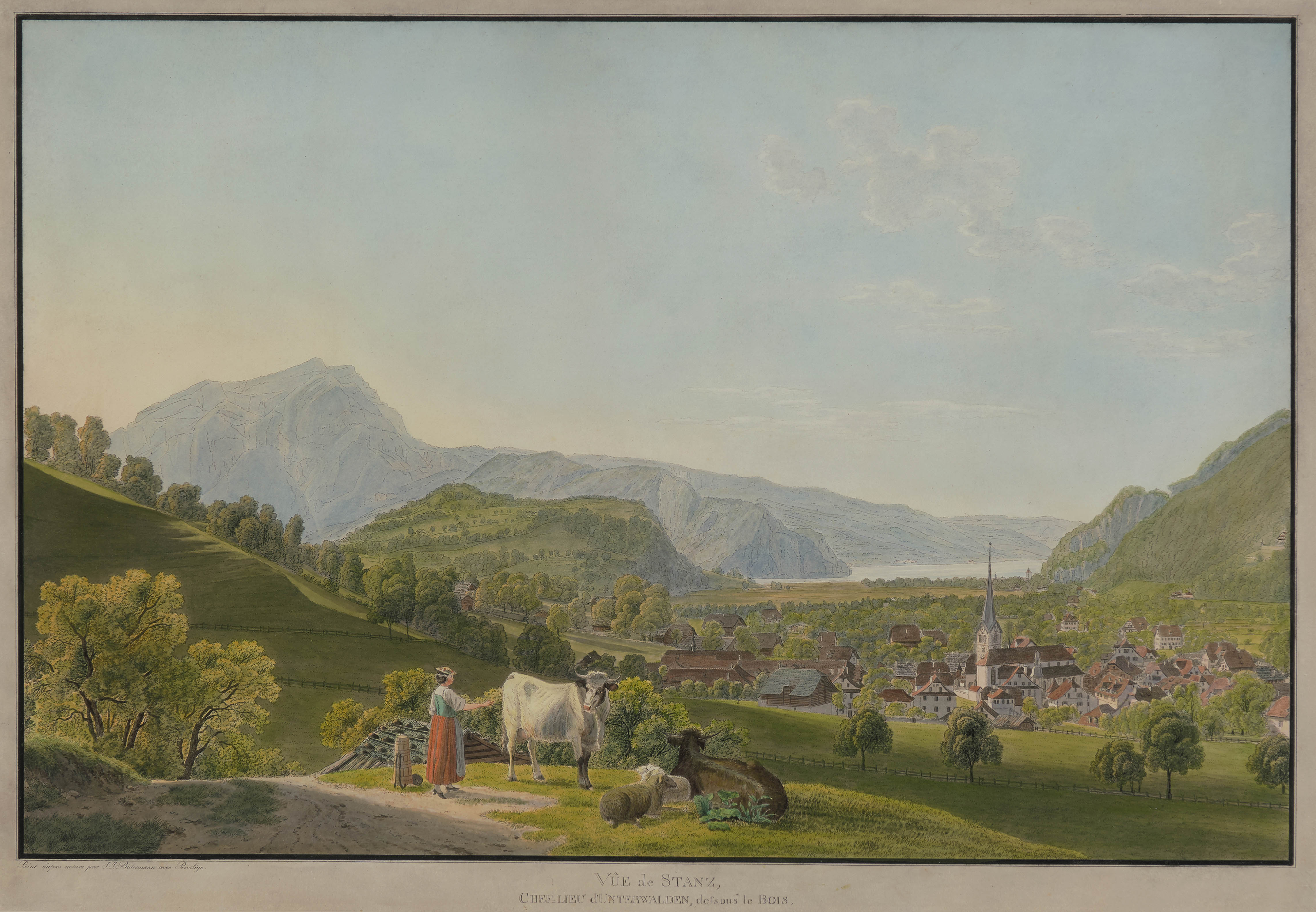 "Vûe de Stanz, Chef=Lieu d'Unterwalden, dessous le Bois". Kol. Umrissradierung, 1796. 39x59,3 cm. Gerahmt. - Grau aquarellierter Rand. - Allseitig bis auf den Plattenrand beschnitten.