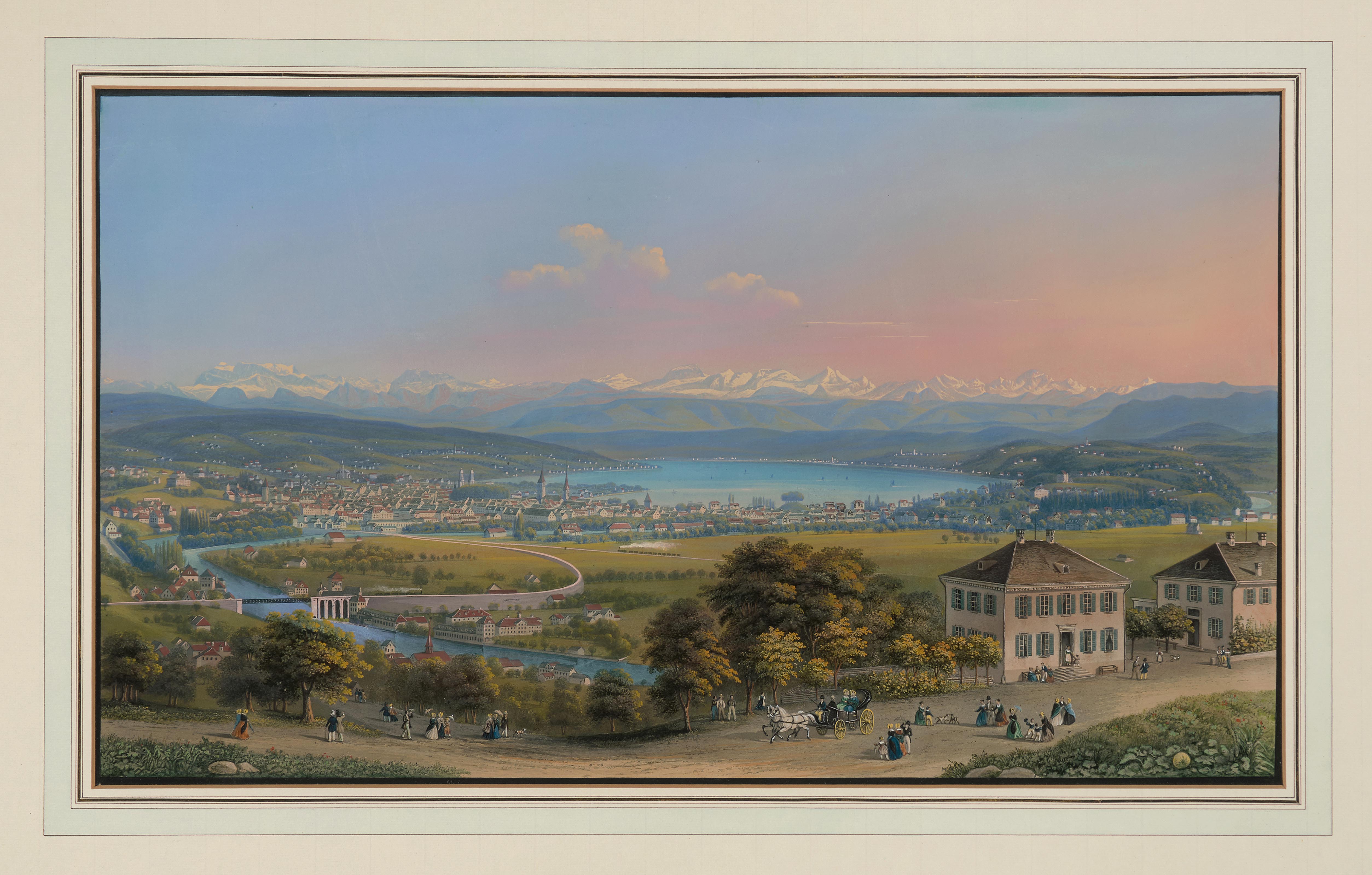 Zürich von der Waid aus gesehen. Altkol. Aquatinta, 1860. 33,8x57,8 cm. Gerahmt. - Allseitig bis auf den Bildrand beschnitten und alt aufgezogen. Mit einigen, kaum wahrnehmbaren Wisch- bzw. Kratzspuren im linken Drittel des Blattes.