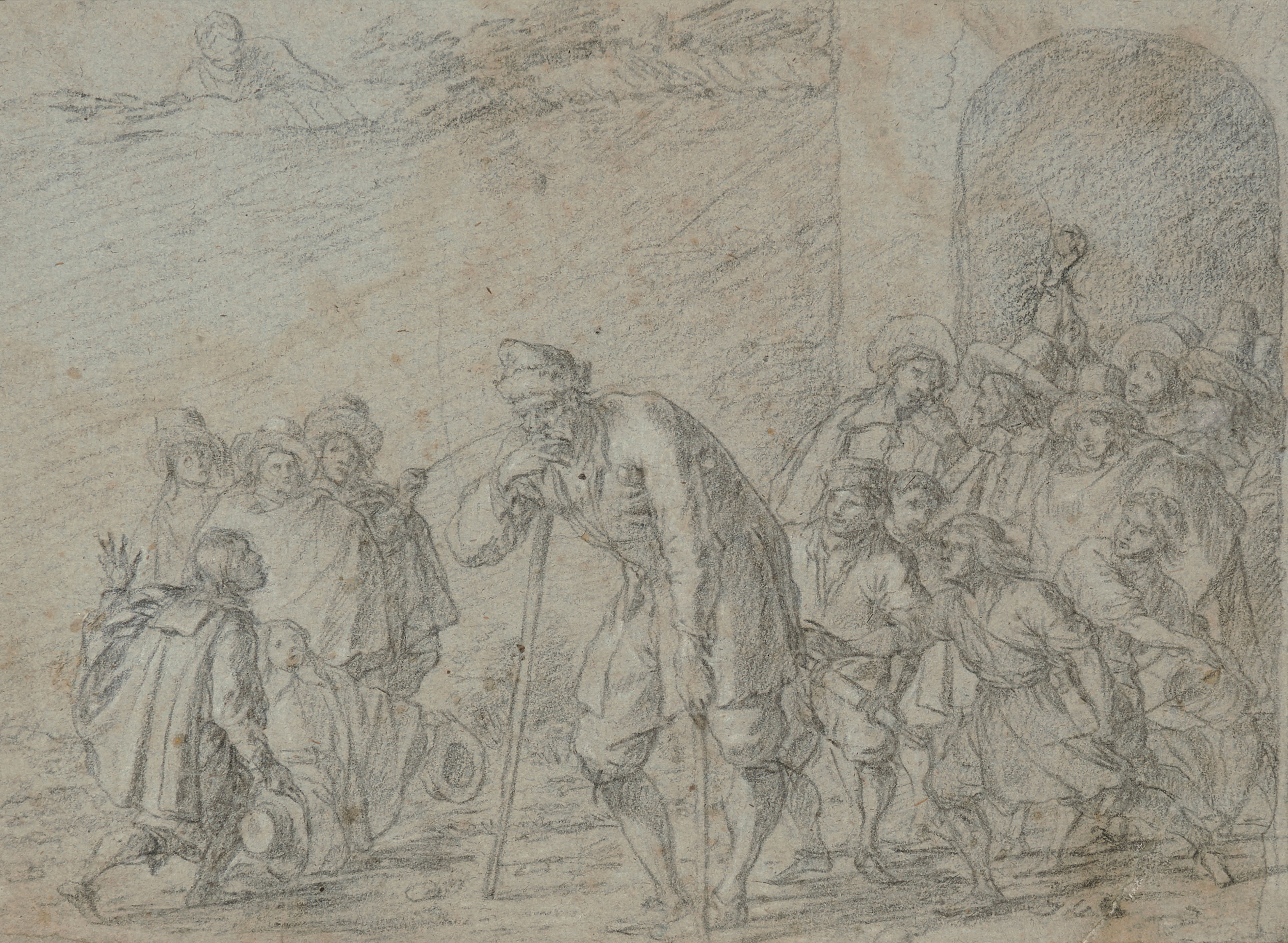Schlechte Nachricht. Ein kniender Bote vor einem greisen Hausherrn und Gesinde. Kreide auf graublauem Papier. 19,5x26,5 cm. - Alt auf Sammlungsunterlage aufgezogen. Etwas gebräunt und fleckig. Einige restaurierte Randmängel. Die rechte untere Ecke mit restauriertem Einriss von ca. 5 cm.