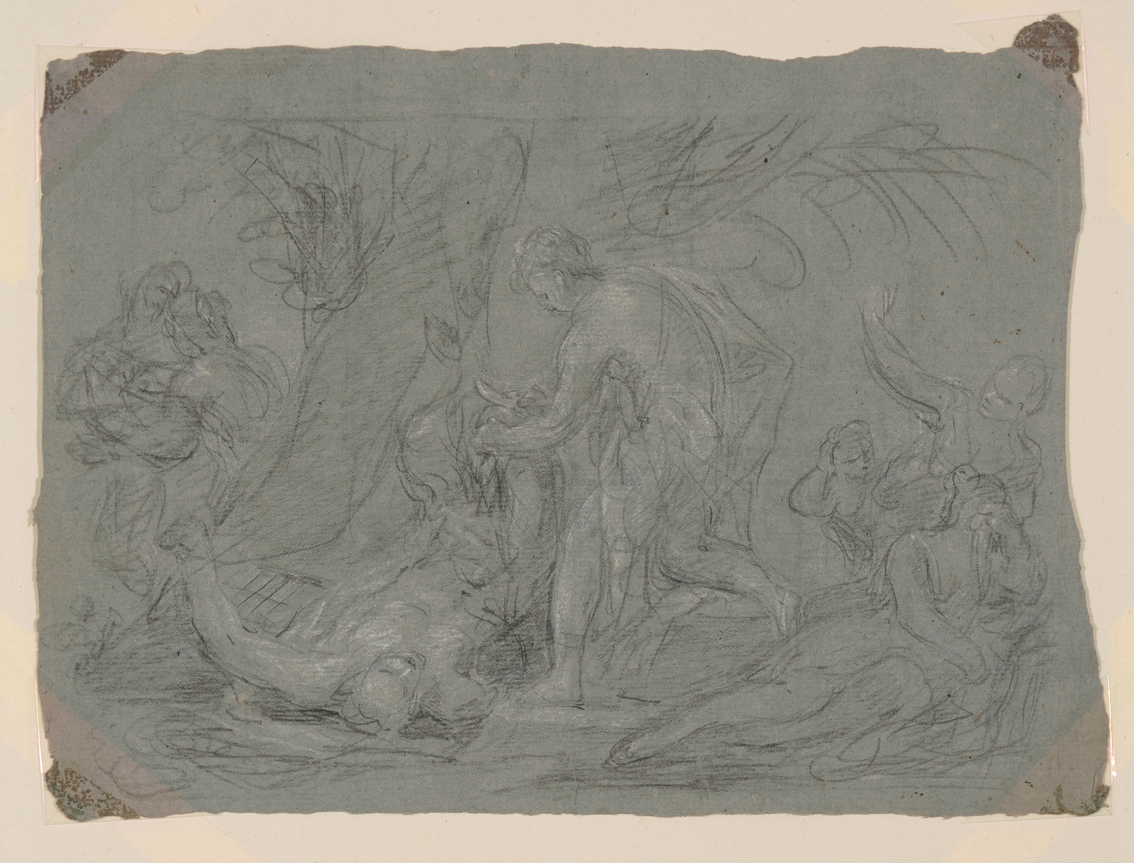 Apoll schindet Marsyas (recto) / Studie eines männlichen Rückenaktes (verso). Schwarze Kreide, weiss gehöht, auf graublauem Bütten. 21,7x29,5 cm. - Auf Papier mit angeschnittenem WZ "Lilie im Kreis". - Minimal fleckig. In den Ecken die Rückstände einer früheren Befestigung mit Klebestreifen.
