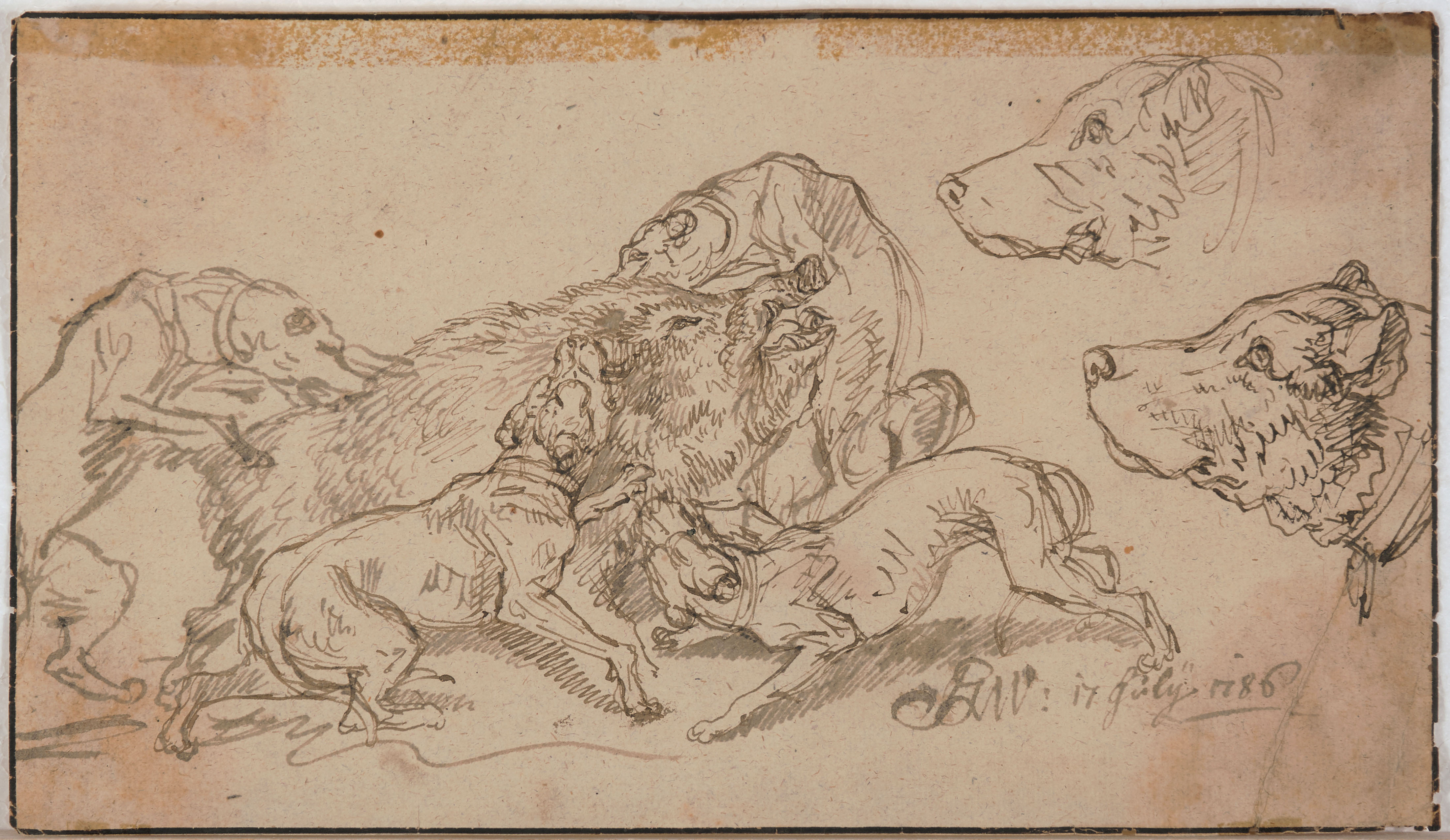 Sauhatz (vier Hunde greifen einen Eber an). Federzeichnung in Braun über Kreide, 1786. 19x32,2 cm. Unten rechts monogrammiert und datiert "17 Julij 1786". - Durchschlagende Leimspuren am oberen Rand, etwas gebräunt und fleckig und mit Knickspuren. Randmängel.