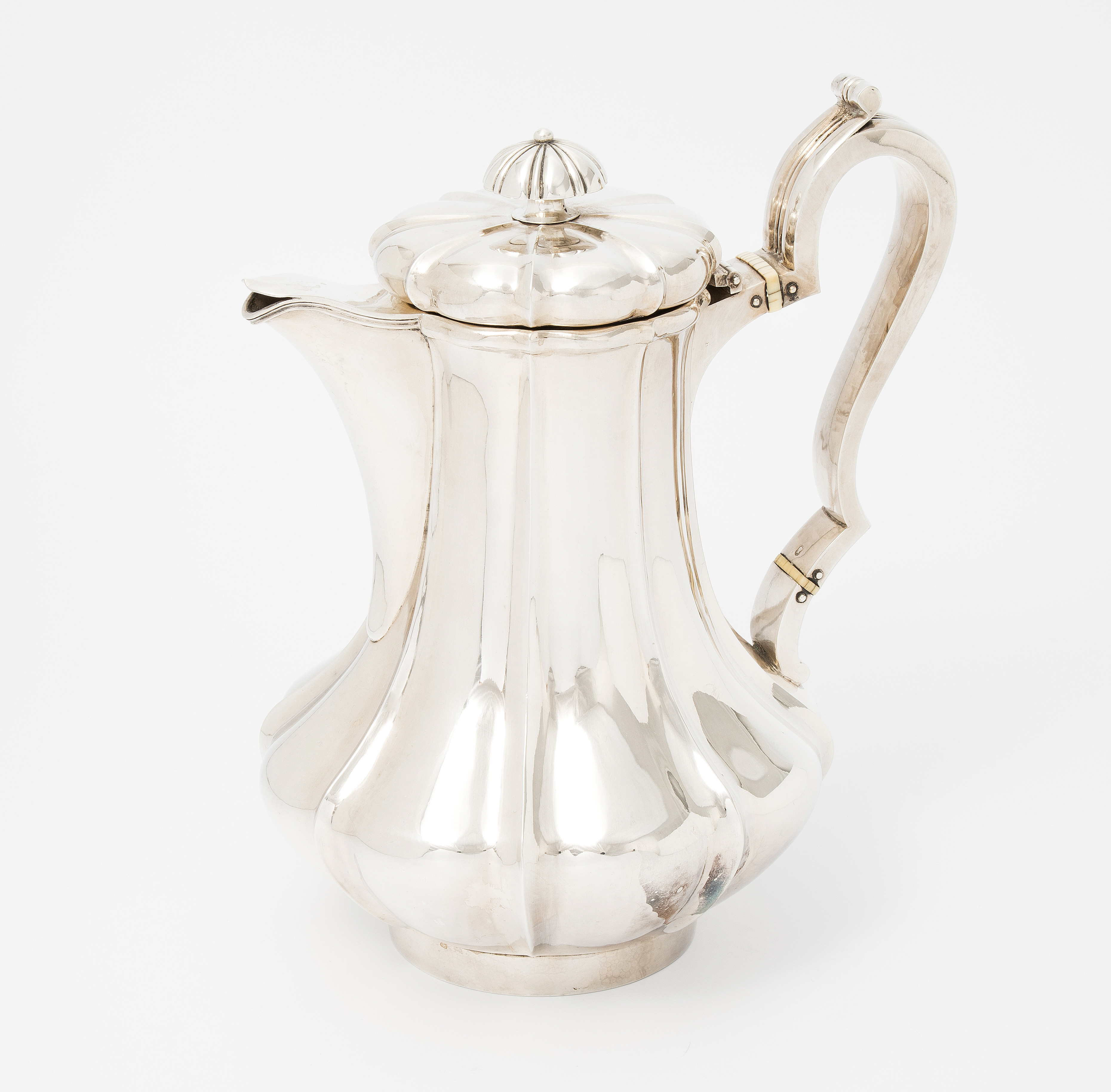 1838. Silber. Meistermarke James Fray. Spitzbauchiger Korpus mit schlankem Hals, gewöbtem Deckel mit Knospenknauf, Schnabelausguss und hochgezogenem, geschweiftem Henkel. Wandung mit vertikalen Faltenzügen. Dubliner Beschau-, Meister- und Jahresmarke. H 24,5 cm, ca. 830 g.- Alters- und Gebrauchsspuren.