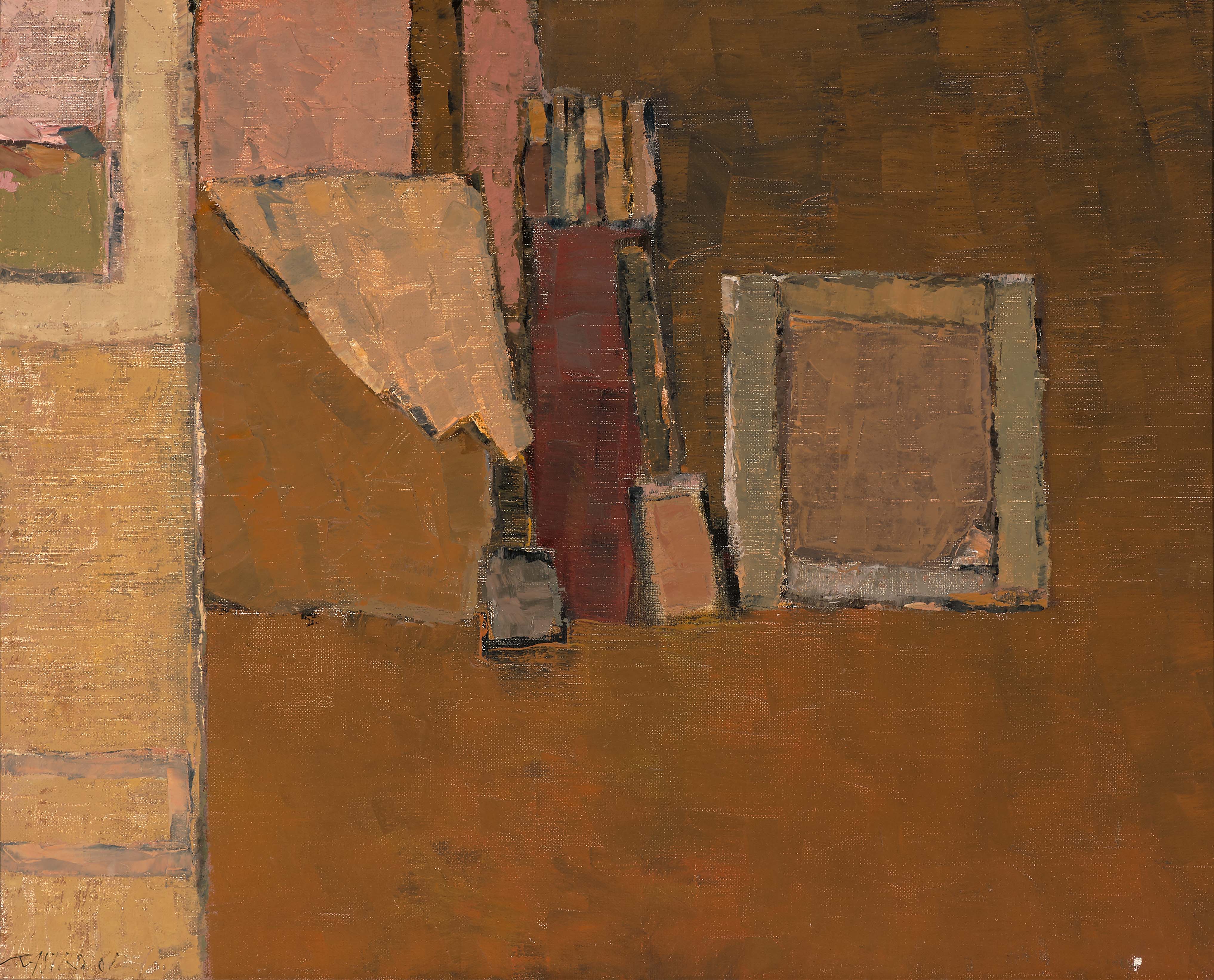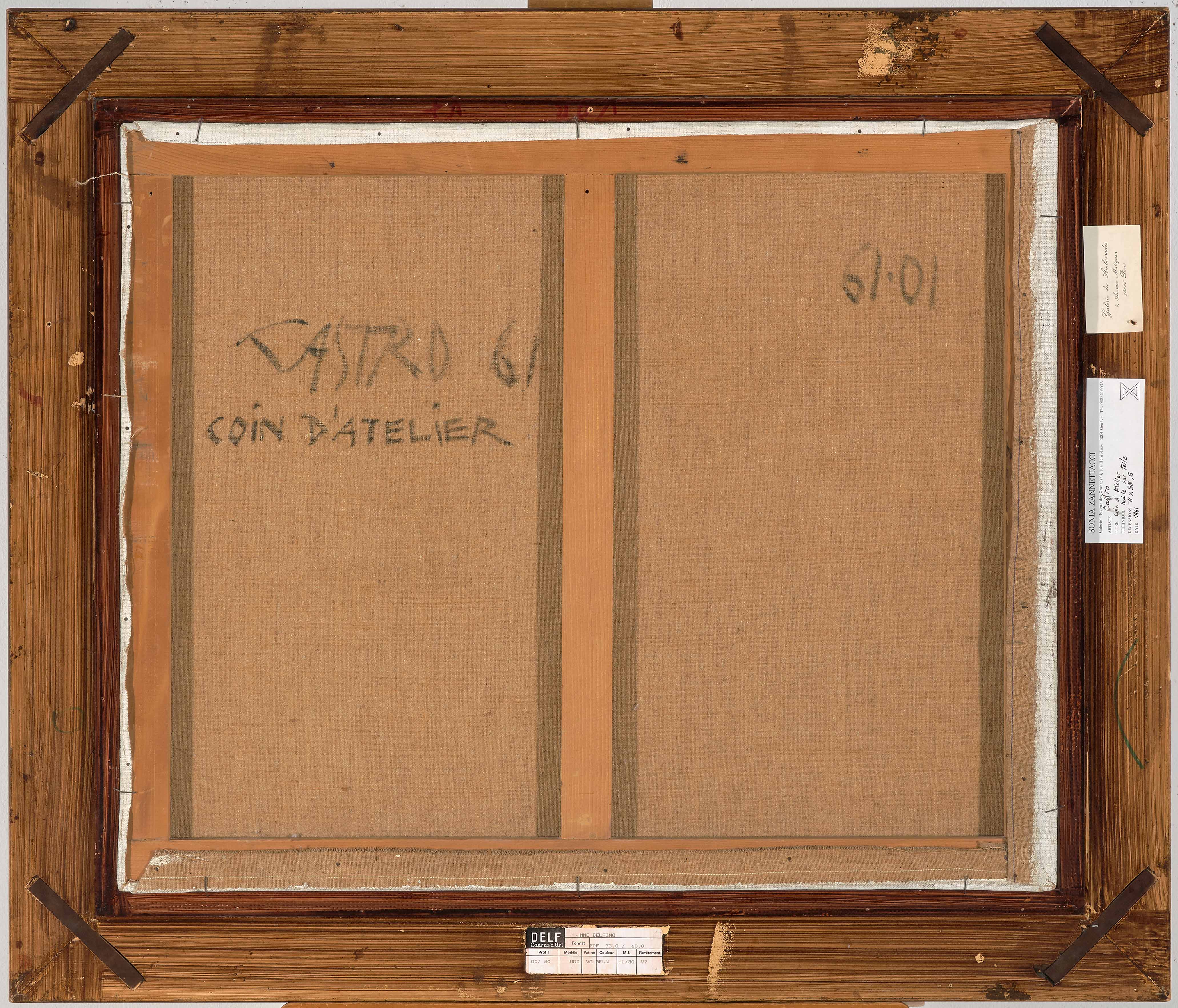 Coin d'Atelier. 1961. Öl auf Leinwand. Unten links signiert und datiert. Verso signiert, datiert, betitelt sowie nummeriert 61.01. Auf dem Keilrahmen Etikett der Galerie des Ambassades, Paris, und der Galerie Sonia Zannettacci, Genf. 60x73 cm.