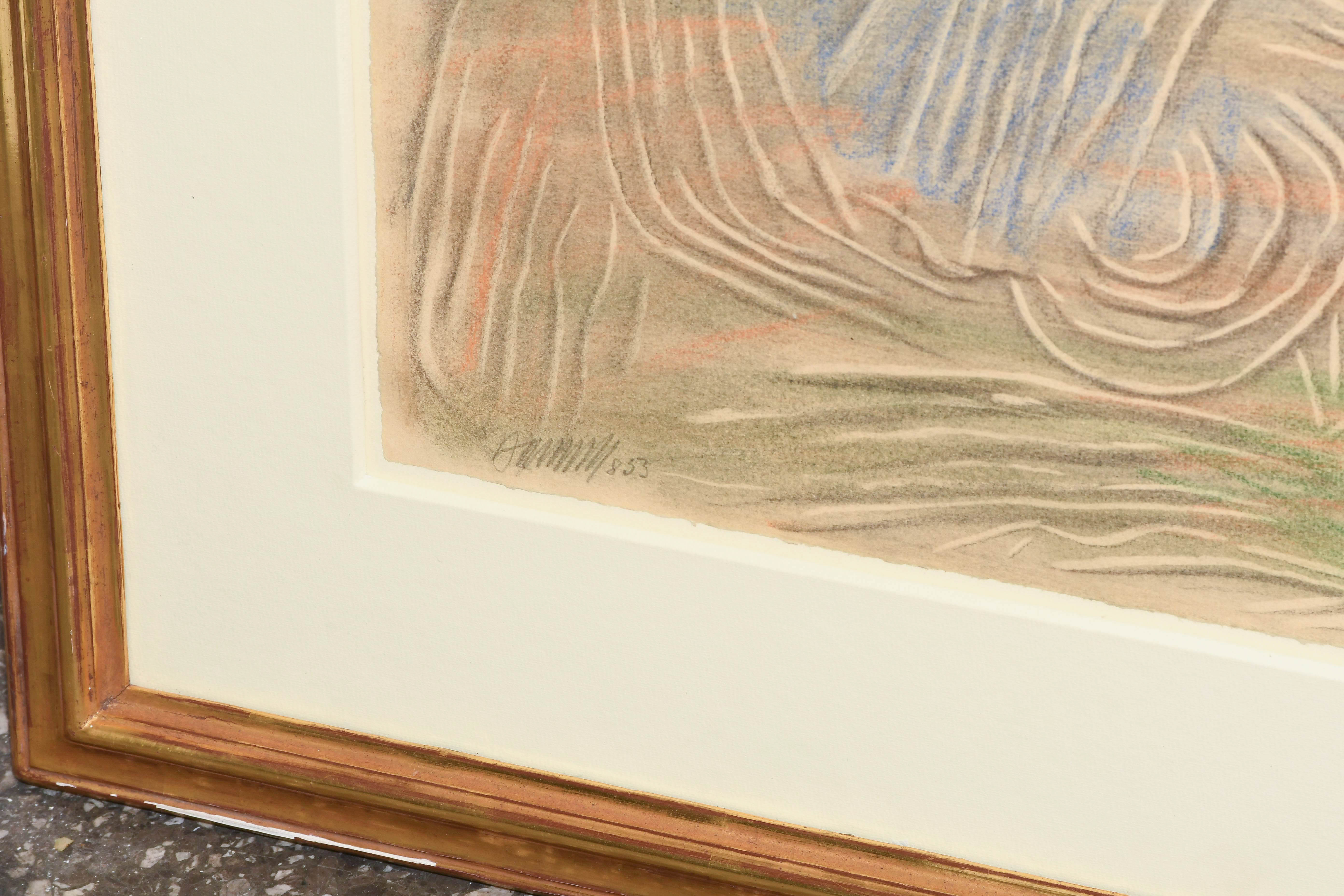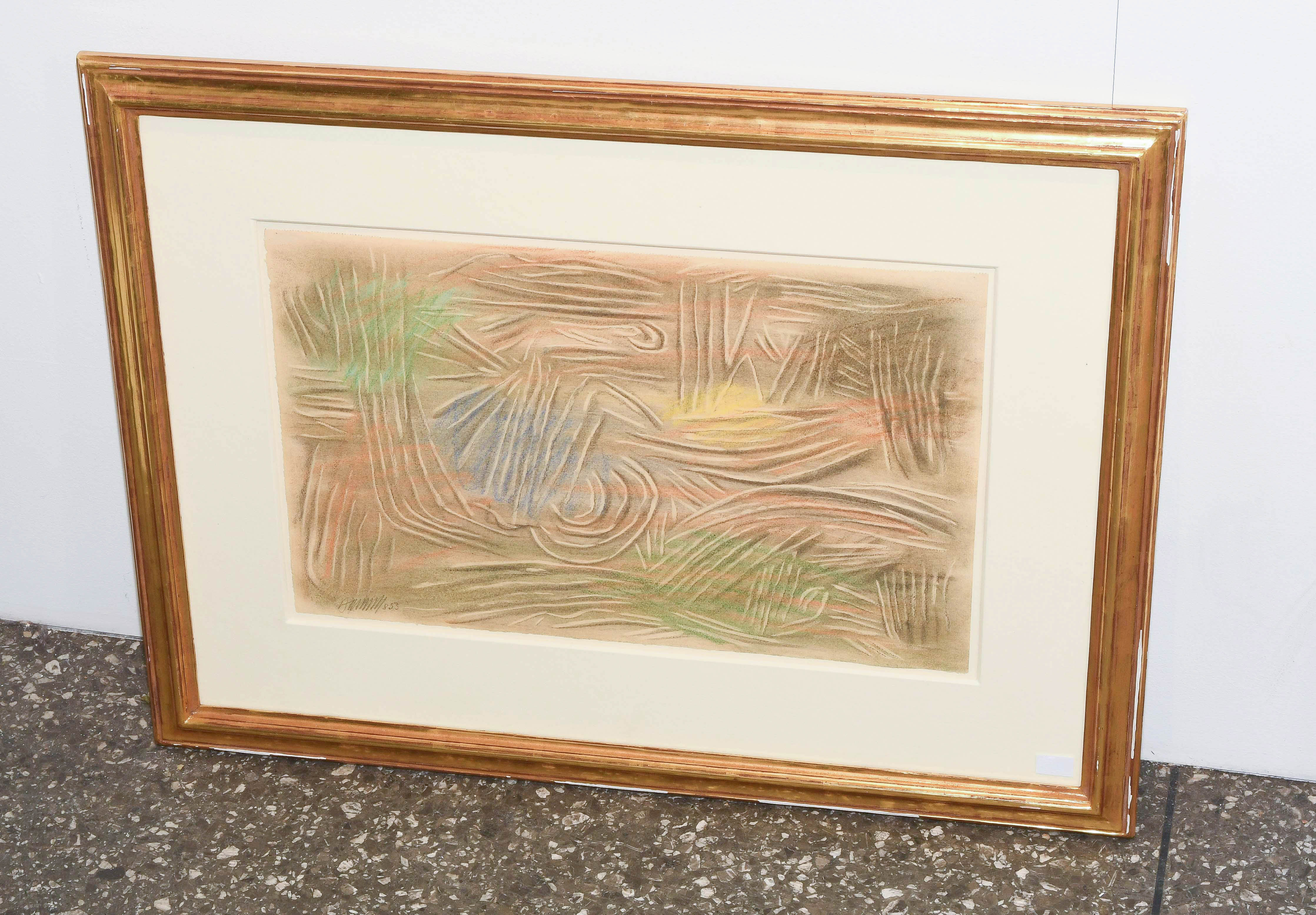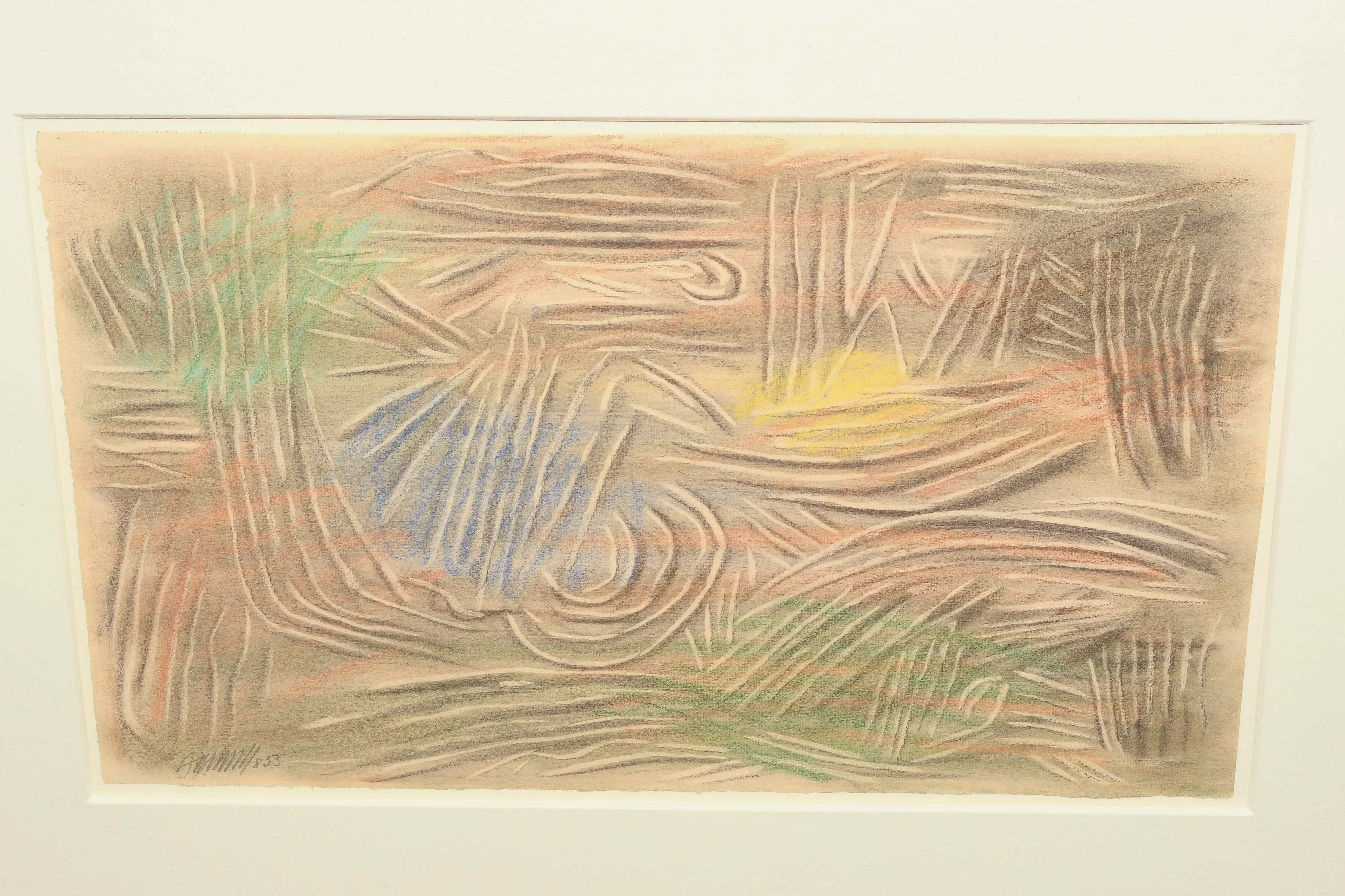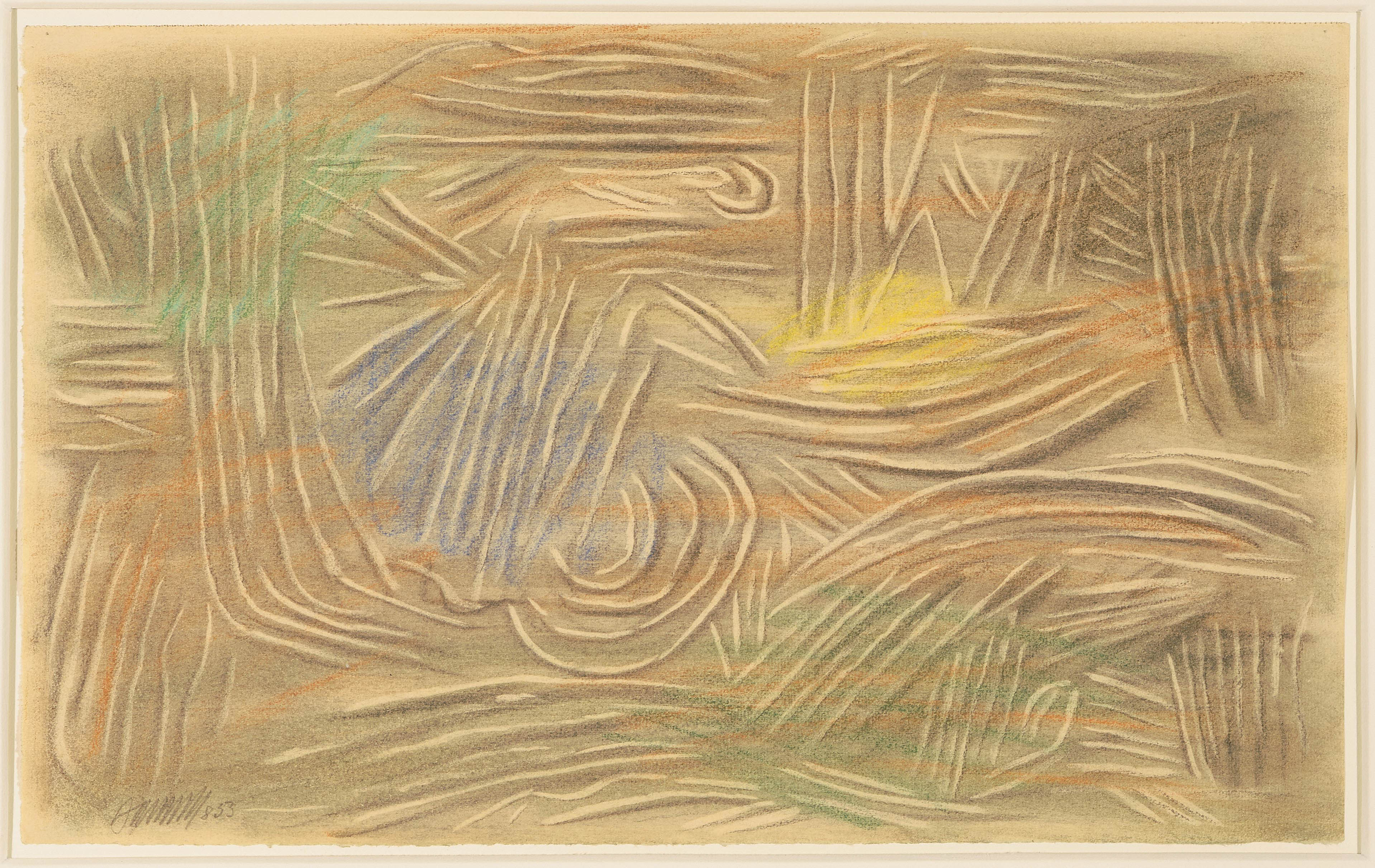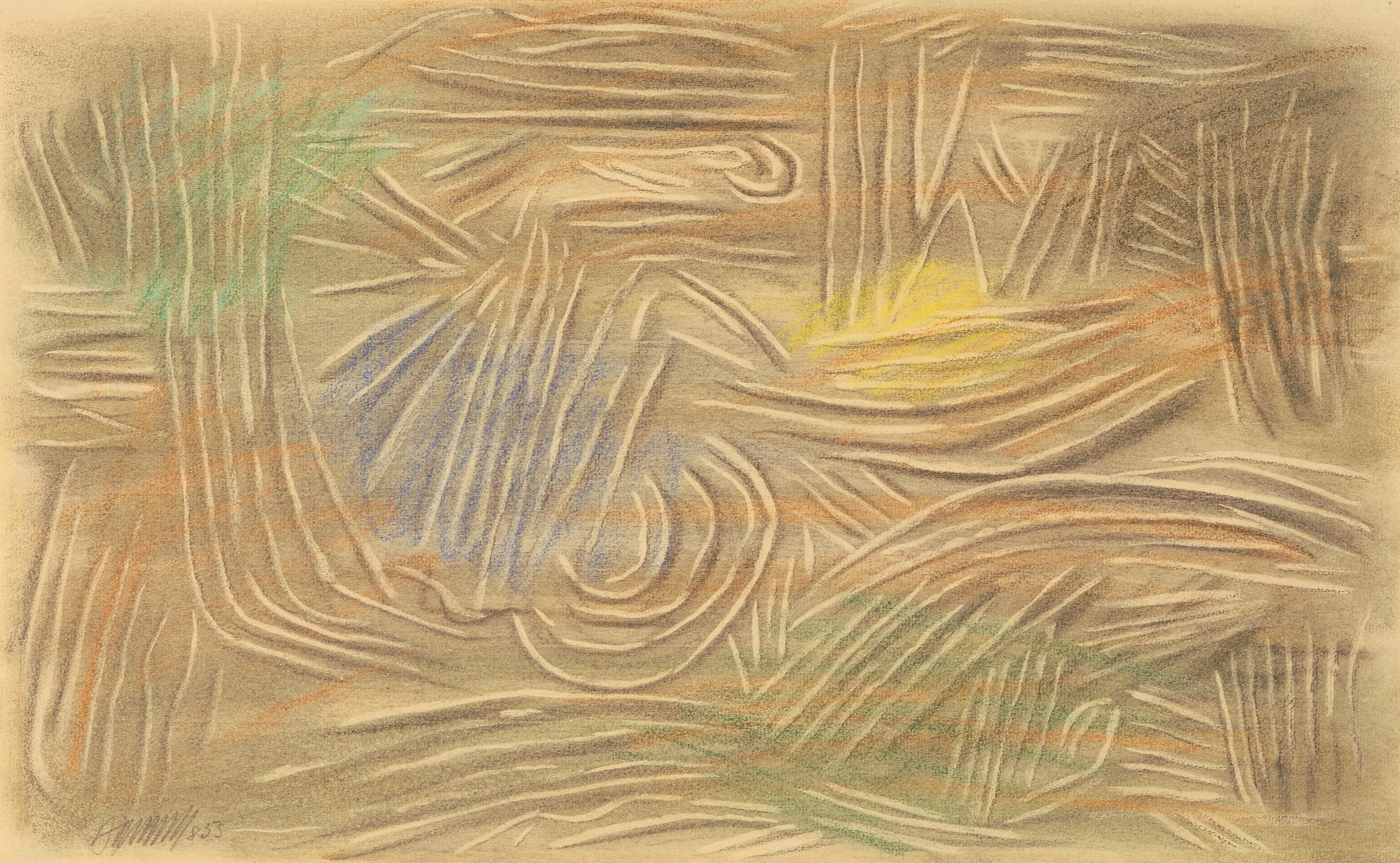 "Linien hell und dunkel mit Farben". 1953. Blei- und Buntstift auf Papier. Unten links in Bleistift signiert und datiert: "8 53". Blattgrösse 29,7x47,9 cm. Gerahmt. -Am oberen Rand Abrissspuren eines Skizzenblocks. Verso partiell an Rückkarton montiert.