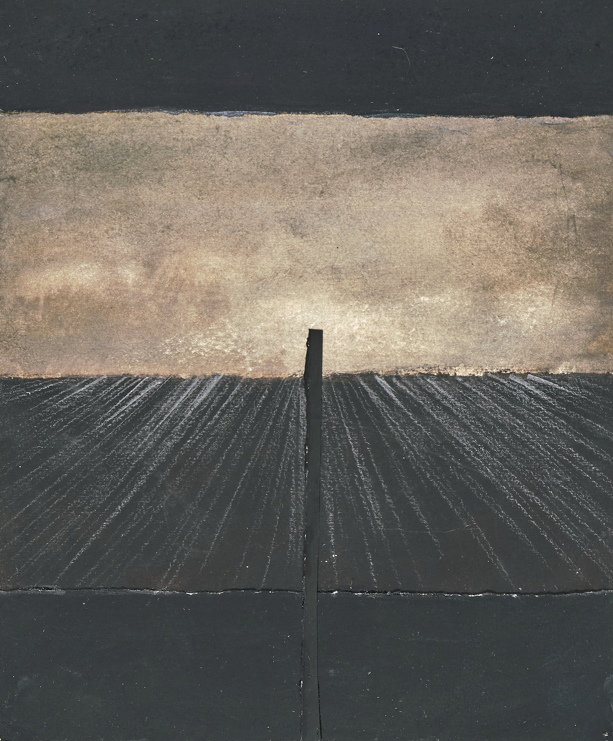 Ohne Titel. Aquarell und Collage auf Papier. Blattgrösse 22,8x19 cm. Gerahmt. -Blatt mit winzigen Einstichlöchern in allen Ecken. Ränder und Ecken minimst bestossen. Verso partiell an Rückkarton montiert.