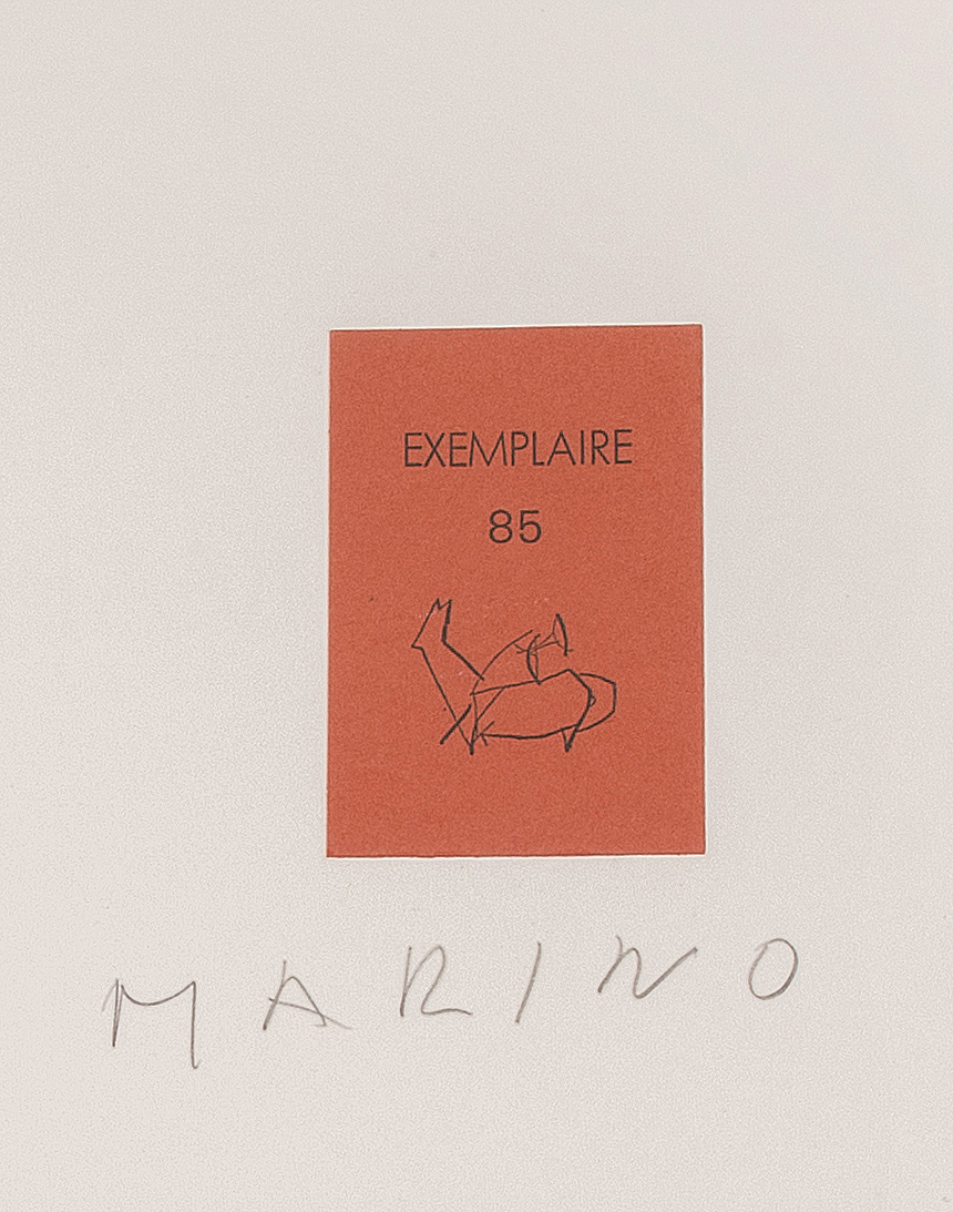 Tout près de Marino. Text Egle Marini. Paris, Société internationale d’Art XXe Siècle 1971. Imperial-Folio. Illustriert mit 10 ganzseitigen Radierungen (8 davon farbig) von Marino Marini. Eins von 20 Expl. H.C. auf Arches (GA 121). Von Marino Marini handsigniert. Lose Lagen in Original-Umschlag und Original-Kassette. Schöne Erhaltung.