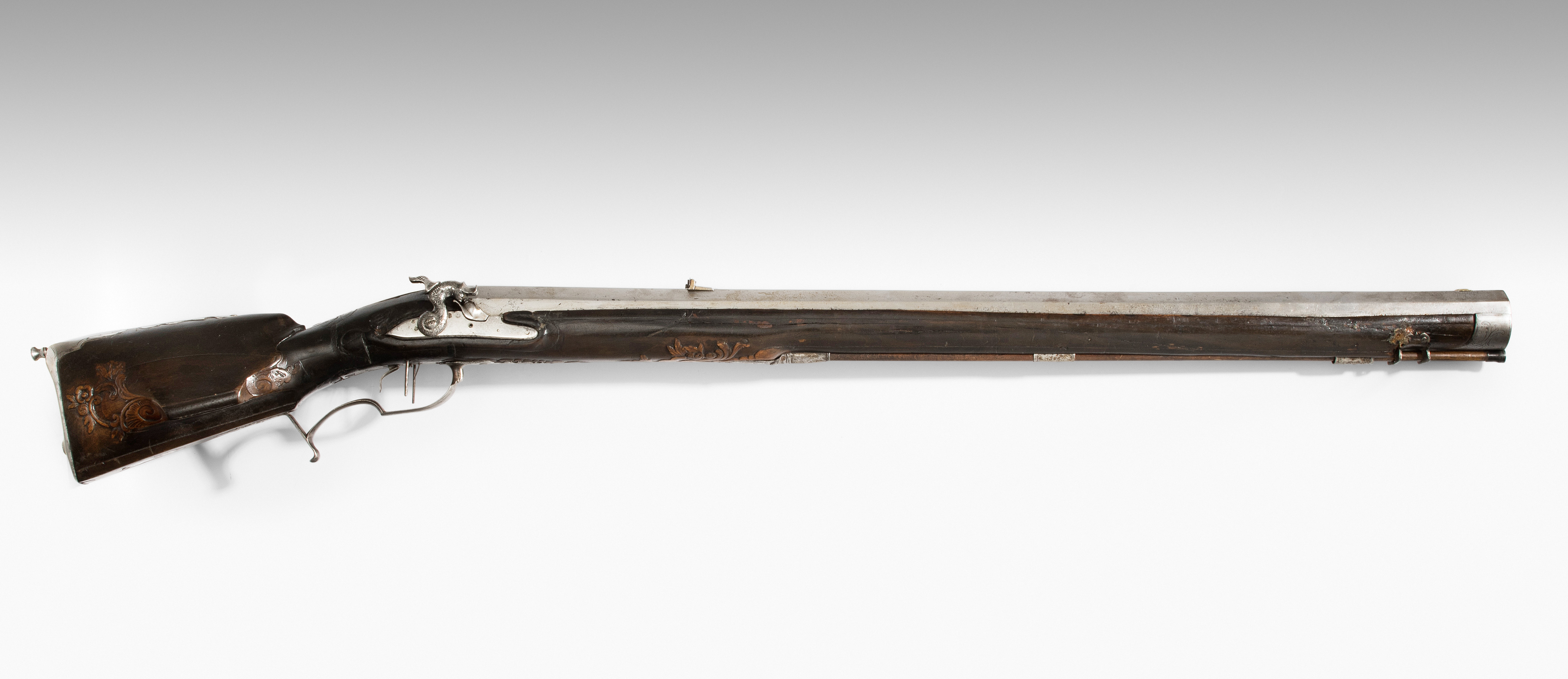 Frankreich, datiert 1774. Schwerer Oktogonallauf (L 96,5 cm), Kal. 20 mm, gezogen, auf der Oberkante signiert SCHAFFMANN A COLMAR 1774. Visier und schiebbarer Messingkorn. Schlossplatte flach, Schloss später umgeändert auf Perkussion, Delphinhahn, massiger Nussbaumschaft, diverse Reparaturen, Kolben beidseitig mit Backen, geschnitzter Dekor. Eisengarnituren fein ziseliert, Akanthusdekor. Geschwungener Abzugbügel, Abzug mit Stecher. Holzladestock mit Eisendopper. L 133 cm.