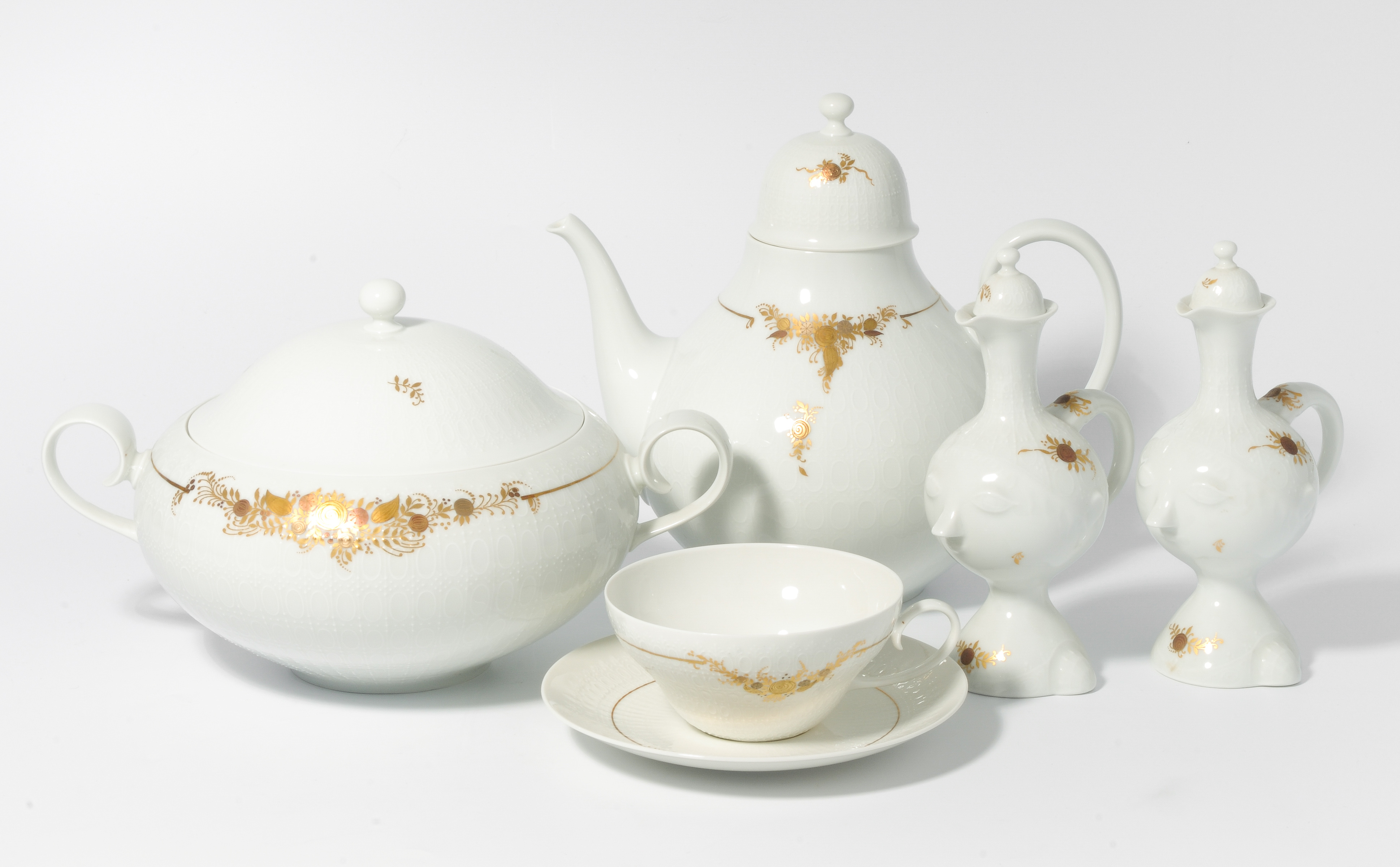 Tafelservice "Romanze". Seit 1961. Entwurf: Björn Wiinblad. Porzellan, Reliefdekor, Dekor in Gold. Bezeichnet: Firmenmarke, 3621. Bestand: 1 Kaffeekanne, 1 Teekanne, 1 Milch/Wasserkrug, 1 Cremier, 2 Zuckerdosen, 8 Kaffeetassen mit U'tassen, 8 Teetassen mit U'tassen, 4 Eierbecher, 8 Fleischteller (D 25 cm), 8 Suppentassen mit U'tassen, 8 Dessertteller (D 21 cm), 8 Kuchenteller (D 19 cm), 4 ovale Platten, 3 Schüsseln, 1 Deckelterrine, 1 Saucière, Öl- und Essigkännchen. Bestand: Ca. 69 Teile.