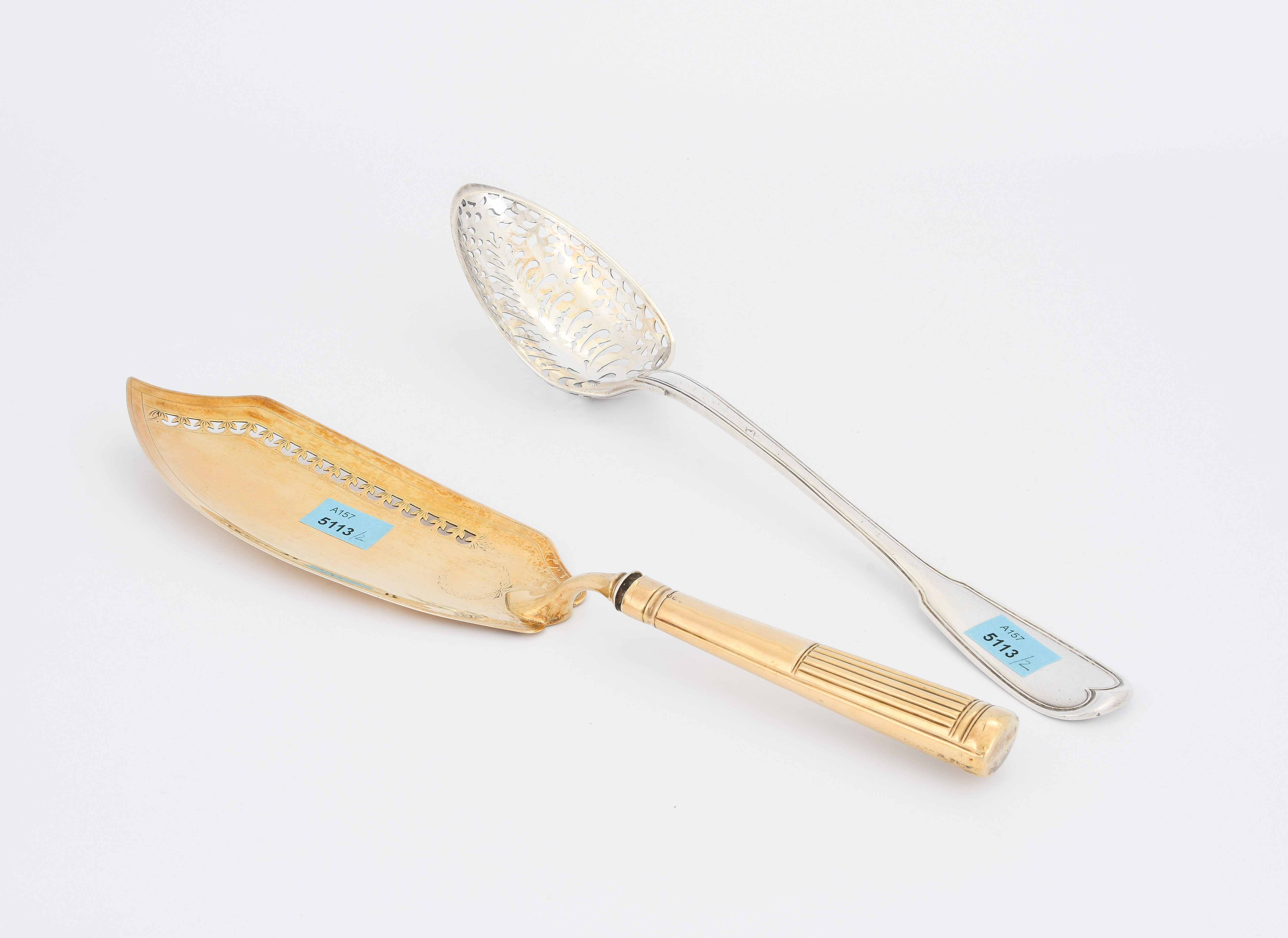 Fischheber: London, 1818, Silber, vergoldet. Meistermarke John Emes. Sieblöffel: Paris, 1798–1809. Silber. Meistermarke Dehanne. L 32/31 cm, zus. ca. 270 g.
