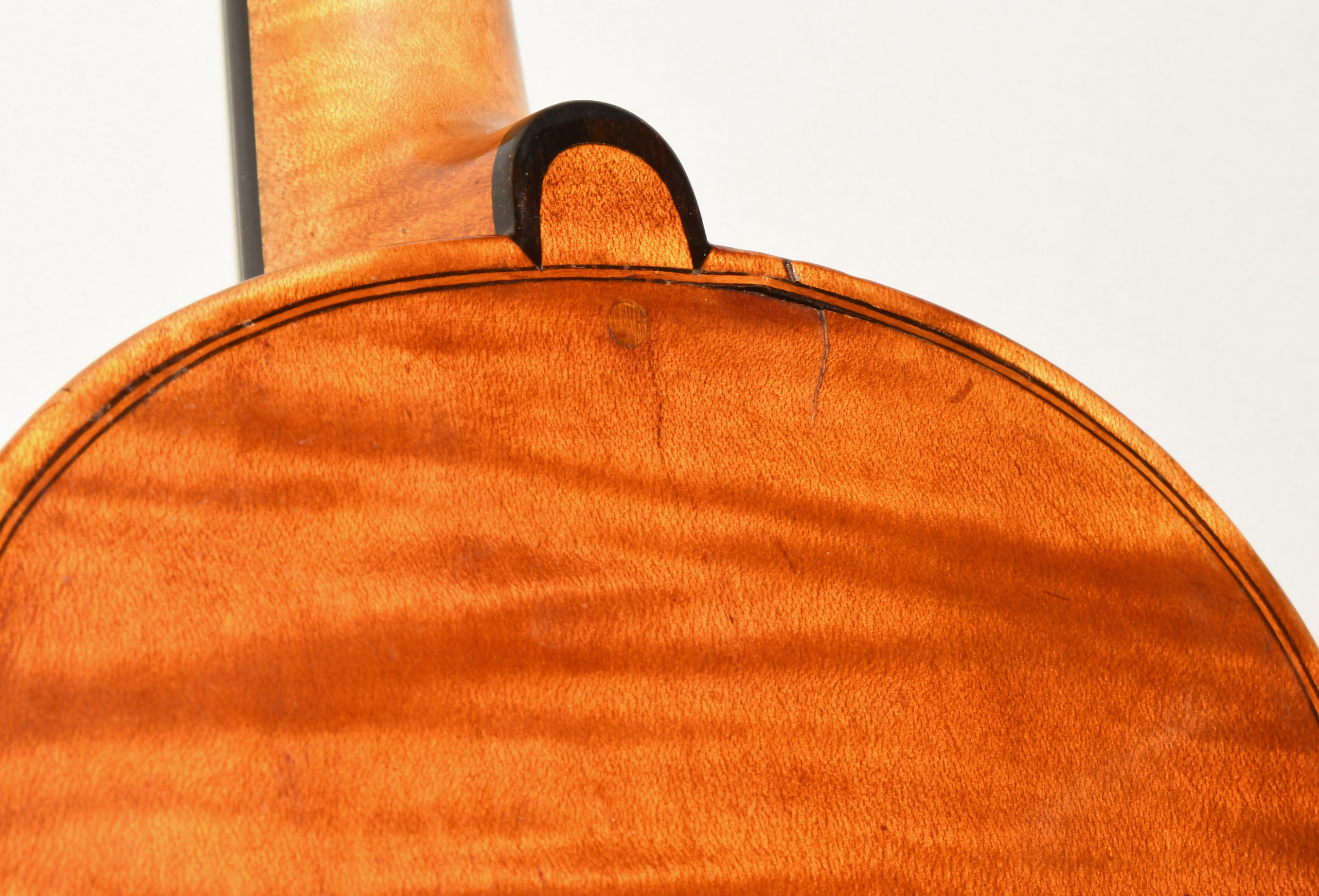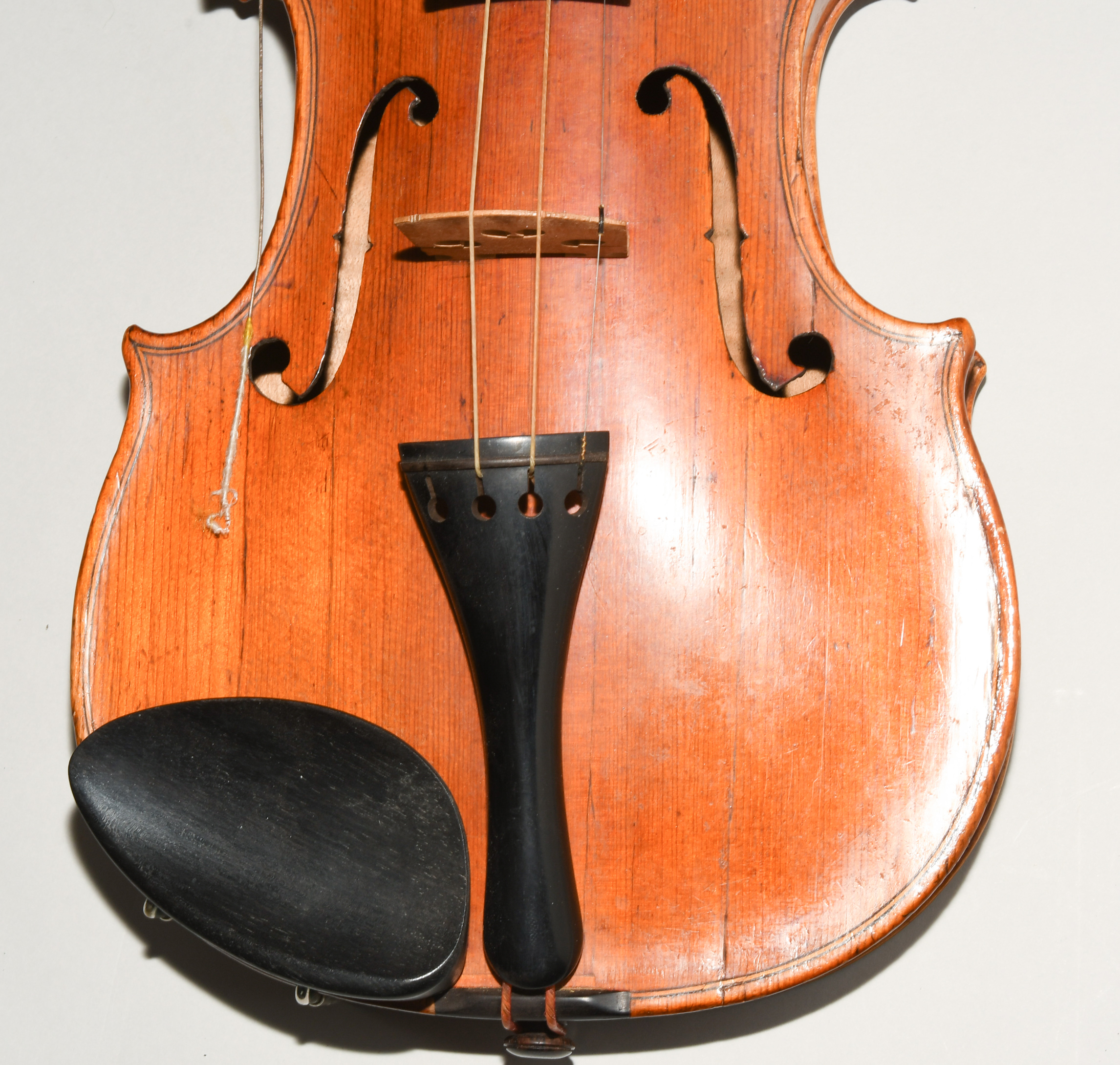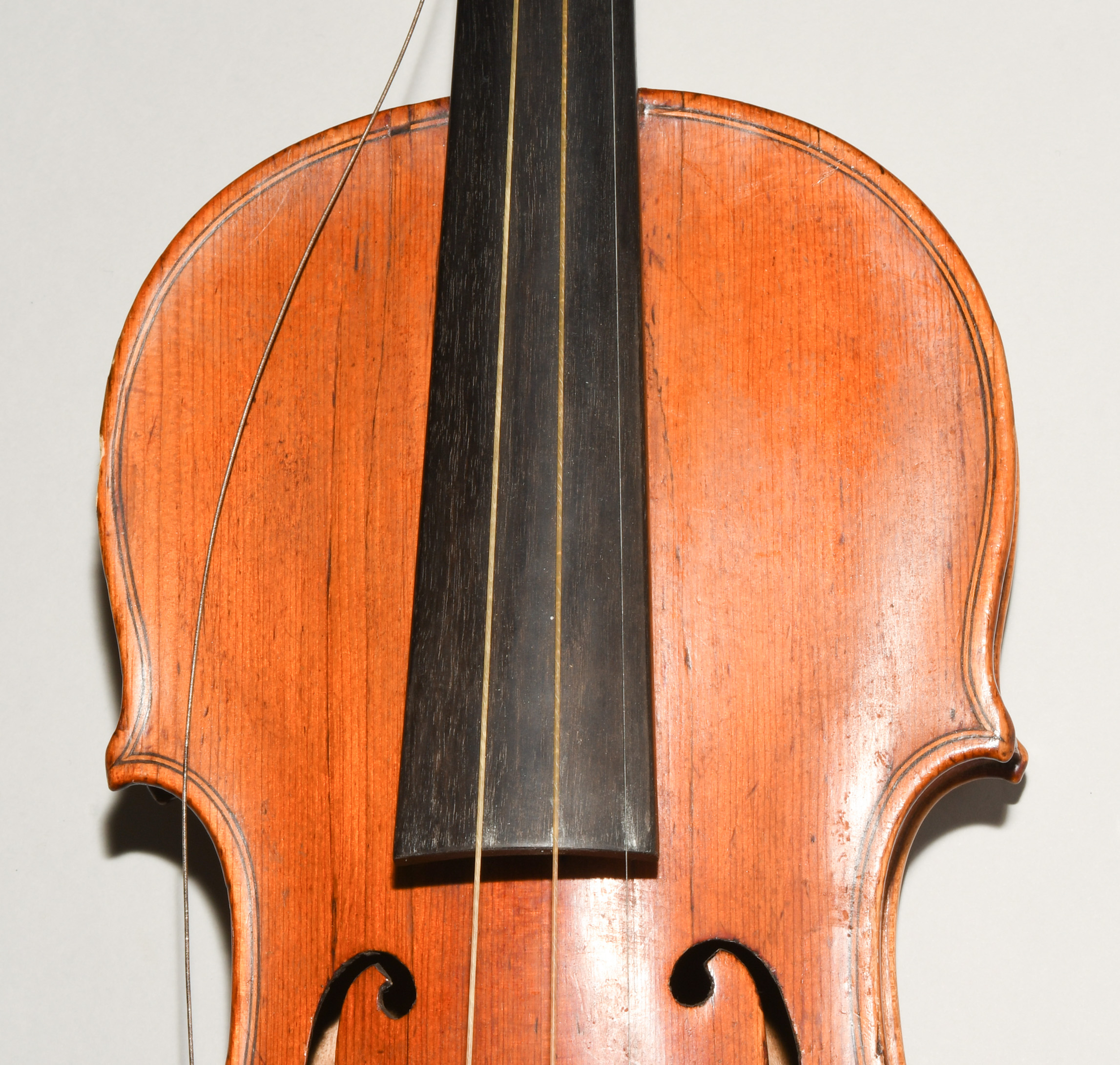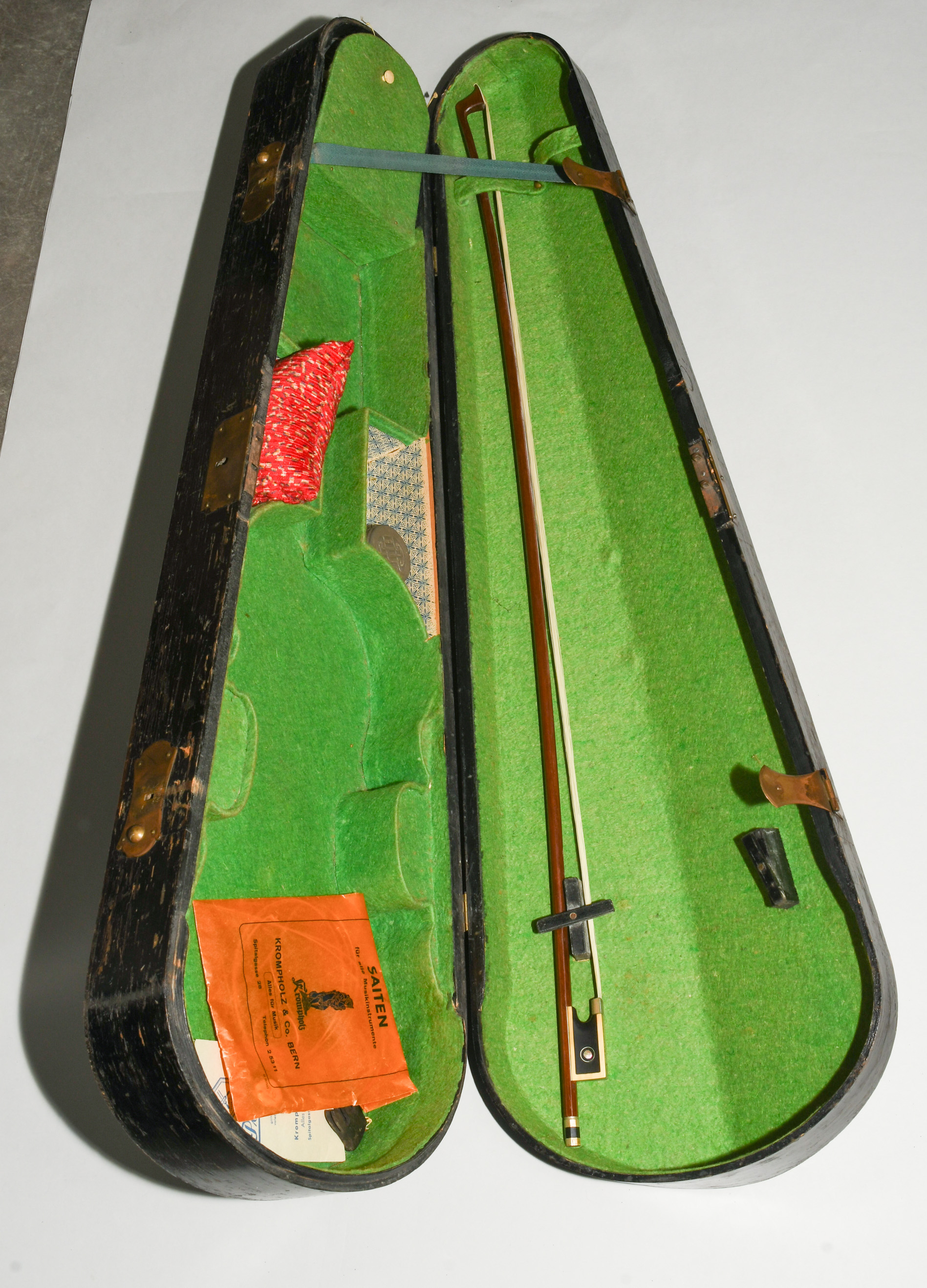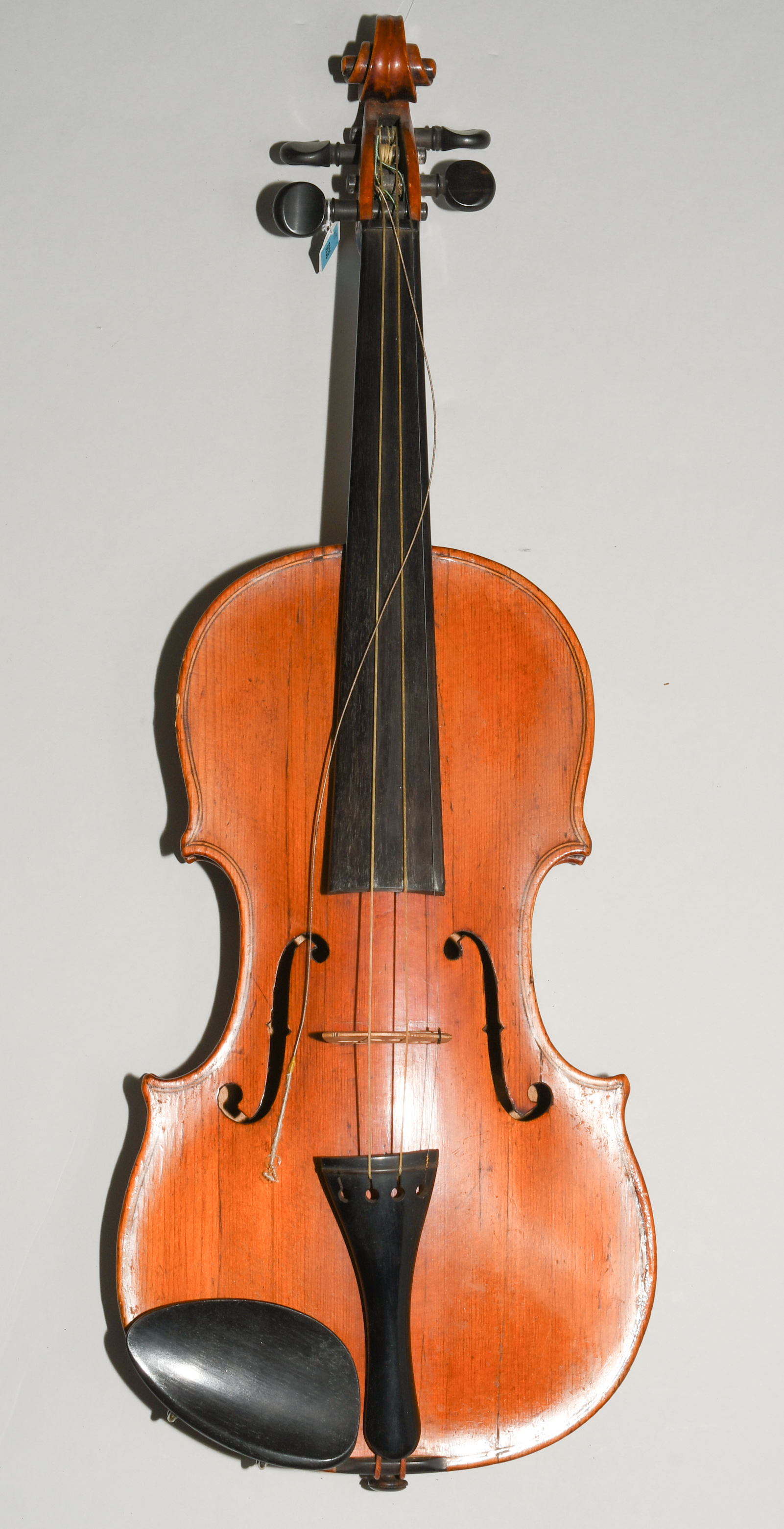 Deutsch, Mitte 19.Jh. Auf Etikett bezeichnet: "Mathias Neuner, Geigenmacher in Mittenwald, 1843, Nro.138". L 60 cm. Dazu Bogen (73 cm), Geigenkasten (77,5 cm) und Zubehör.