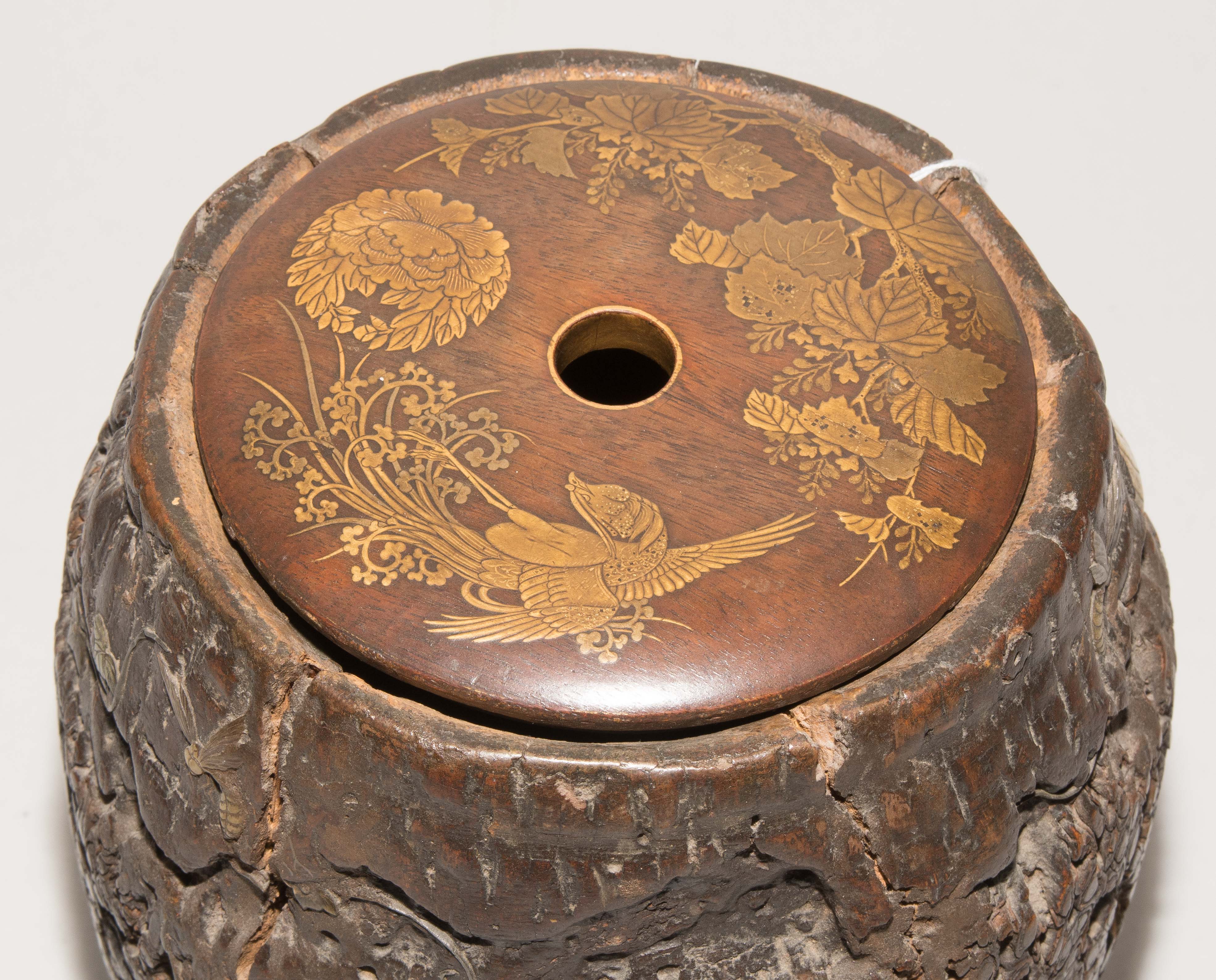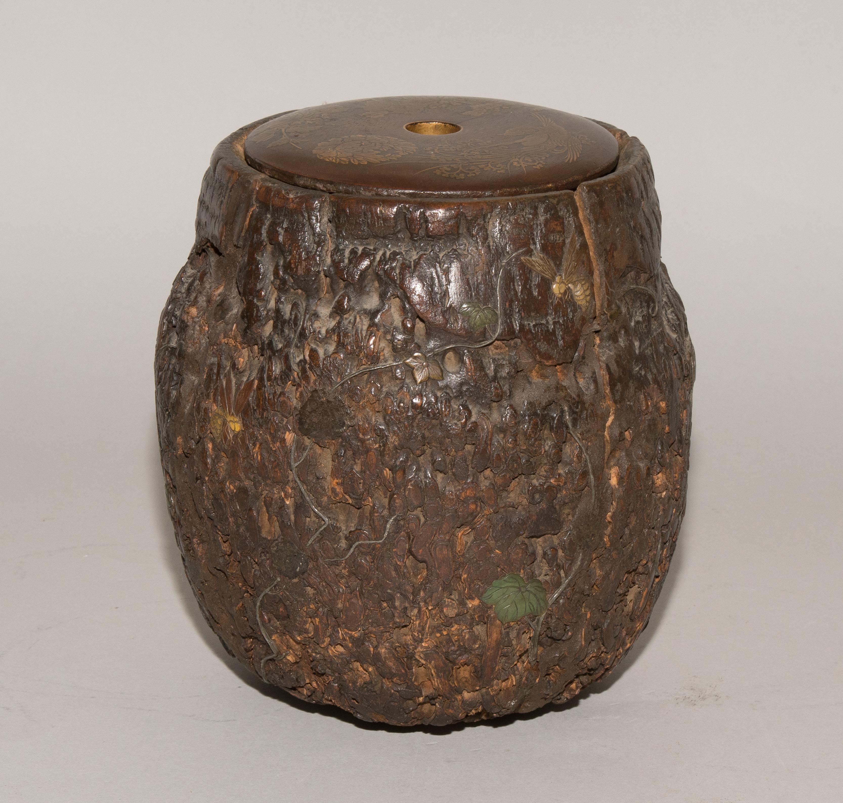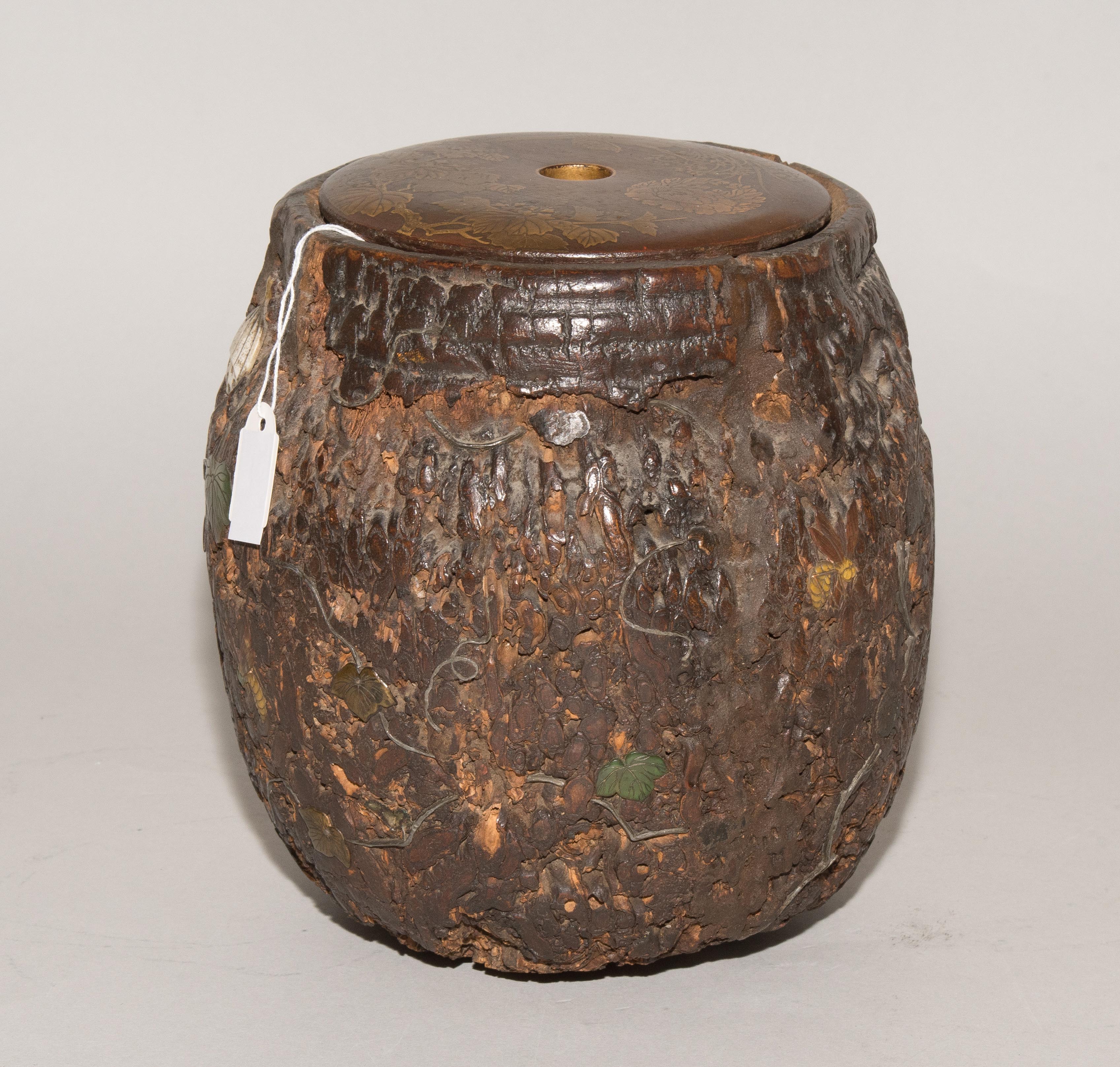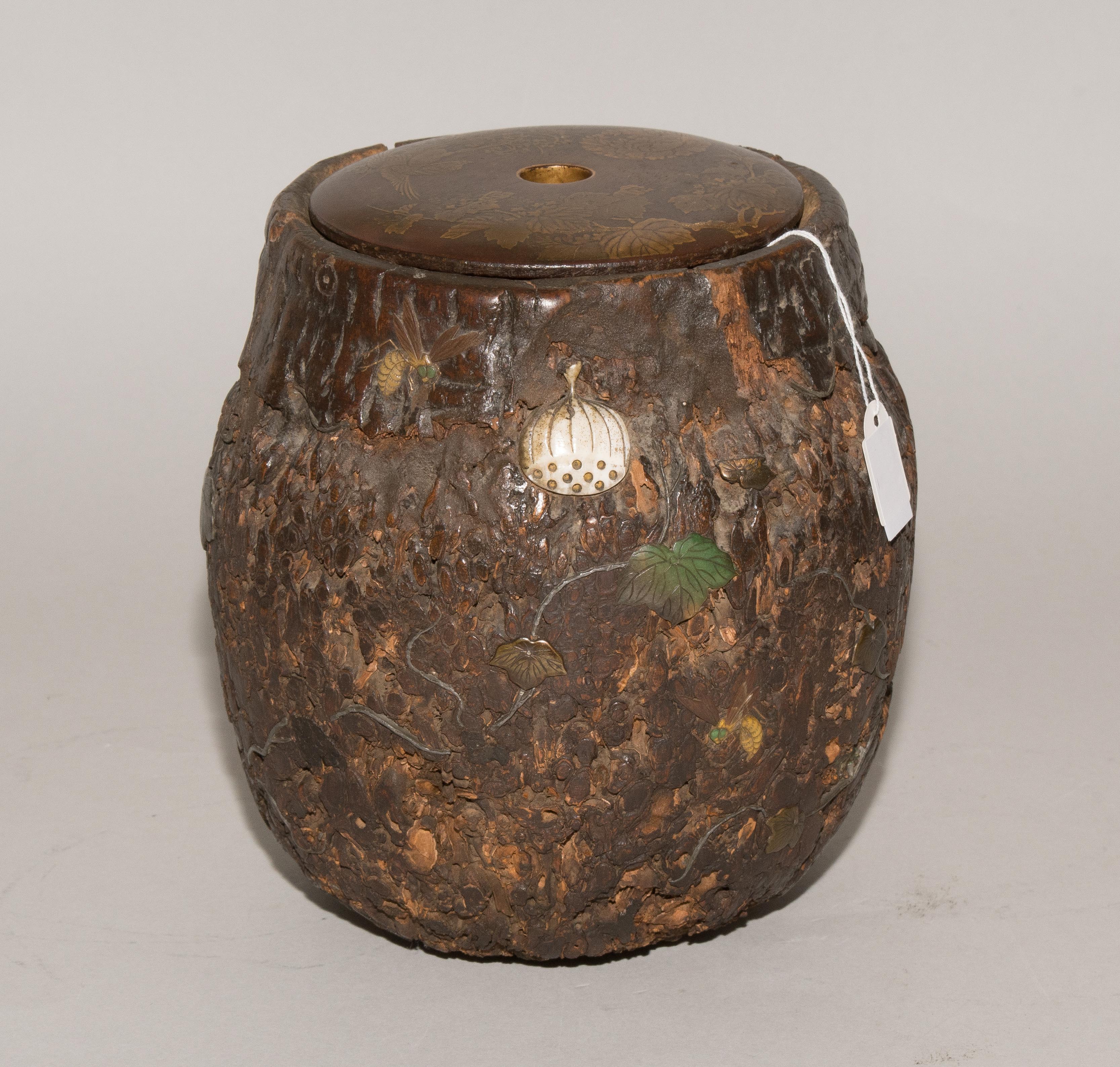 Japan, Anfang 20.Jh. Naturbelassenes Holz, appliziert mit Insekten und Blattwerk aus Metall und Stein. Deckel aus Holz verziert in Hiramaki-e. H 18 cm. - Repariert, Risse, Fehlstellen.