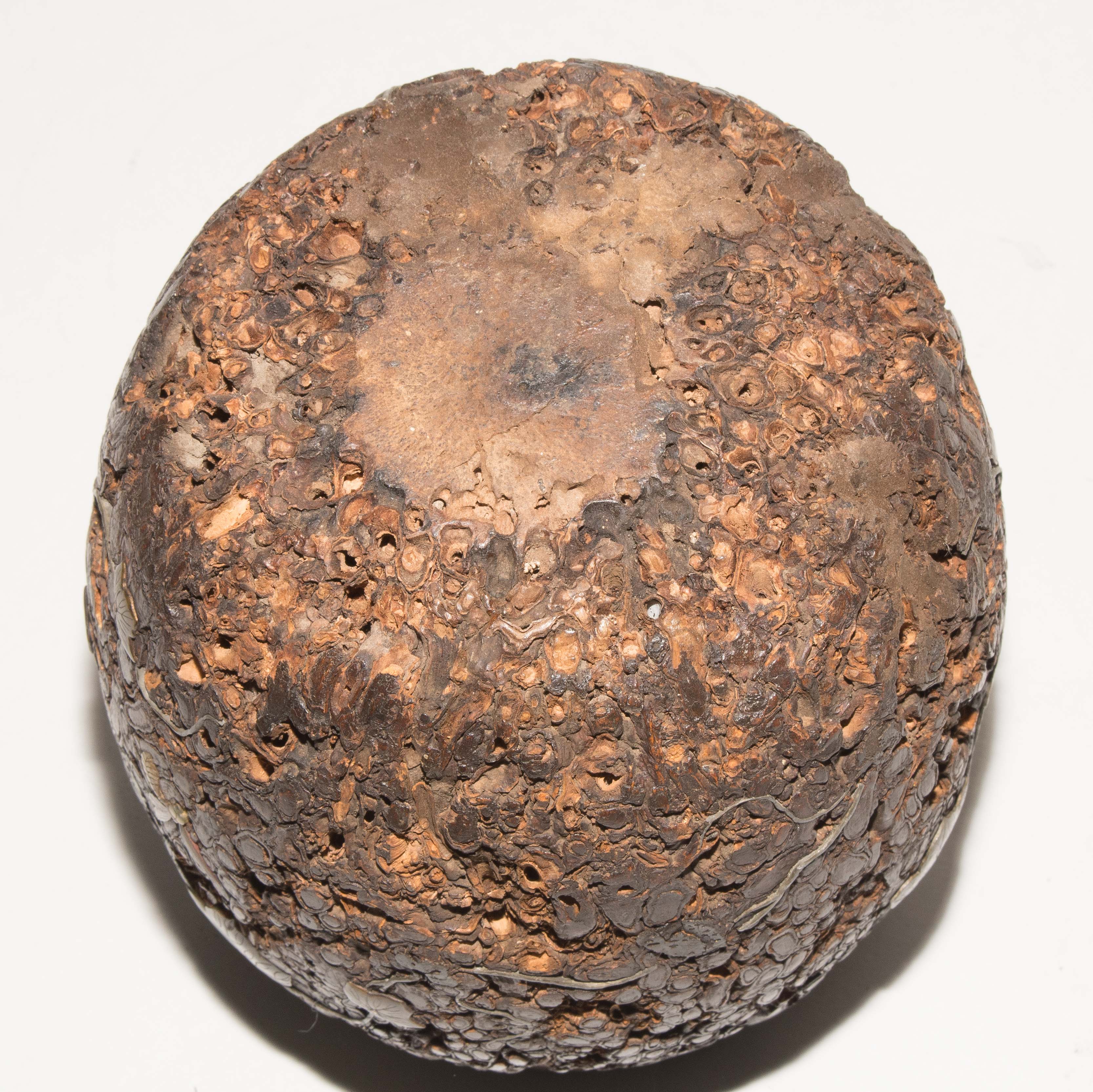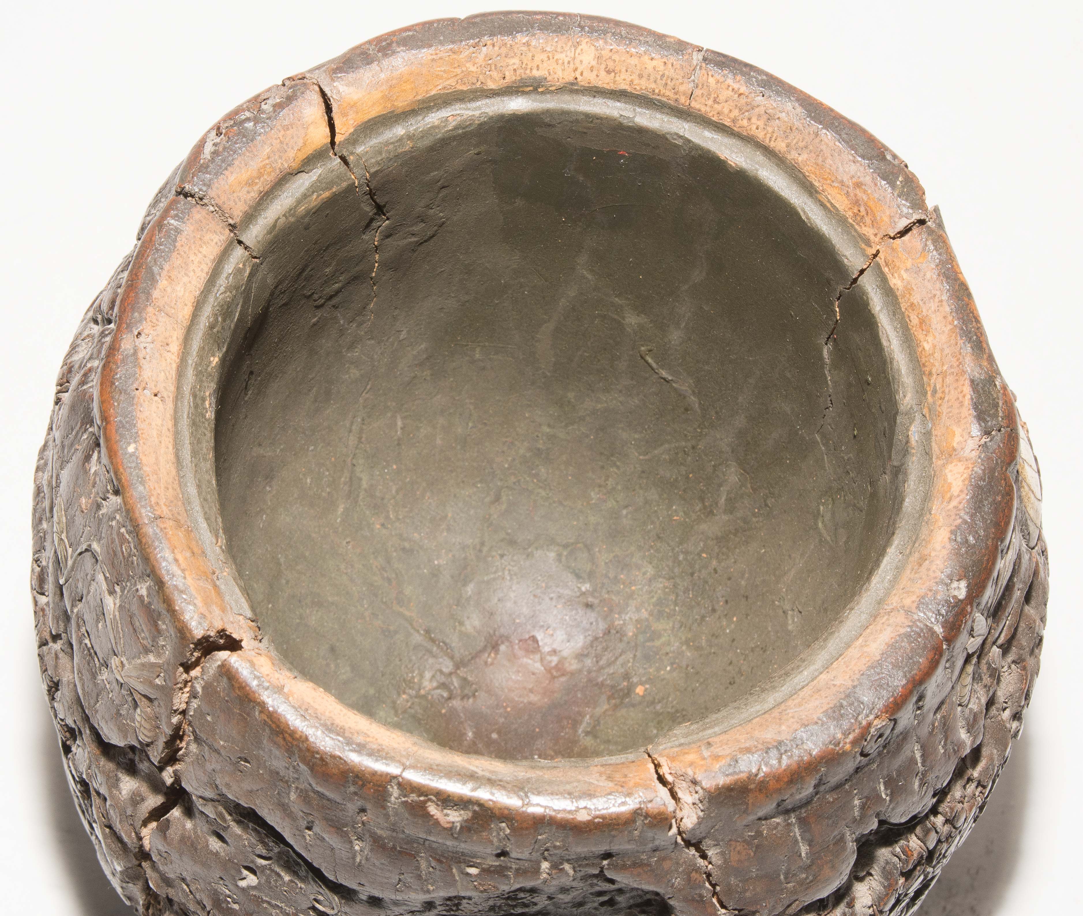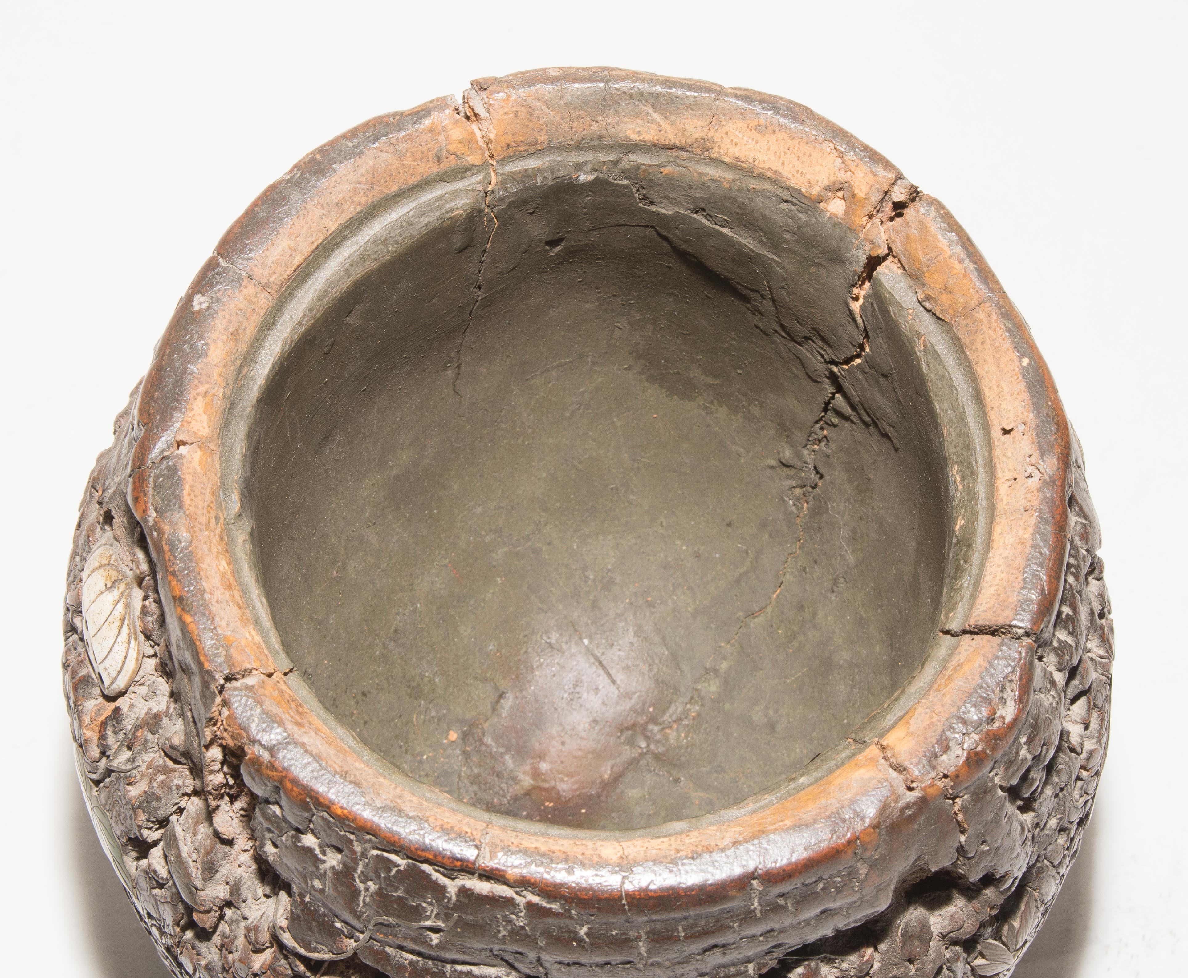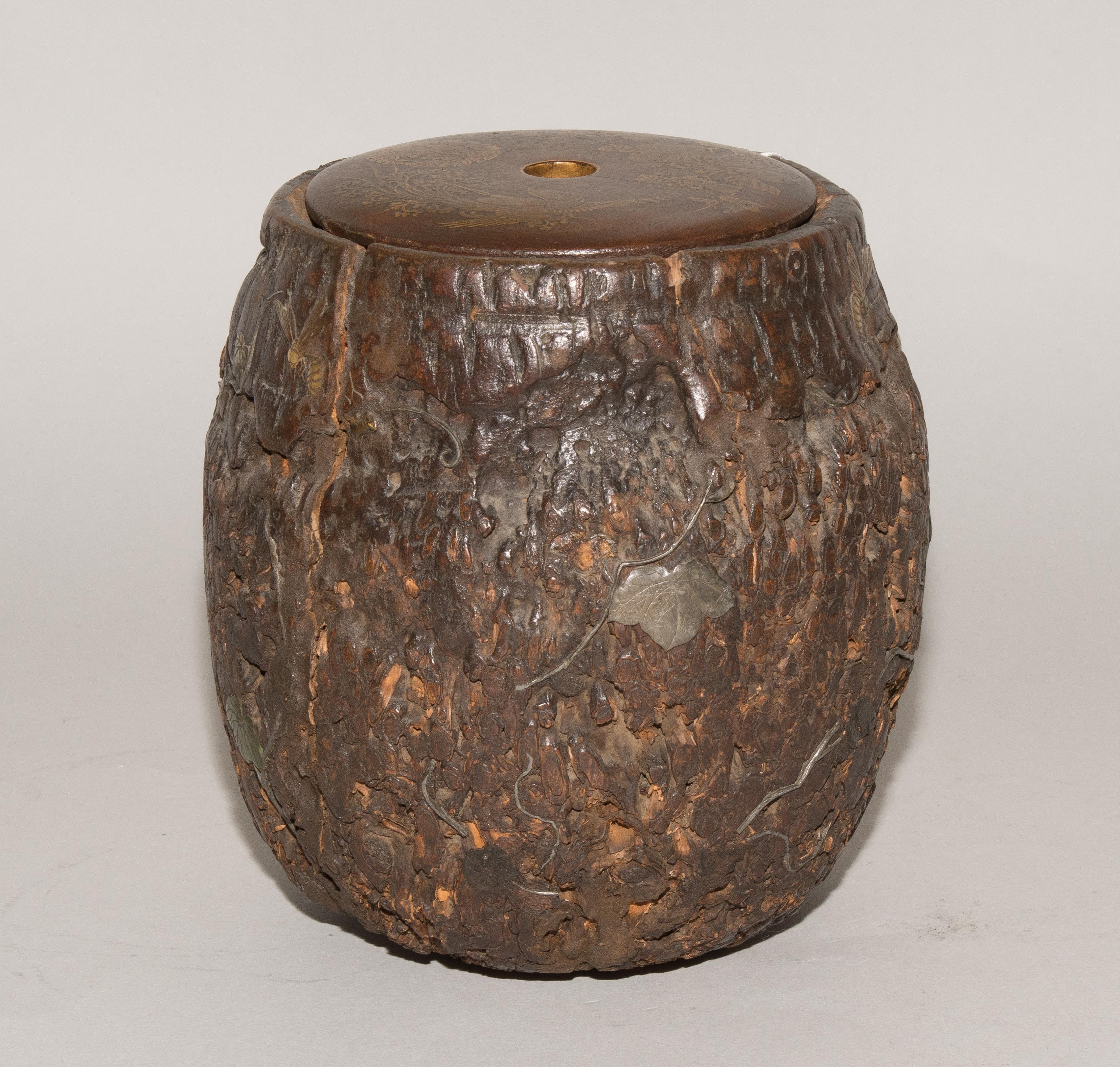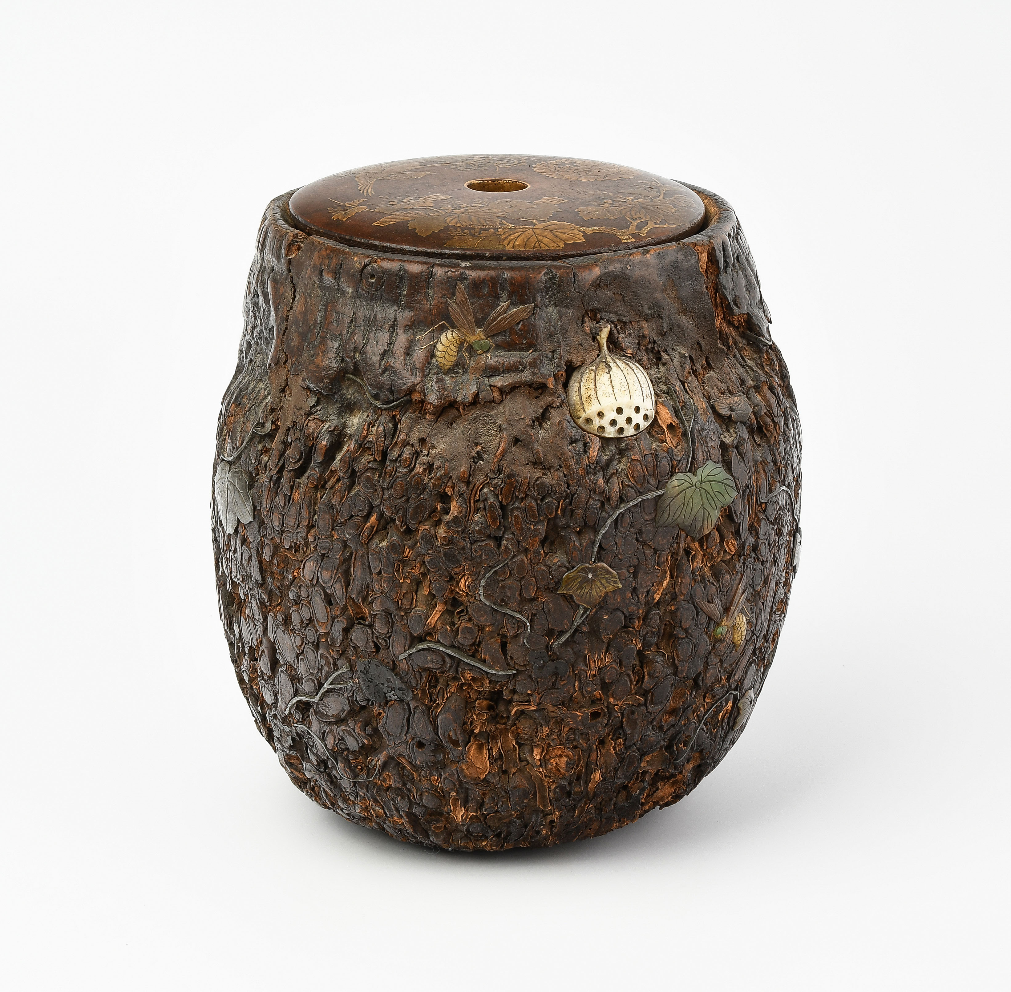 Japan, Anfang 20.Jh. Naturbelassenes Holz, appliziert mit Insekten und Blattwerk aus Metall und Stein. Deckel aus Holz verziert in Hiramaki-e. H 18 cm. - Repariert, Risse, Fehlstellen.