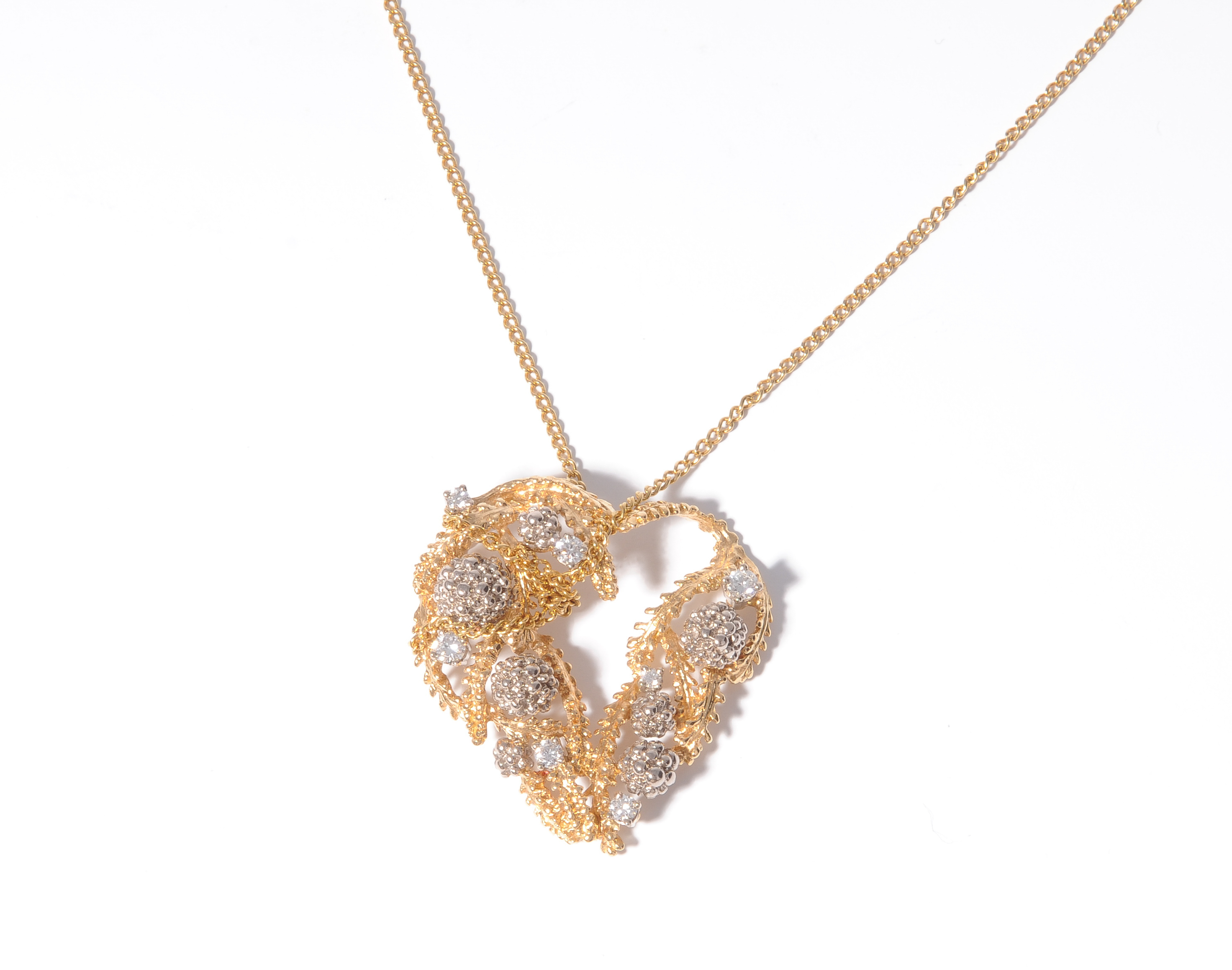 Gilbert Albert. 750 Gelb-/Weissgold. Herzförmig, durchbrochen-strukturiert 3x2,8 cm. 7 Brillanten ca. 0.5 ct. L 53 cm, 11,2 g.