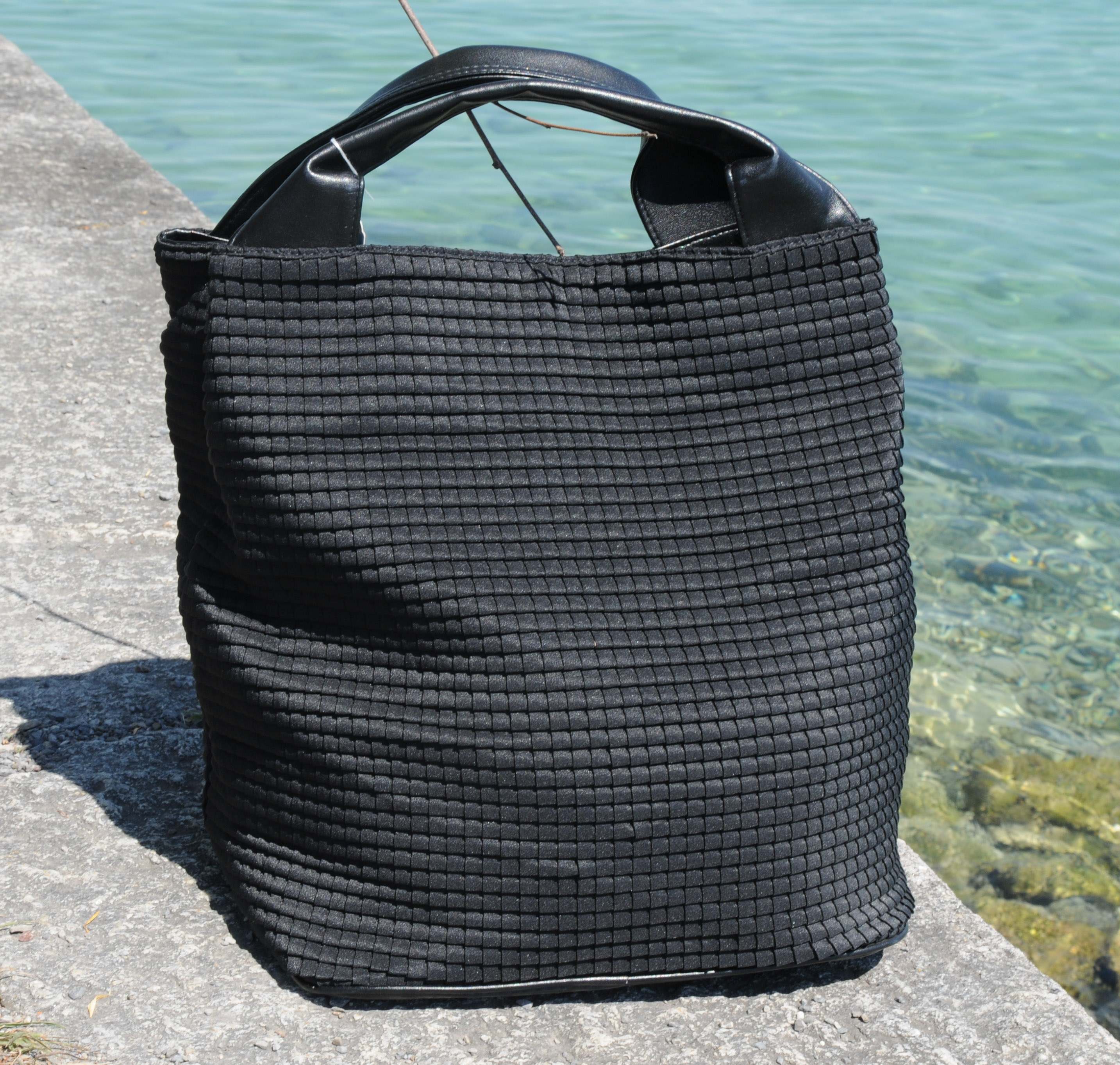 Aus schwarzem Stoff mit Volants. Doppelhenkel aus Leder. 30x36x26 cm. Gebrauchsspuren, sonst guter Zustand.