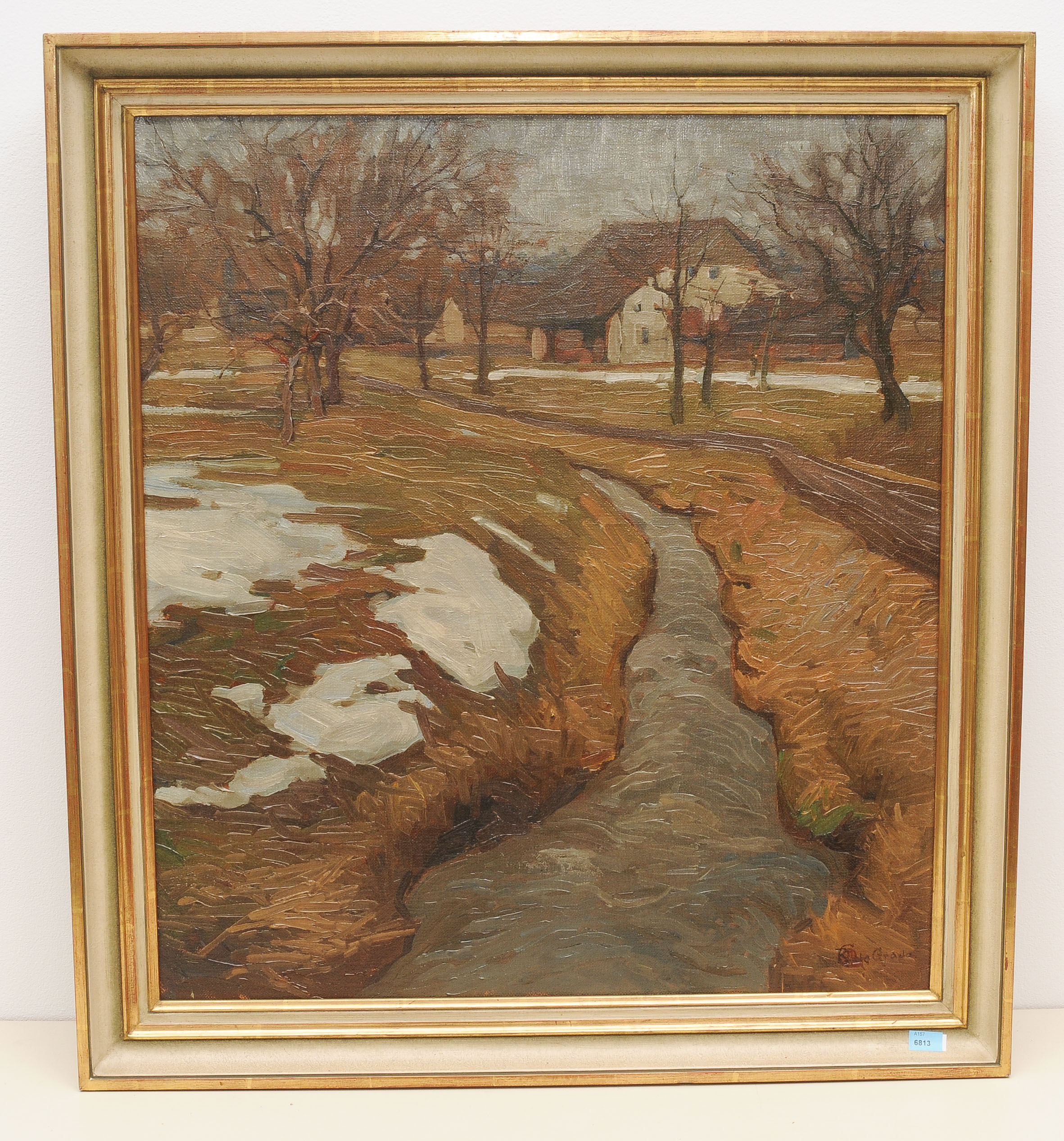 Vorfrühling. Öl auf Leinwand. Unten rechts monogrammiert und signiert, verso Etikett der ständigen Ausstellung Kunsthaus Zürich, sowie Etikett der Zürcher Kunstgesellschaft, Nr. 1232. 65,5x58,6 cm.