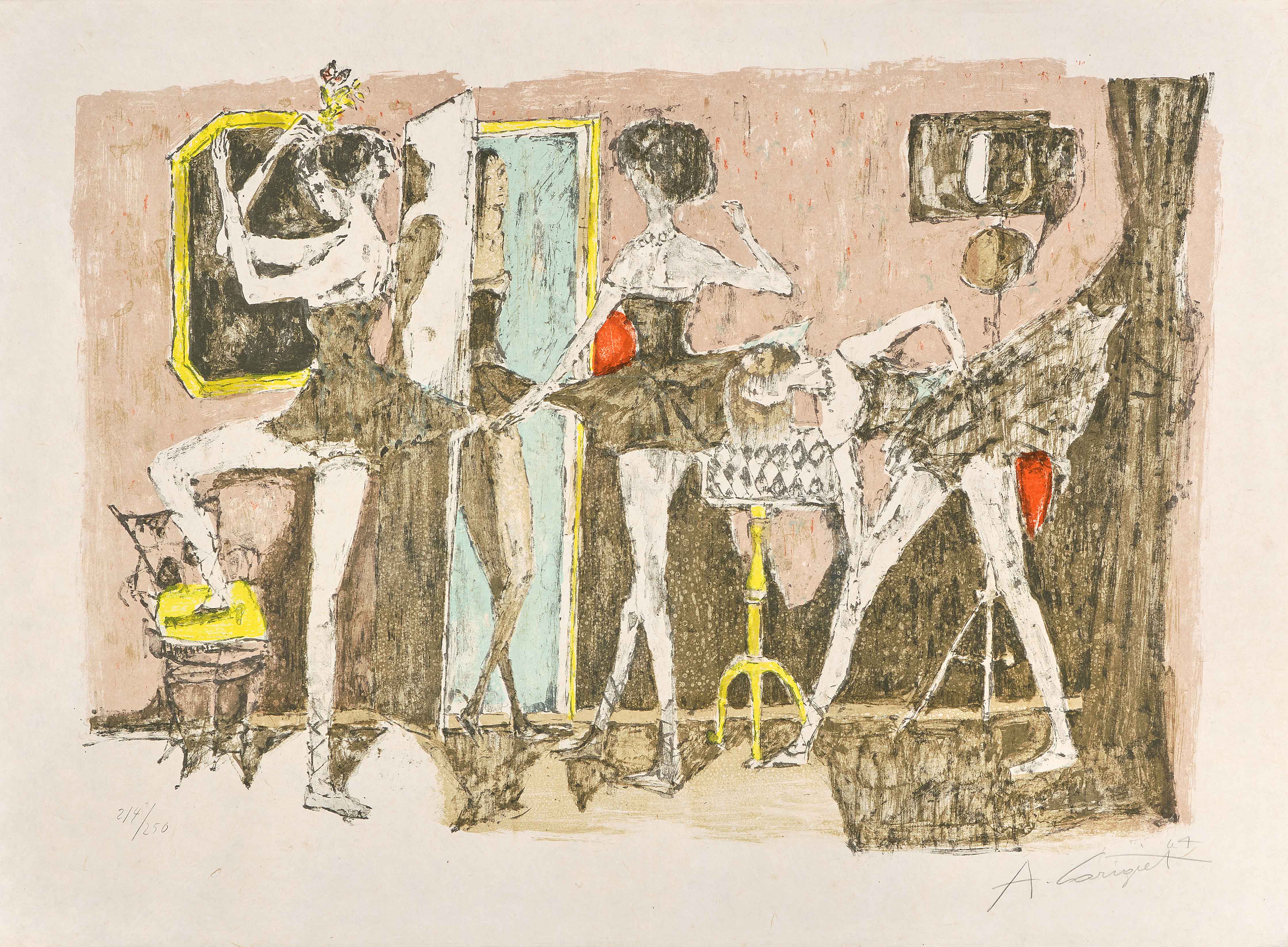 "Die Balletteusen". 1967. Farblithographie. 214/250. Unten rechts in Bleistift signiert und datiert. Blattgrösse 56,5x77 cm. Gerahmt.