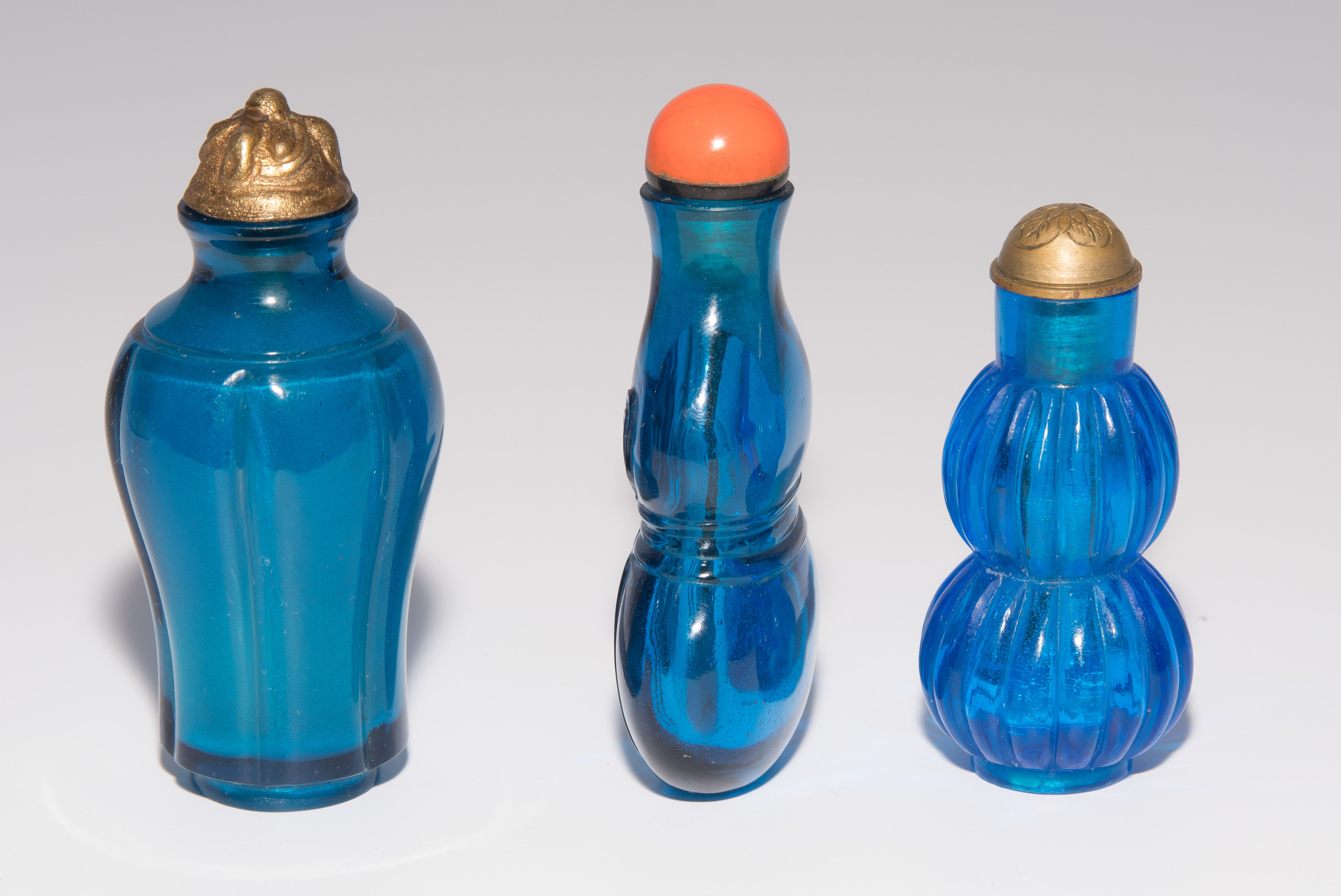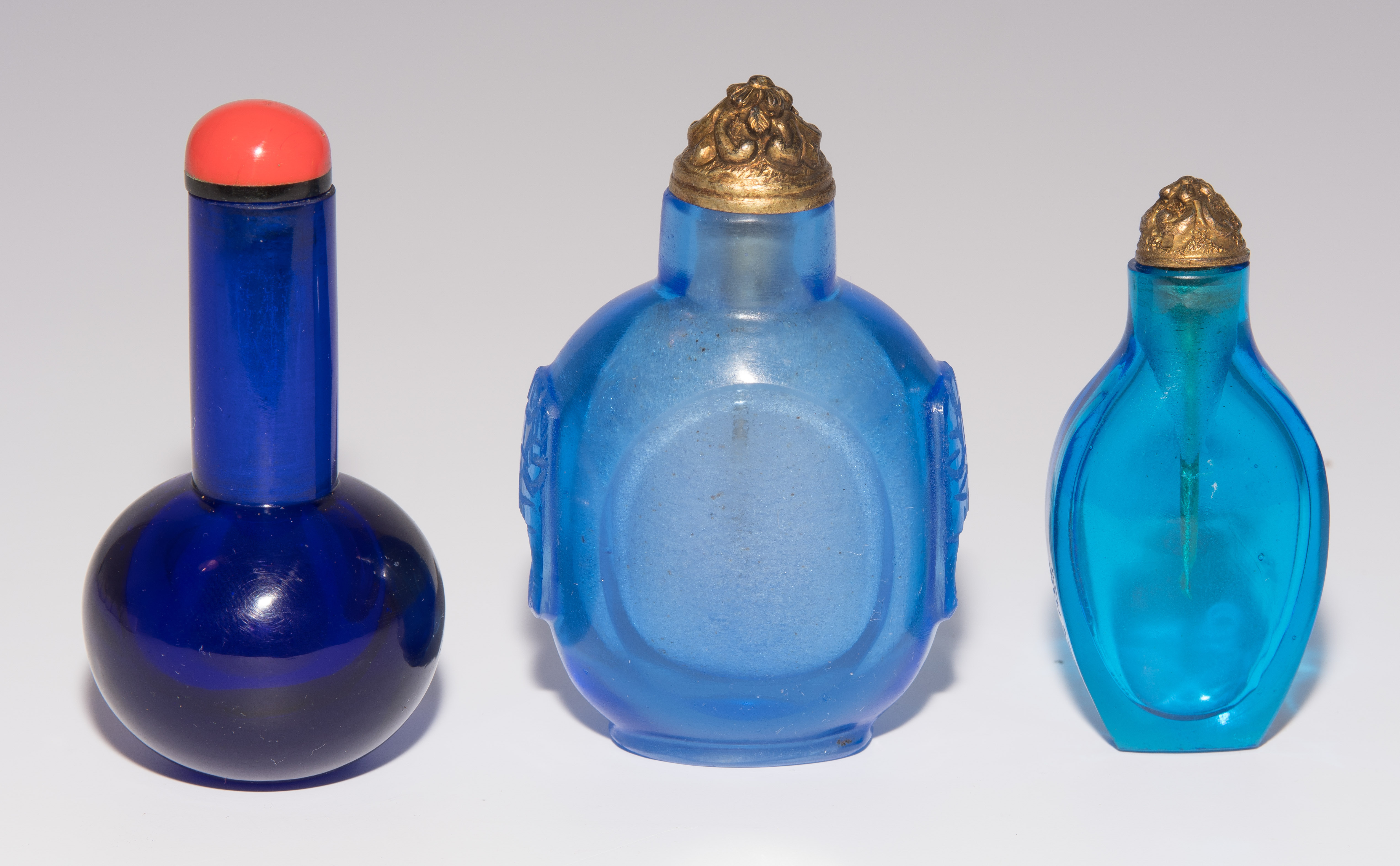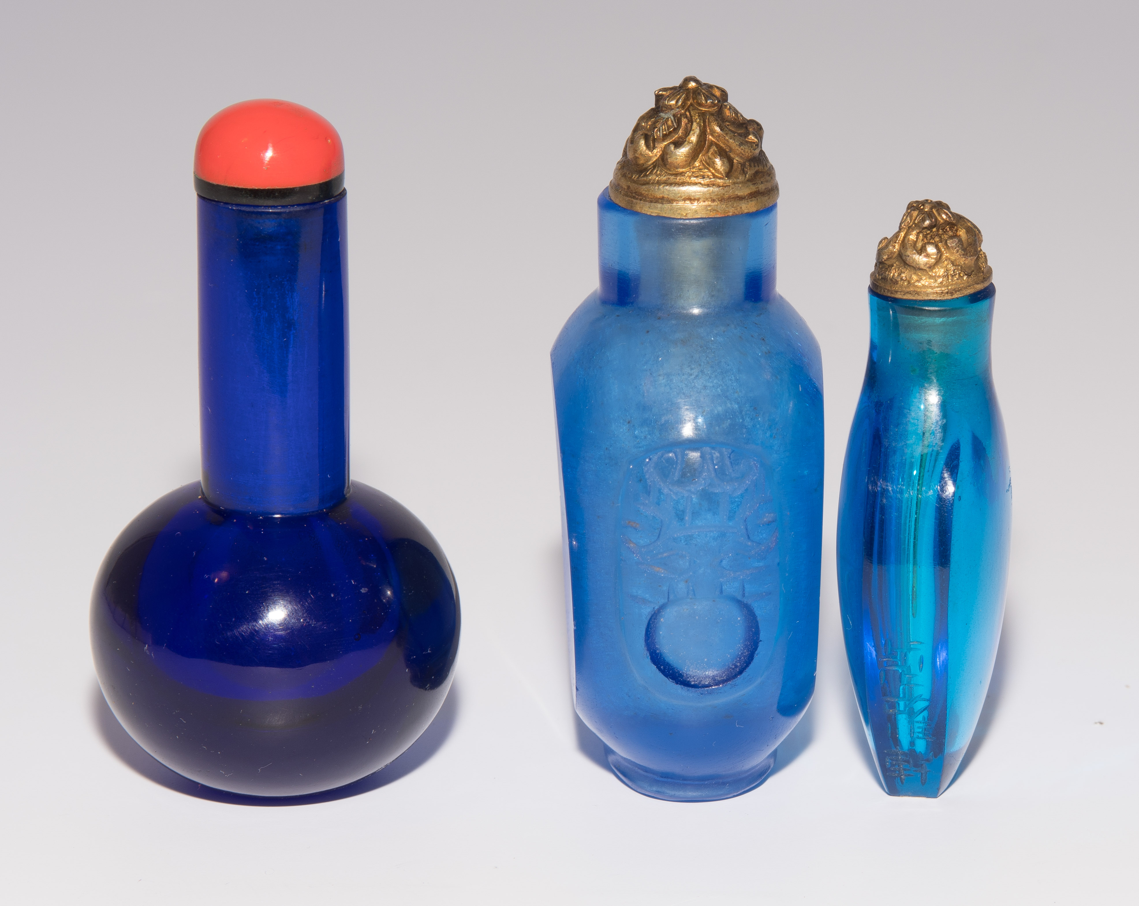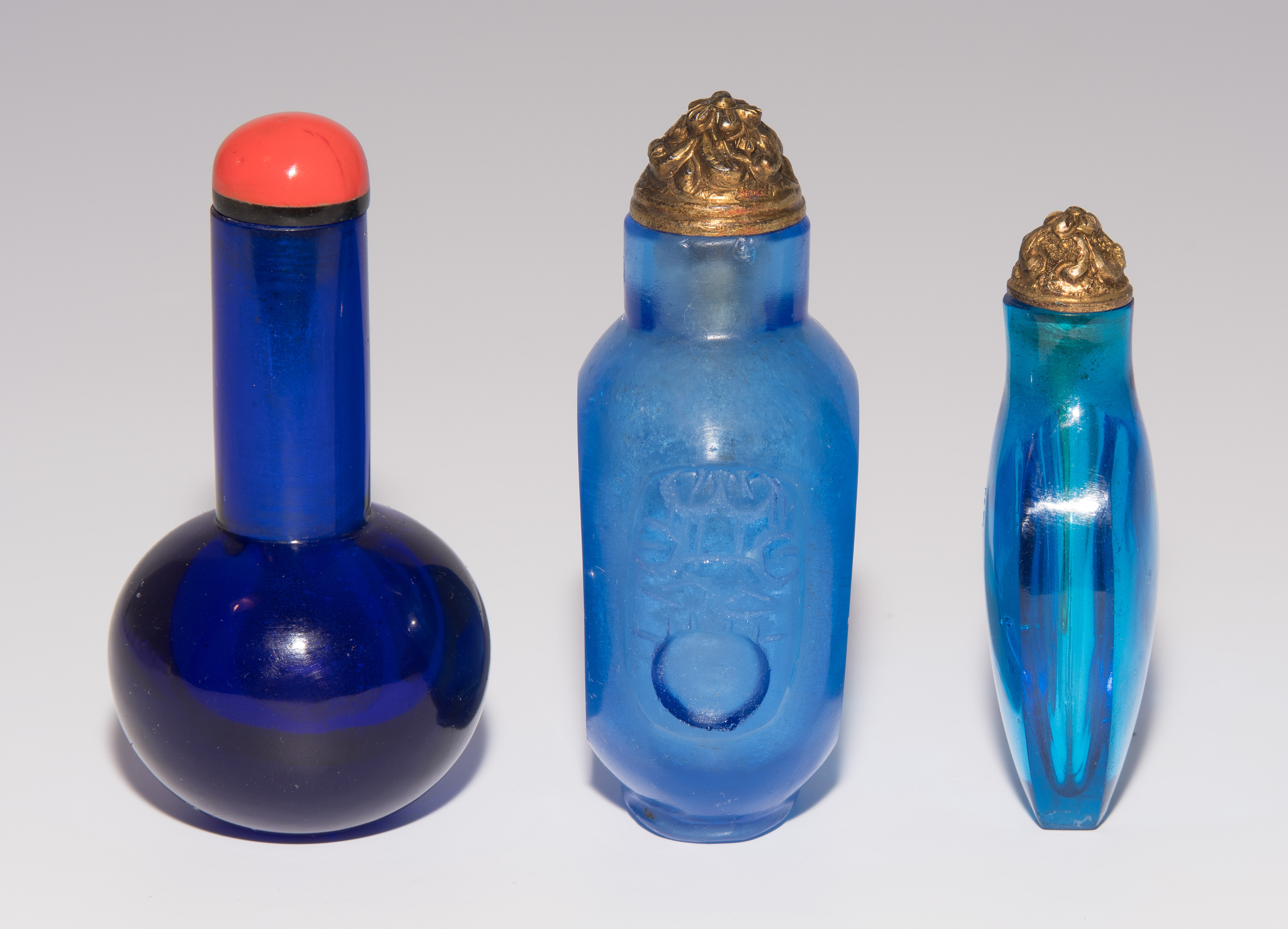 China. Transparentes Glas in verschiedenen Blautönen. Ein Snuff Bottle mit seitlich gravierter Drei-Zeichen-Marke. H 5,5–7 cm.