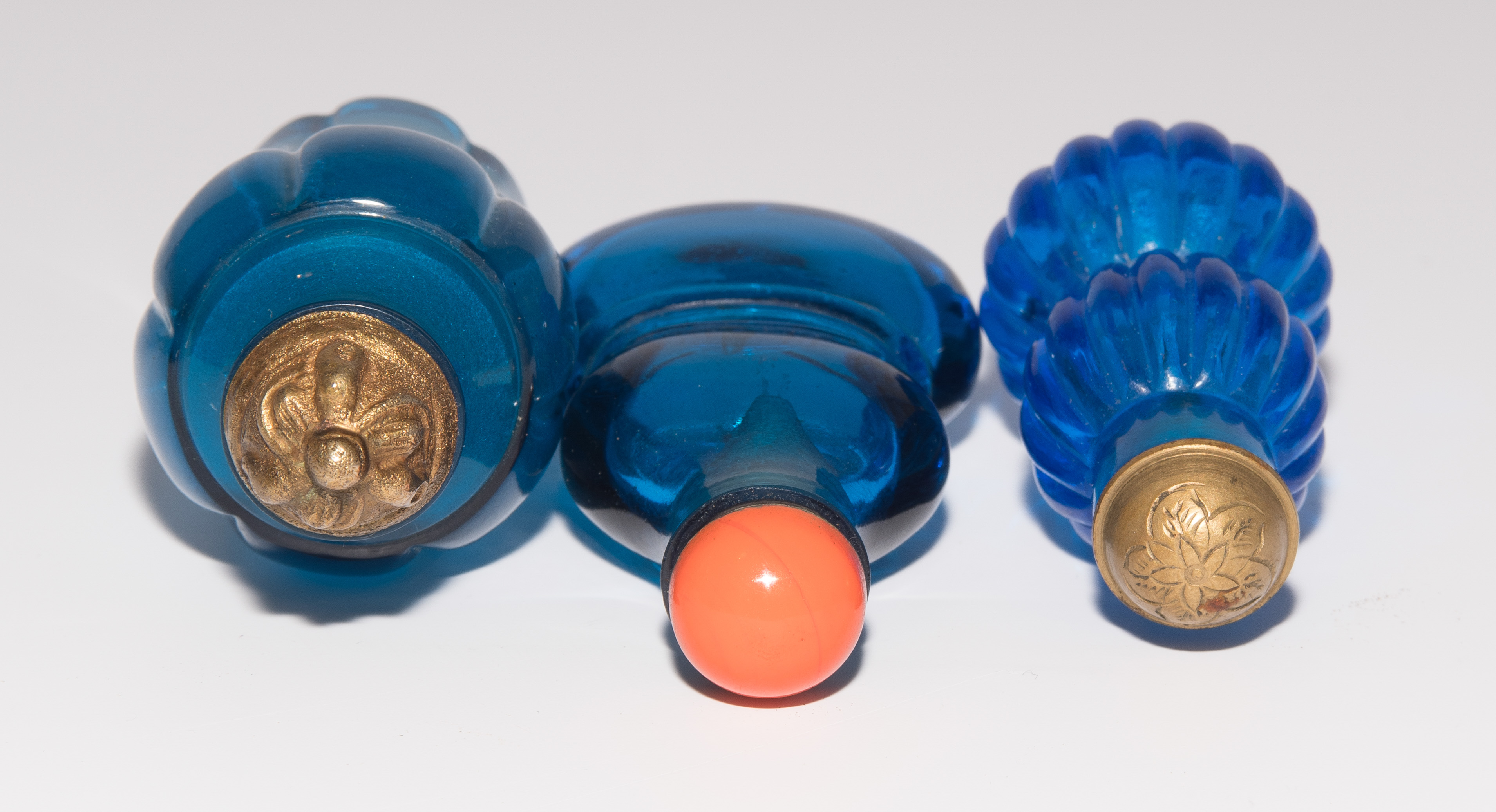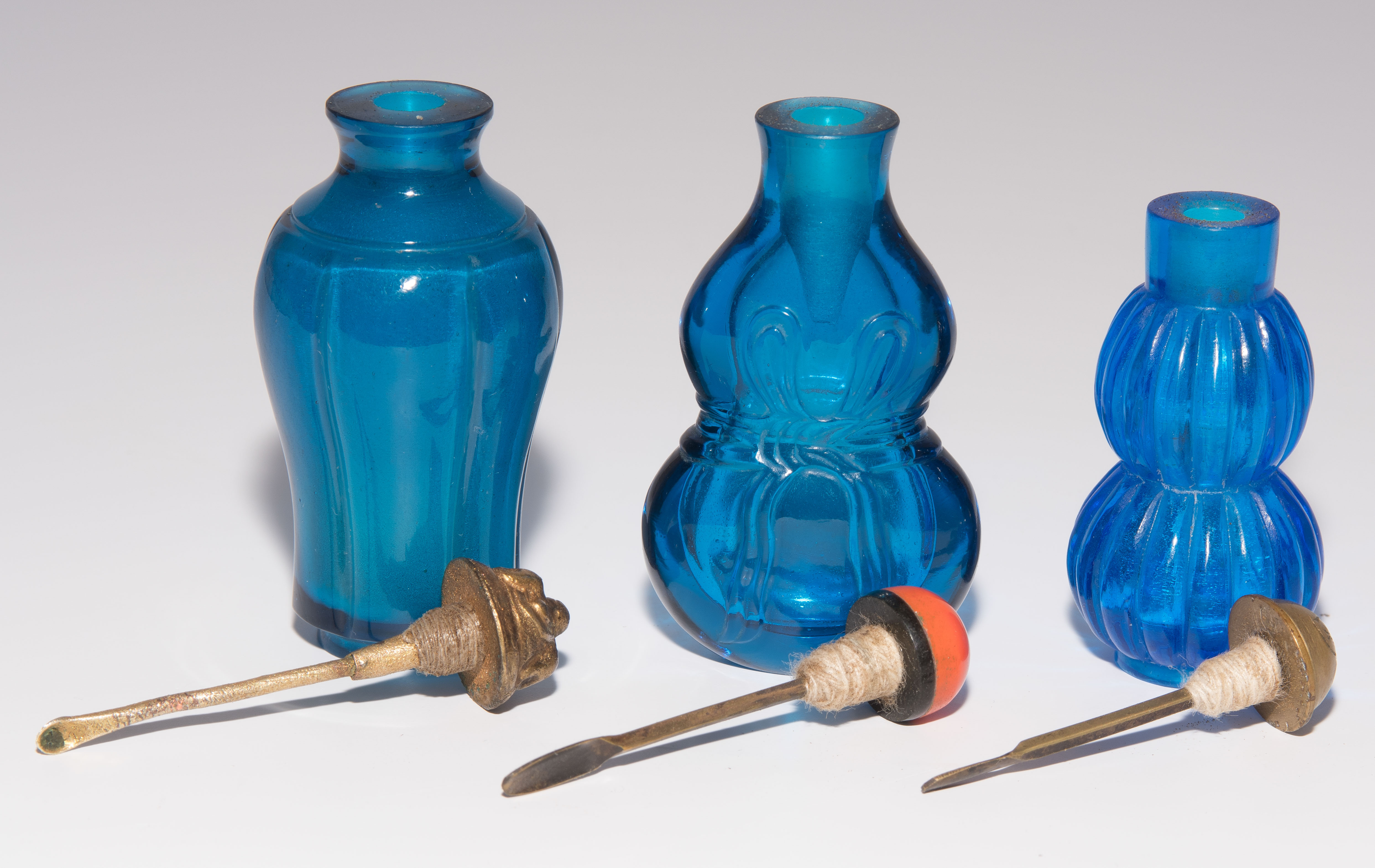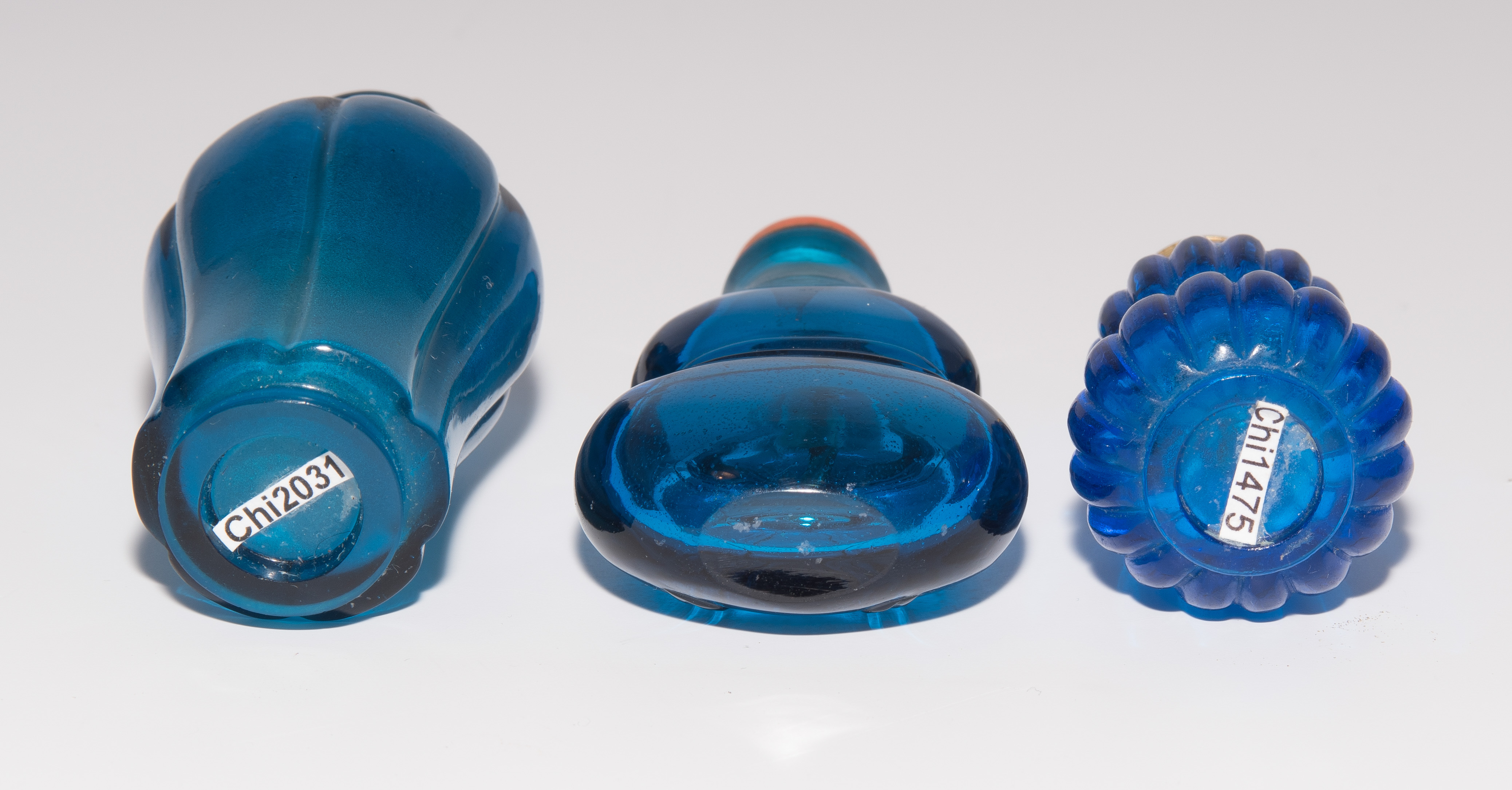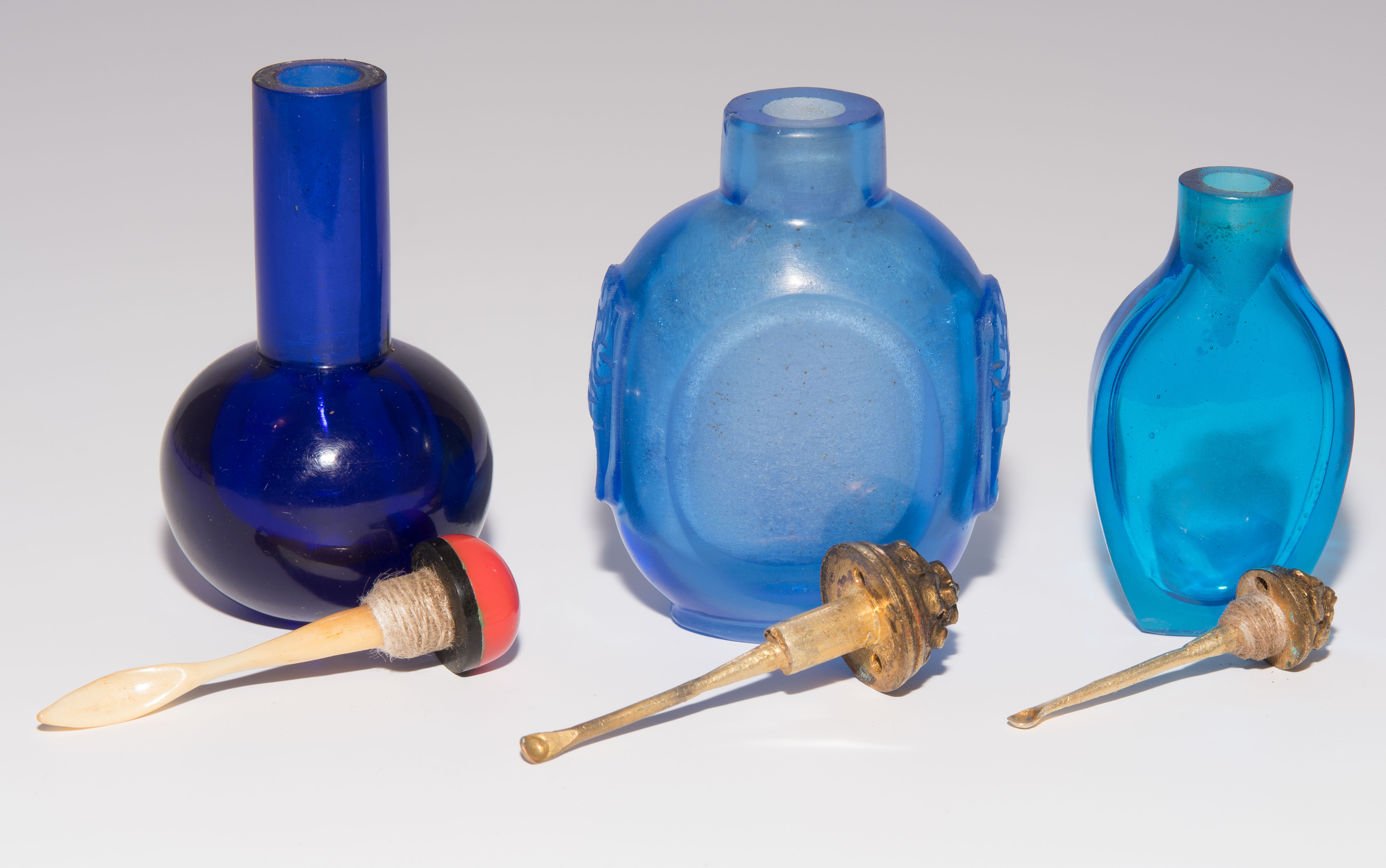 China. Transparentes Glas in verschiedenen Blautönen. Ein Snuff Bottle mit seitlich gravierter Drei-Zeichen-Marke. H 5,5–7 cm.