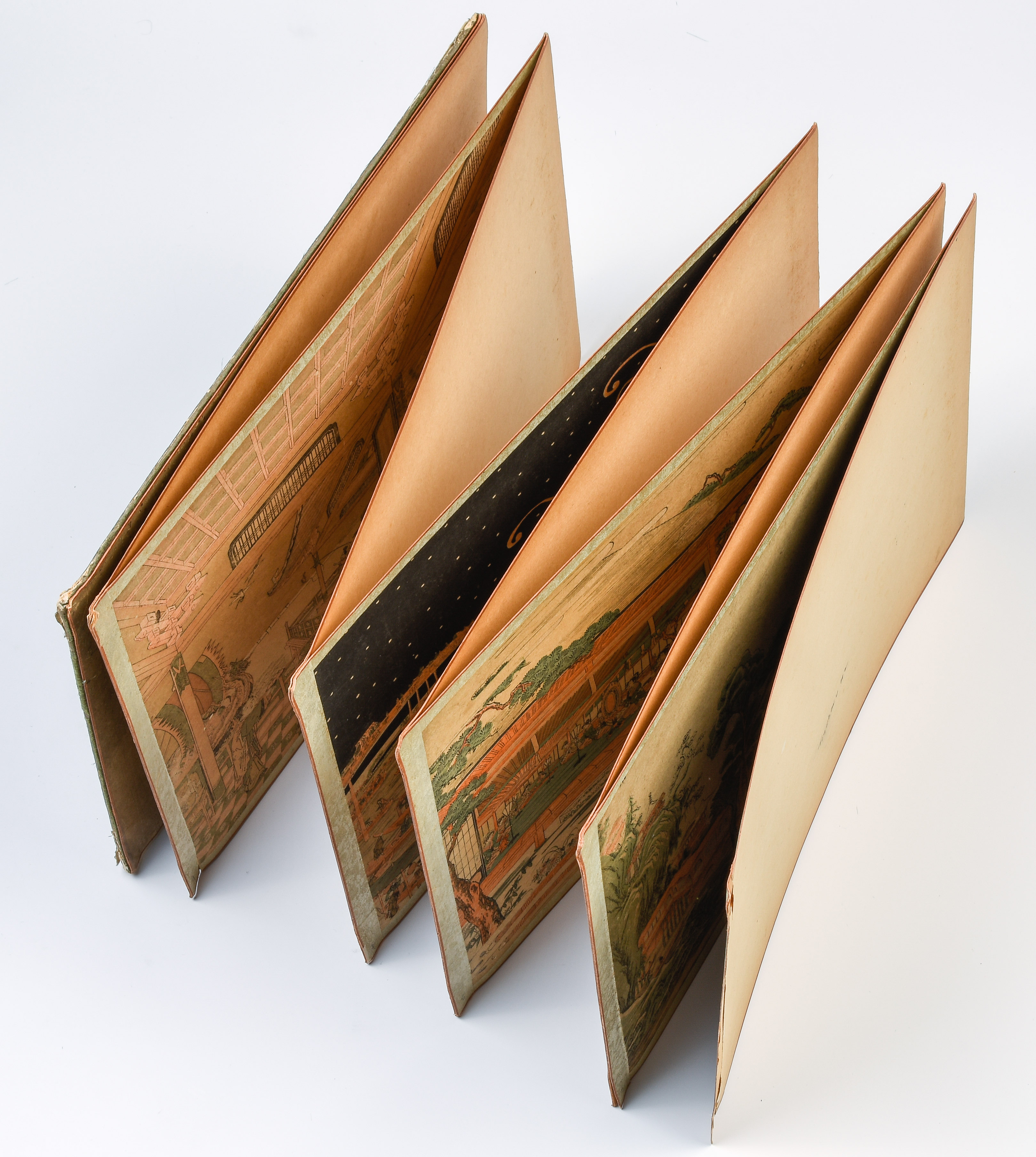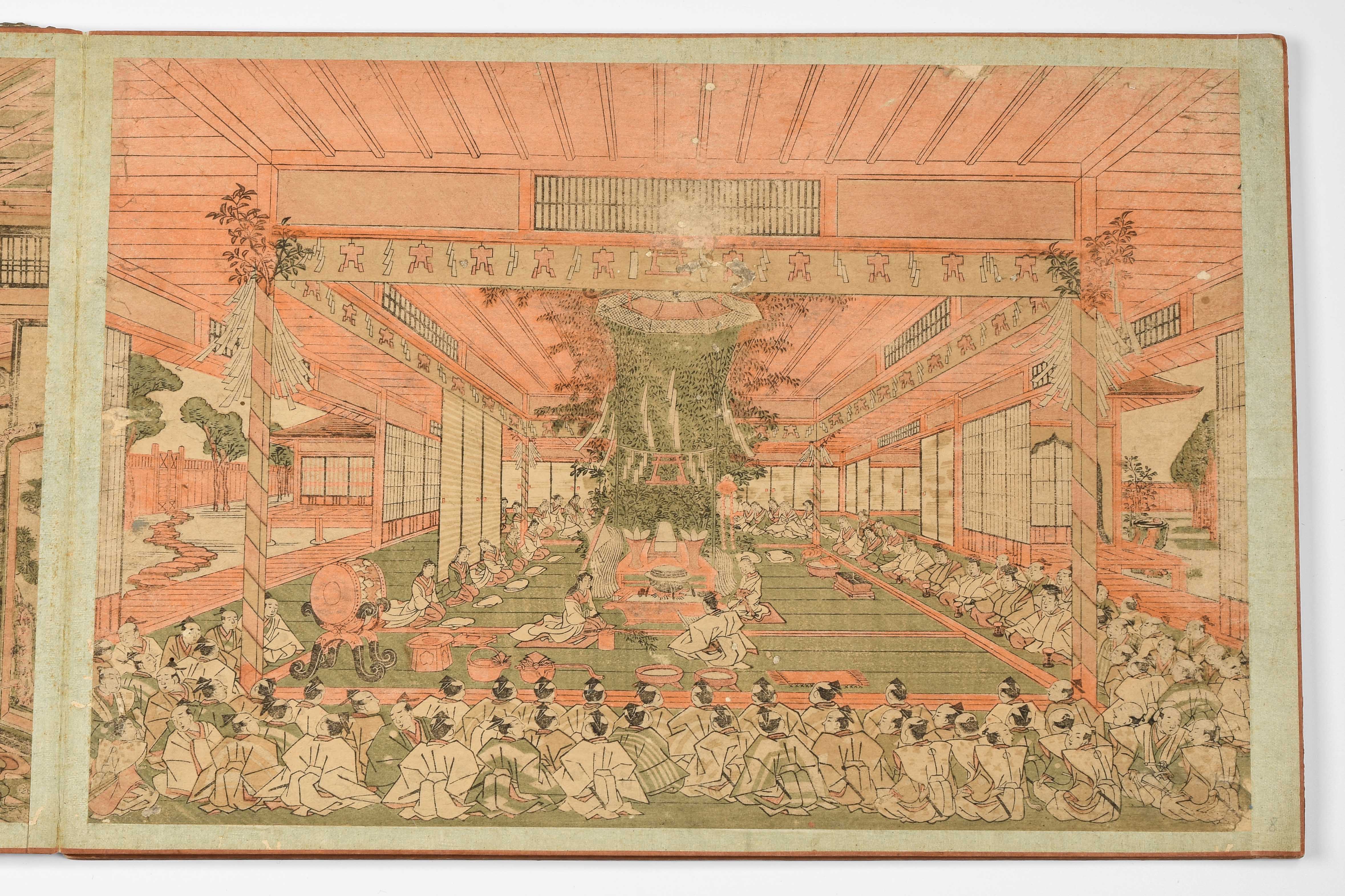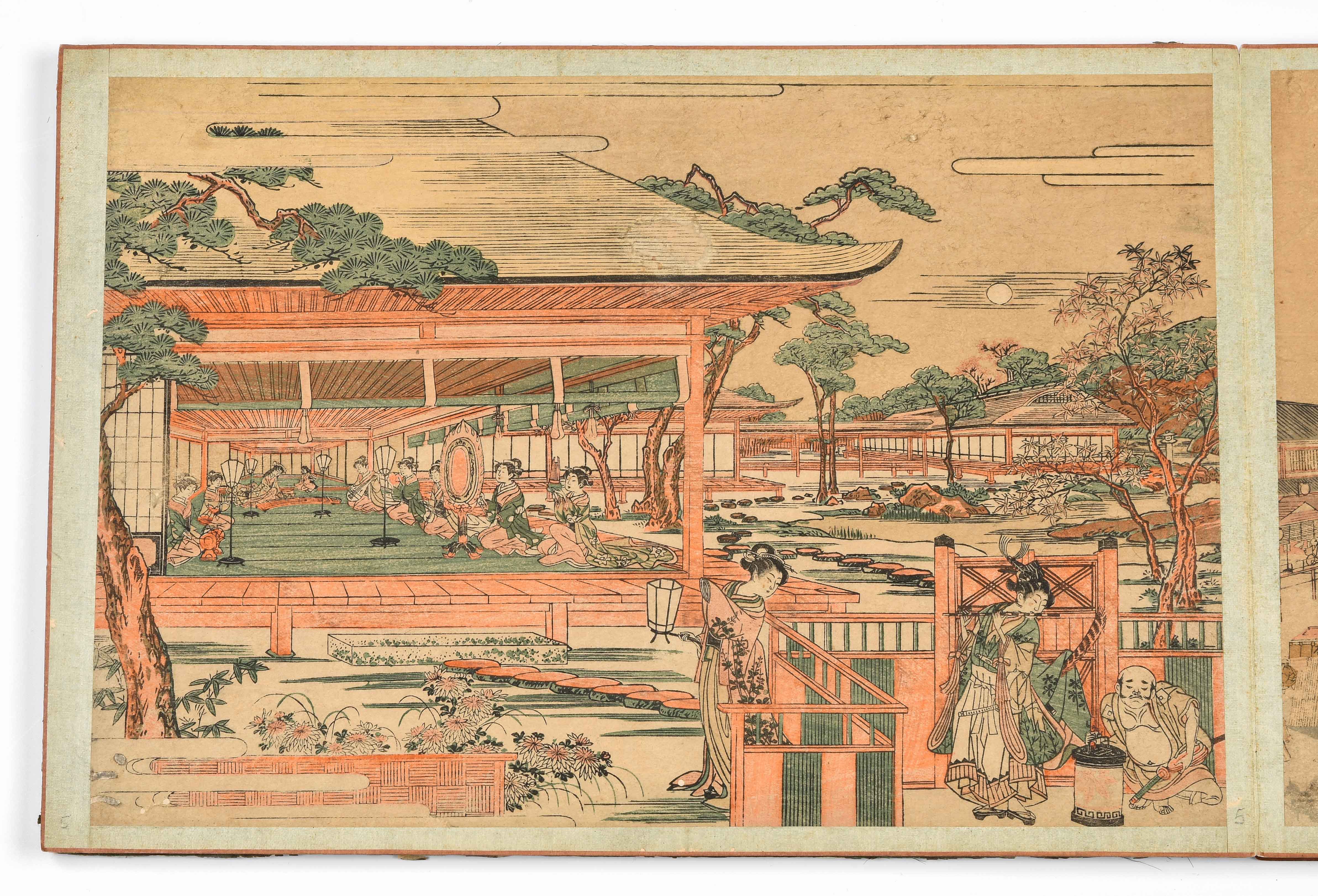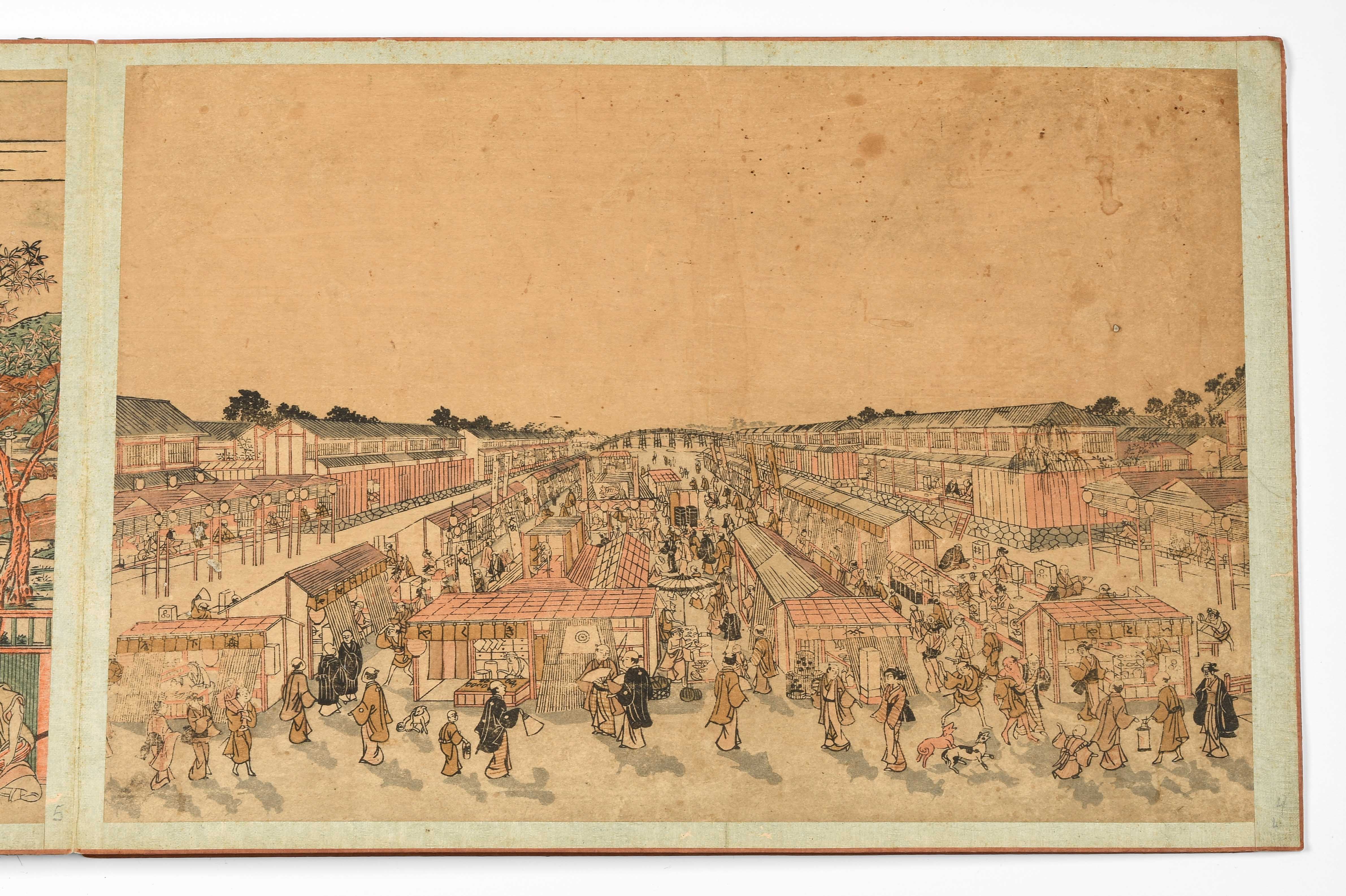 Album mit 10 Nishiki-e. Um 1764–1789. "Ukie Wakoku no Keiseki, Yoritomo-kô Fuji Makigari no zu" (Jagdszene mit Minamotono-Yoritomo am Fusse des Fuji). Signiert Utagawa Toshiharu ga. Verleger Eijûdô Nishimura-ya. Und weitere Uki-e (Perspektivdruck) mit diversen Szenen wie z.B. die Nihonbashi-Brücke, Fest- und Feuerwerkszenen, Palastansichten, Darstellung der Siebenglücksgötter, Interieur- und europäische Flussansichten. Je Yoko-Oban-Format. - Aufgezogen, div. Schadstellen.