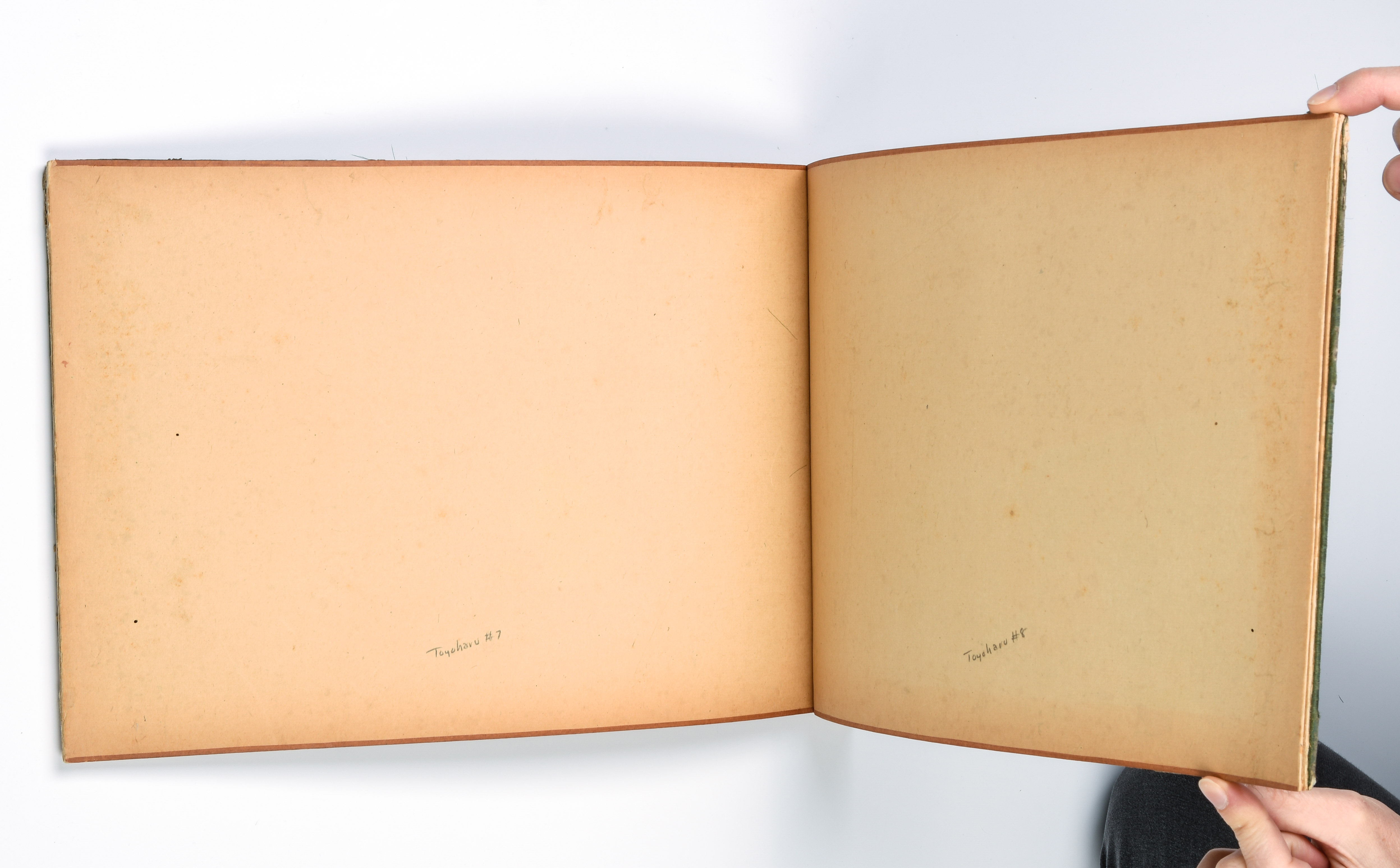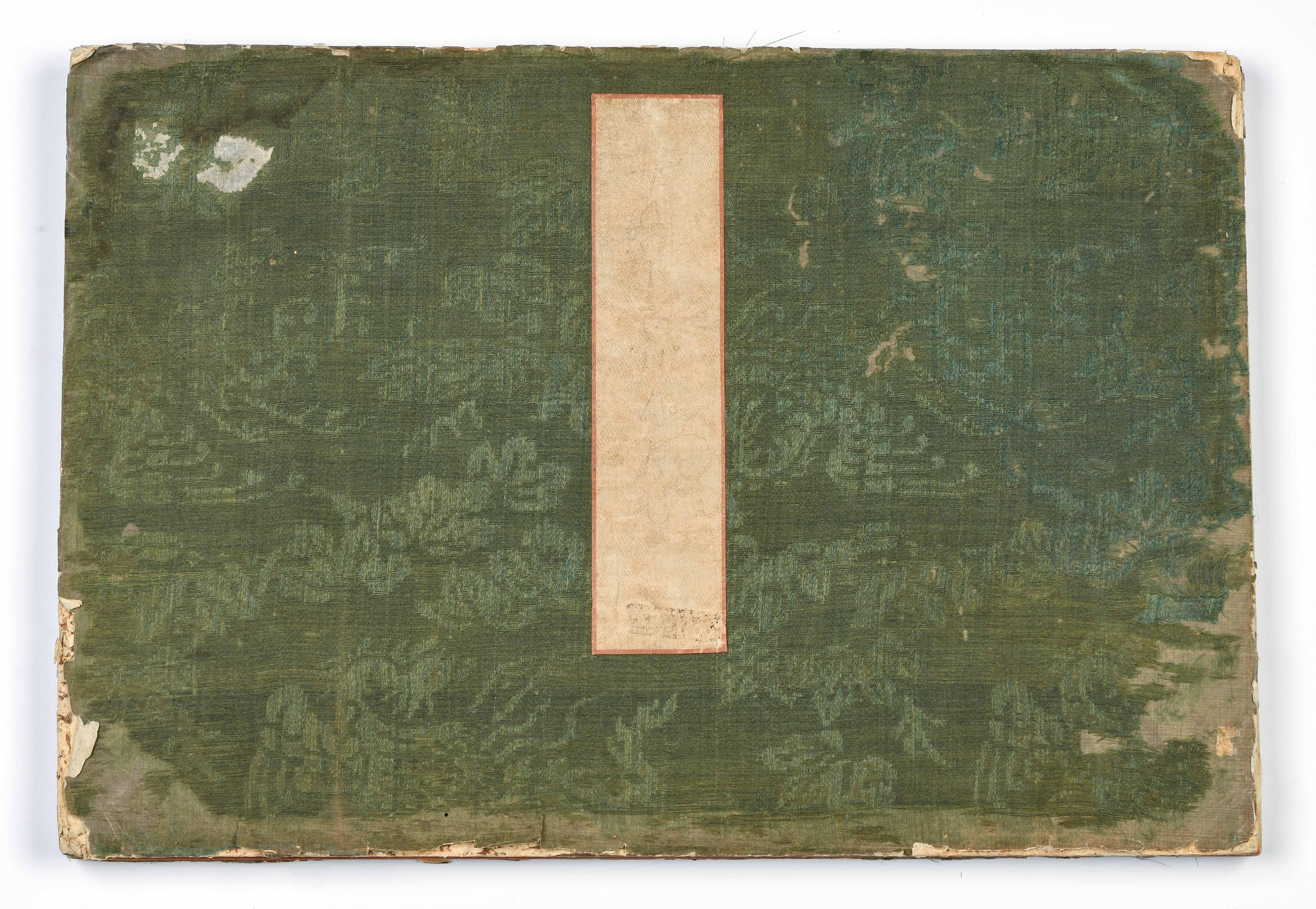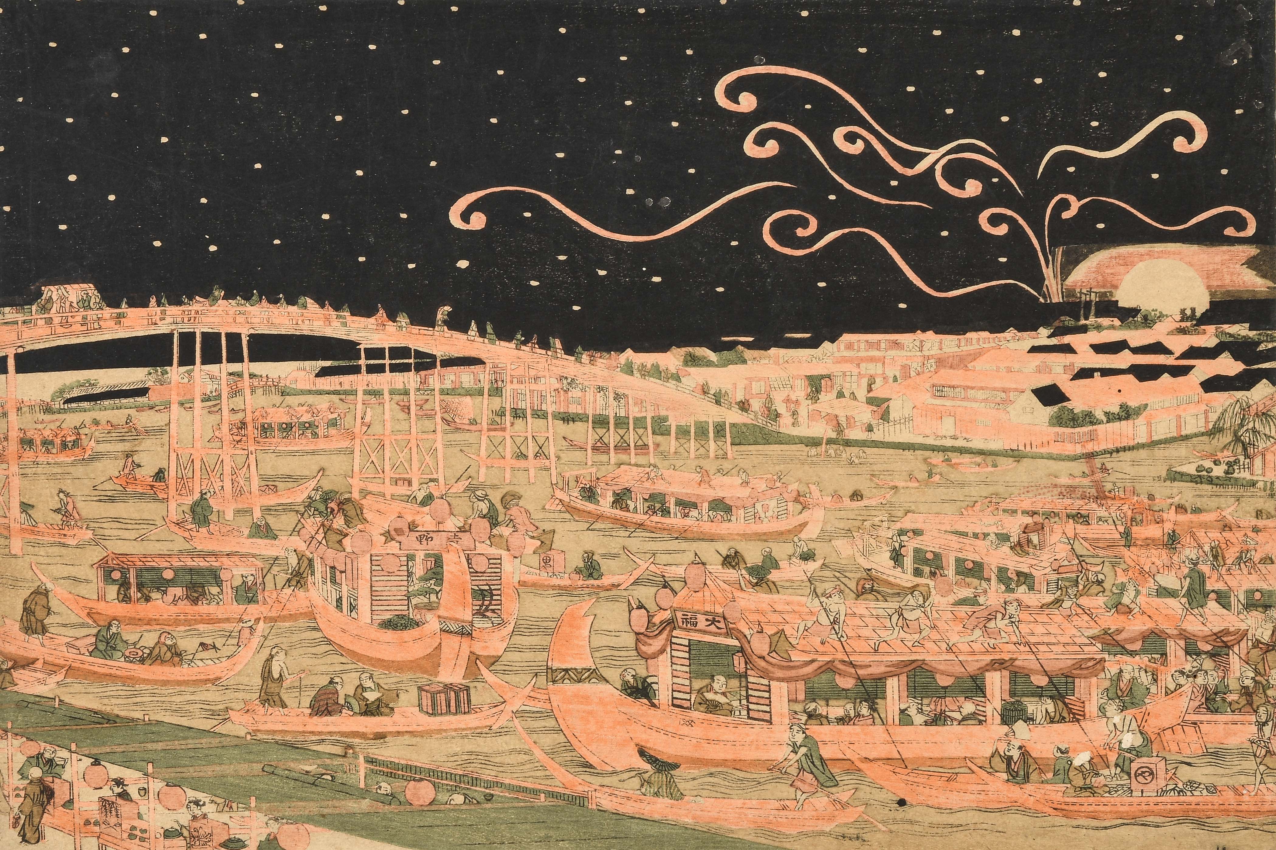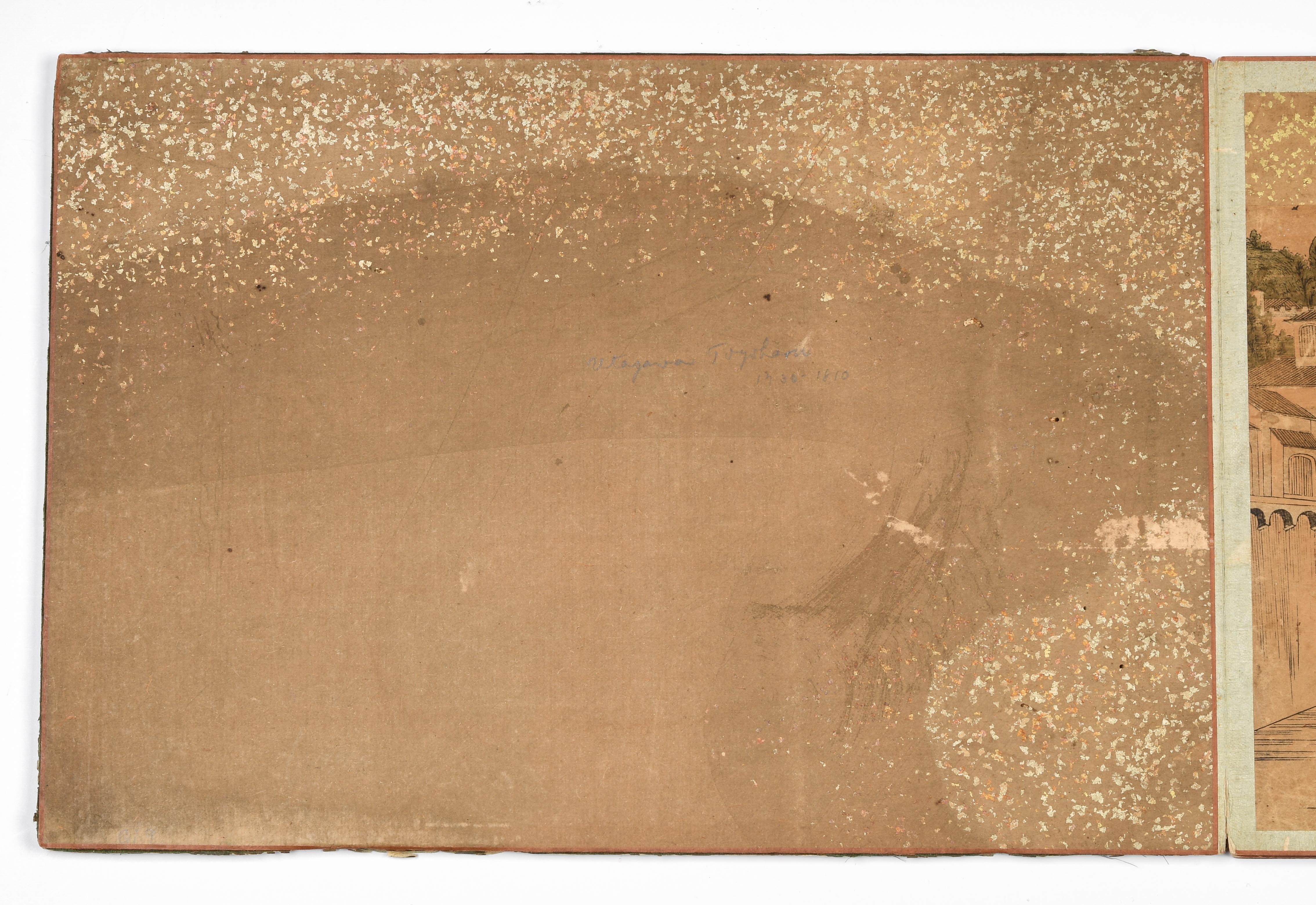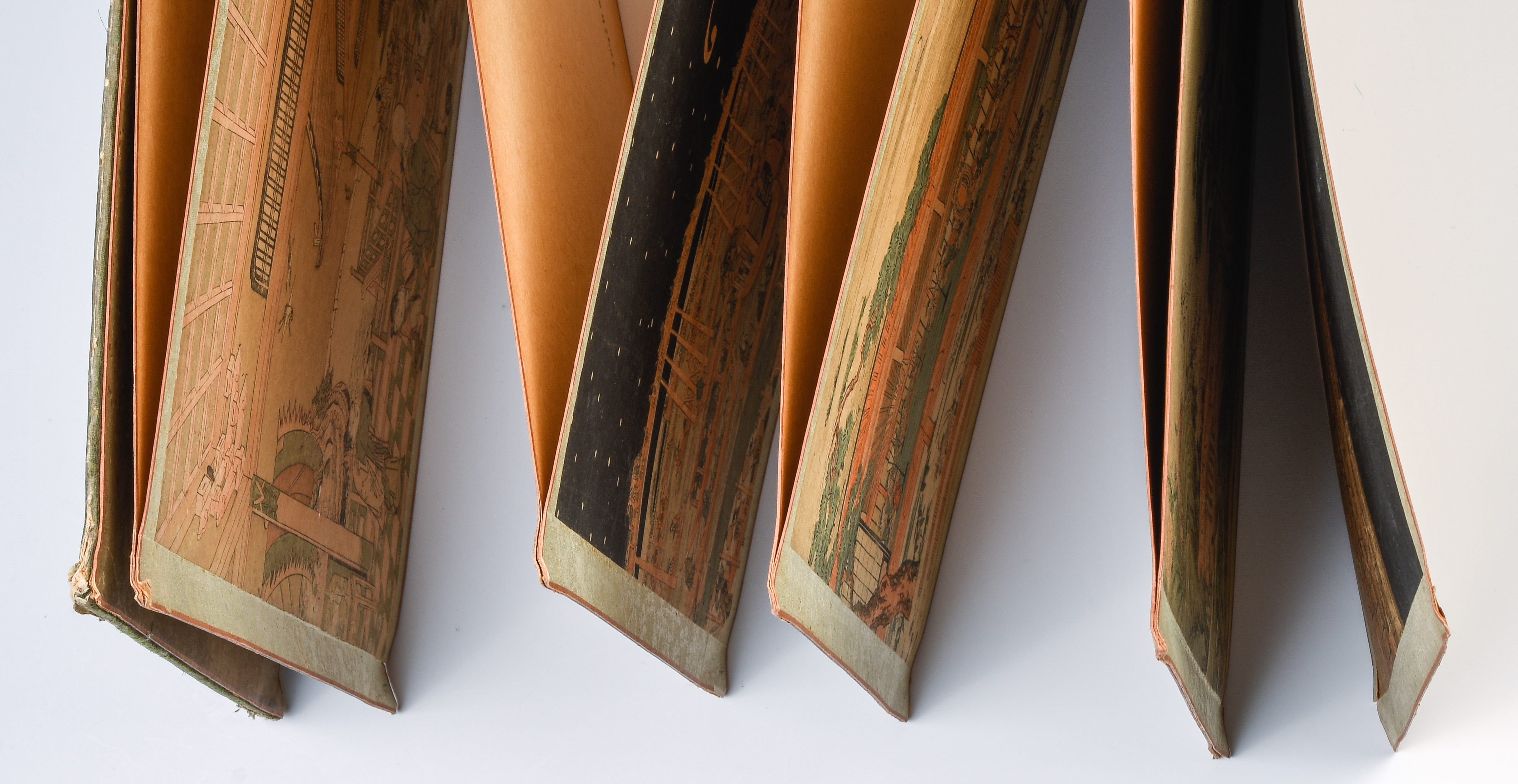 Album mit 10 Nishiki-e. Um 1764–1789. "Ukie Wakoku no Keiseki, Yoritomo-kô Fuji Makigari no zu" (Jagdszene mit Minamotono-Yoritomo am Fusse des Fuji). Signiert Utagawa Toshiharu ga. Verleger Eijûdô Nishimura-ya. Und weitere Uki-e (Perspektivdruck) mit diversen Szenen wie z.B. die Nihonbashi-Brücke, Fest- und Feuerwerkszenen, Palastansichten, Darstellung der Siebenglücksgötter, Interieur- und europäische Flussansichten. Je Yoko-Oban-Format. - Aufgezogen, div. Schadstellen.