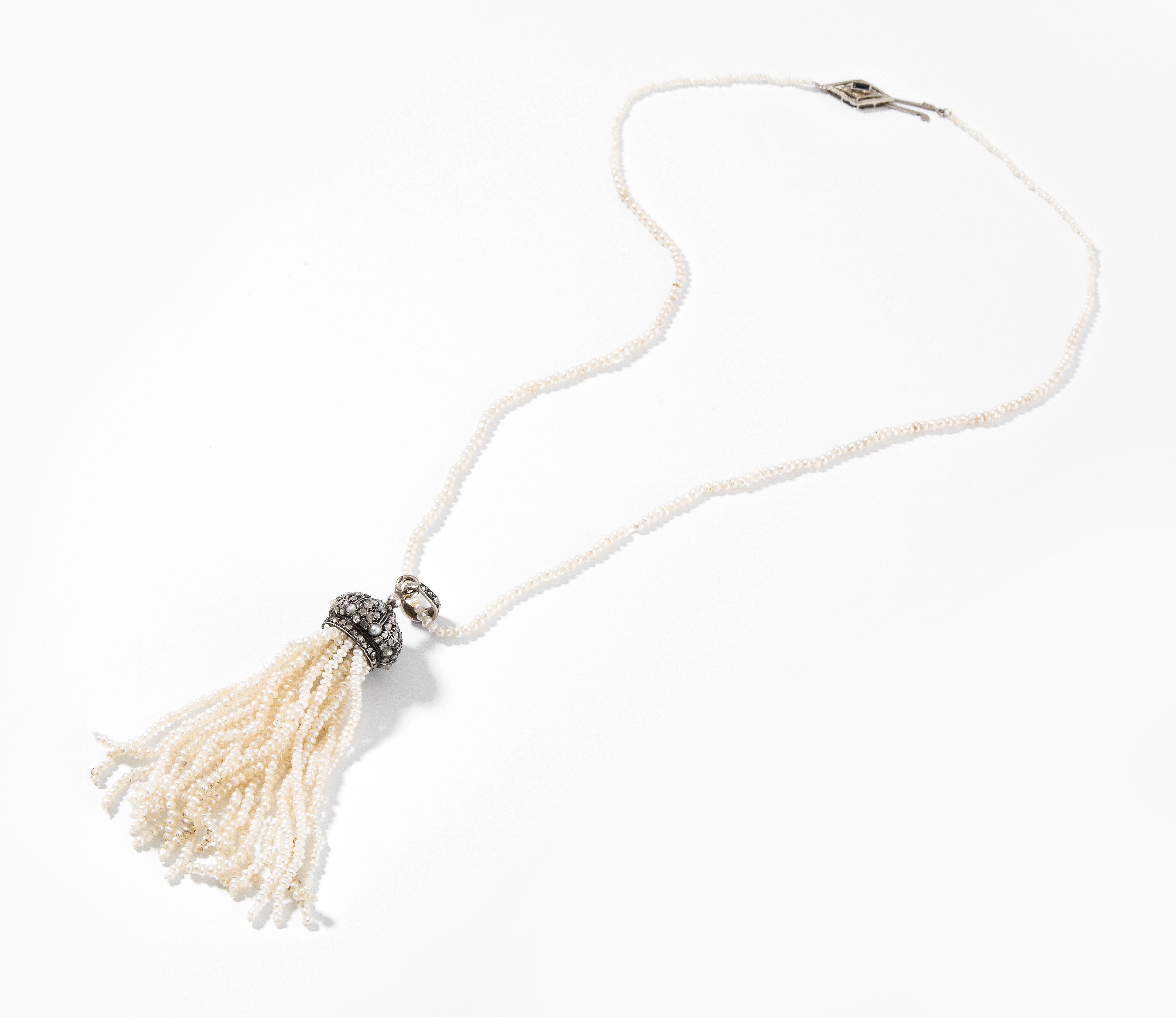 Anfang 20.Jh. Silber. Quaste mit kl. Diamantrosen und Naturperlen, hängend 24 Naturperlenfäden je 2 mm Ø, Anhänger L 7,5 cm. Naturperlenkette ca. 2 mm Ø mit 585 Weissgoldschloss und wohl 1 Saphir. L 41 cm. 13,1 g.