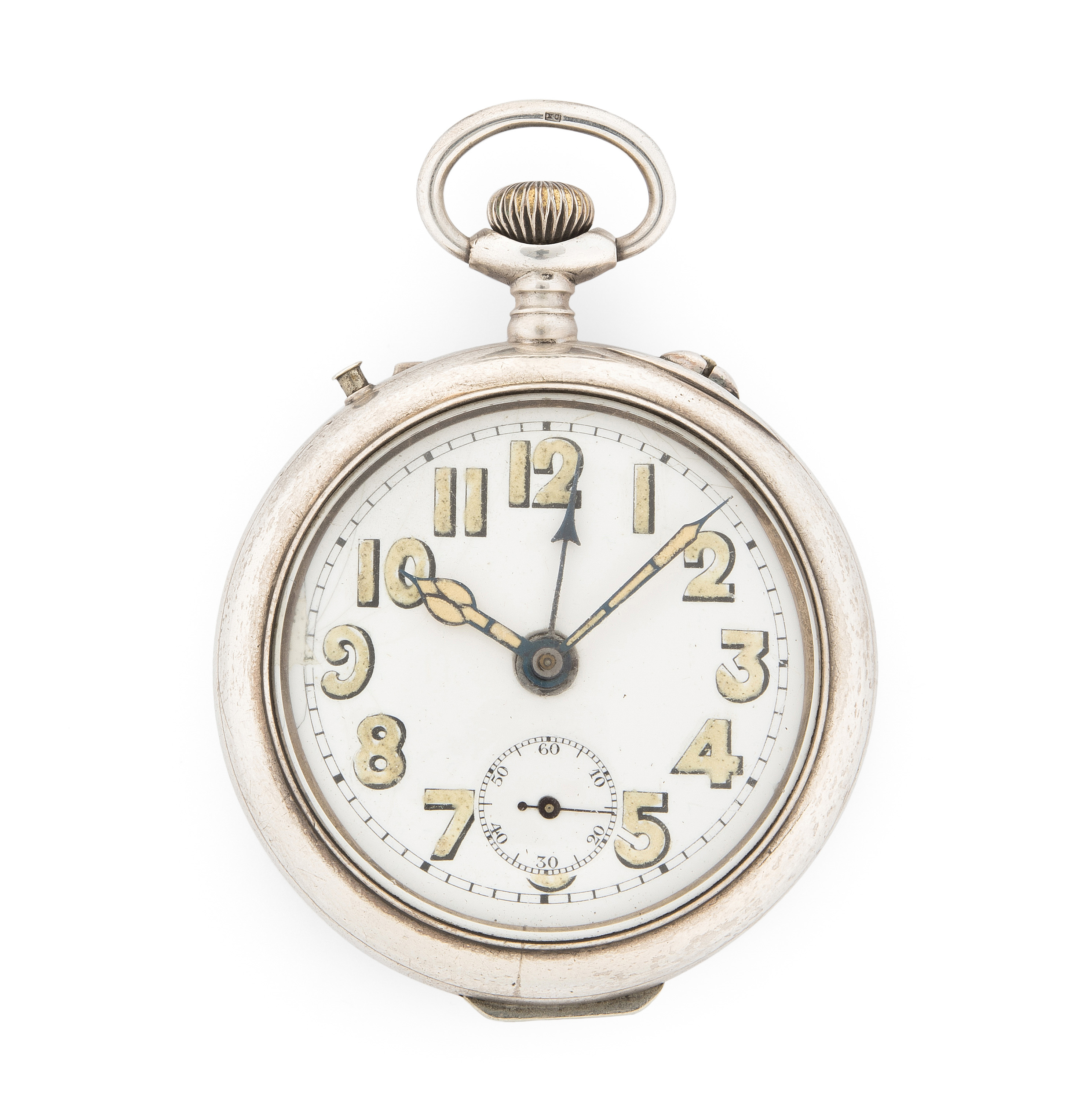 Runde, mechanische Taschenuhr mit Wecker um 1910 in Silbergehäuse. Boden gedückt, Gehäusenummer 19071, Rückendeckel fein ziseliert mit zentralem Medaillon, kann ausgeklappt und die Uhr aufgestellt werden. Weisses Emailzifferblatt mit arabischen Stundenzahlen, Indizes, Mercedes-Zeiger. Wecker funktioniert nicht. Gebrauchsspuren