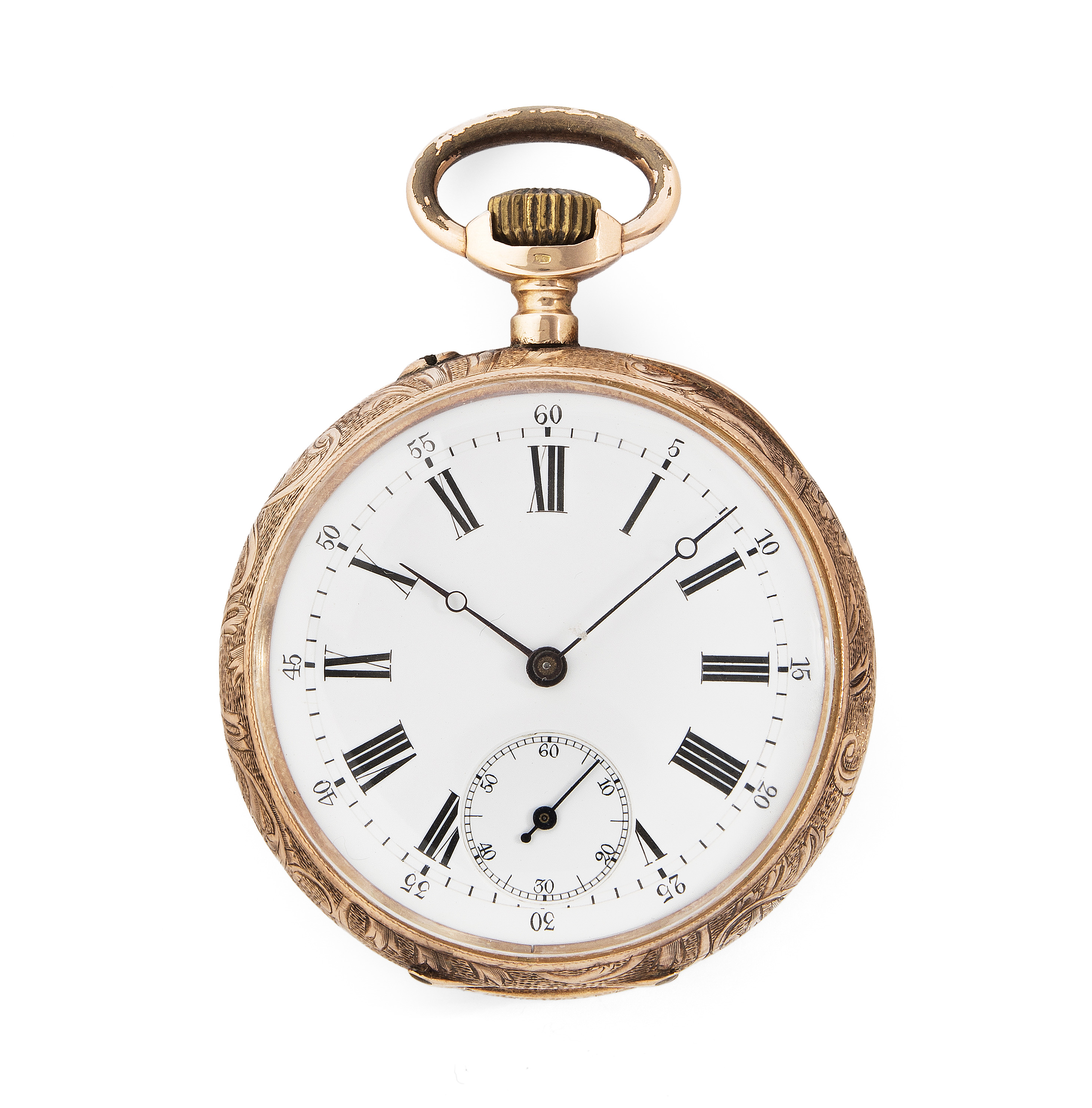 Runde, mechanische Taschenuhr um 1900 mit Handaufzug in 750 Gelbgoldgehäuse ca. 35 g. Rückendeckel ziseliert mit zentralem Medaillon, Werkdeckel graviert, Gehäusenummer 10727, D 48 mm. Weisses Emailzifferblatt mit römischen Stundenzahlen, arabischen Minutenzahlen, Breguet-Zeiger, kleine Sekundenanzeige. Gebrauchsspuren.
