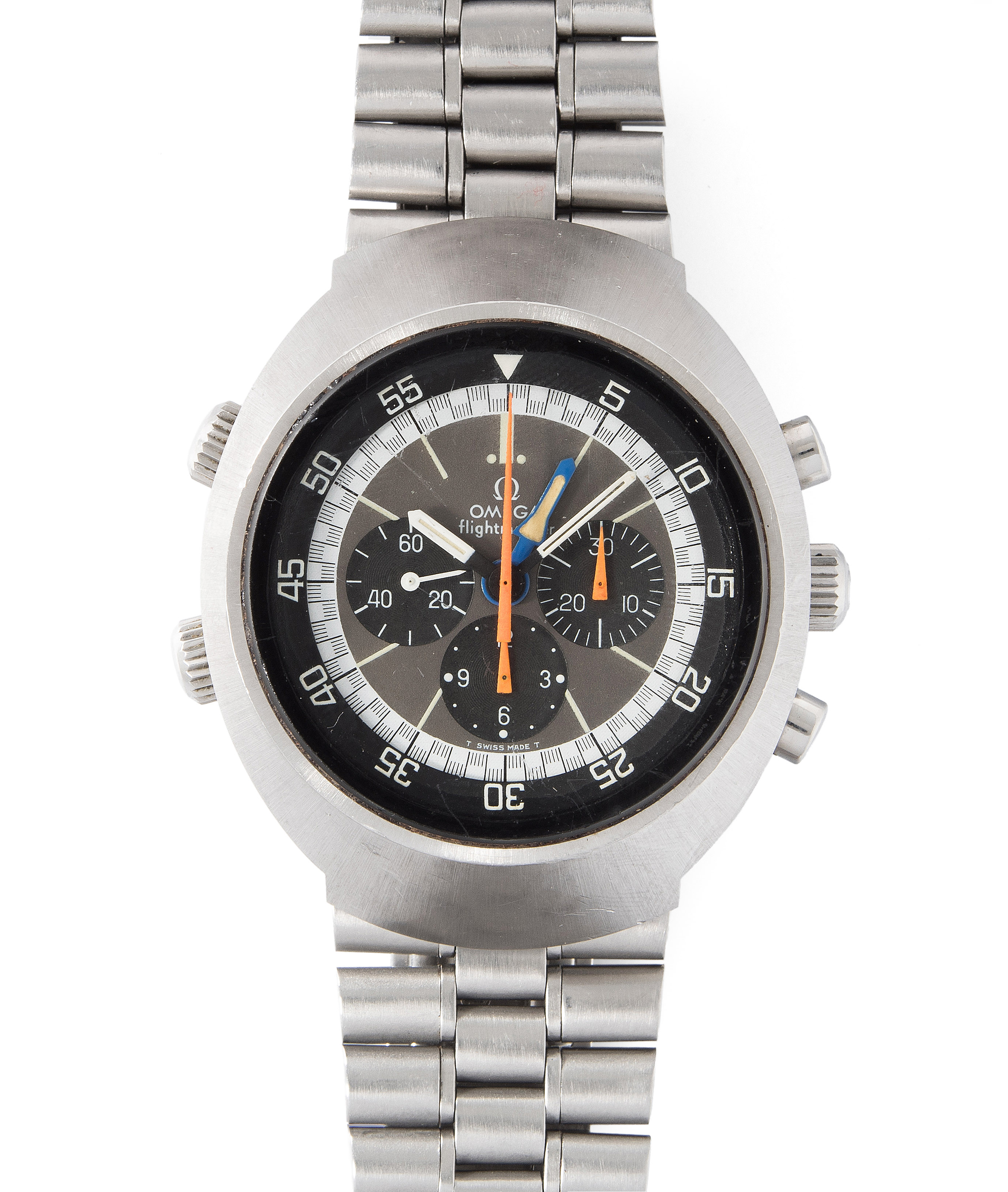 Runder, mechanischer Chronograph 1971 mit Handaufzug in tonneauförmigem Edelstahlgehäuse. Boden verschraubt mit Flightmastergravur, Werknummer 33314053, Kaliber 911, Gehäusenummer 145.026, D 43 mm. Schwarzes Zifferblatt mit Stundenindizes, Stab-Zeiger, zentraler Chronographenzeiger. Lünette mit 60er Einteilung. Drei Hilfszifferblätter: kleine Sekunden-, 30 Minuten- und 12 Stundenanzeige. Gliederarmband mit einseitiger Faltschliesse, Umfang 16 cm. Gebrauchsspuren.
