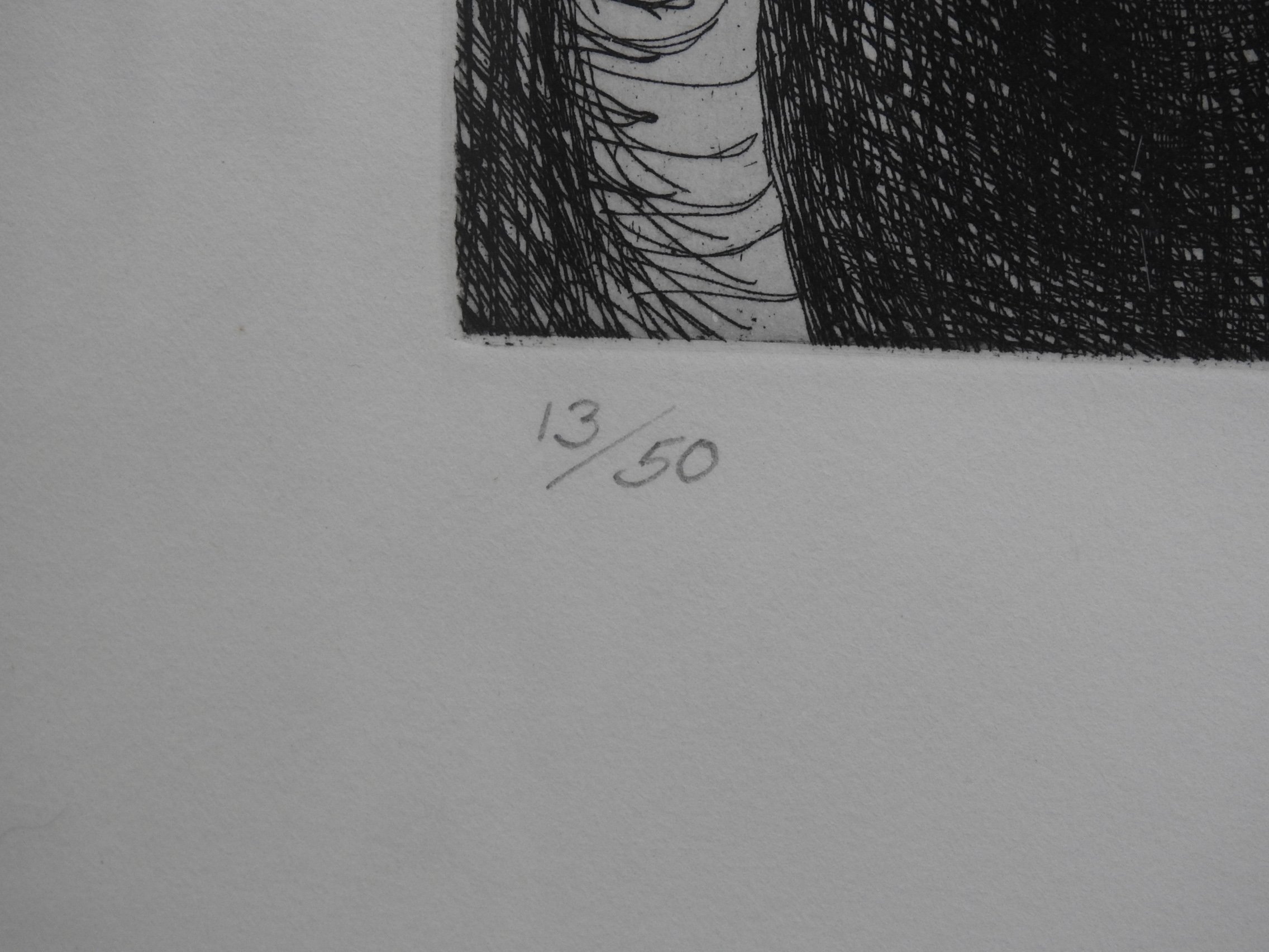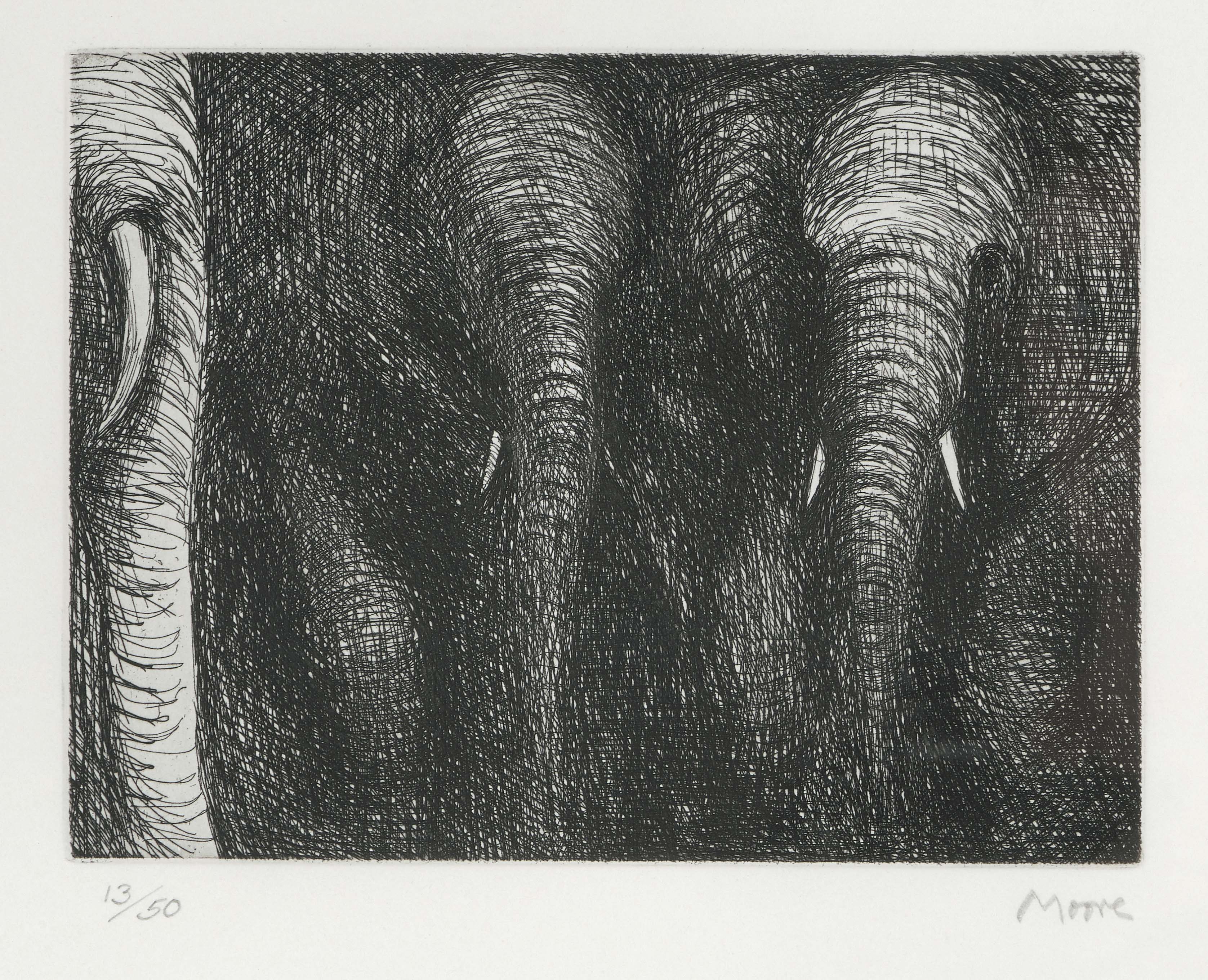 "Elephants". 1979. Radierung. 13/50. Unten rechts in Bleistift signiert. Plattengrösse 15,2x20, Blattgrösse 35x47 cm. Gerahmt. -Unterer Rand beschnitten. Blatt minimst gebräunt. Ränder und Ecken minimst bestossen. Verso wenig braunfleckig.
