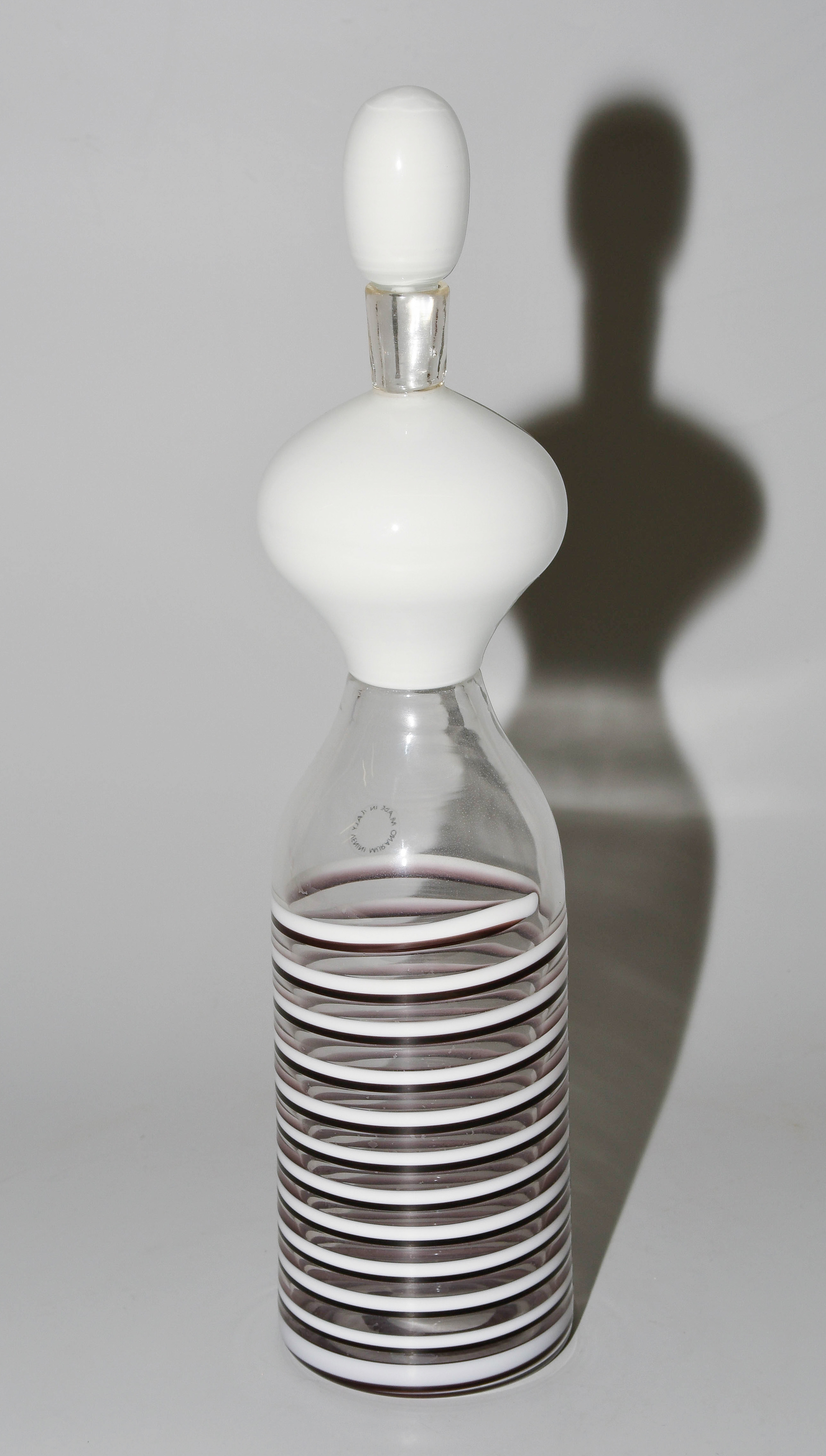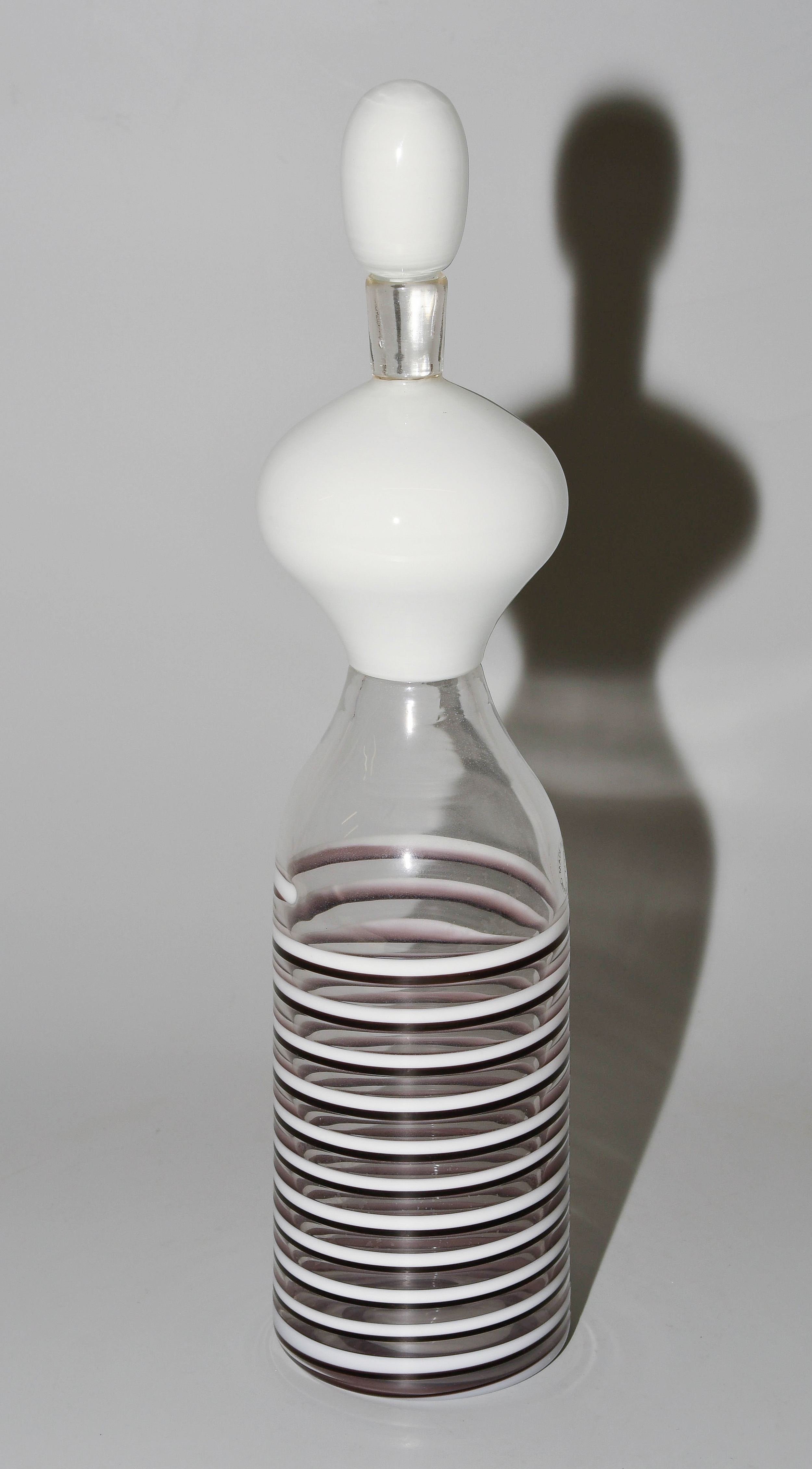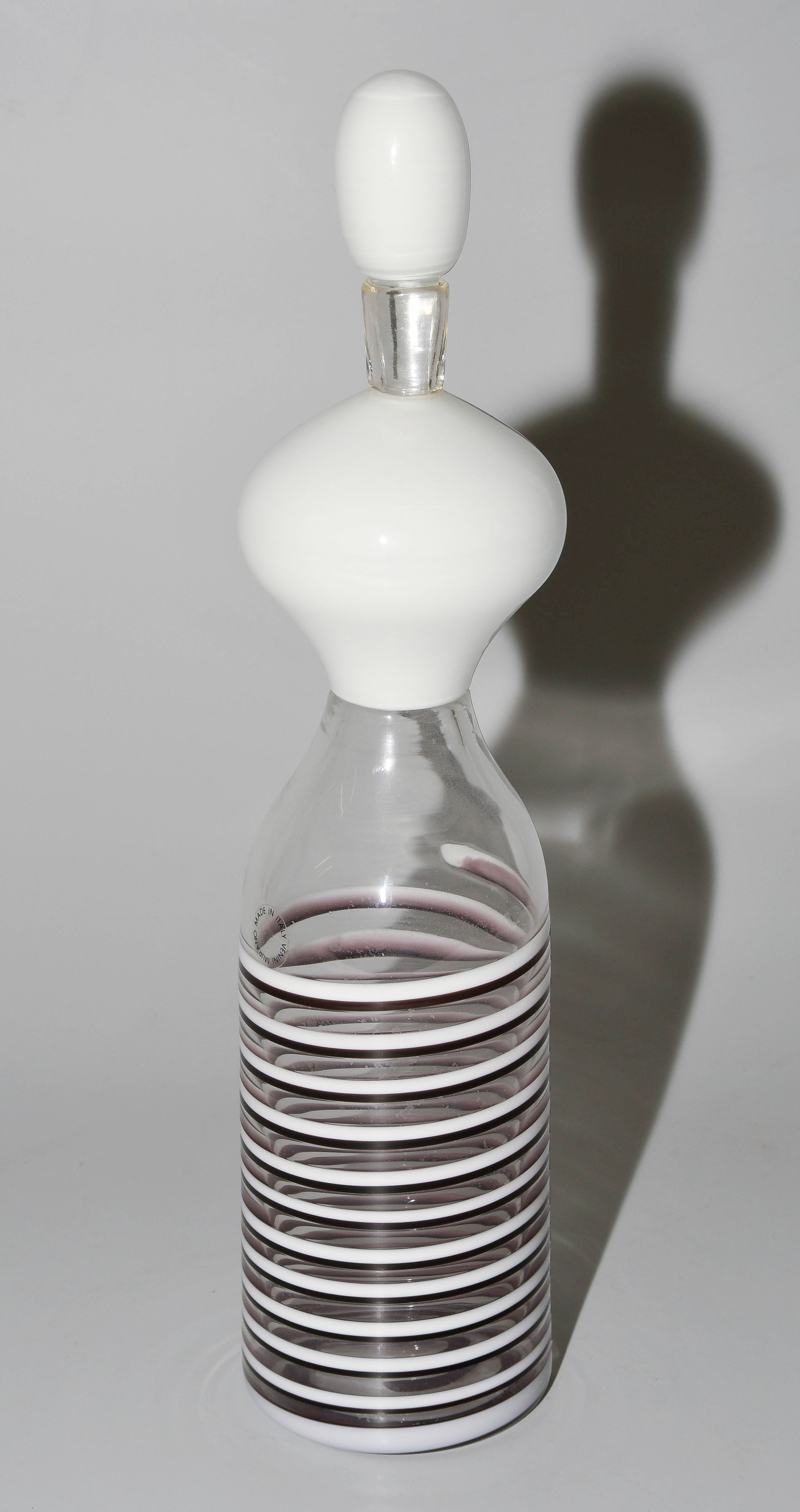 Flasche mit Stöpsel. Ausführung: Venini, Murano, dat. 1992. Farbloses, weisses und purpurfarbenes Glas, "incalmo" und "a canne" gearbeitet. Bezeichnet: venini 92 Gio Ponti. H 34,5 cm.