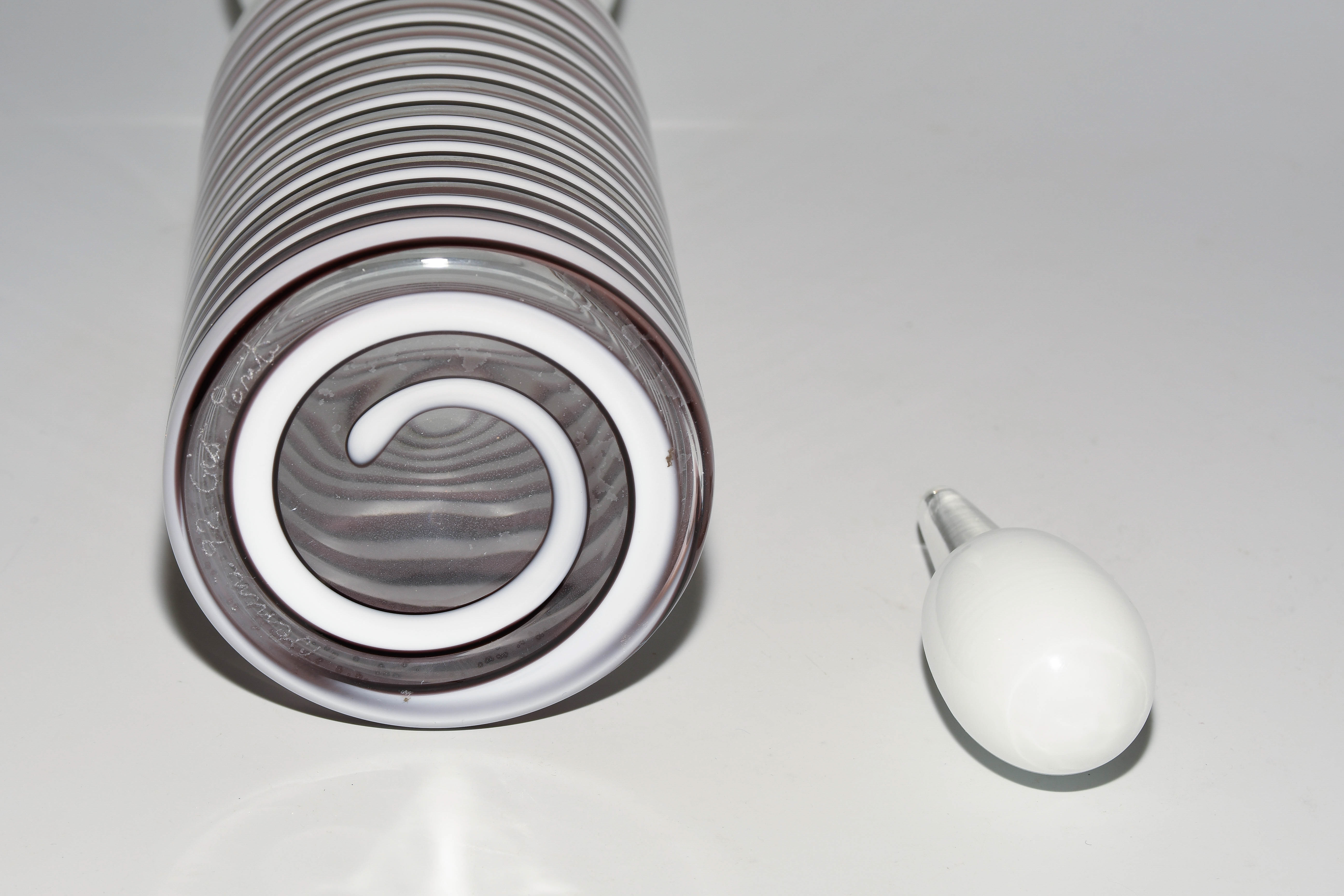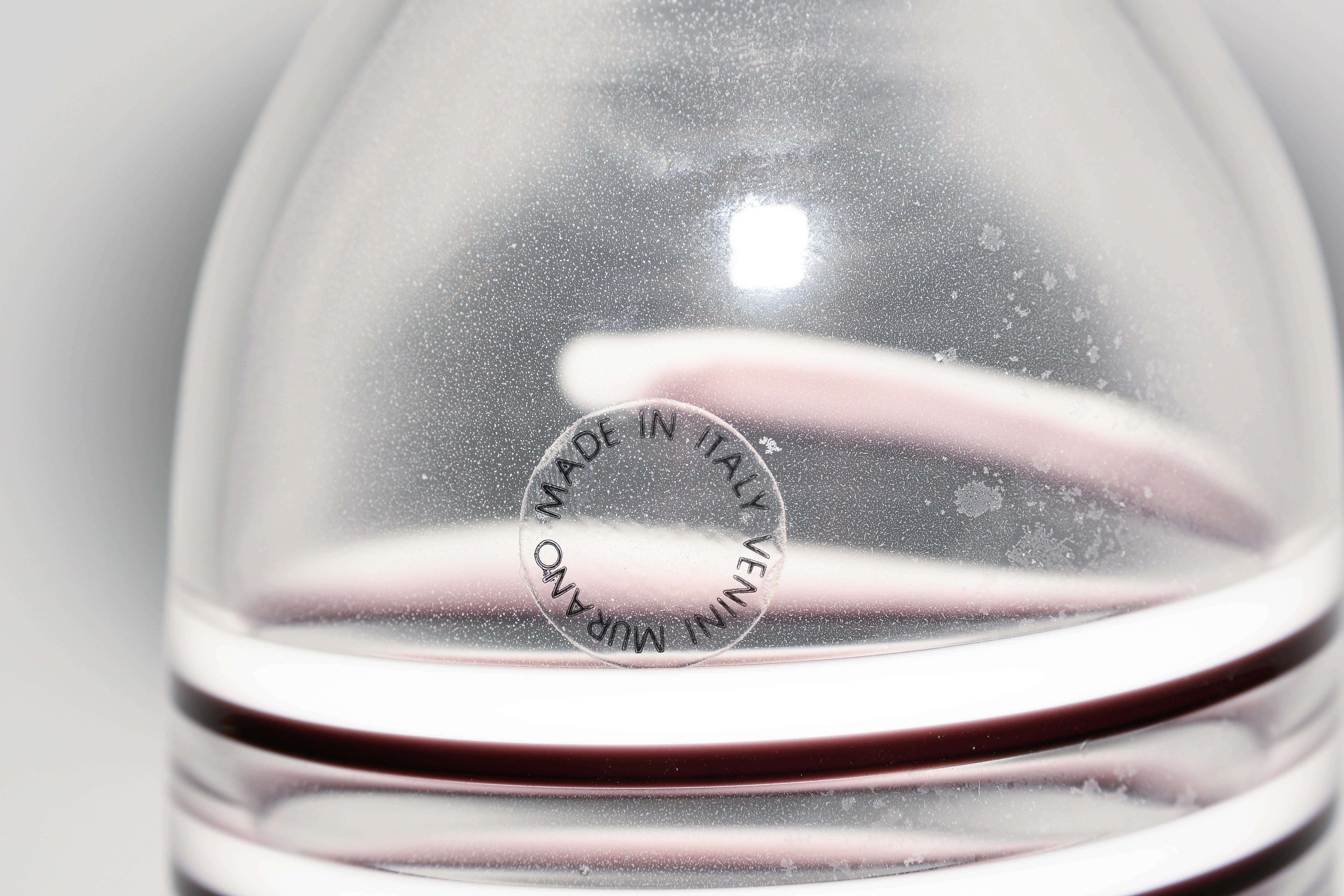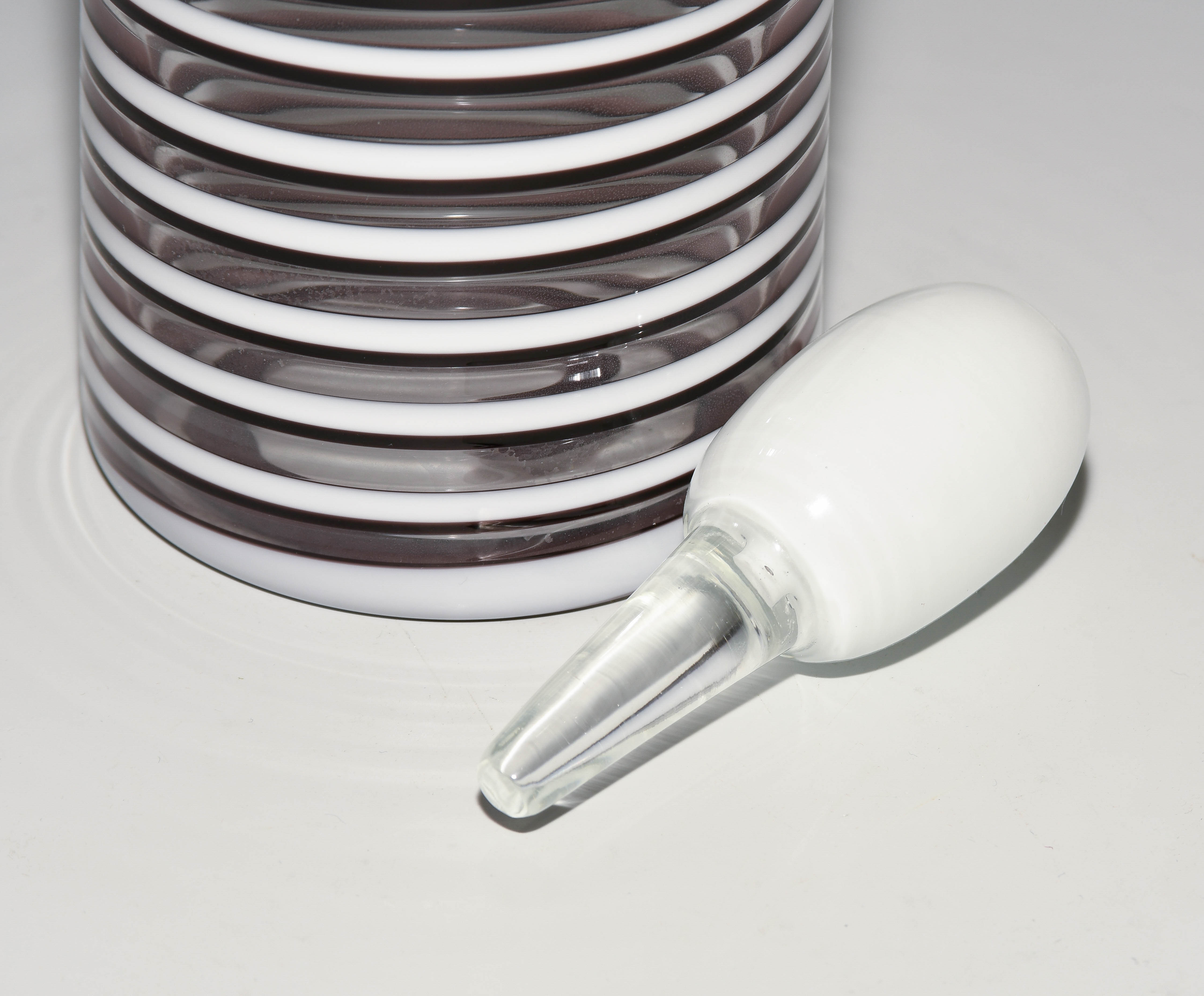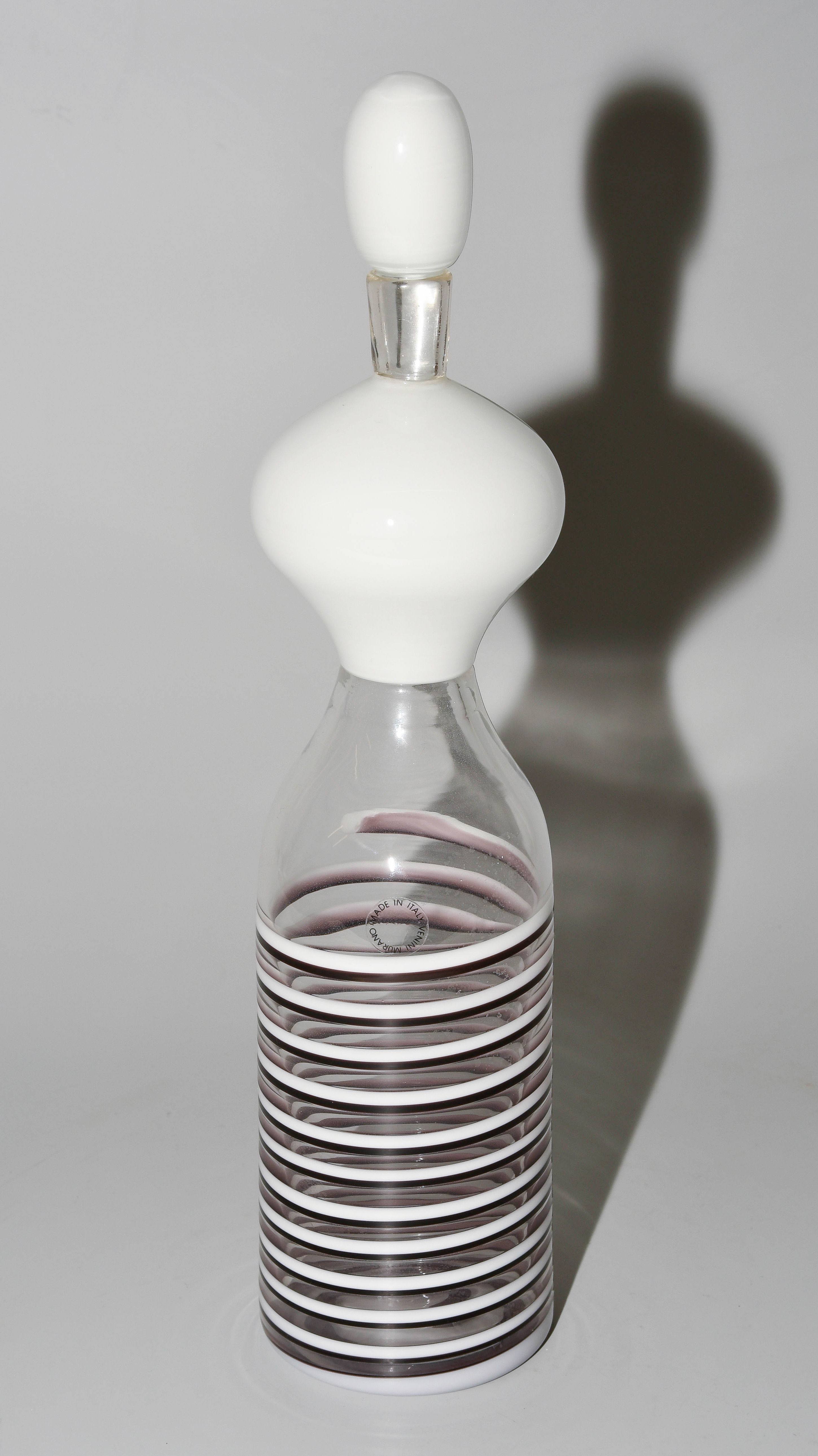 Flasche mit Stöpsel. Ausführung: Venini, Murano, dat. 1992. Farbloses, weisses und purpurfarbenes Glas, "incalmo" und "a canne" gearbeitet. Bezeichnet: venini 92 Gio Ponti. H 34,5 cm.