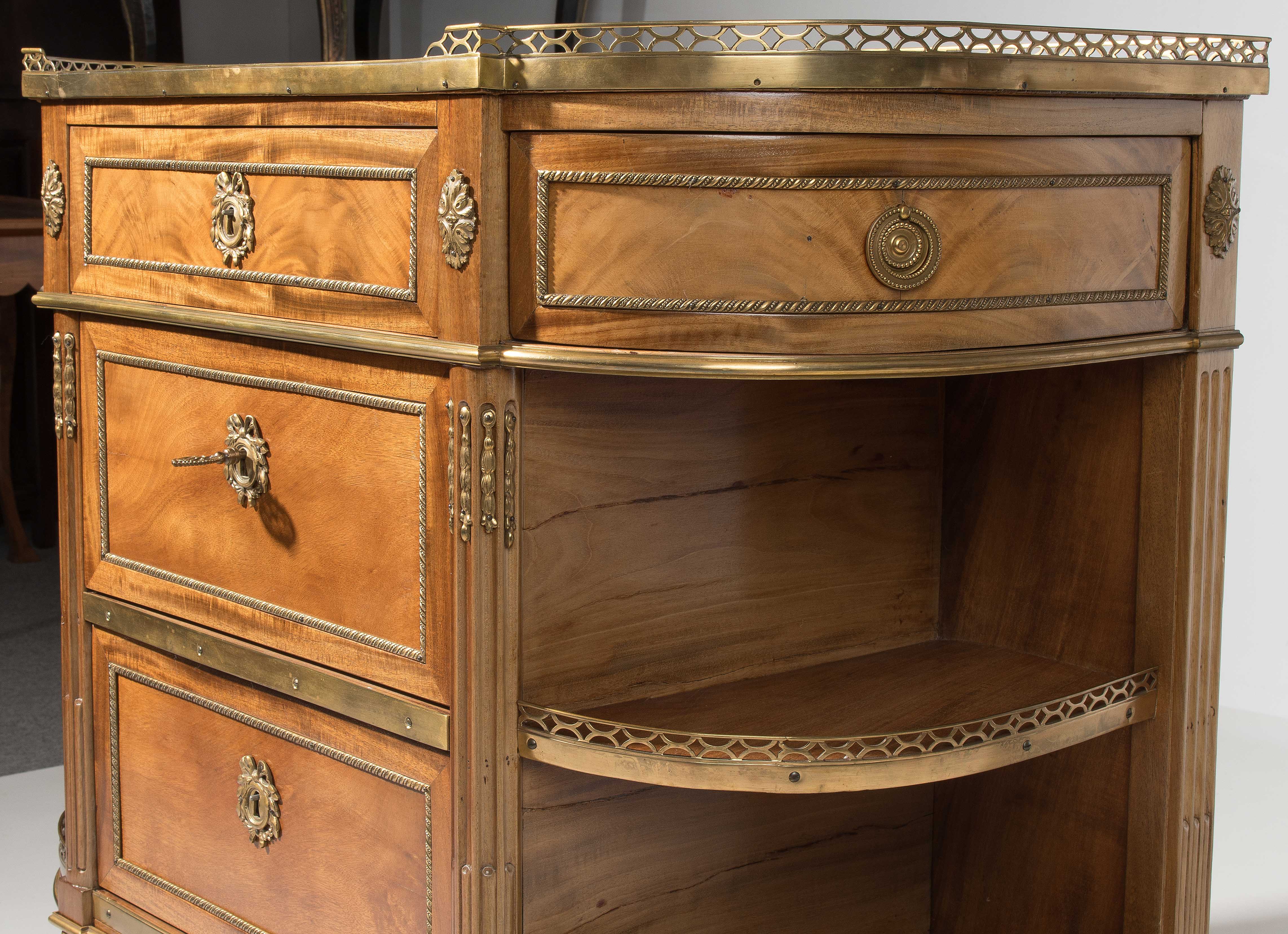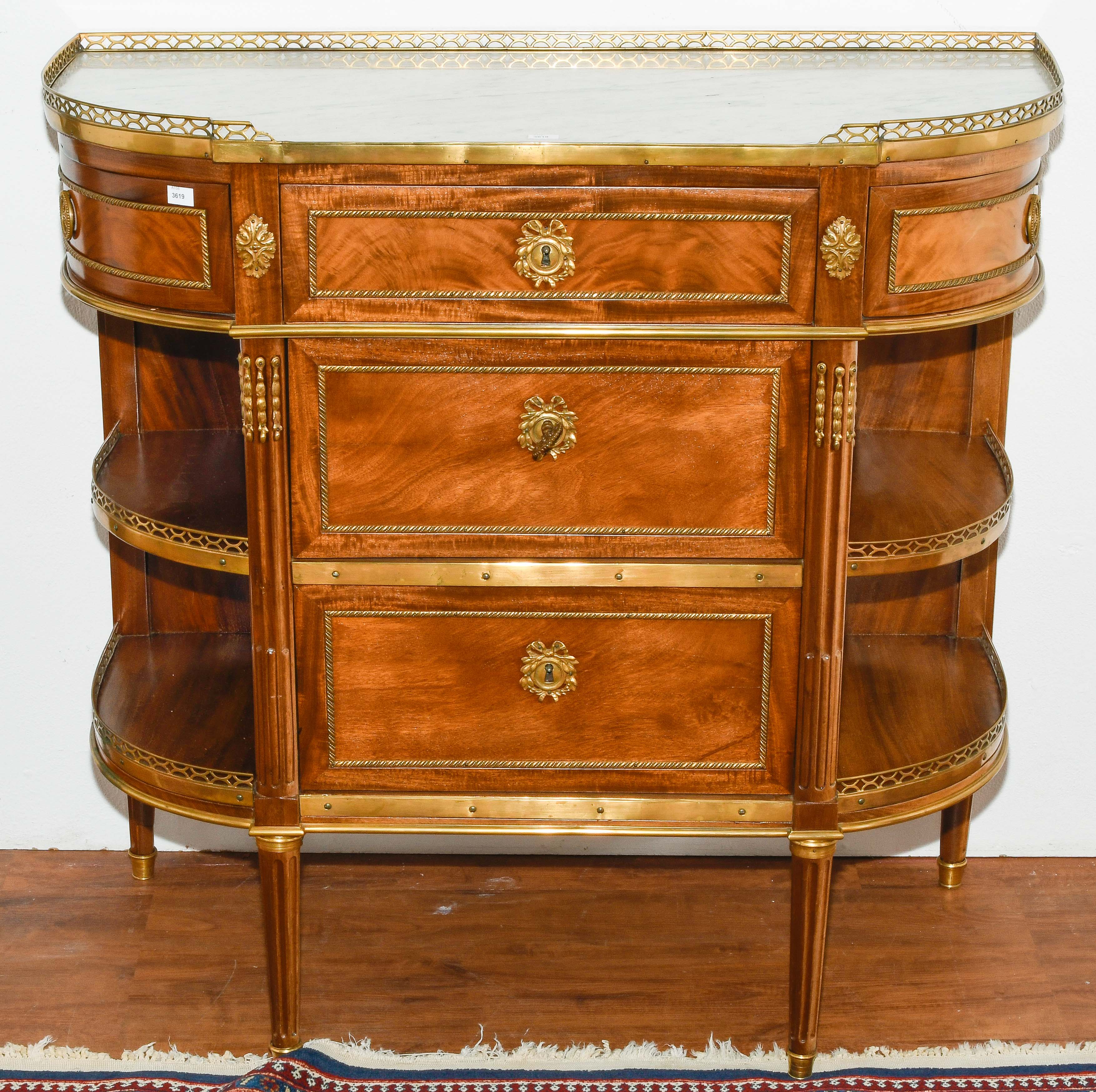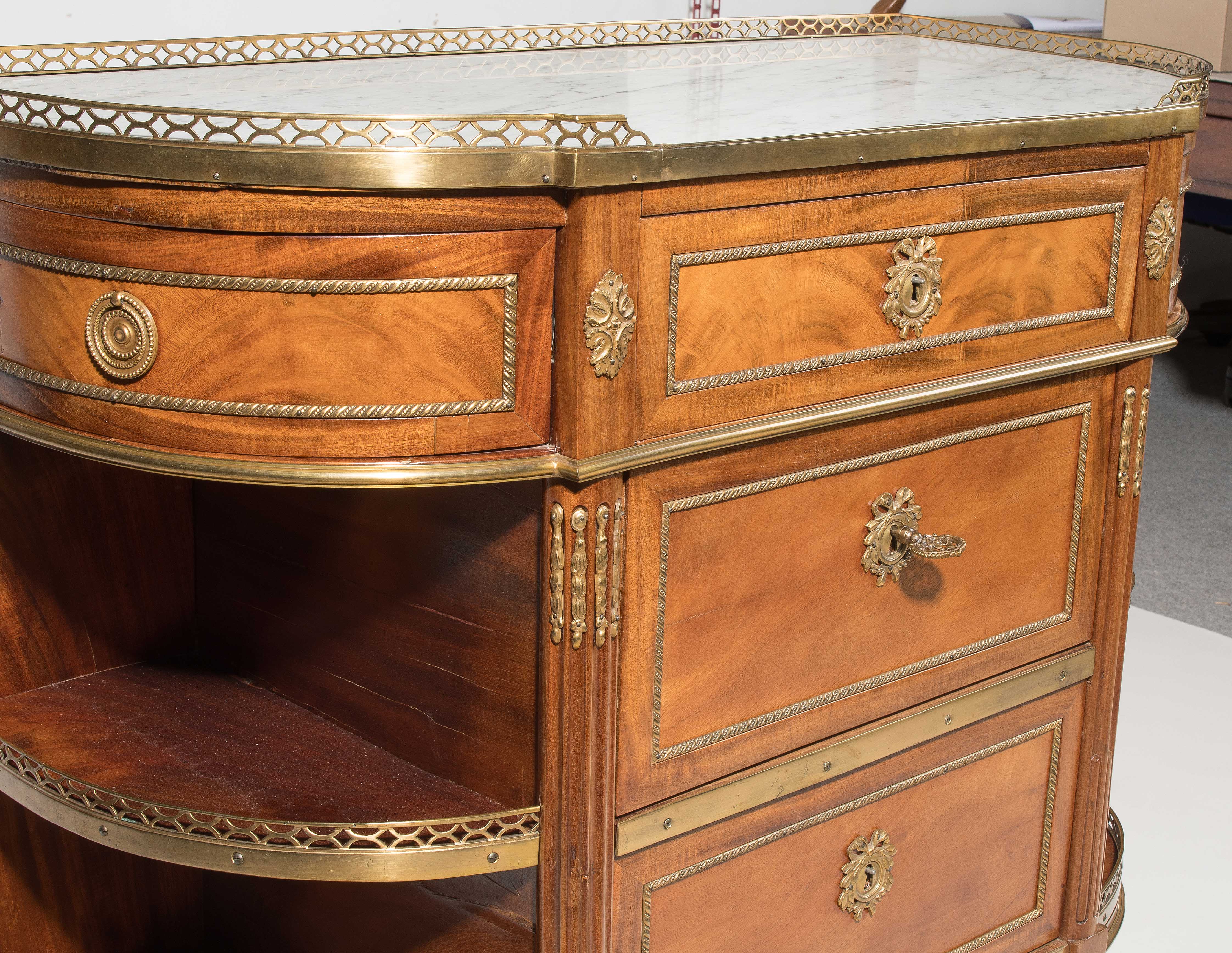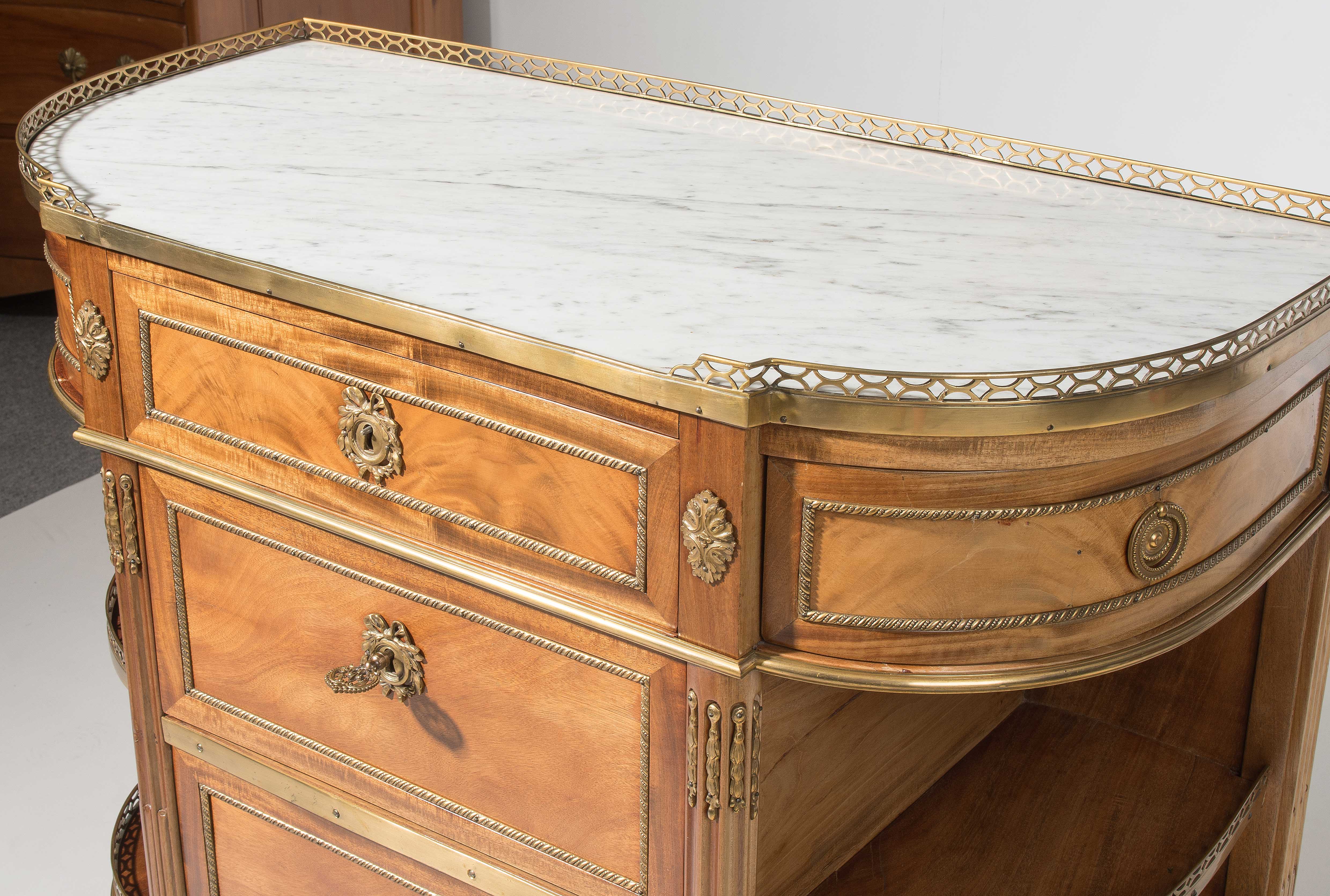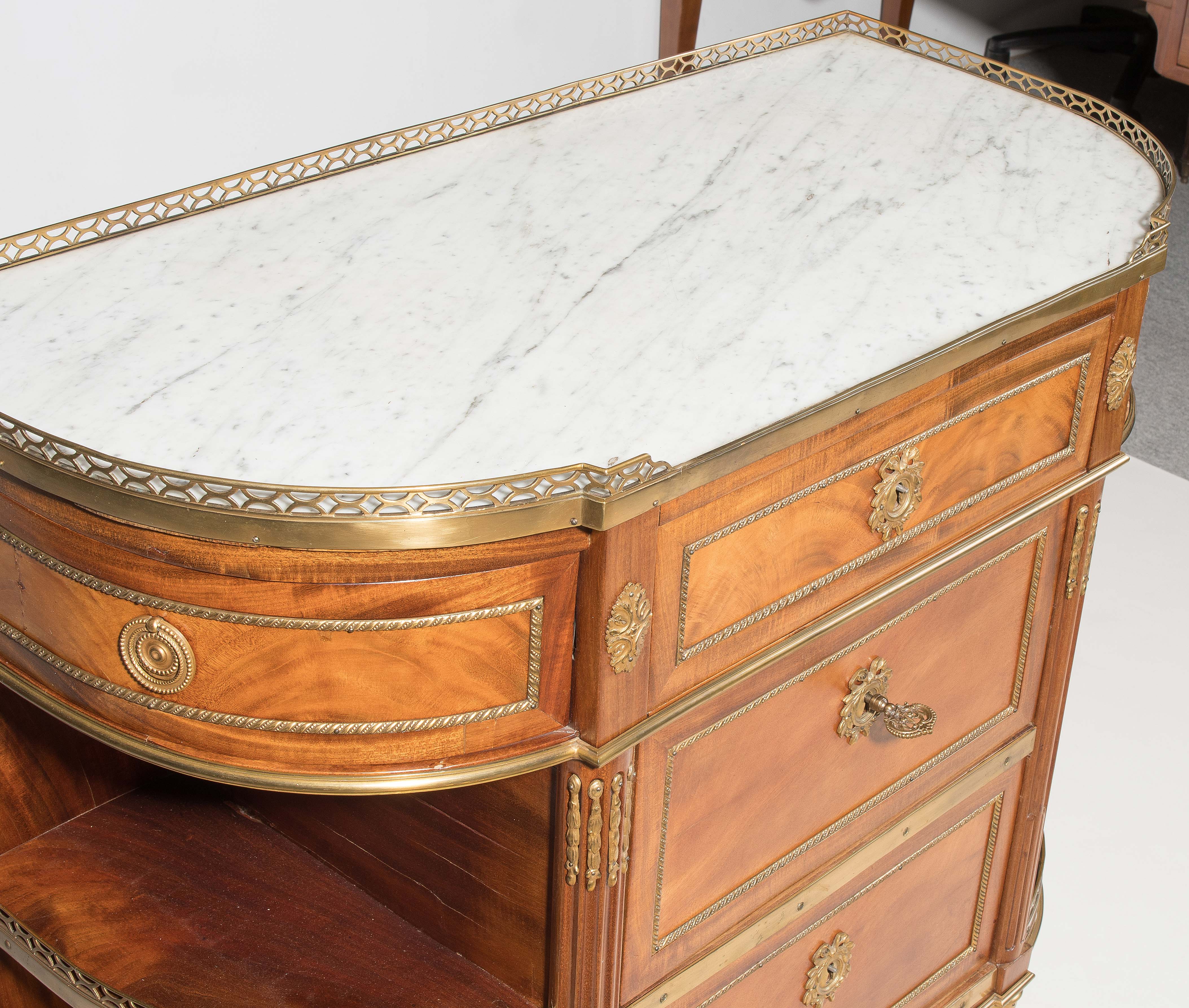 Louis XVI-Stil, 19.Jh. Frankreich. Mahagoni, Marmor. Dreischübiger Kommodenteil mit seitlichen halbrunden Tablaren und Fächern. Die Fächer lassen sich auf Knopfdruck am Boden öffnen. Front mit feinen Bronze-Zierbändern belegt. Marmor: Weiss-Grau gemustert. Guter Zustand. 93x44x91 cm.