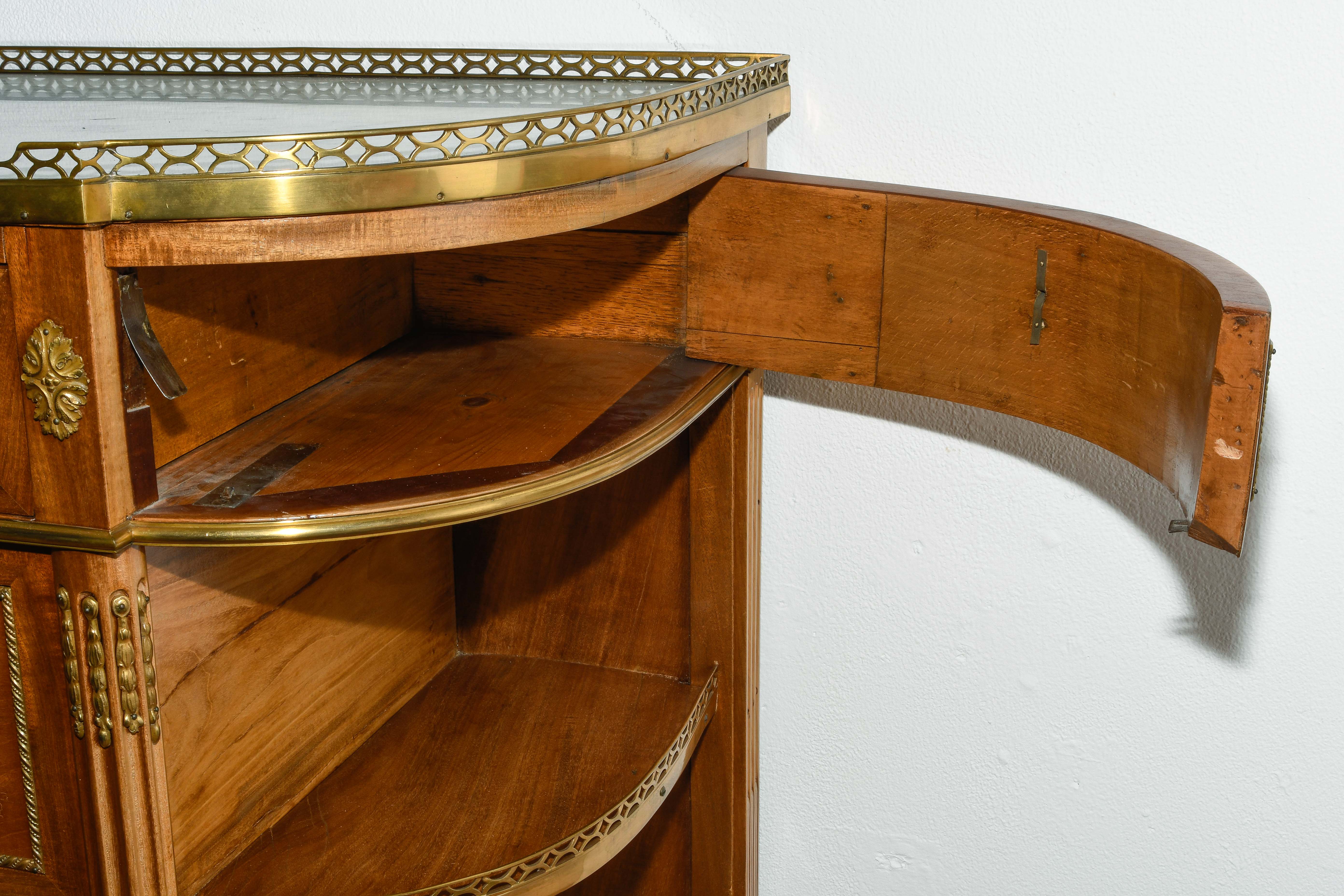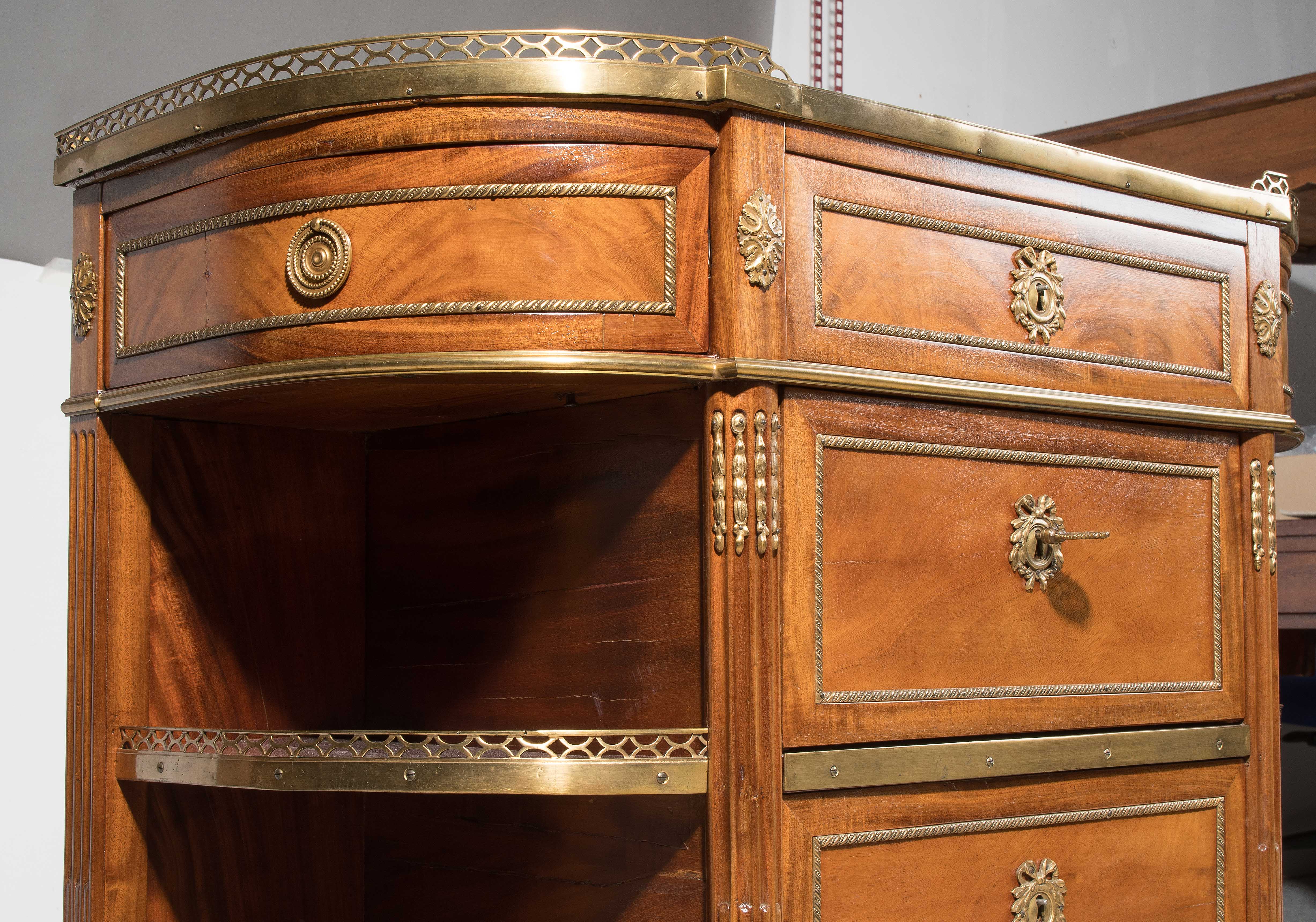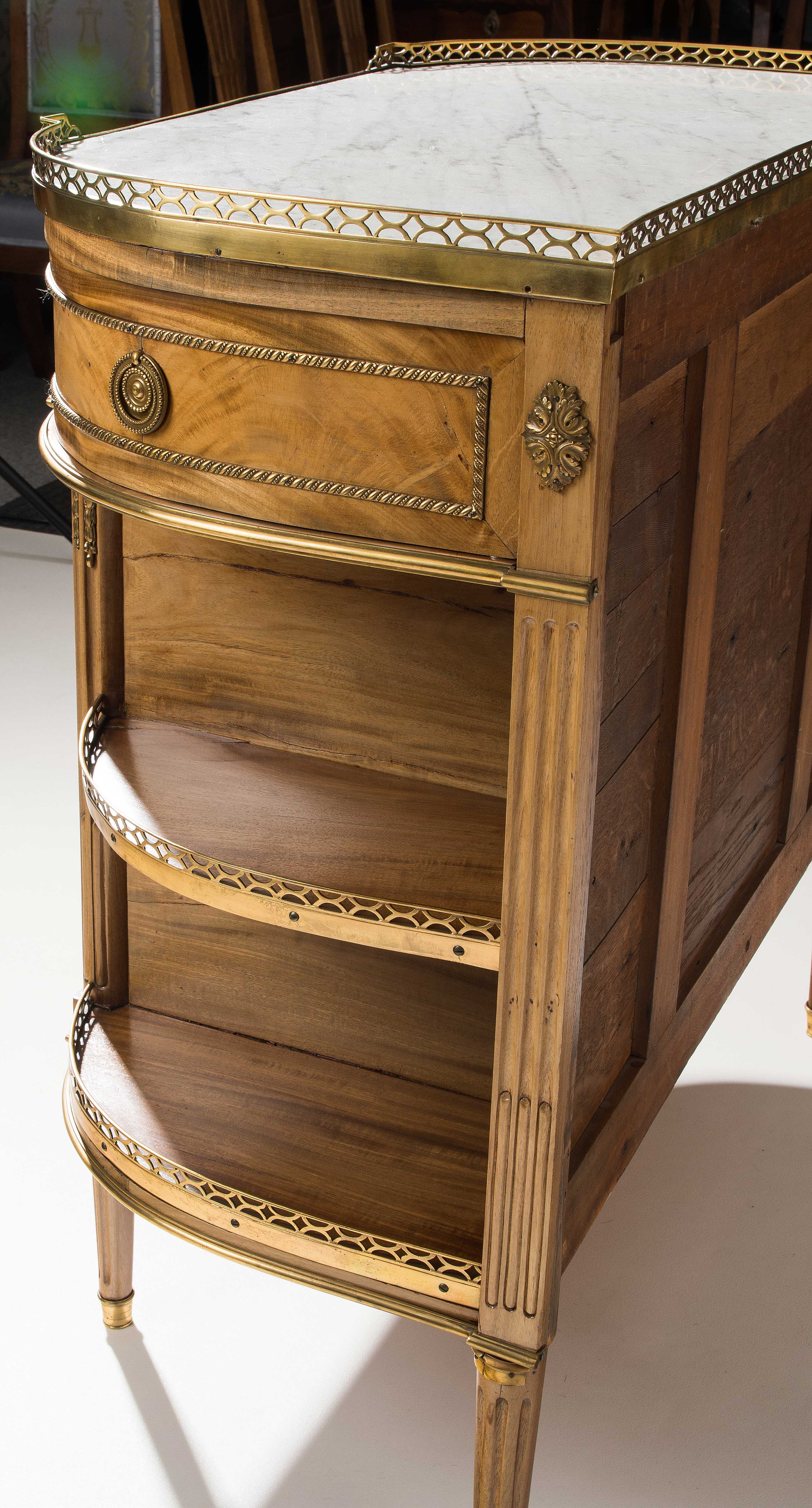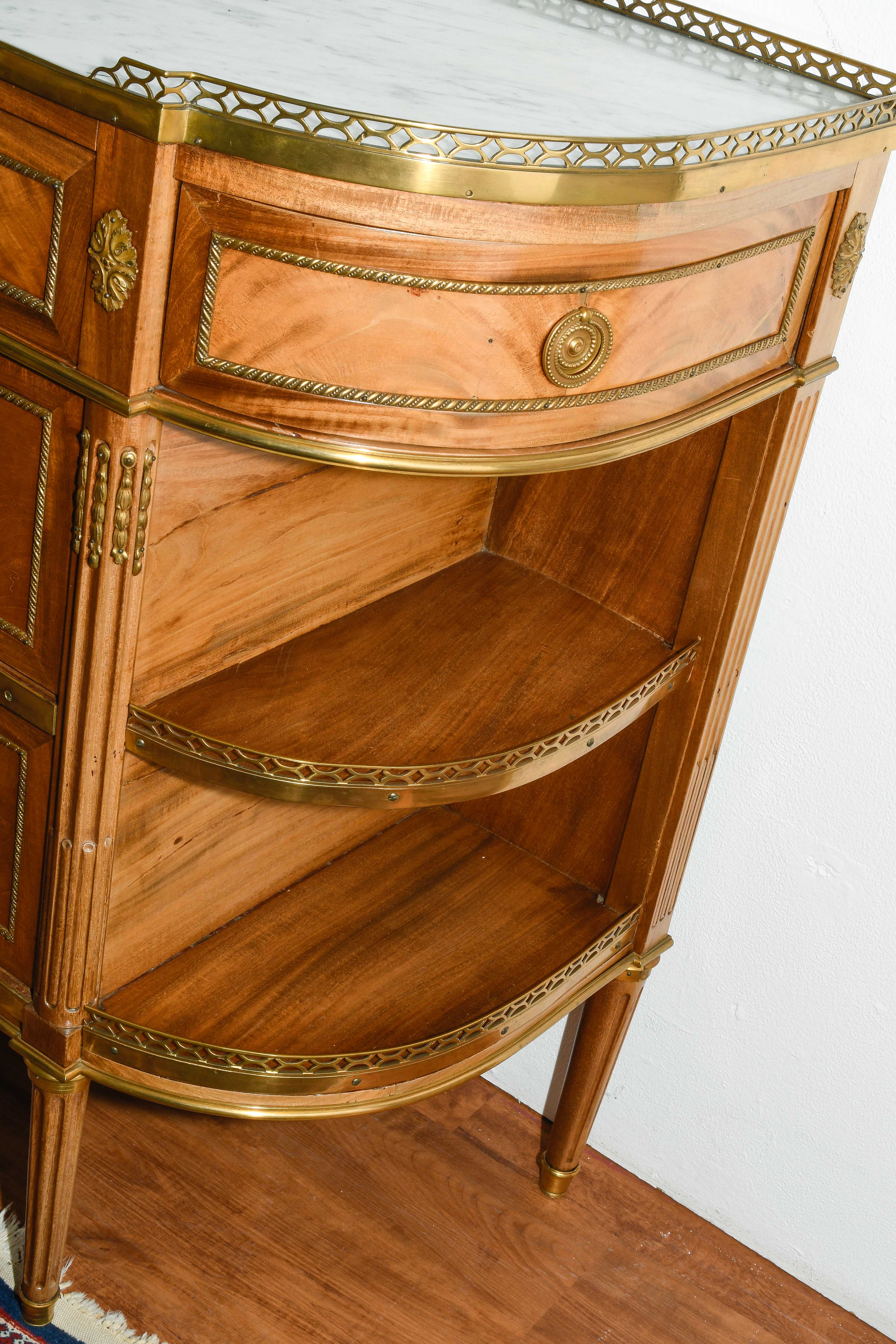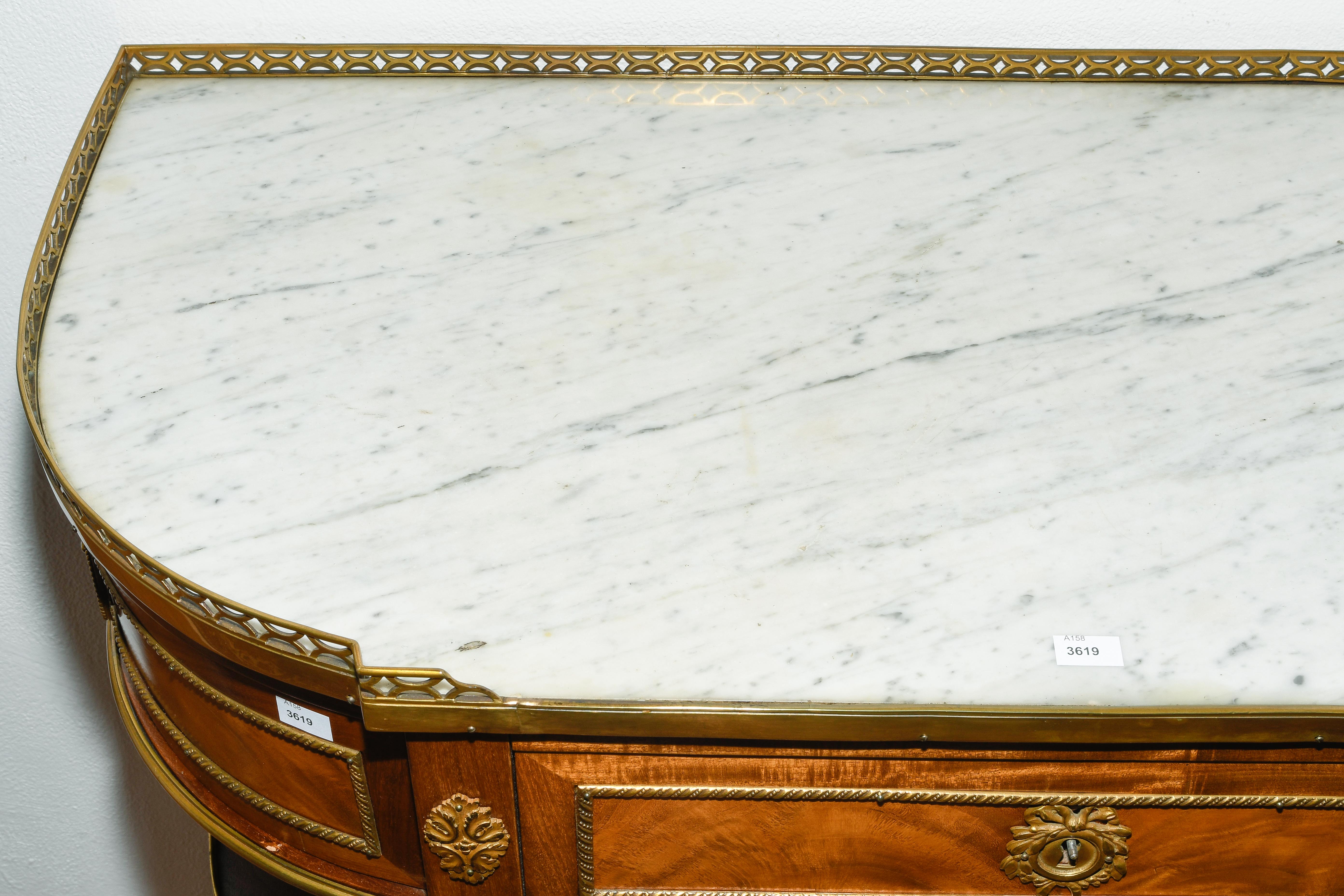 Louis XVI-Stil, 19.Jh. Frankreich. Mahagoni, Marmor. Dreischübiger Kommodenteil mit seitlichen halbrunden Tablaren und Fächern. Die Fächer lassen sich auf Knopfdruck am Boden öffnen. Front mit feinen Bronze-Zierbändern belegt. Marmor: Weiss-Grau gemustert. Guter Zustand. 93x44x91 cm.