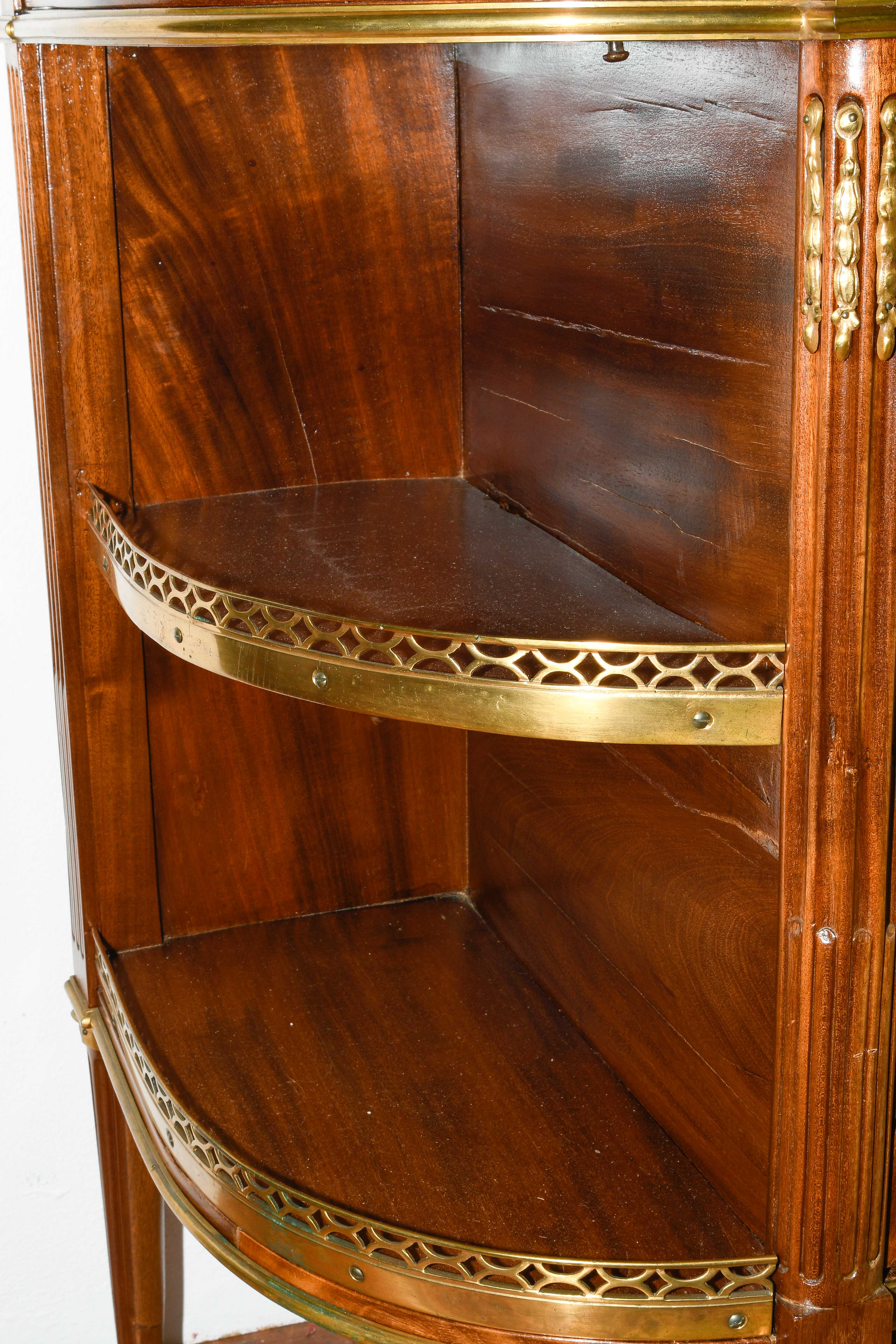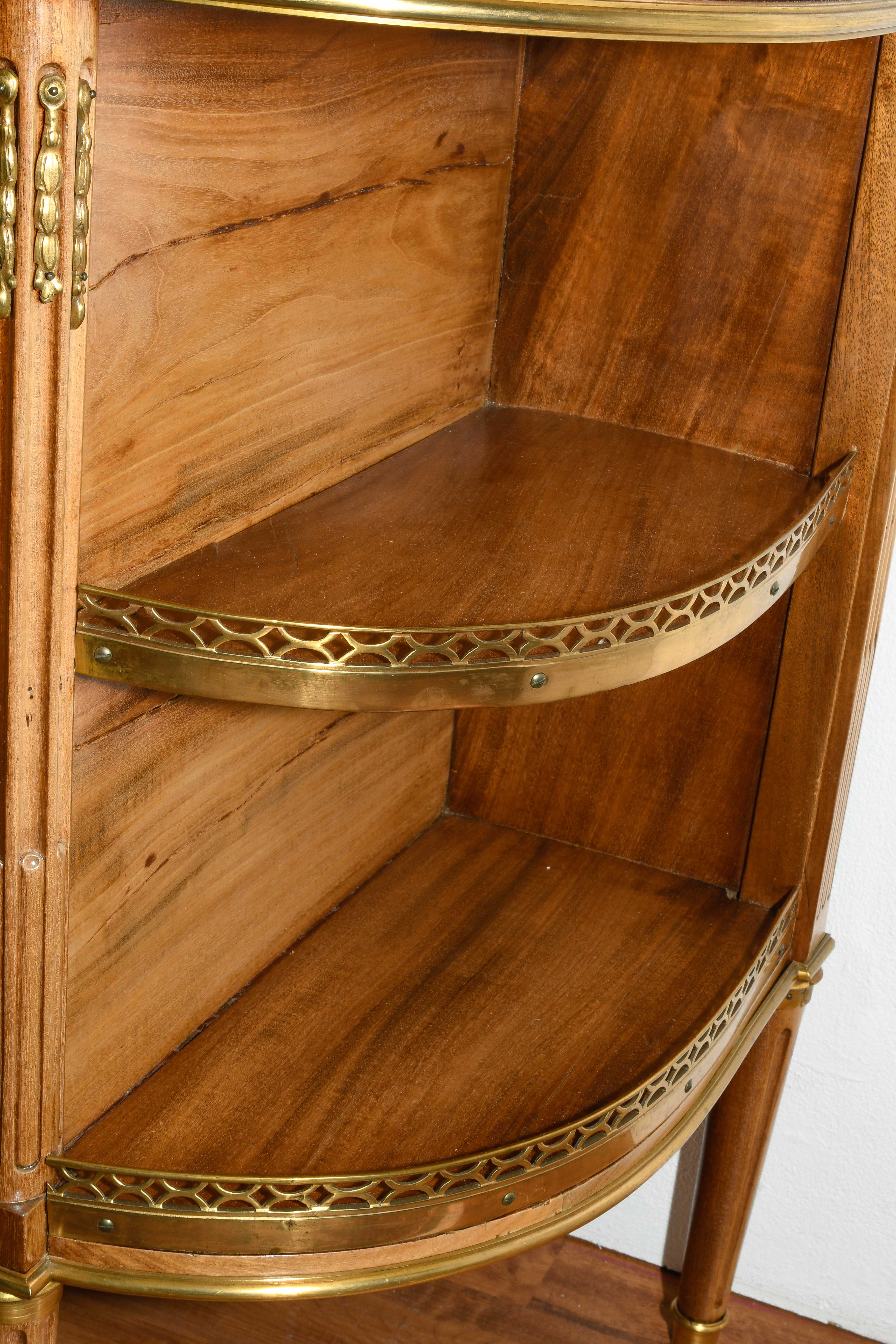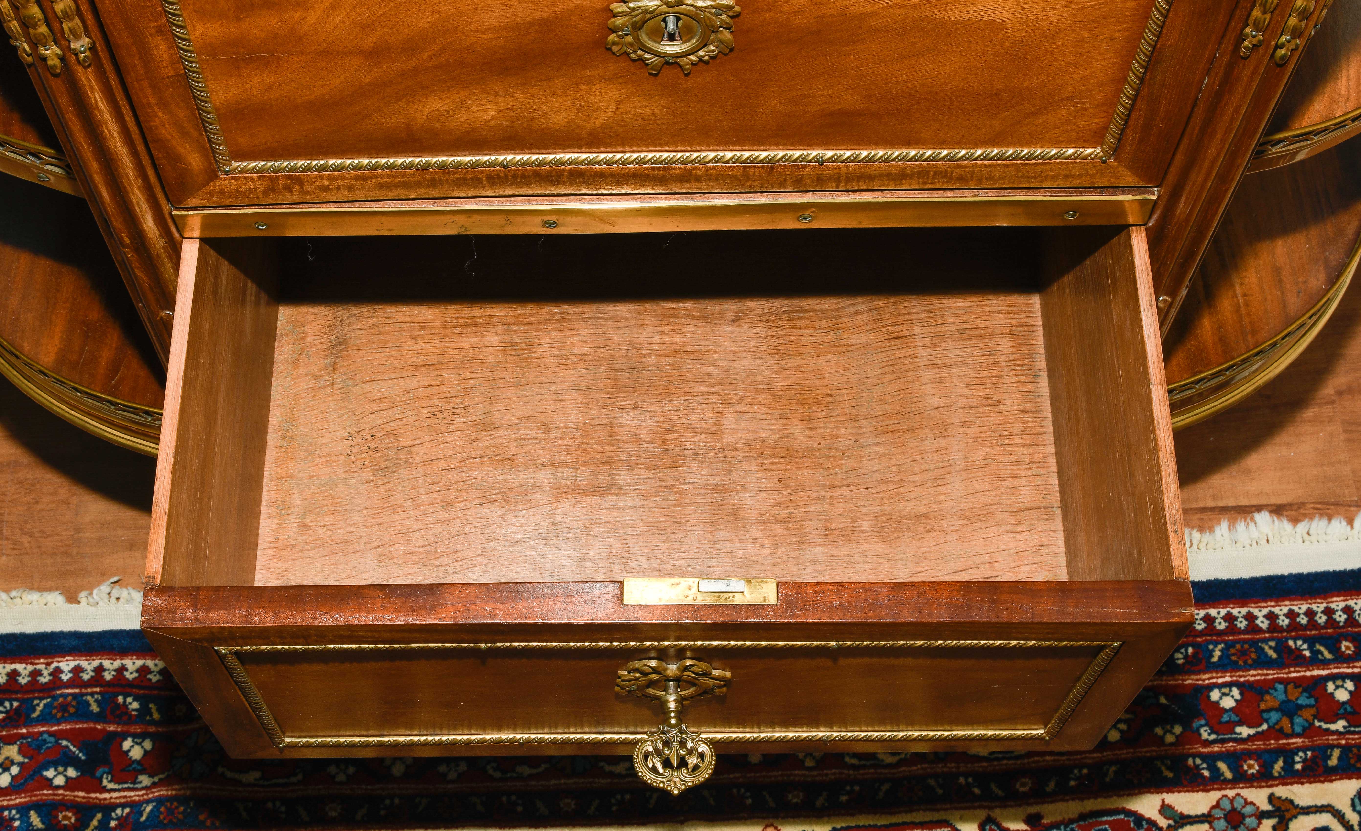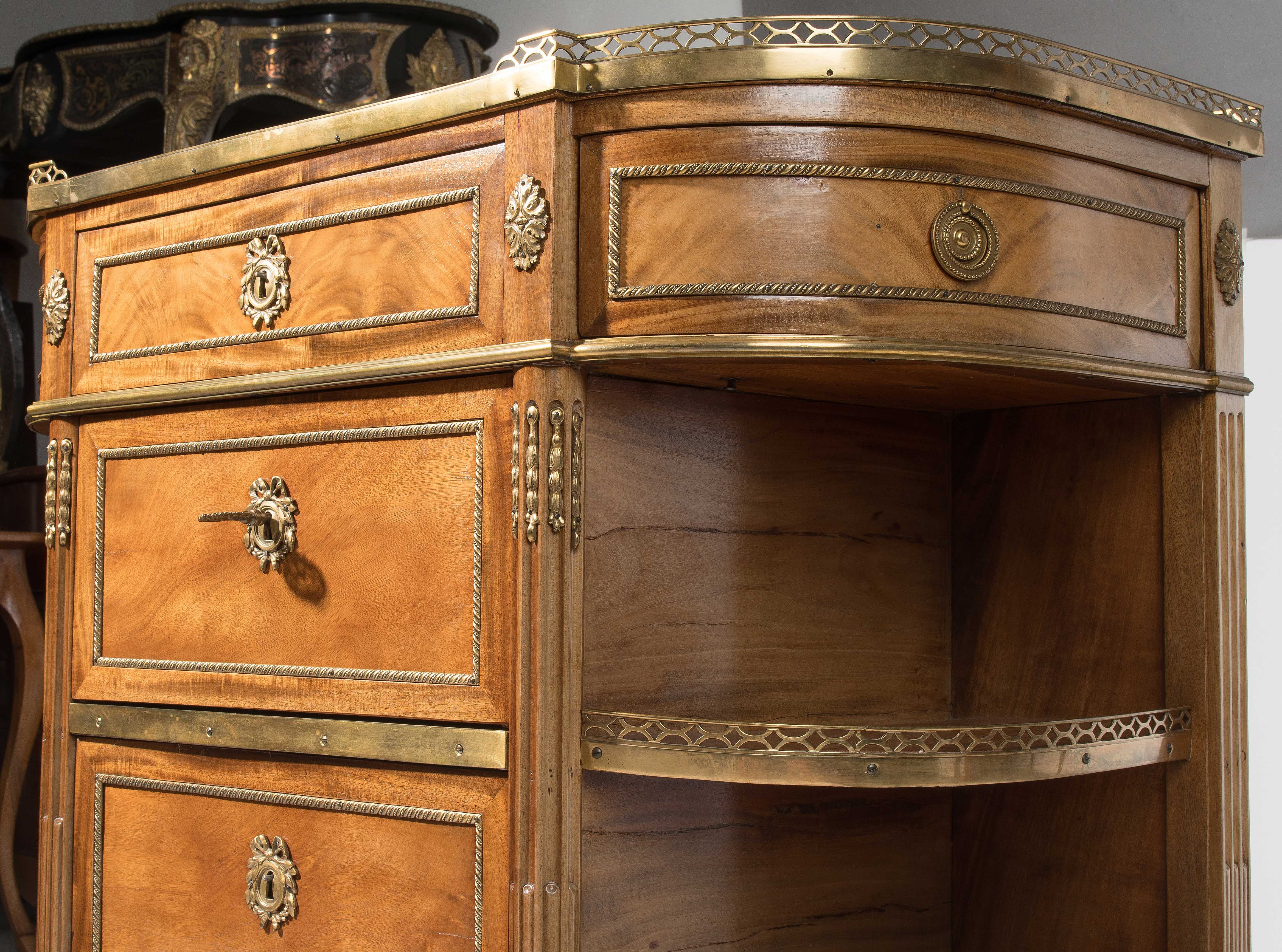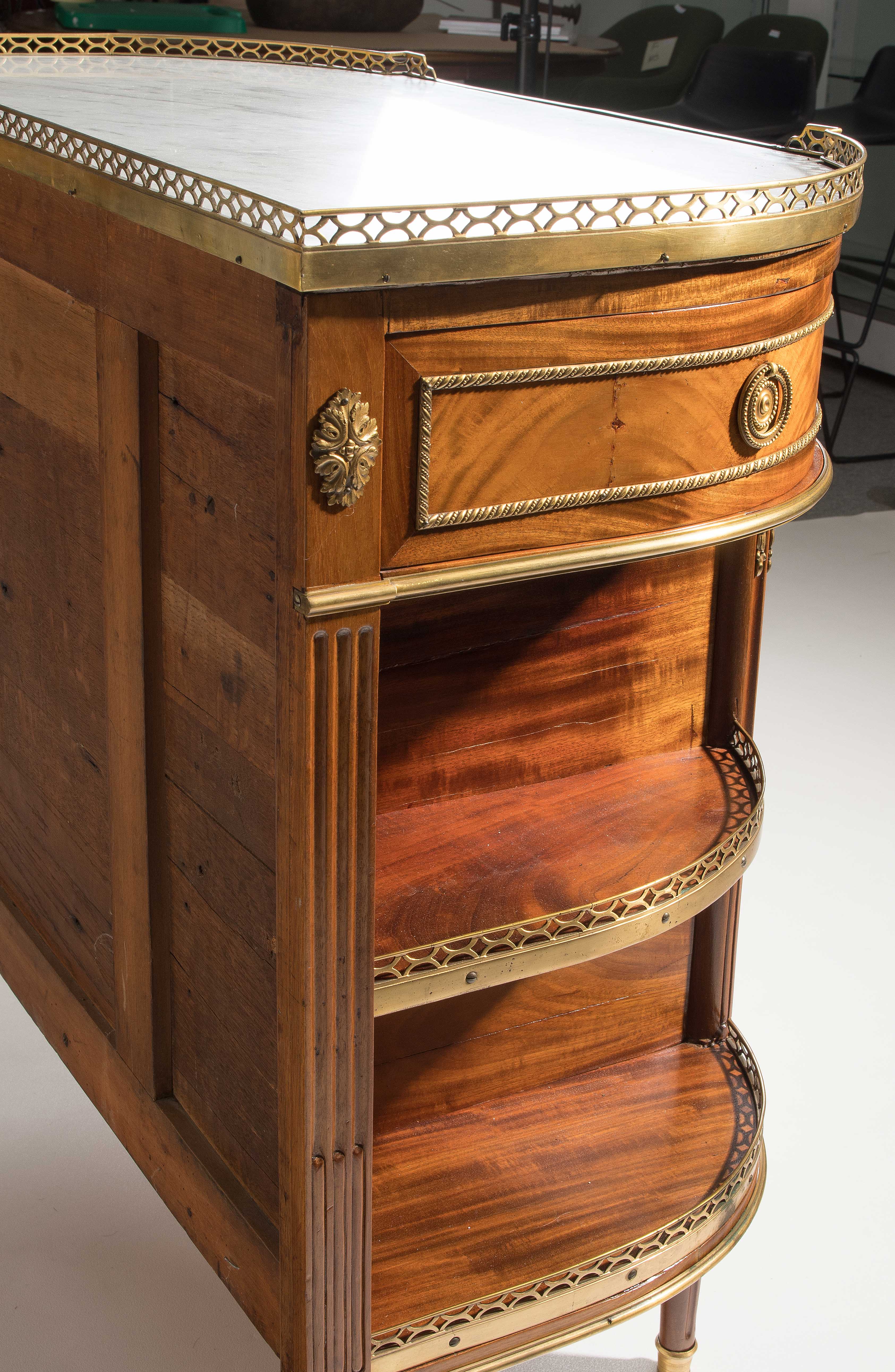 Louis XVI-Stil, 19.Jh. Frankreich. Mahagoni, Marmor. Dreischübiger Kommodenteil mit seitlichen halbrunden Tablaren und Fächern. Die Fächer lassen sich auf Knopfdruck am Boden öffnen. Front mit feinen Bronze-Zierbändern belegt. Marmor: Weiss-Grau gemustert. Guter Zustand. 93x44x91 cm.