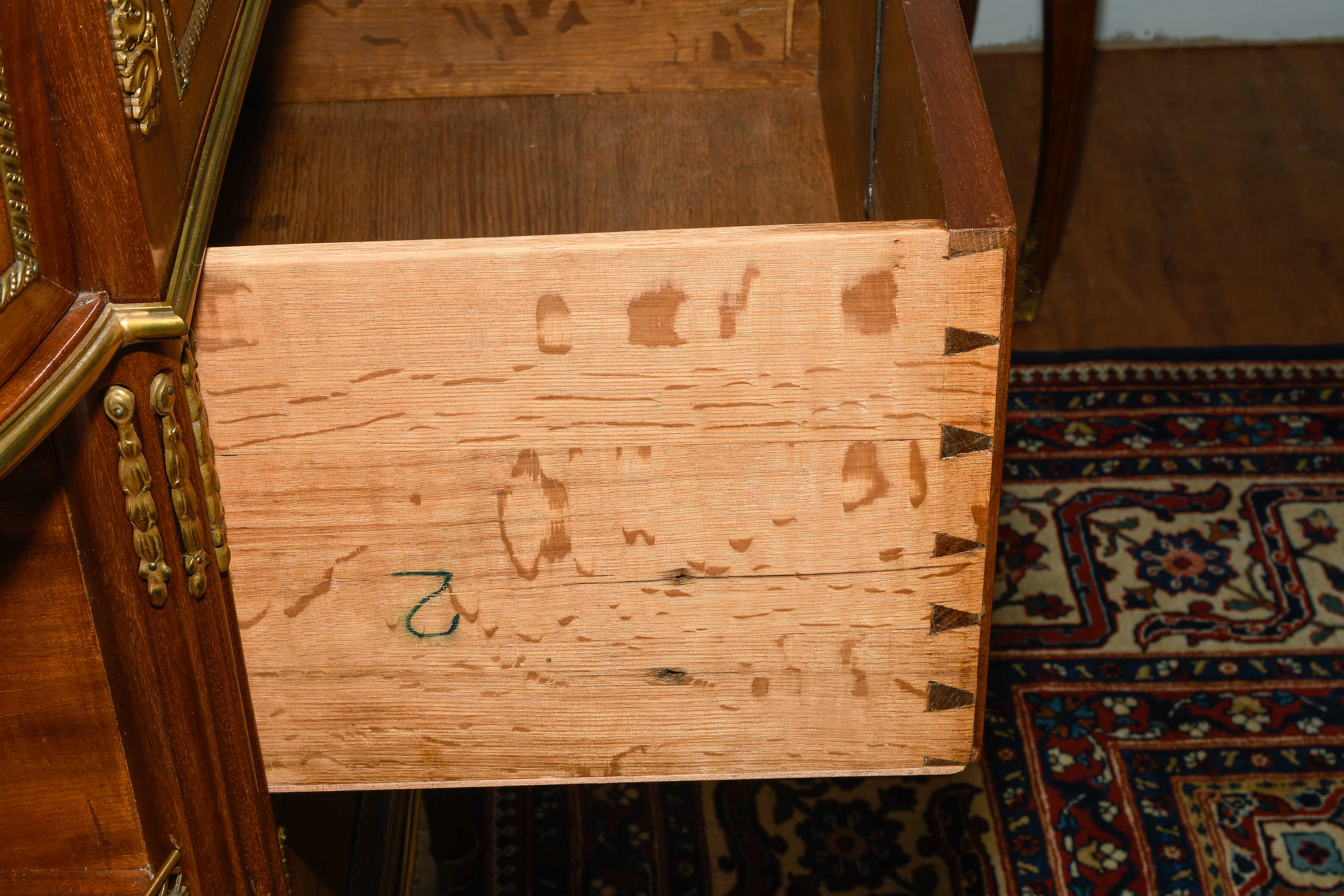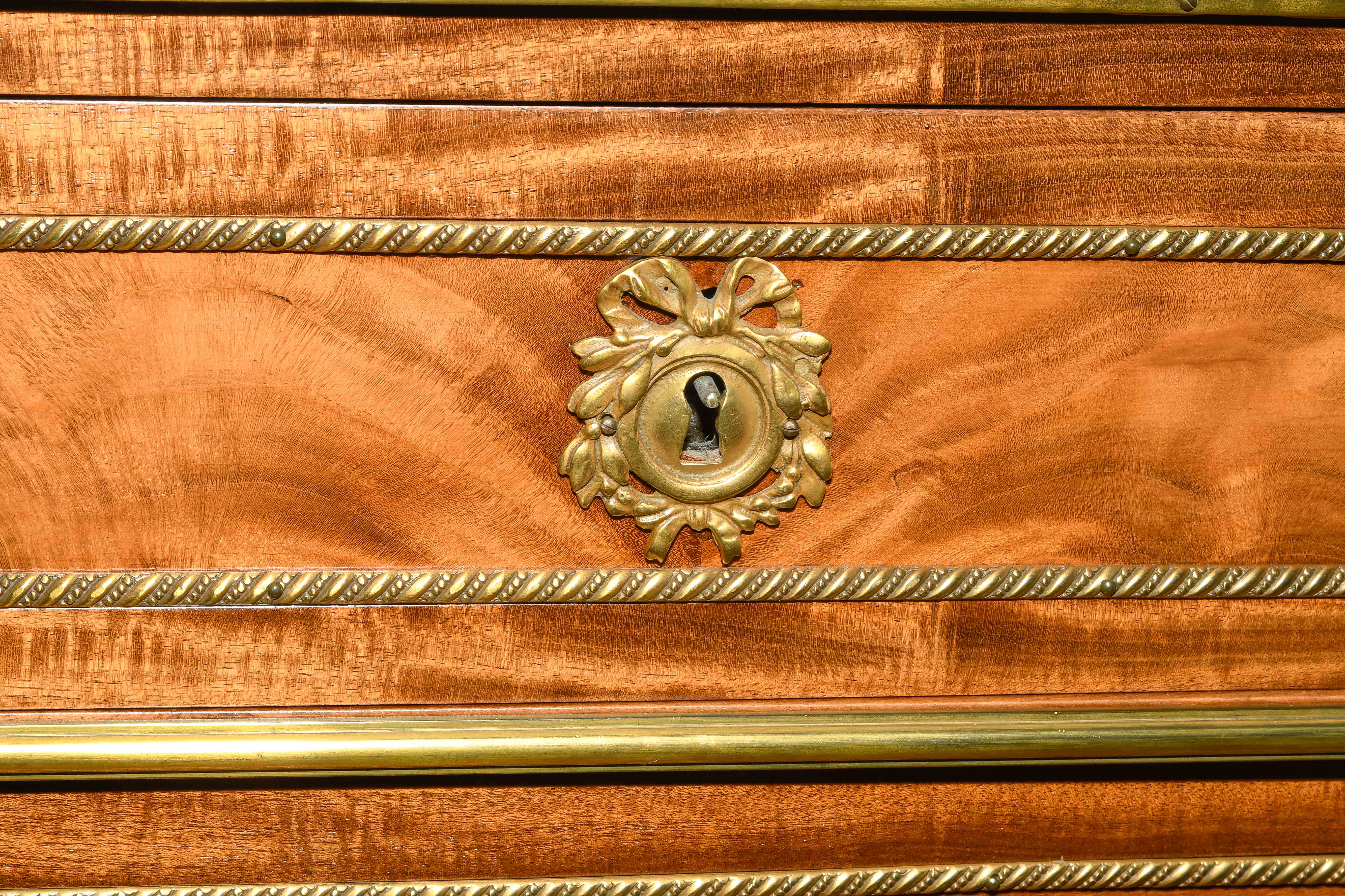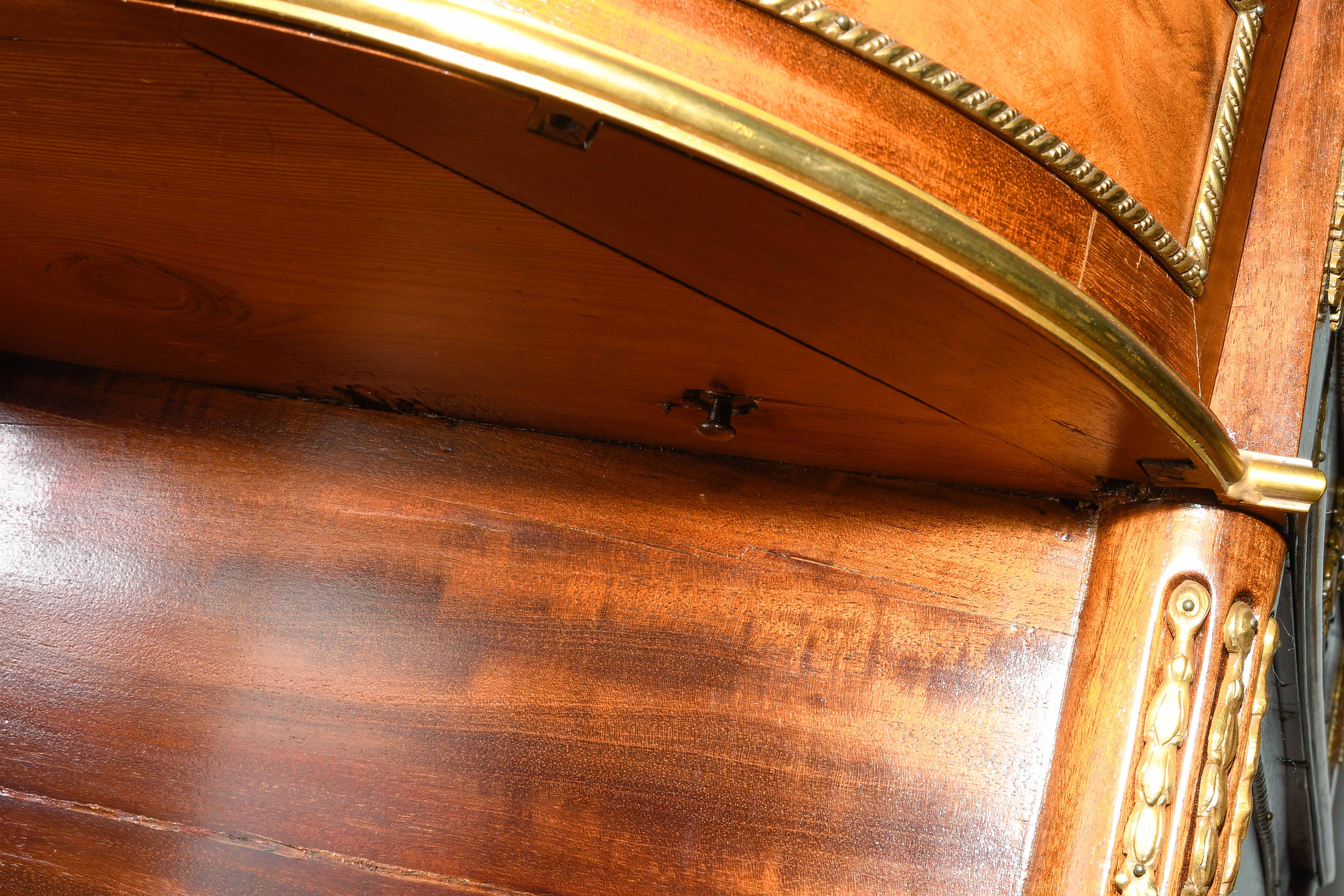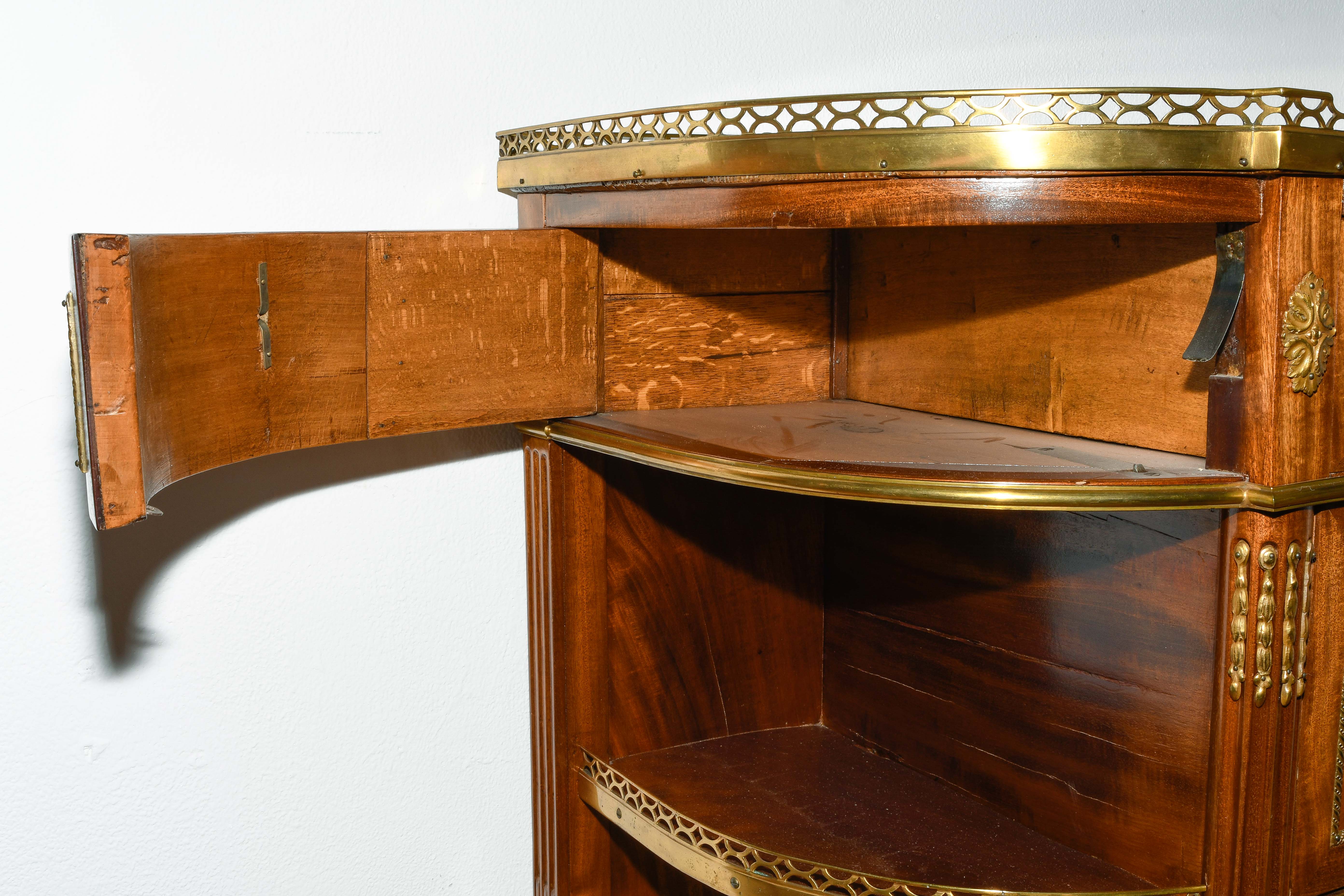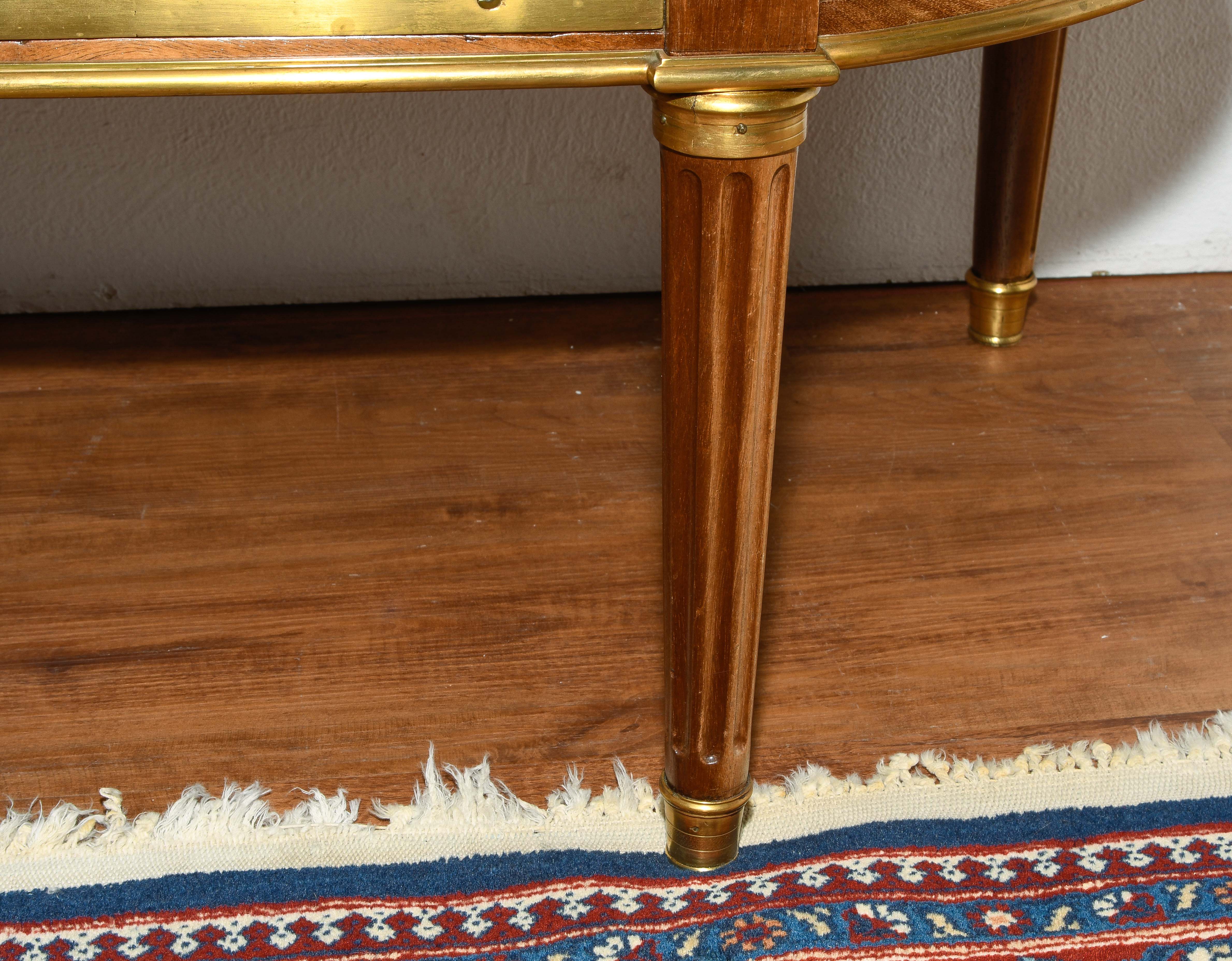 Louis XVI-Stil, 19.Jh. Frankreich. Mahagoni, Marmor. Dreischübiger Kommodenteil mit seitlichen halbrunden Tablaren und Fächern. Die Fächer lassen sich auf Knopfdruck am Boden öffnen. Front mit feinen Bronze-Zierbändern belegt. Marmor: Weiss-Grau gemustert. Guter Zustand. 93x44x91 cm.