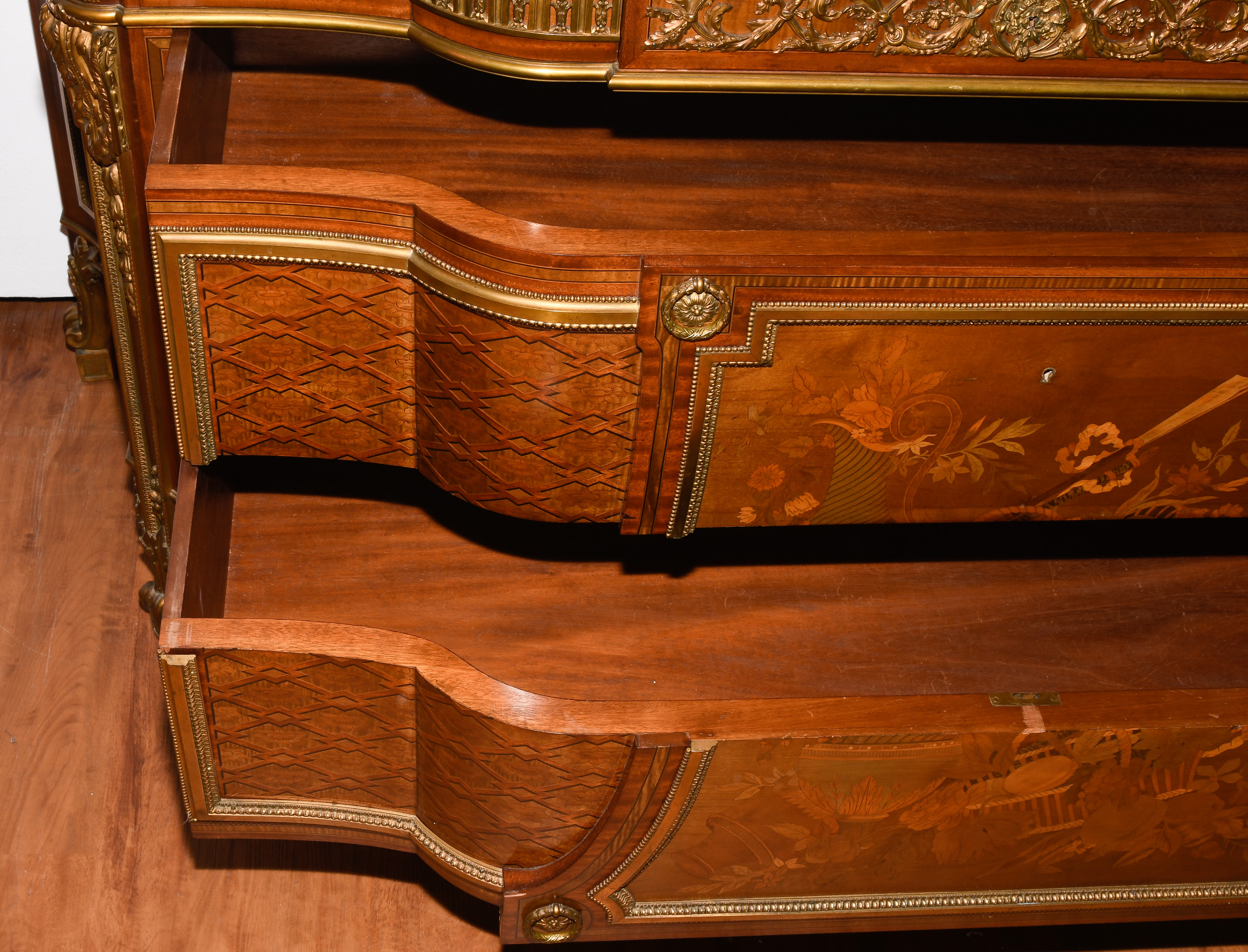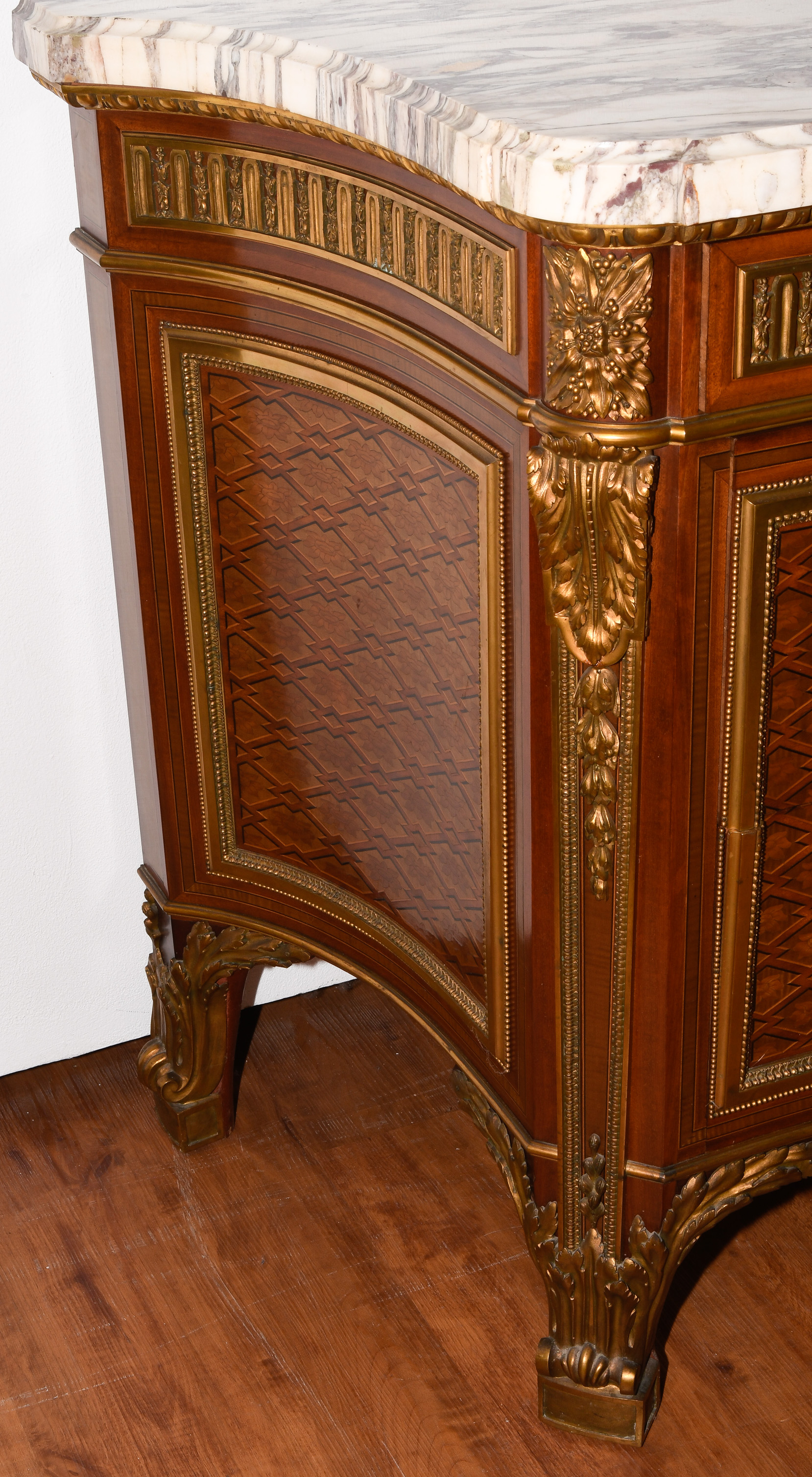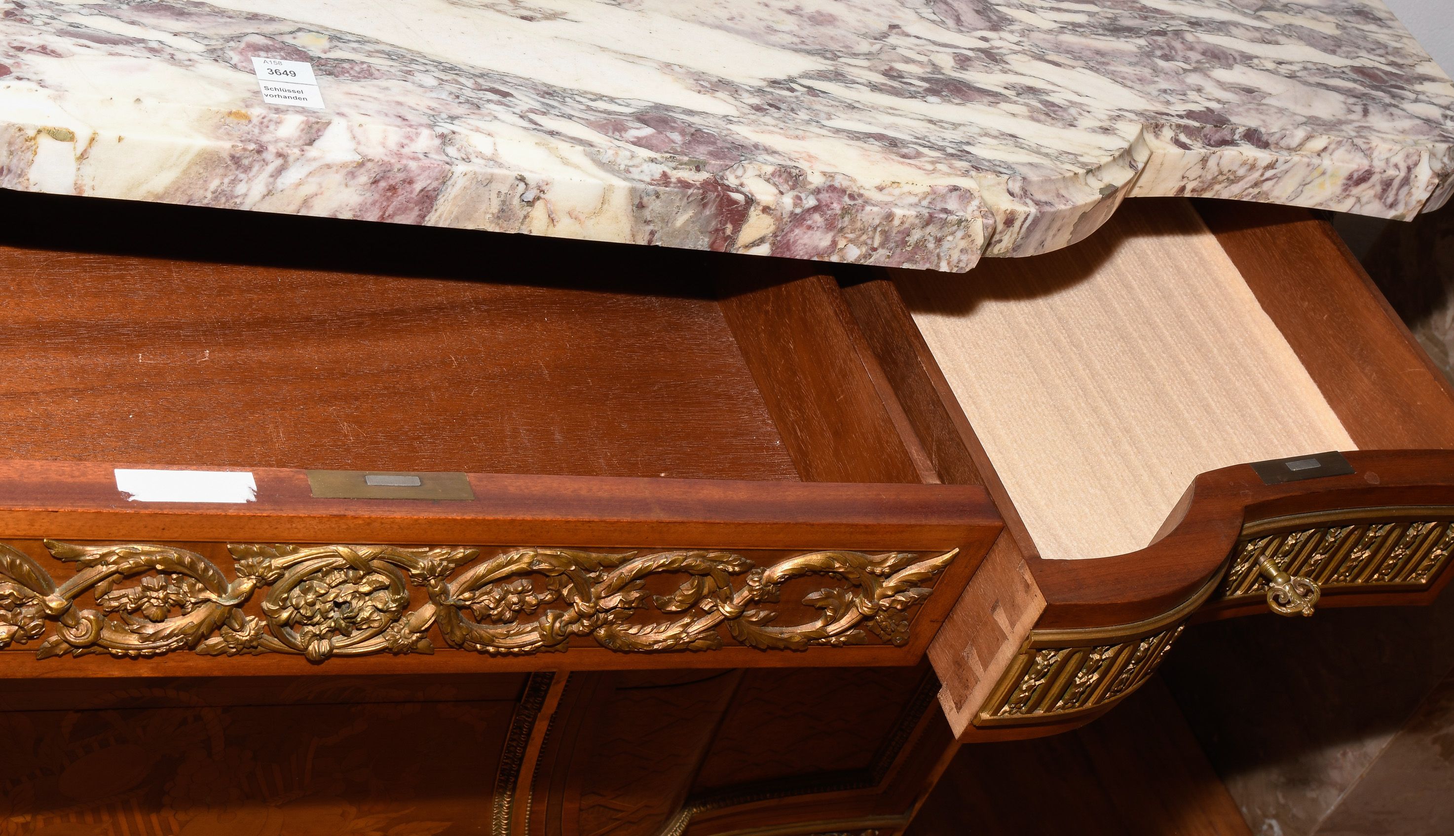 Louis XVI-Stil 20. Jh. Ahorn, Mahagoni, Ebenholz und Marmor. Fünfschübiger Korpus mit geschweiften Seitenteilen und gebauchter Frontpartie. Dreiseitig gefeldert furniert mit geometrischen Rauten und Blumendekor gearbeitet. Front, Intarsiensbild mit Früchtekorb, Vasen und Blumenmotiven versehen. Reicher Bronzebeschlag vergoldet. Marmor: Beige-Rotbraun gemustert. Ganzes Möbel, sowohl die Bronzebeschläge als auch die Marketeriearbeit von hoher Qualität, z.B. François Linke. Gebrauchsspuren. 173x66x93 cm.
