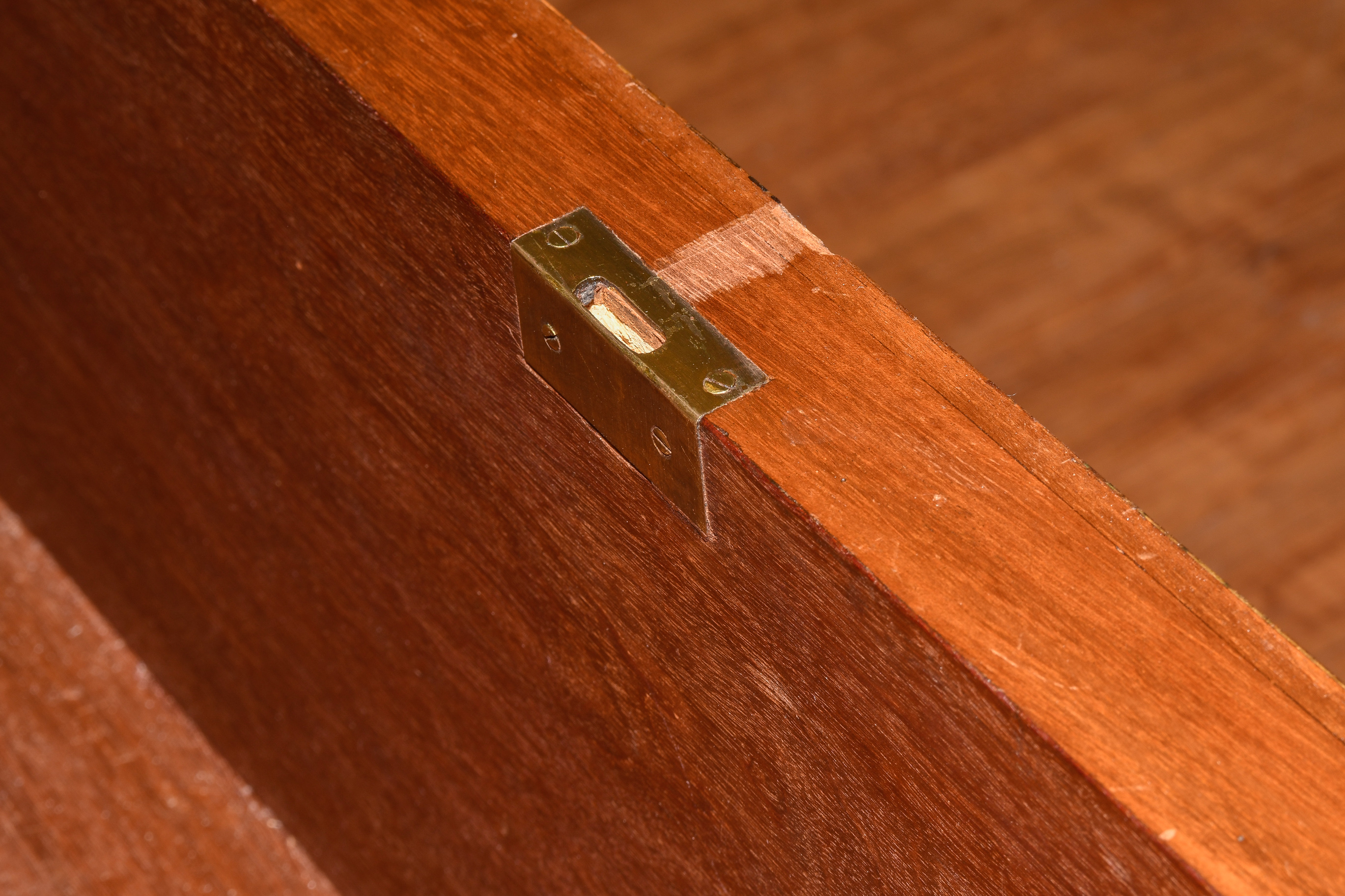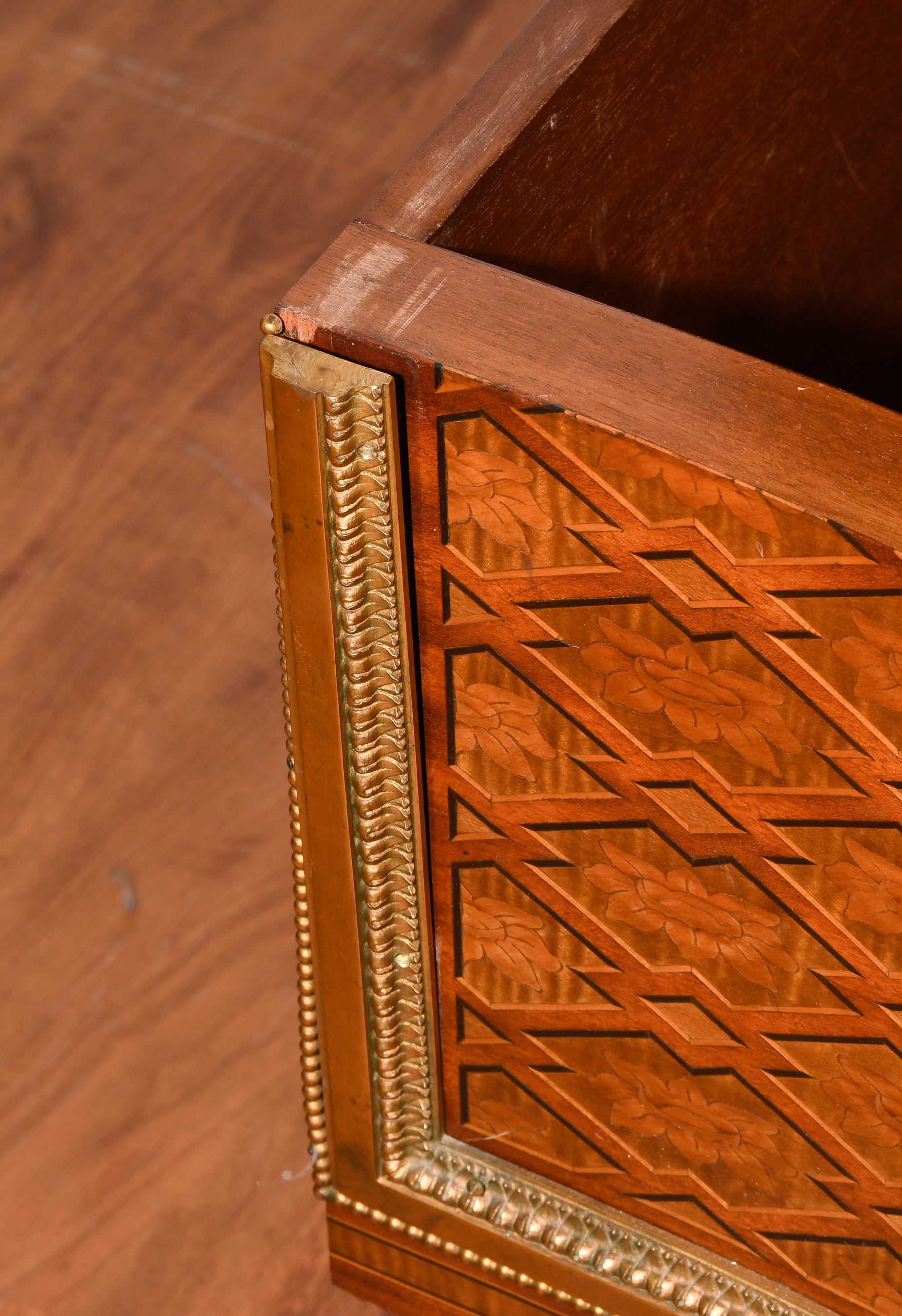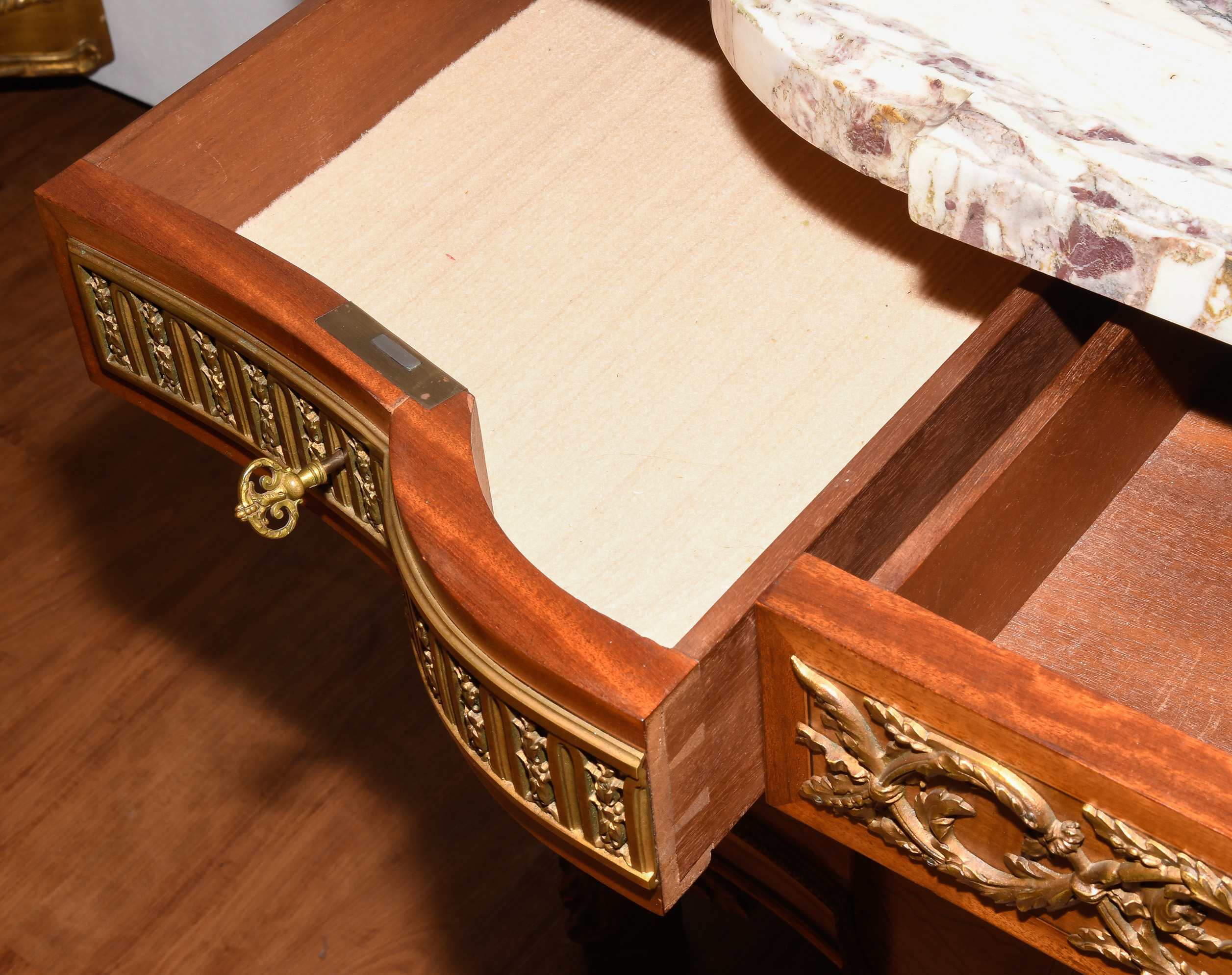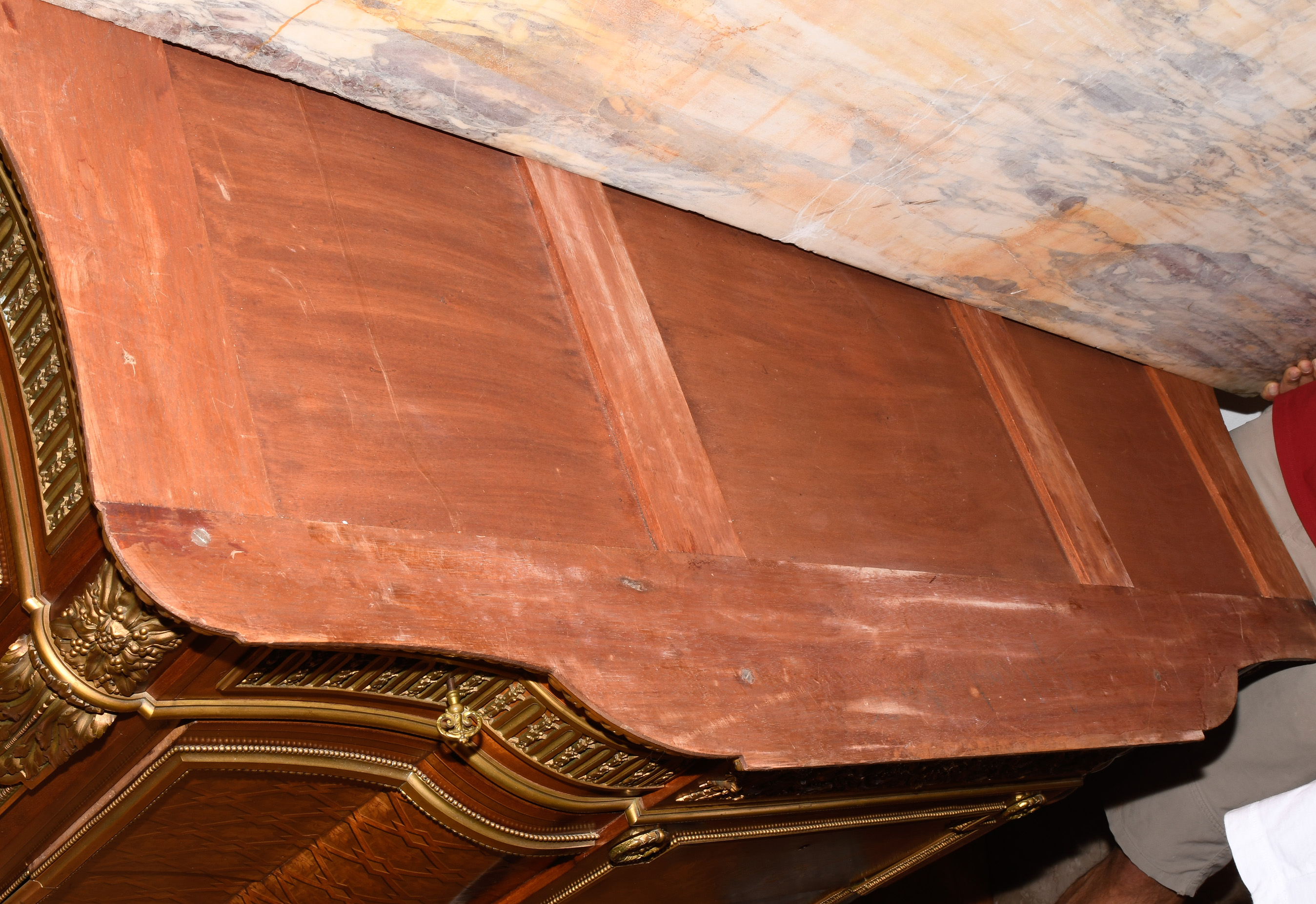Louis XVI-Stil 20. Jh. Ahorn, Mahagoni, Ebenholz und Marmor. Fünfschübiger Korpus mit geschweiften Seitenteilen und gebauchter Frontpartie. Dreiseitig gefeldert furniert mit geometrischen Rauten und Blumendekor gearbeitet. Front, Intarsiensbild mit Früchtekorb, Vasen und Blumenmotiven versehen. Reicher Bronzebeschlag vergoldet. Marmor: Beige-Rotbraun gemustert. Ganzes Möbel, sowohl die Bronzebeschläge als auch die Marketeriearbeit von hoher Qualität, z.B. François Linke. Gebrauchsspuren. 173x66x93 cm.